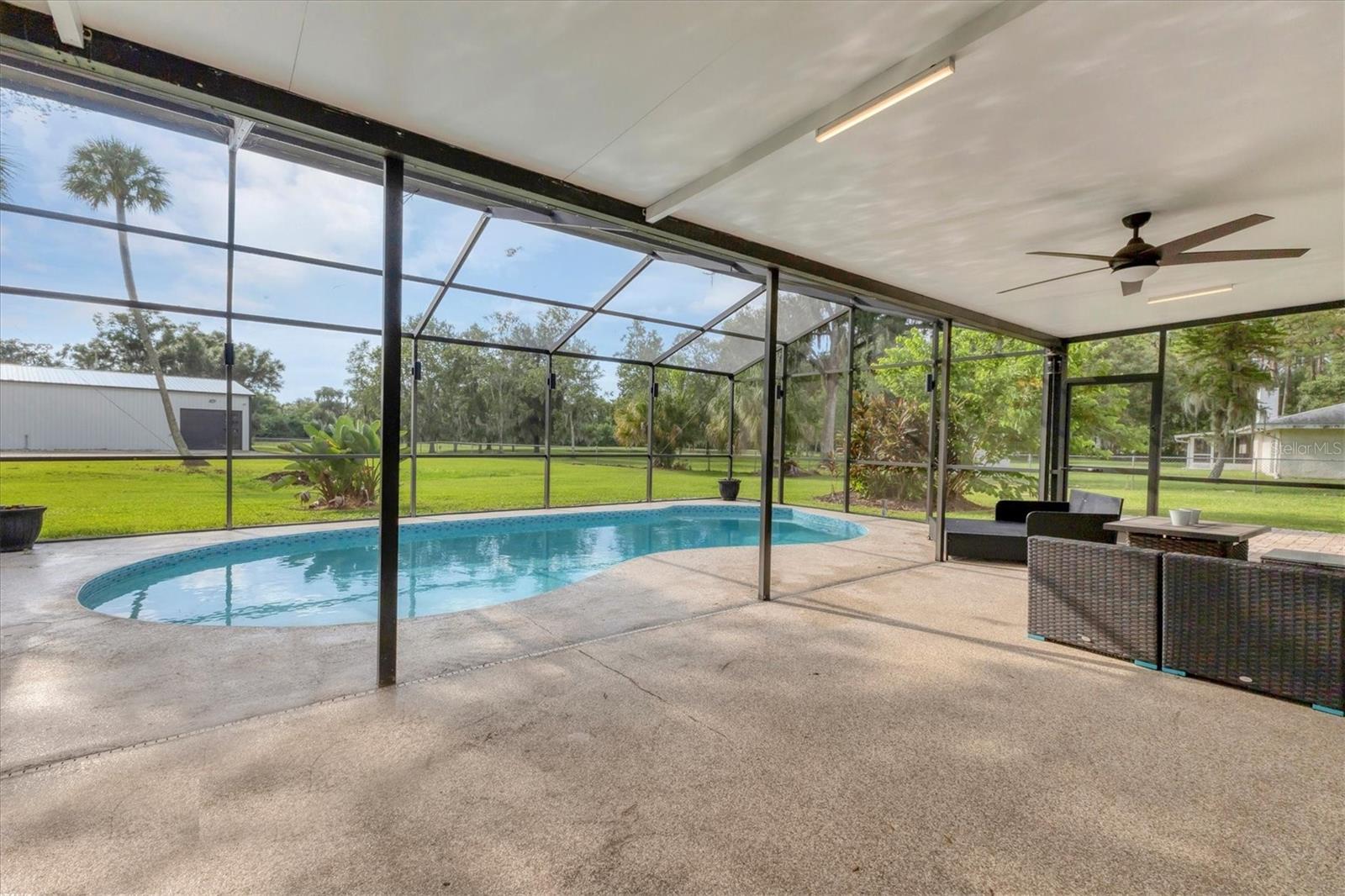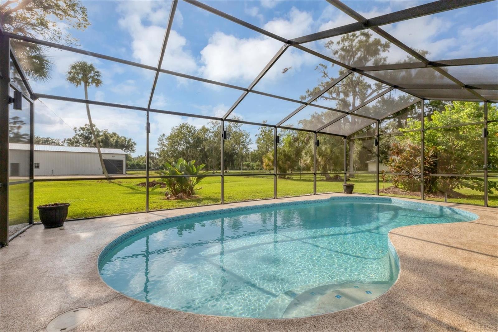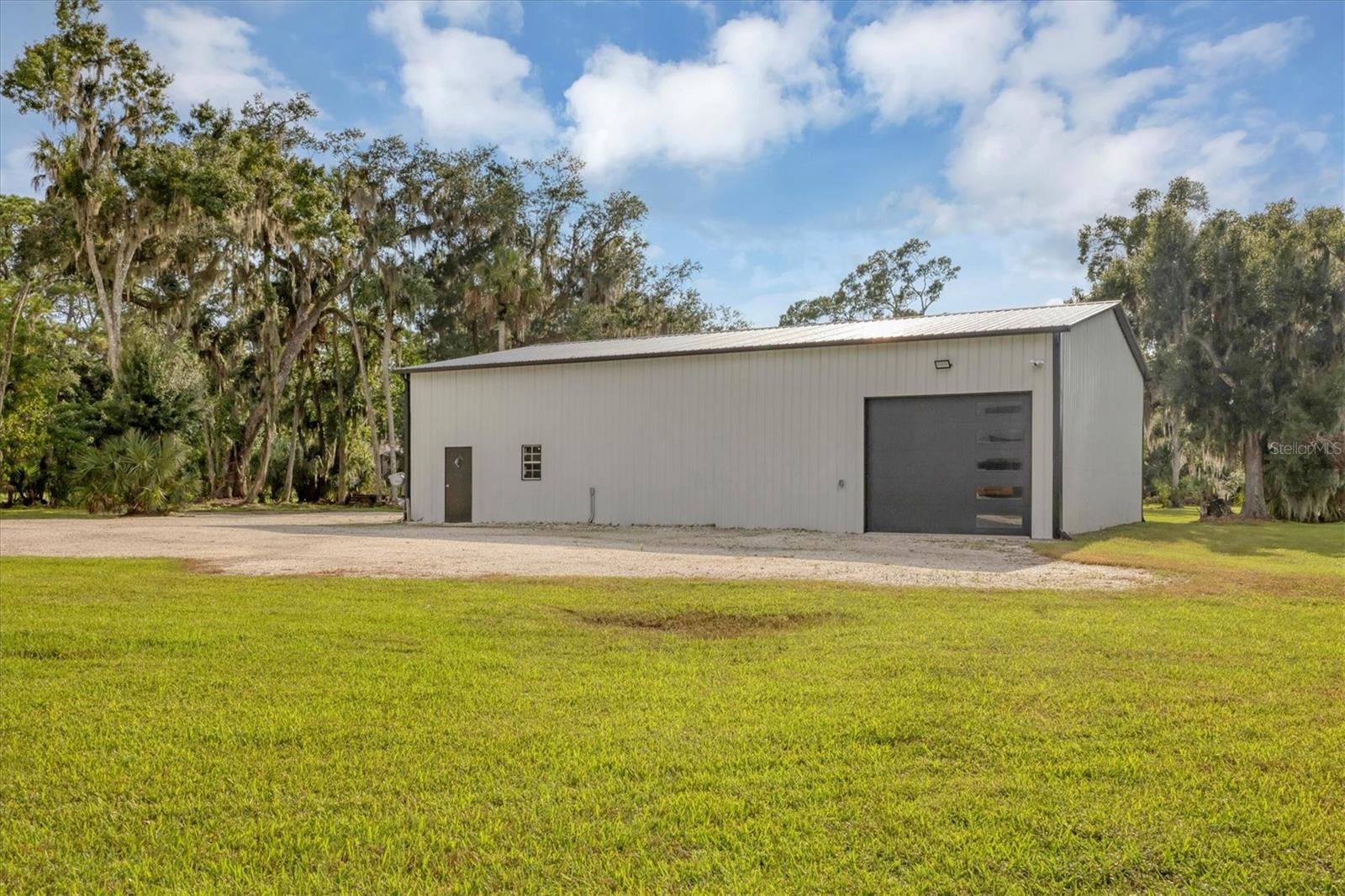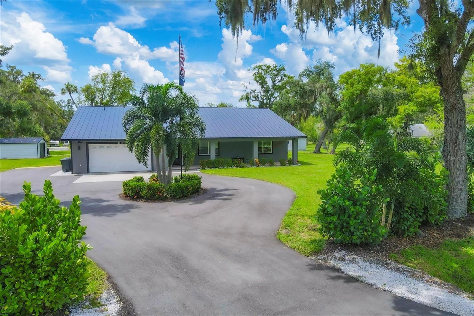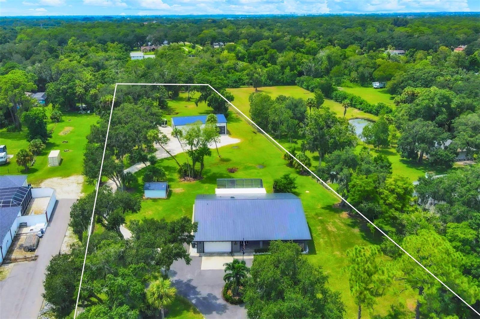 Exceptional 3-bedroom estate in Bradenton, featuring an office/den that can easily be converted to a fourth bedroom, an in-law suite, and 3.5 baths, all set on 2.5 acres—a perfect blend of space, comfort, and tranquility! Upon approach, you'll be welcomed by a canopy of mature oaks, palms, and pitch apple trees, creating a naturally private setting that leads the way to a circular driveway and a charming paver front porch with a tongue and groove ceiling. Inside, you'll find beautiful neutral tile flooring, and in the living room, a propane-ready fireplace set against a shiplap focal point wall creates a cozy atmosphere. The expansive chef’s kitchen is thoughtfully designed, featuring an oversized center island with a breakfast bar and cooktop, sleek white shaker-style cabinets, and a coffee bar. Granite-topped counters and a glass tile backsplash add elegance, while a butcher block-topped dry bar with a beverage refrigerator completes the space. The formal dining room is fully open to the kitchen allowing for easy conversation when hosting friends and family. Adjacent to the kitchen is a spacious family room, featuring a wall of windows and a French door that offer stunning views of the pool and the expansive backyard beyond. The ensuite master bedroom retreat offers French doors for direct access to the pool, a custom-designed walk-in closet, dual sinks set on a quartz-topped vanity, a shower-tub combo, and an additional step-in shower. The two guest bedrooms also feature custom walk-in closets, and the guest baths are beautifully appointed with quartz countertops and elegant finishes. Inside the garage, which features durable epoxy flooring, a staircase leads to a multigenerational living apartment. This space is equipped with a mini-split A/C system, a walk-in closet, skylight, kitchenette with quartz countertops and a full-size refrigerator, while the bathroom includes a step-in shower, a quartz-topped vanity, and modern fixtures. Step outside to a spacious screened-in pool area with epoxy coated decking and an open air paver patio overlooking a large backyard. A smaller storage shed is conveniently located, and a standout feature is the shell driveway leading to a 60x40 detached building with multiple doors, ideal for car, boat, and motorcycle enthusiasts. Additional home highlights include the 2023 metal roof, impact windows throughout, 6” baseboards, security system and much more. If you're looking for a home with abundant indoor and outdoor living spaces, this is the one. Contact us today to arrange your private showing.