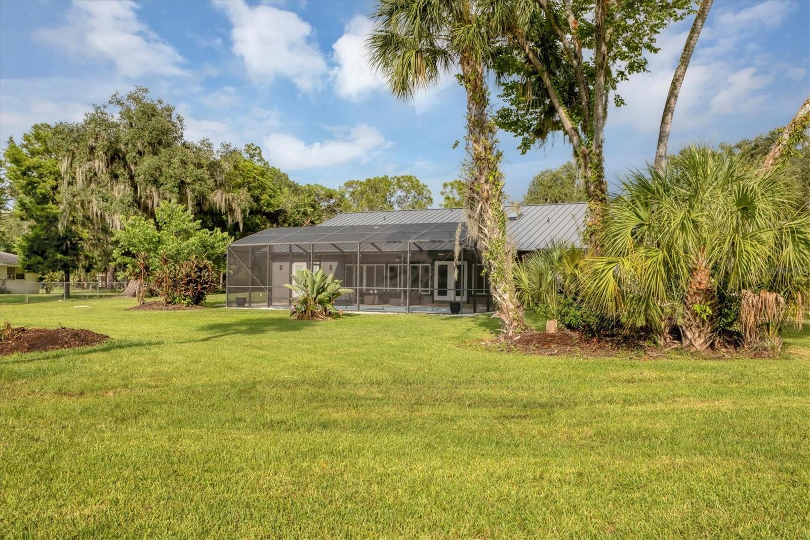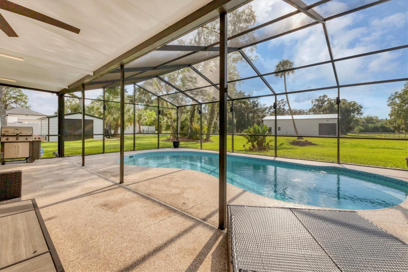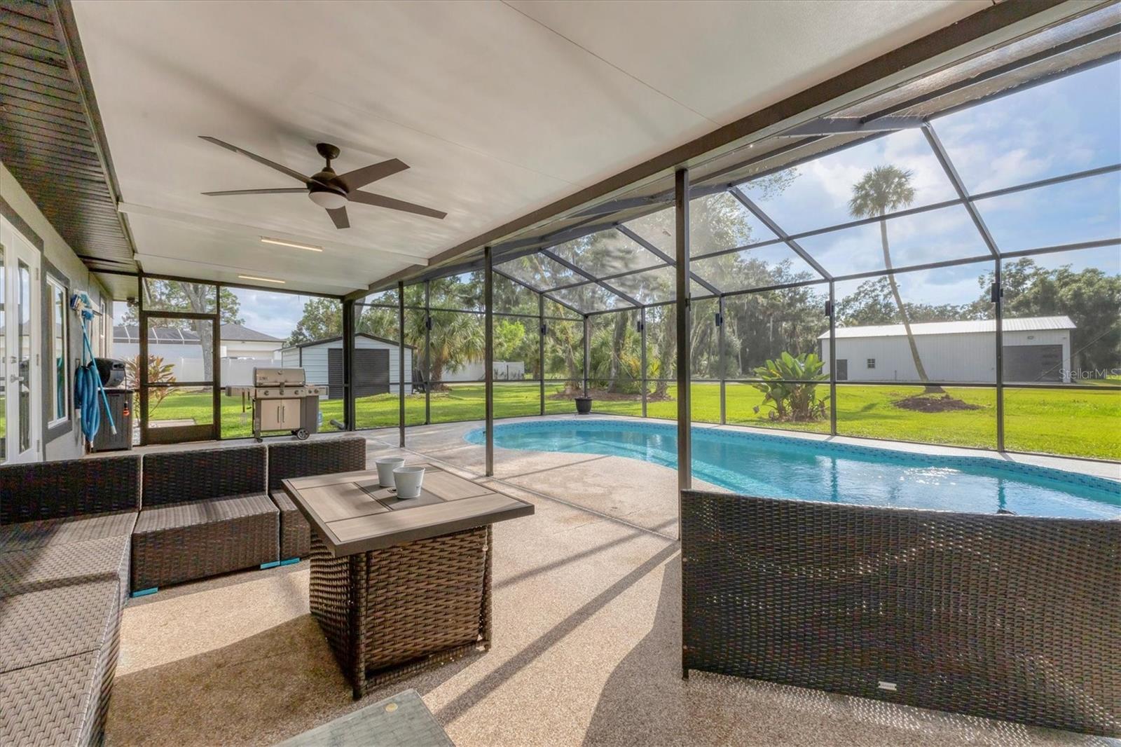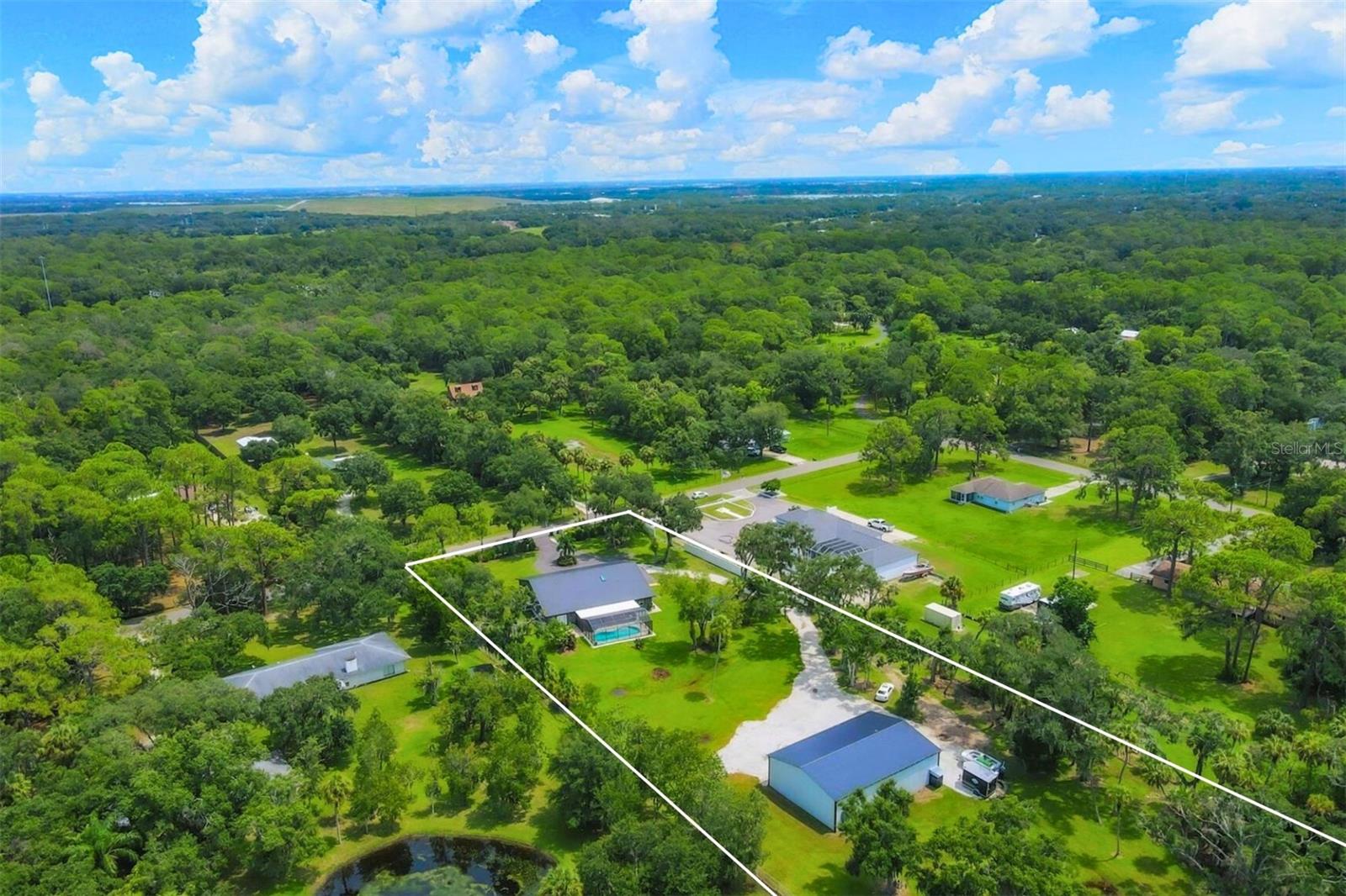Exceptional 3-bedroom estate in Bradenton, featuring an office/den that can easily be converted to a fourth bedroom, an in-law suite, and 3.5 baths, all set on 2.5 acres—a perfect blend of space, comfort, and tranquility! Upon approach, you'll be welcomed by a canopy of mature oaks, palms, and pitch apple trees, creating a naturally private setting that leads the way to a circular driveway and a charming paver front porch with a tongue and groove ceiling. Inside, you'll find beautiful neutral tile flooring, and in the living room, a propane-ready fireplace set against a shiplap focal point wall creates a cozy atmosphere. The expansive chef’s kitchen is thoughtfully designed, featuring an oversized center island with a breakfast bar and cooktop, sleek white shaker-style cabinets, and a coffee bar. Granite-topped counters and a glass tile backsplash add elegance, while a butcher block-topped dry bar with a beverage refrigerator completes the space. The formal dining room is fully open to the kitchen allowing for easy conversation when hosting friends and family. Adjacent to the kitchen is a spacious family room, featuring a wall of windows and a French door that offer stunning views of the pool and the expansive backyard beyond. The ensuite master bedroom retreat offers French doors for direct access to the pool, a custom-designed walk-in closet, dual sinks set on a quartz-topped vanity, a shower-tub combo, and an additional step-in shower. The two guest bedrooms also feature custom walk-in closets, and the guest baths are beautifully appointed with quartz countertops and elegant finishes. Inside the garage, which features durable epoxy flooring, a staircase leads to a multigenerational living apartment. This space is equipped with a mini-split A/C system, a walk-in closet, skylight, kitchenette with quartz countertops and a full-size refrigerator, while the bathroom includes a step-in shower, a quartz-topped vanity, and modern fixtures. Step outside to a spacious screened-in pool area with epoxy coated decking and an open air paver patio overlooking a large backyard. A smaller storage shed is conveniently located, and a standout feature is the shell driveway leading to a 60x40 detached building with multiple doors, ideal for car, boat, and motorcycle enthusiasts. Additional home highlights include the 2023 metal roof, impact windows throughout, 6” baseboards, security system and much more. If you're looking for a home with abundant indoor and outdoor living spaces, this is the one. Contact us today to arrange your private showing.