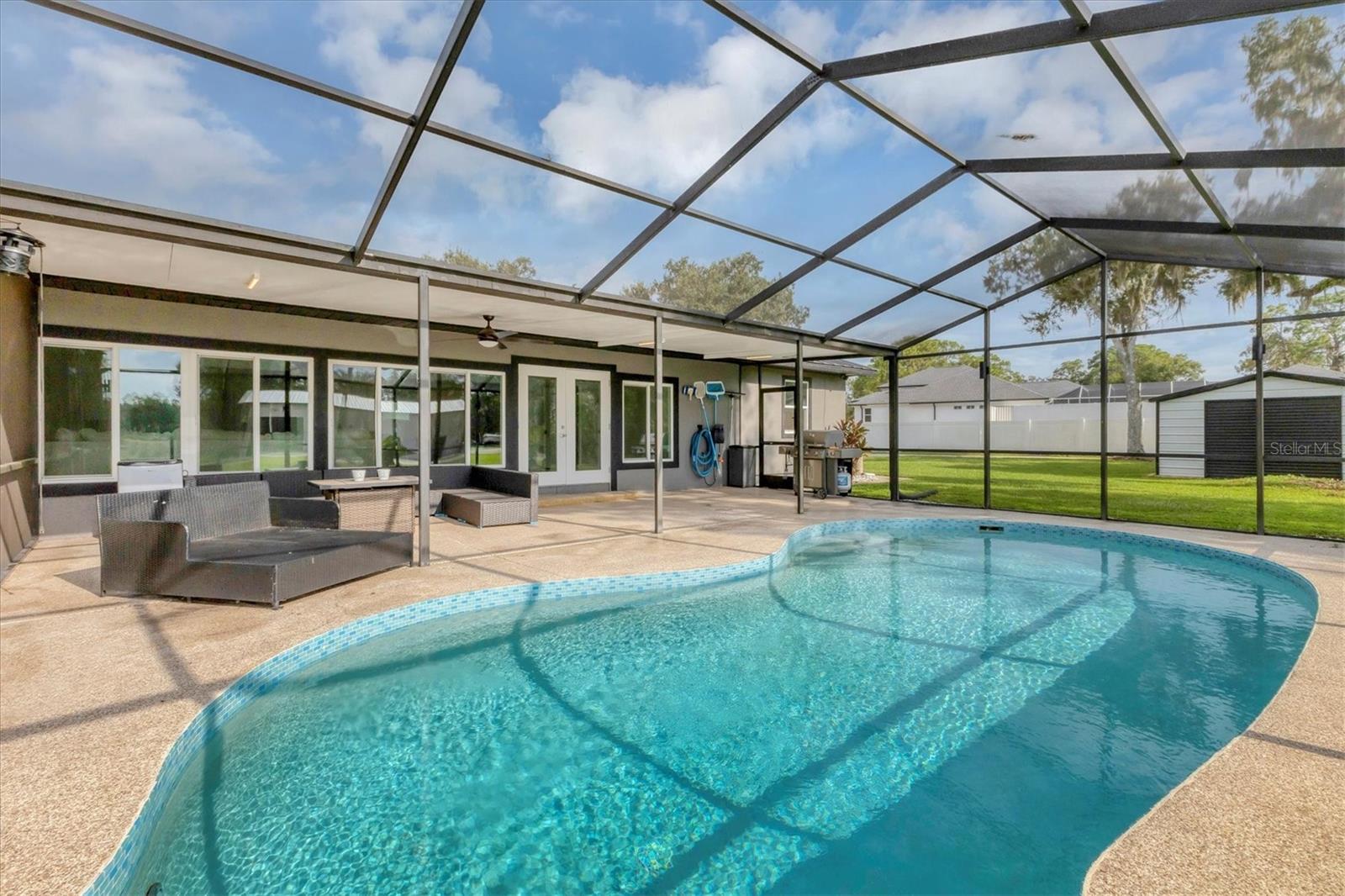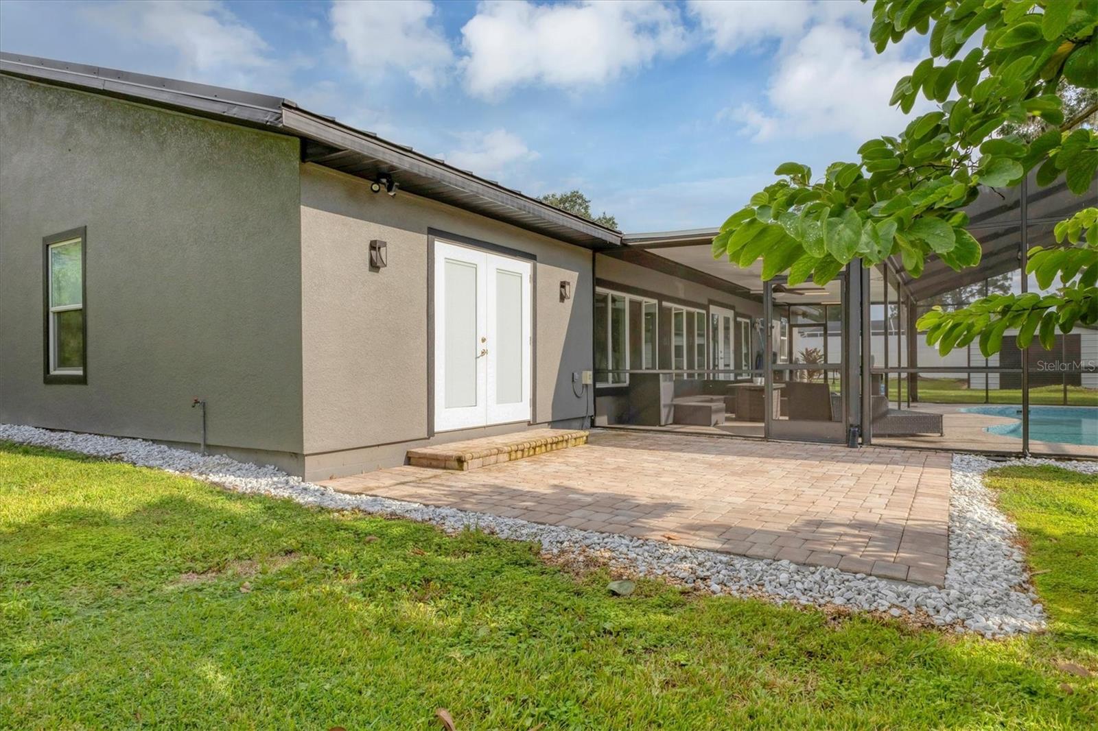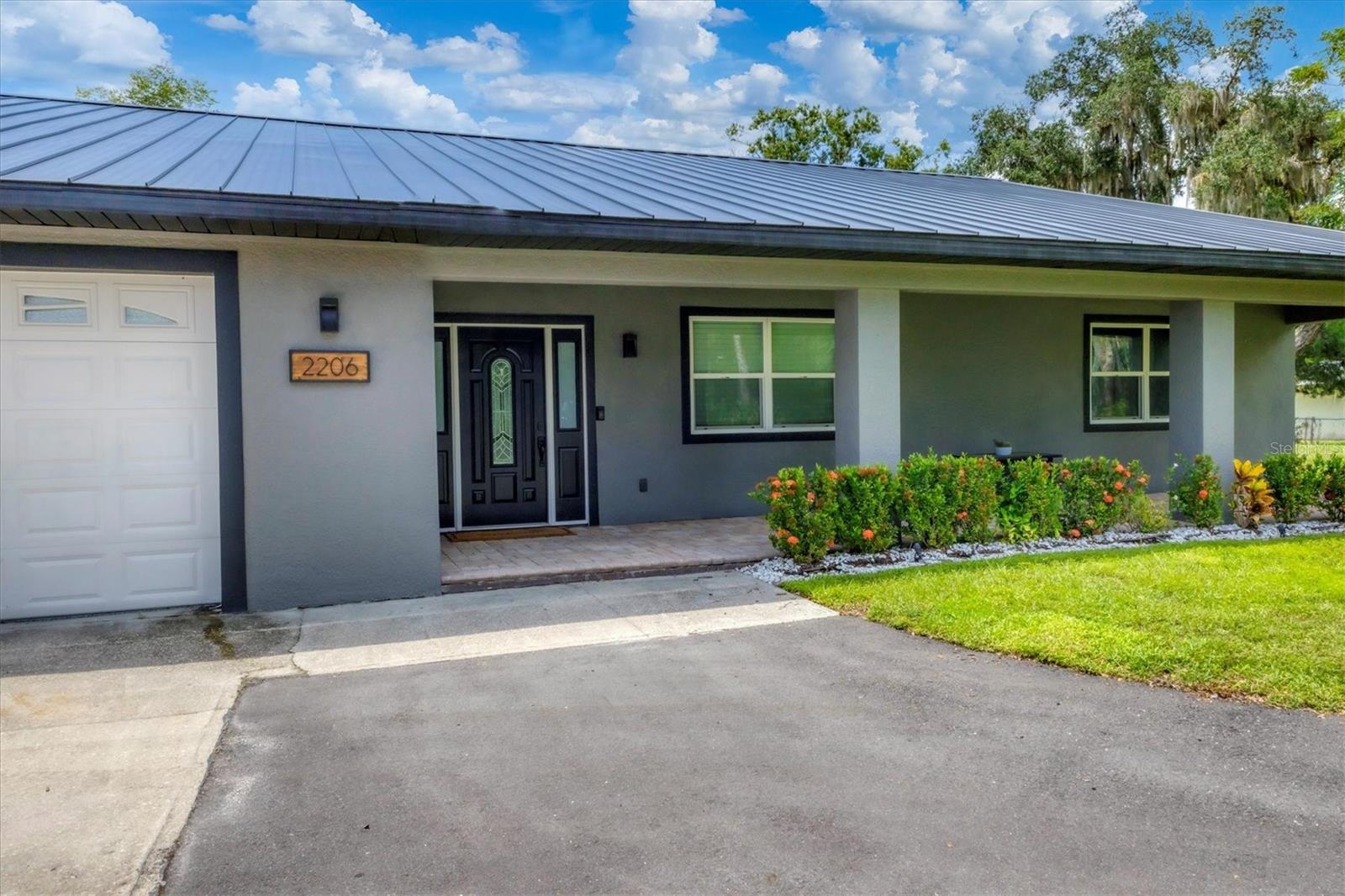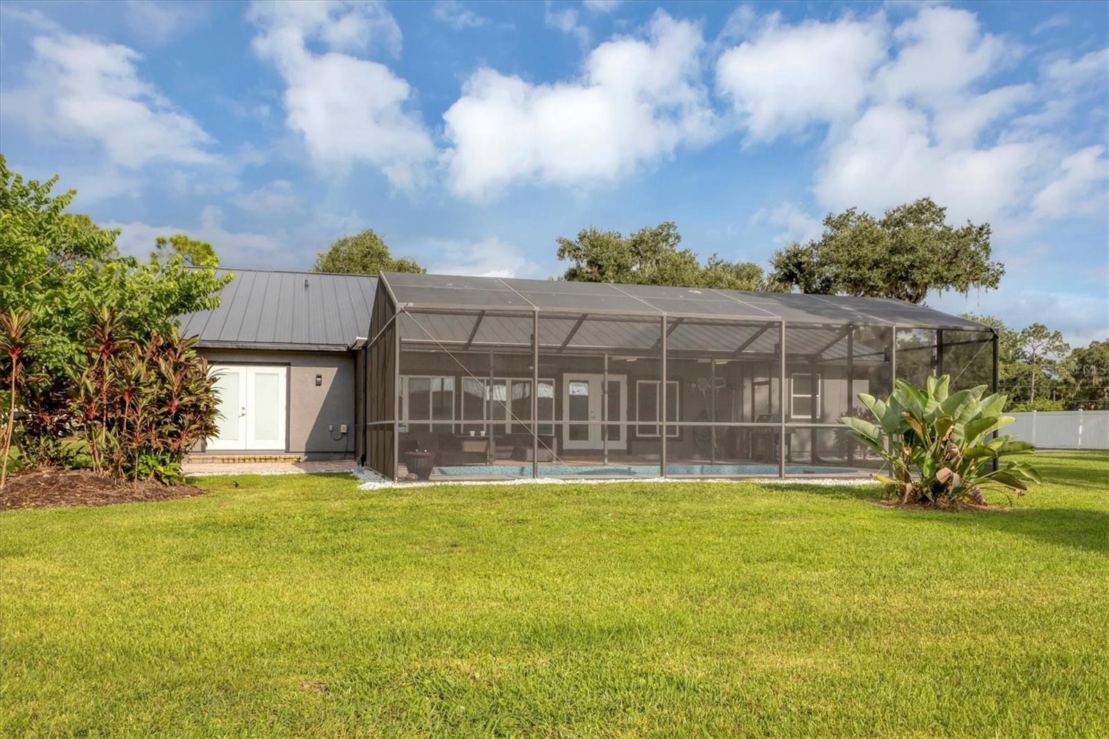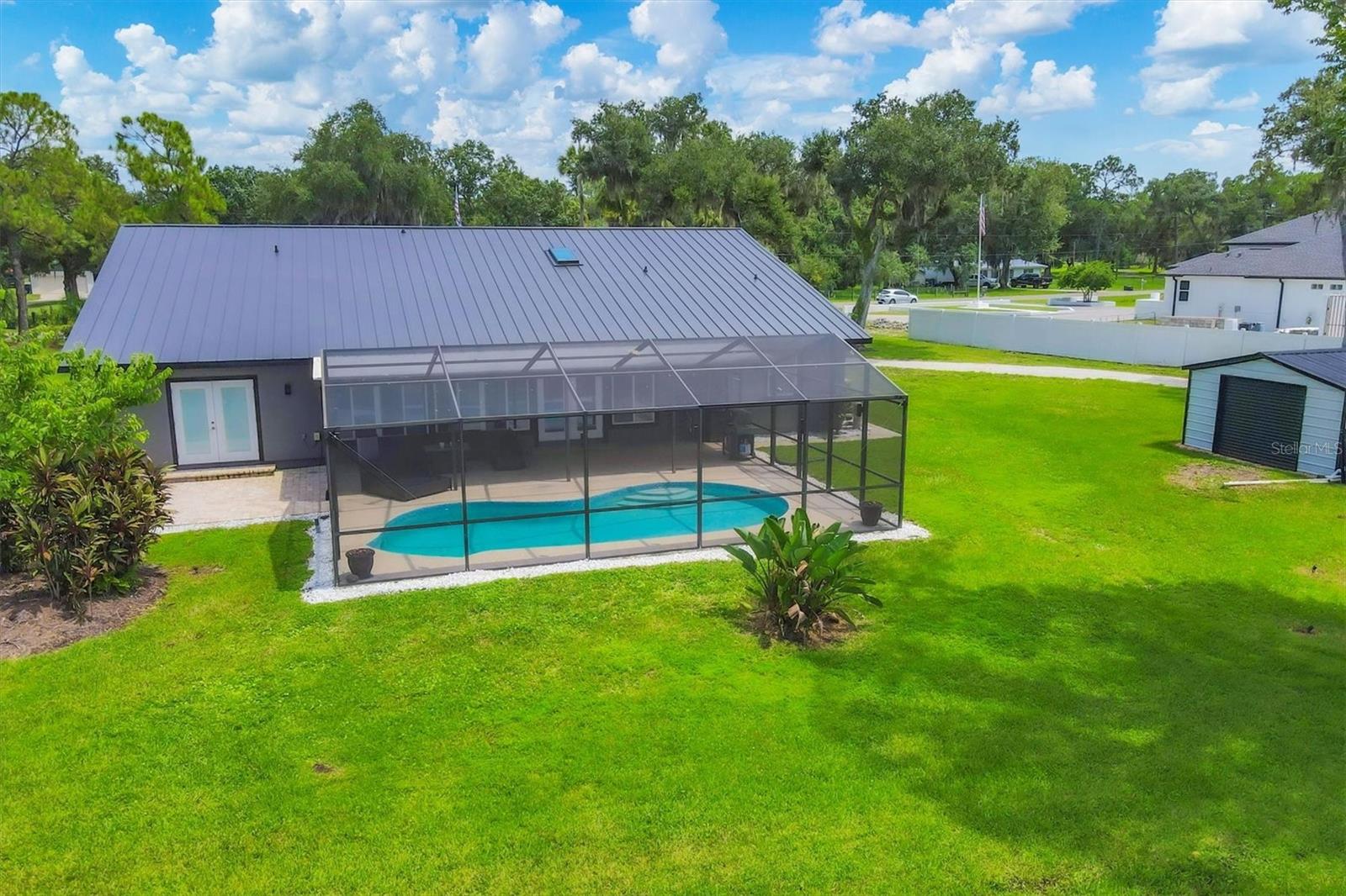 Exceptional 3-bedroom estate in Bradenton, featuring an office/den that can easily be converted to a fourth bedroom, an in-law suite, and 3.5 baths, all set on 2.5 acres—a perfect blend of space, comfort, and tranquility! Upon approach, you'll be welcomed by a canopy of mature oaks, palms, and pitch apple trees, creating a naturally private setting that leads the way to a circular driveway and a charming paver front porch with a tongue and groove ceiling. Inside, you'll find beautiful neutral tile flooring, and in the living room, a propane-ready fireplace set against a shiplap focal point wall creates a cozy atmosphere. The expansive chef’s kitchen is thoughtfully designed, featuring an oversized center island with a breakfast bar and cooktop, sleek white shaker-style cabinets, and a coffee bar. Granite-topped counters and a glass tile backsplash add elegance, while a butcher block-topped dry bar with a beverage refrigerator completes the space. The formal dining room is fully open to the kitchen allowing for easy conversation when hosting friends and family. Adjacent to the kitchen is a spacious family room, featuring a wall of windows and a French door that offer stunning views of the pool and the expansive backyard beyond. The ensuite master bedroom retreat offers French doors for direct access to the pool, a custom-designed walk-in closet, dual sinks set on a quartz-topped vanity, a shower-tub combo, and an additional step-in shower. The two guest bedrooms also feature custom walk-in closets, and the guest baths are beautifully appointed with quartz countertops and elegant finishes. Inside the garage, which features durable epoxy flooring, a staircase leads to a multigenerational living apartment. This space is equipped with a mini-split A/C system, a walk-in closet, skylight, kitchenette with quartz countertops and a full-size refrigerator, while the bathroom includes a step-in shower, a quartz-topped vanity, and modern fixtures. Step outside to a spacious screened-in pool area with epoxy coated decking and an open air paver patio overlooking a large backyard. A smaller storage shed is conveniently located, and a standout feature is the shell driveway leading to a 60x40 detached building with multiple doors, ideal for car, boat, and motorcycle enthusiasts. Additional home highlights include the 2023 metal roof, impact windows throughout, 6” baseboards, security system and much more. If you're looking for a home with abundant indoor and outdoor living spaces, this is the one. Contact us today to arrange your private showing.