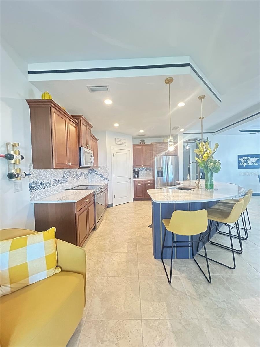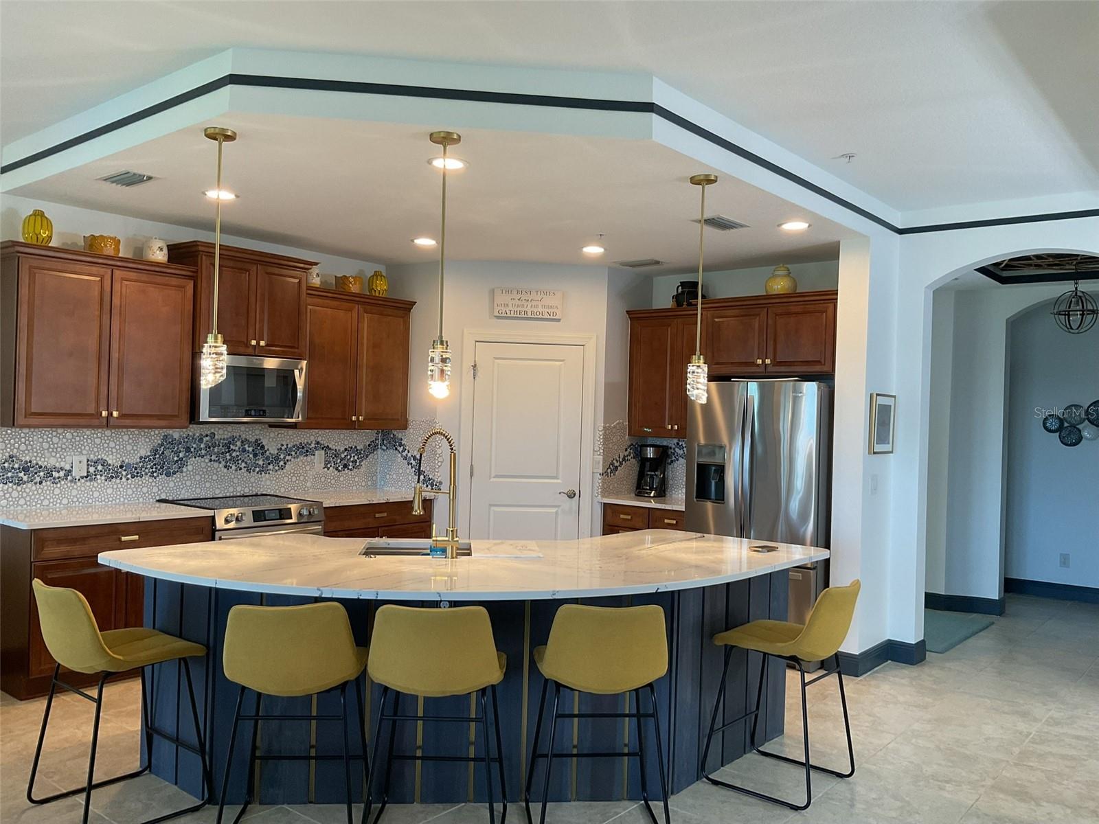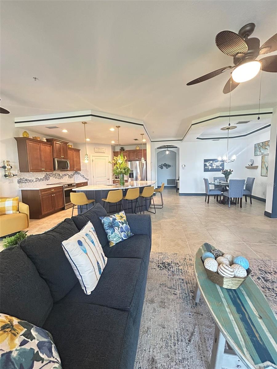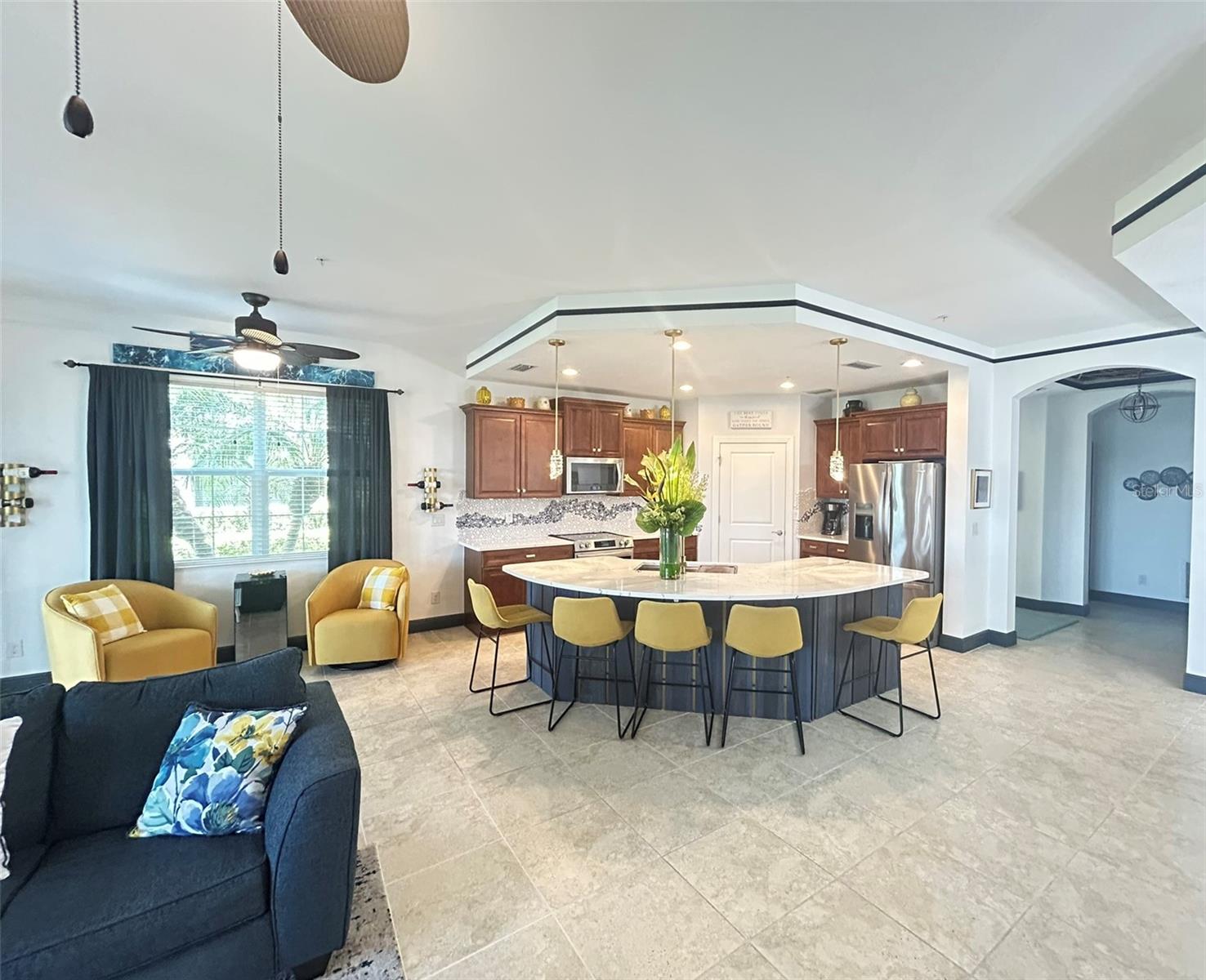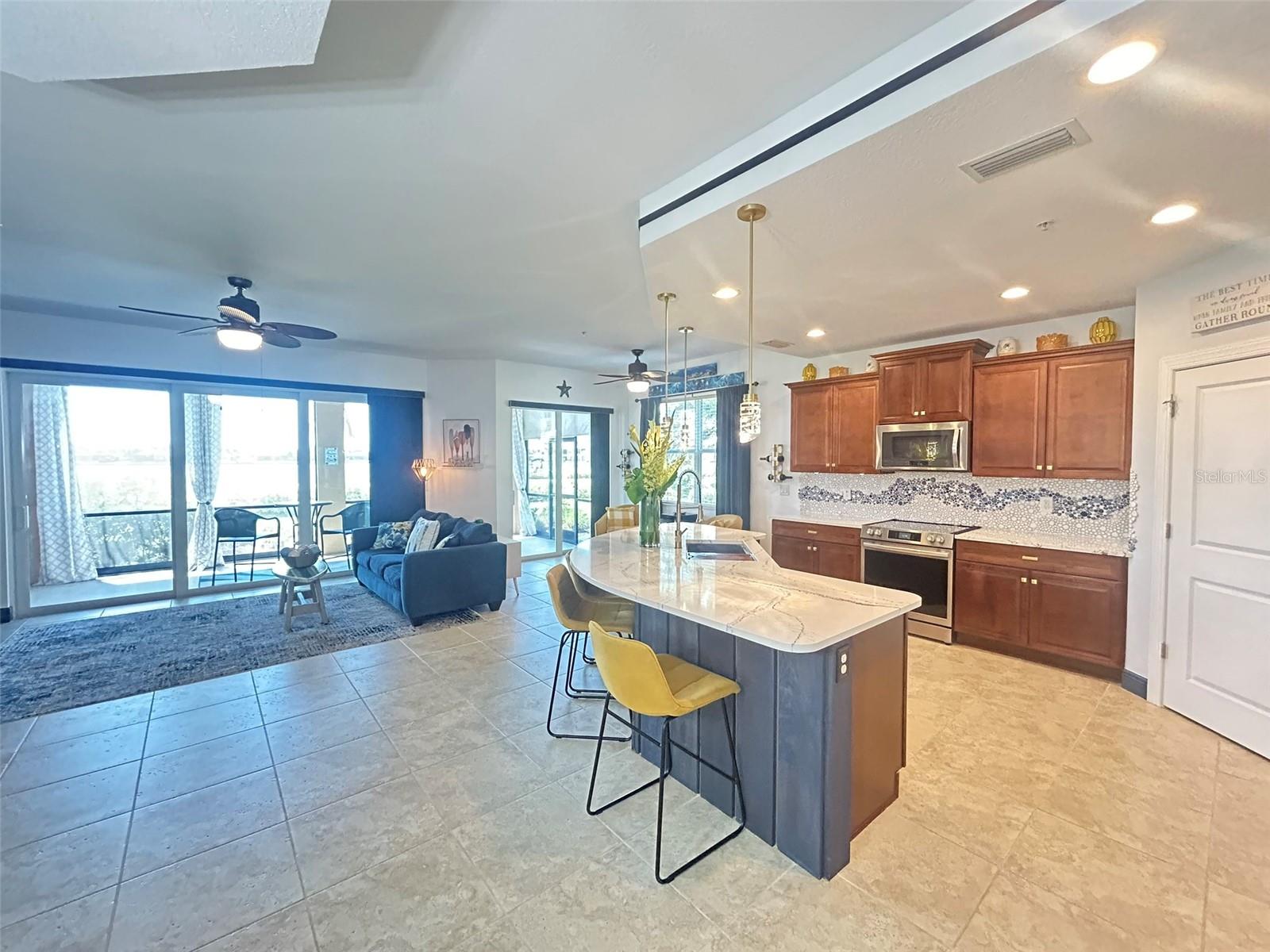 Come and see what $500,000 will buy for you in Tidewater Preserve! You will find stunning water views, a marina with available boat slips, a gorgeous clubhouse with a pool set along the Manatee River, two gyms, and two additional pools. This first floor carriage home is designed for entertaining. And it has been restaged as turnkey. It features a large island with Cambria quartz counters and the ability to seat six. The custom designed backsplash mimics the blue waves in the counter tops. The pantry was designed for maximum storage. The slide in range was installed in December. It features an induction cook top, with an oven capable of convection cooking, air frying, and slow cooking. There is a French door refrigerator and wine fridge in the kitchen, and a second refrigerator in the garage, with water and ice capabilities in the door. The primary bedroom is spacious, and comes complete with a king sized platform bed. The primary bath also features a Cambria quartz counter with double sinks and a large linen closet. The primary walk in closet has custom built-ins to maximize storage for clothing and shoes. The second bedroom features double corner windows for great natural light and is equipped with a queen sized bed for guests. The third room is open for possibilities. Perhaps an office, yoga room, music room, den or even another bedroom. This beautiful home is a must see if you are craving life on the water in an amenity filled community, with maximum value for your money. The only thing this home needs is you, living your best life in paradise.
