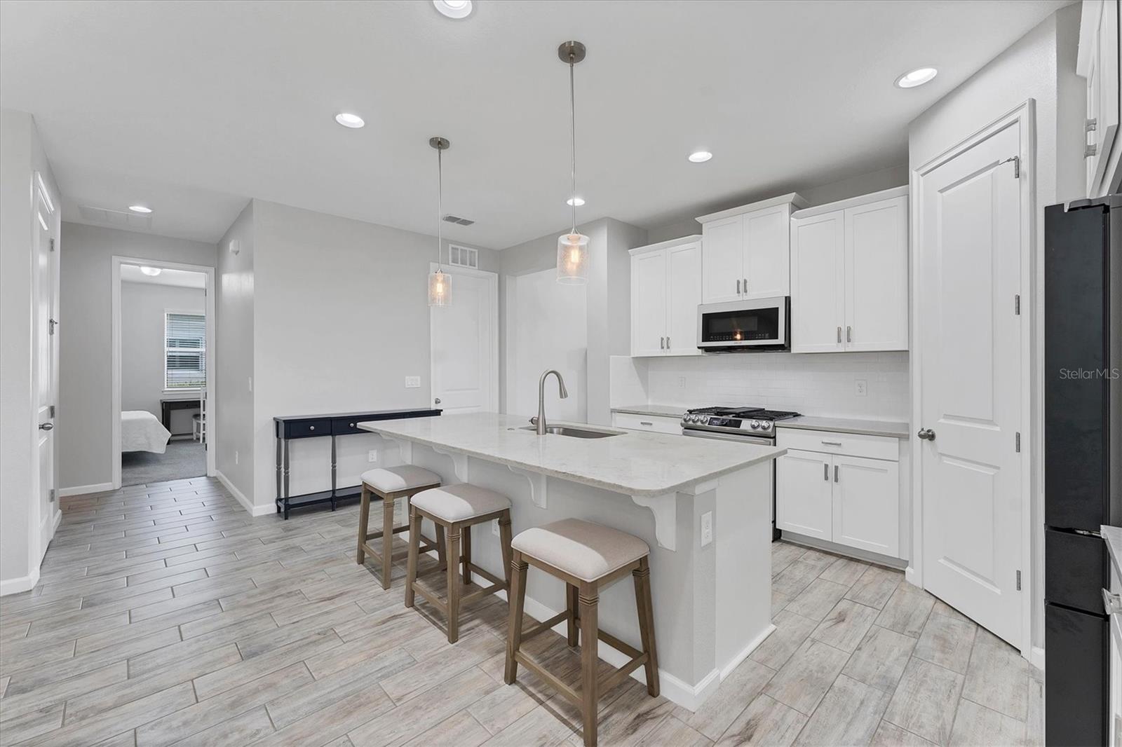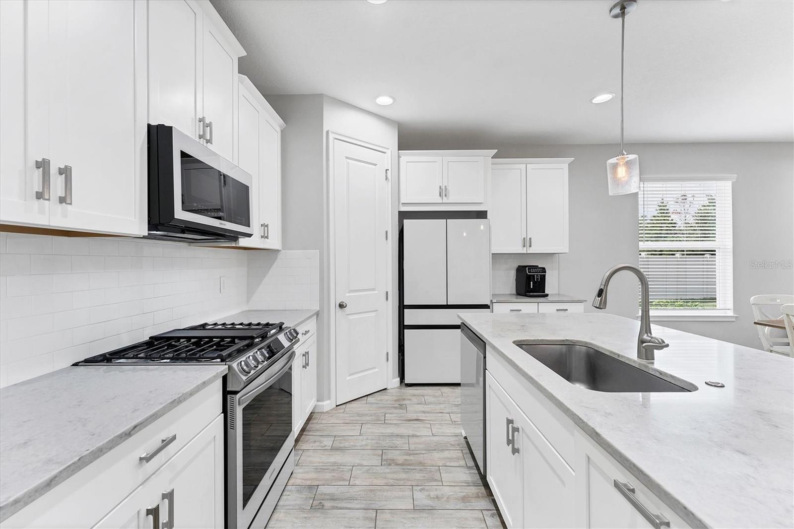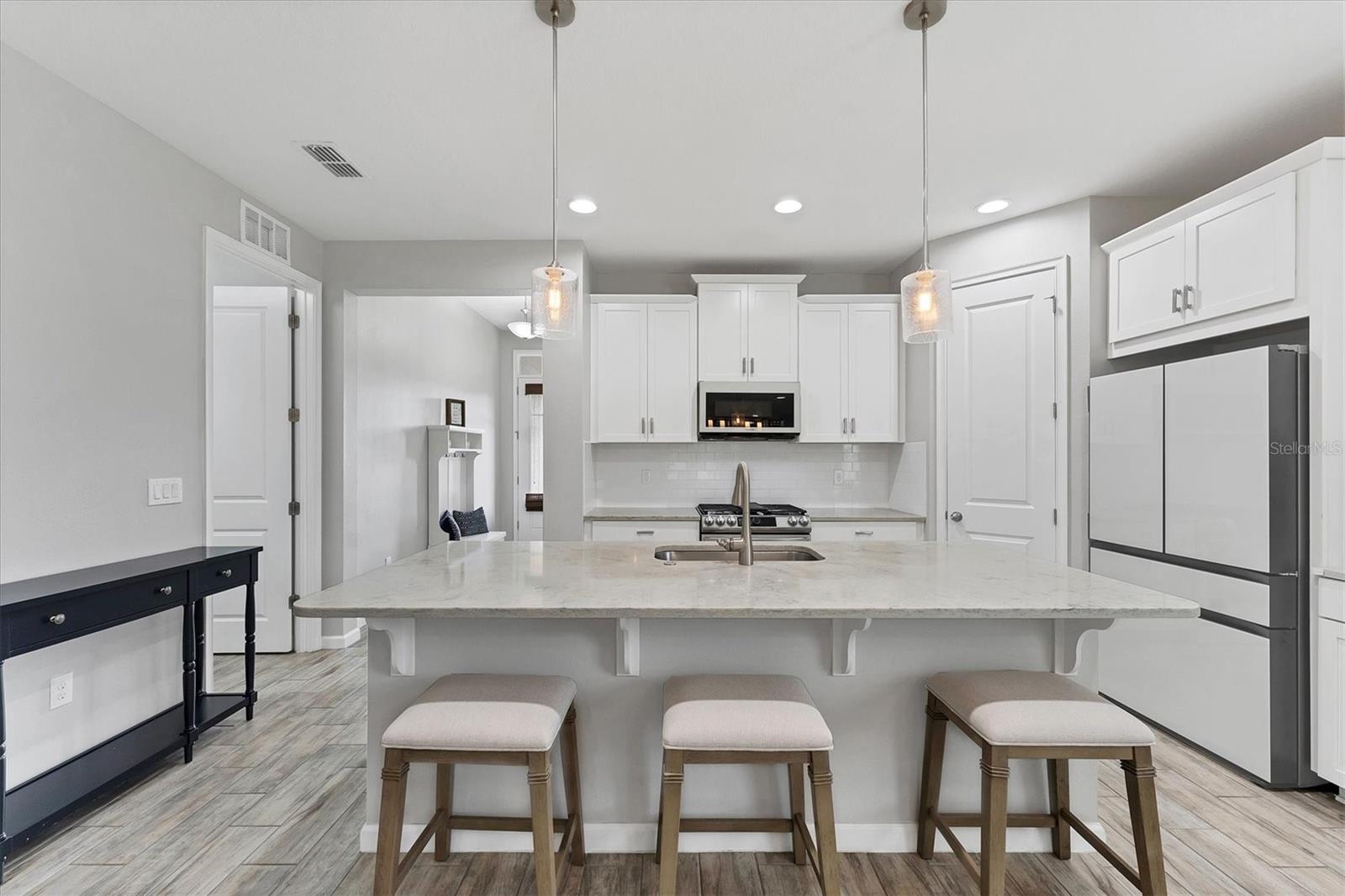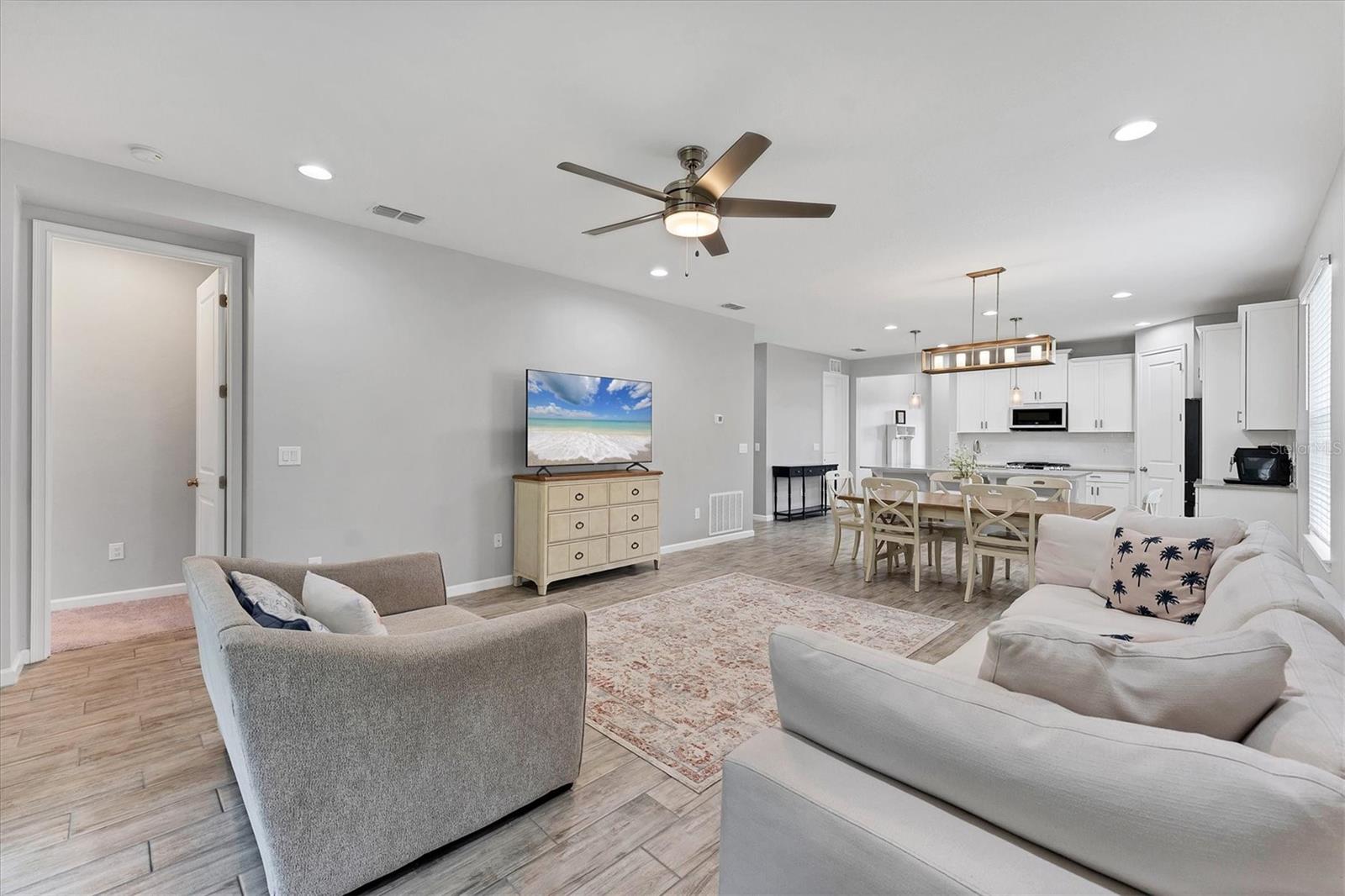 Don’t miss this incredible opportunity to own a stunning home in the highly sought-after #1 Multi-Generational Master Planned Community in the U.S., Lakewood Ranch. Nestled within the peaceful, maintenance free - gated community of Harmony Reserve—part of the vibrant Harmony at Lakewood Ranch. This immaculate residence offers a beautiful Coastal and modern-inspired design and access to resort-style amenities that cater to both active and relaxed lifestyles. The property is a gorgeous 3-bedroom, 2-bathroom + den single-family home with a spacious, private, oversized lot at the end of a quiet half cul-de-sac, featuring a lush landscaped look that provides exceptional privacy and ample space to create your own backyard oasis. Inside, you'll find a bright, open floor plan that feels like a model home, with stunning distressed wood plank porcelain tile throughout the main areas, plush upgraded carpeting in all bedrooms, and elegant Sonoma Style linen-finish cabinets complemented by upgraded Marble Mist Zodiac-Quartz countertops in the kitchen and bathrooms with fresh interior paint throughout. Recent upgrades include a stylish dining room chandelier, modern ceiling fans, contemporary fixtures and newer Top of the line Samsung appliances throughout the home. The primary suite boasts a tray ceiling, sliding doors leading to the screened lanai, large walk-in closet and an ensuite bath with a double-sink raised vanity, a relaxing soaking tub, and a glass separate shower—perfect for unwinding. The chef’s kitchen features 42” cabinets with crown molding, a beautiful Subway tile backsplash, an oversized island with a large single-bowl sink, and an open design that keeps everyone connected. The versatile den with double French doors offers an ideal space for a home office, homeschool room, or quiet retreat. The spacious laundry room includes newer oversized Samsung washer and dryer, built-in custom shelves, cabinets, and a utility sink for maximum organization, while ample storage is found throughout the home. The 2-car garage is finished with new epoxy floors, built-in overhead shelves, and a utility sink. Additional features include a whole-house water system, tankless water heater, and UV light in the HVAC for cleaner, healthier air. Walking distance from the areas top rated schools. This beautifully upgraded home combines luxury, functionality, and privacy in a premier community setting—truly a perfect place to call home. Schedule your private tour today and seize this exceptional opportunity!