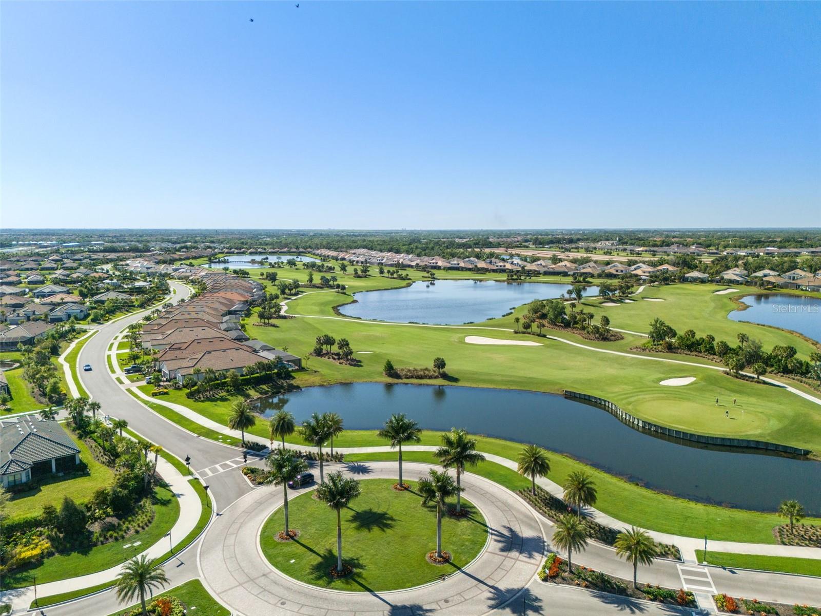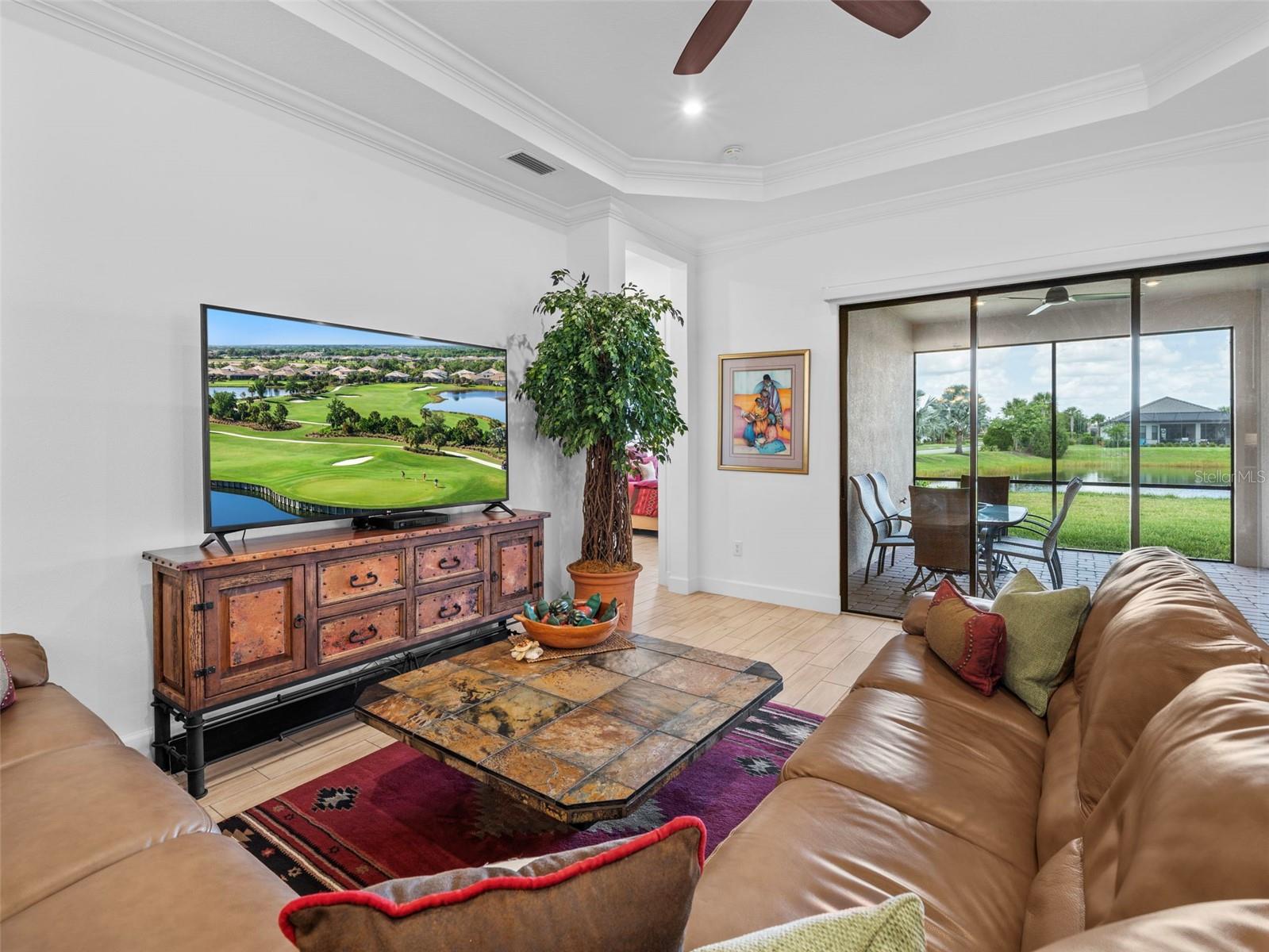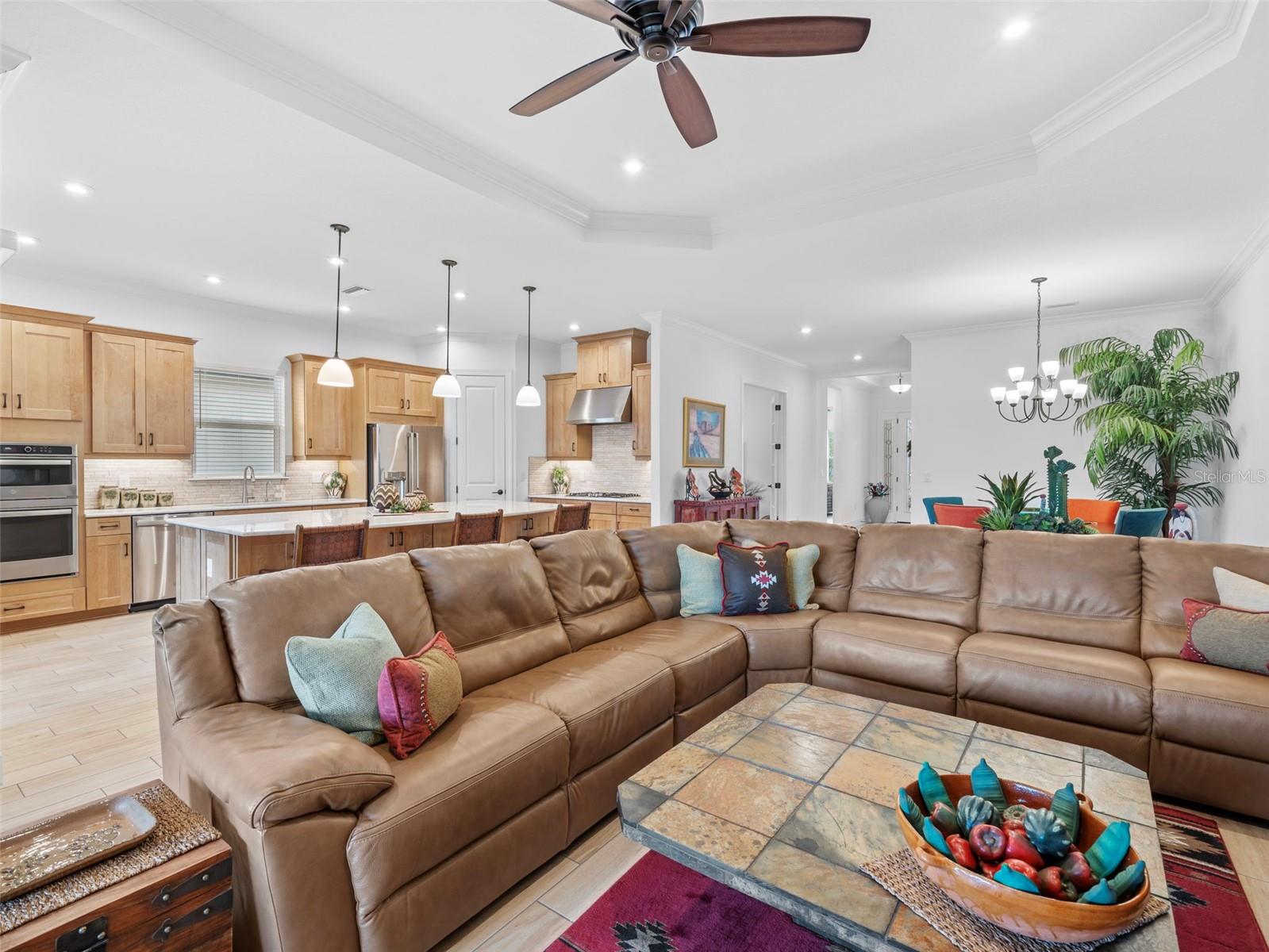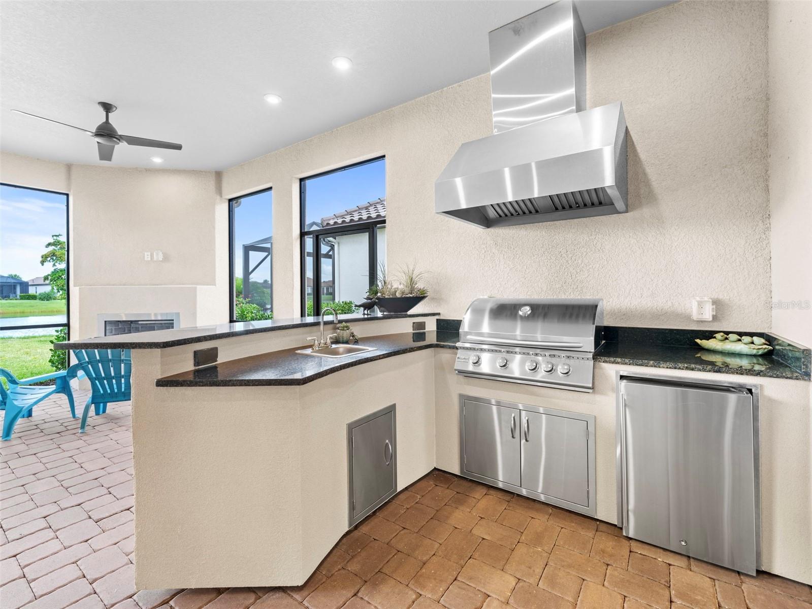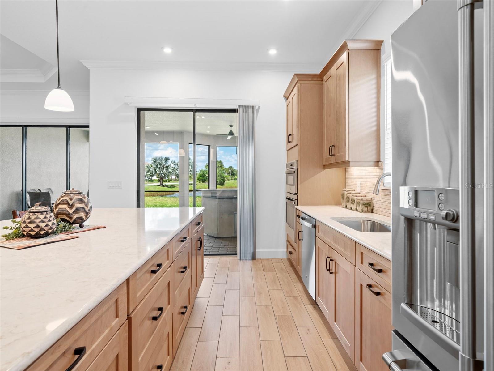 Welcome to Southwest Florida's premier community, Esplanade Azario, where luxury meets comfort in the highly acclaimed Lazio floor plan. Positioned on a tranquil lake-view lot, this beautifully landscaped residence embodies modern elegance and a relaxed lifestyle. Upon entry, discover the inviting ambiance created by high tray ceilings, crown molding, expansive 10-foot ceilings, and porcelain tile throughout. The centerpiece of the home is the gourmet kitchen, complete with maple cabinets, upgraded GE appliances, quartz countertops, upgraded cabinet drawers, extra knee high cabinets in the island, and a gas cooktop with a hood—an ideal space for both cooking and entertaining. The primary bedroom offers a serene escape with its bay window framing picturesque lake views. Its ensuite bathroom features a walk-in shower with an additional shower head, dual vanities, and a spacious walk-in closet. Two additional guest rooms, each with their own bathrooms featuring walk-in showers, ensure privacy and comfort for family and guests. A versatile den/office with French doors, complemented by a built-in desk and storage cabinets, provides a perfect retreat for work or relaxation. Step out onto the fully extended covered lanai to discover a full outdoor kitchen, a cozy gas fireplace, and breathtaking lake vistas—an ideal setting for outdoor gatherings and relaxation. Additional features include a well-appointed laundry room with upgraded cabinets and a sink, a 2-car garage with an additional 4-foot storage space, and extra storage racks, and landscape lighting. Esplanade Azario offers a wealth of resort-style amenities including a pool, Tiki Bar, Culinary Center, fitness facilities, spa services, tennis and pickleball courts, bocce ball courts, and dog parks. A dedicated Lifestyle Director ensures a vibrant community with activities for every interest. Experience the epitome of luxury living at Esplanade Azario. Schedule your private tour today and envision the exceptional lifestyle awaiting you in this remarkable home.