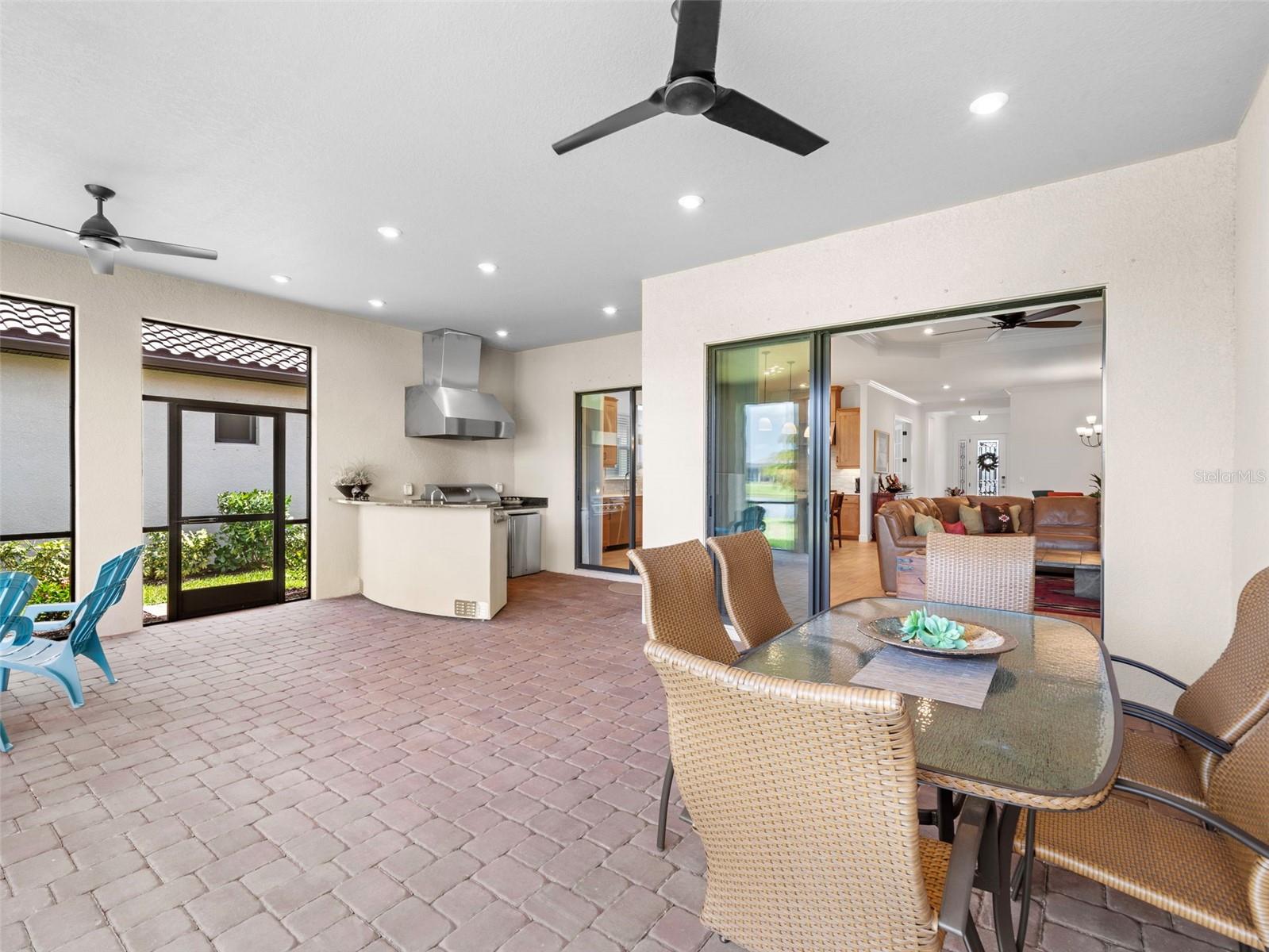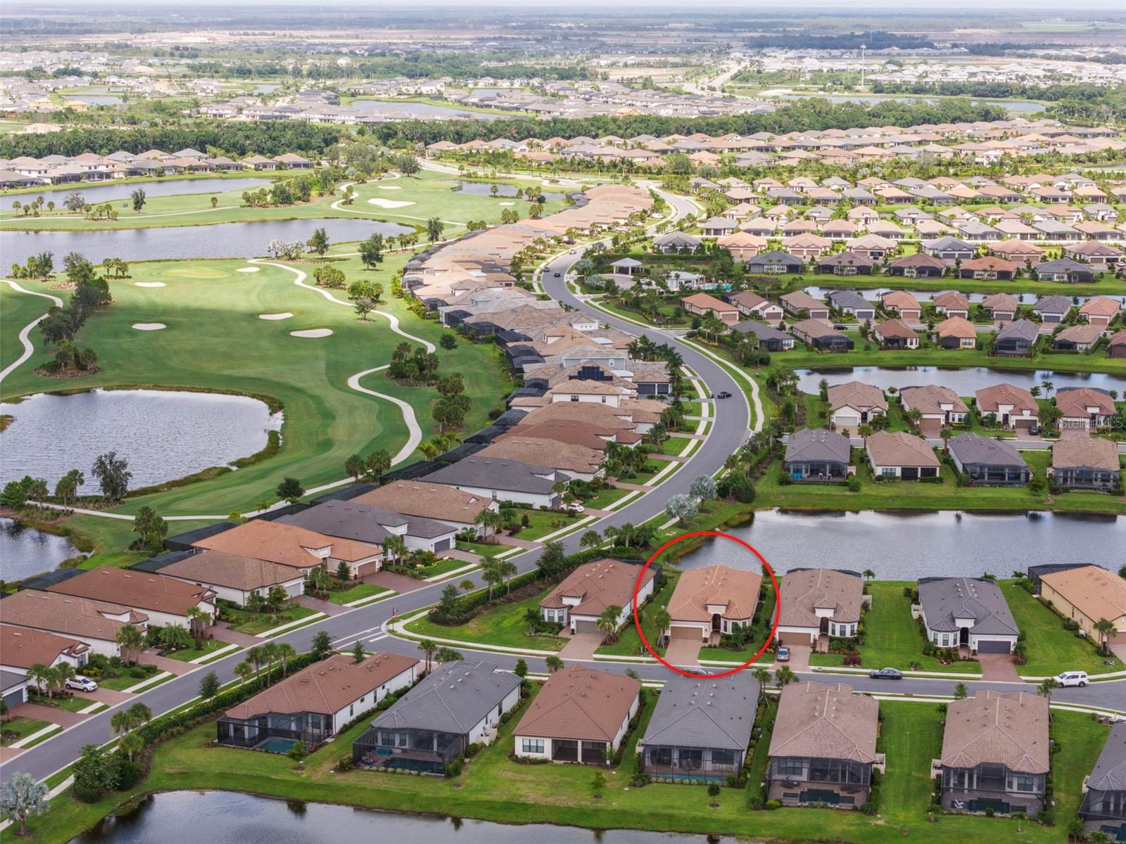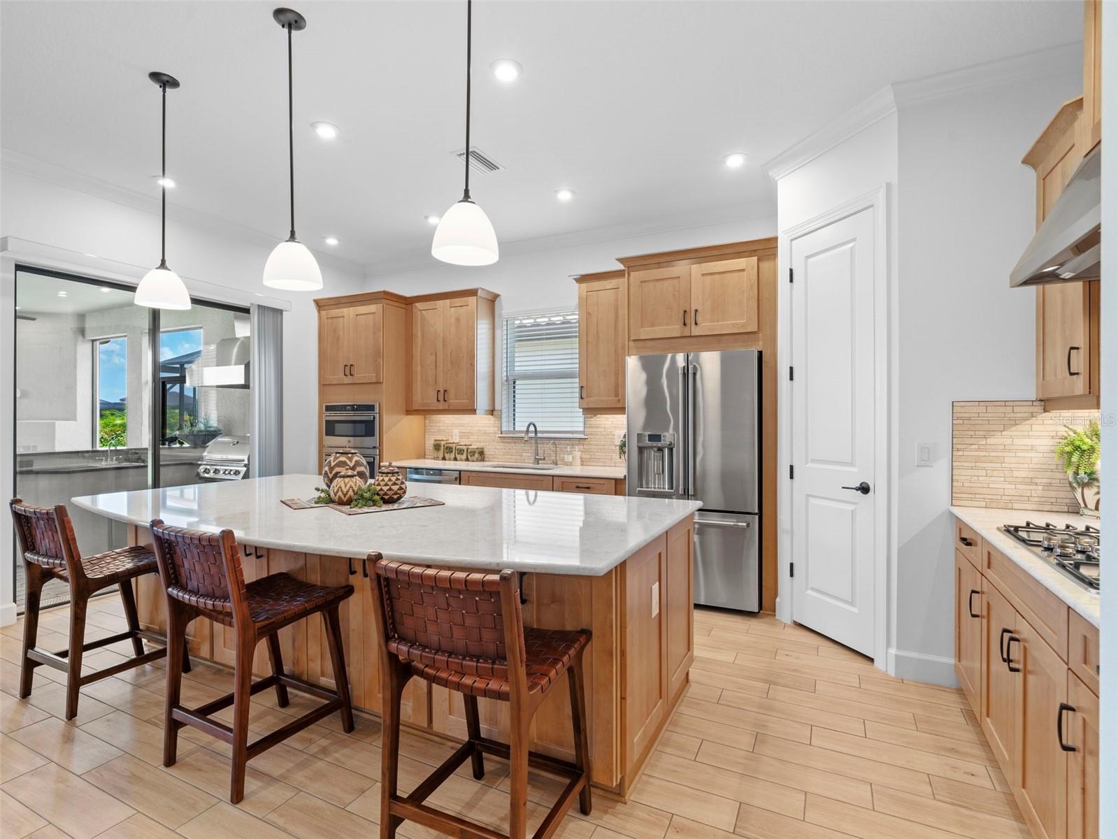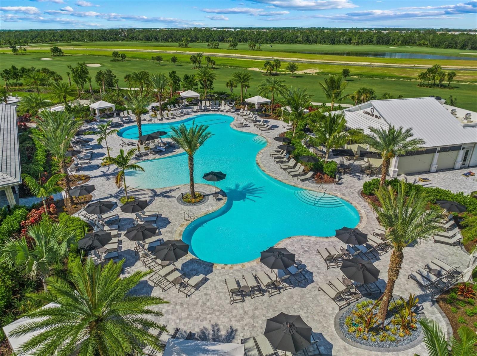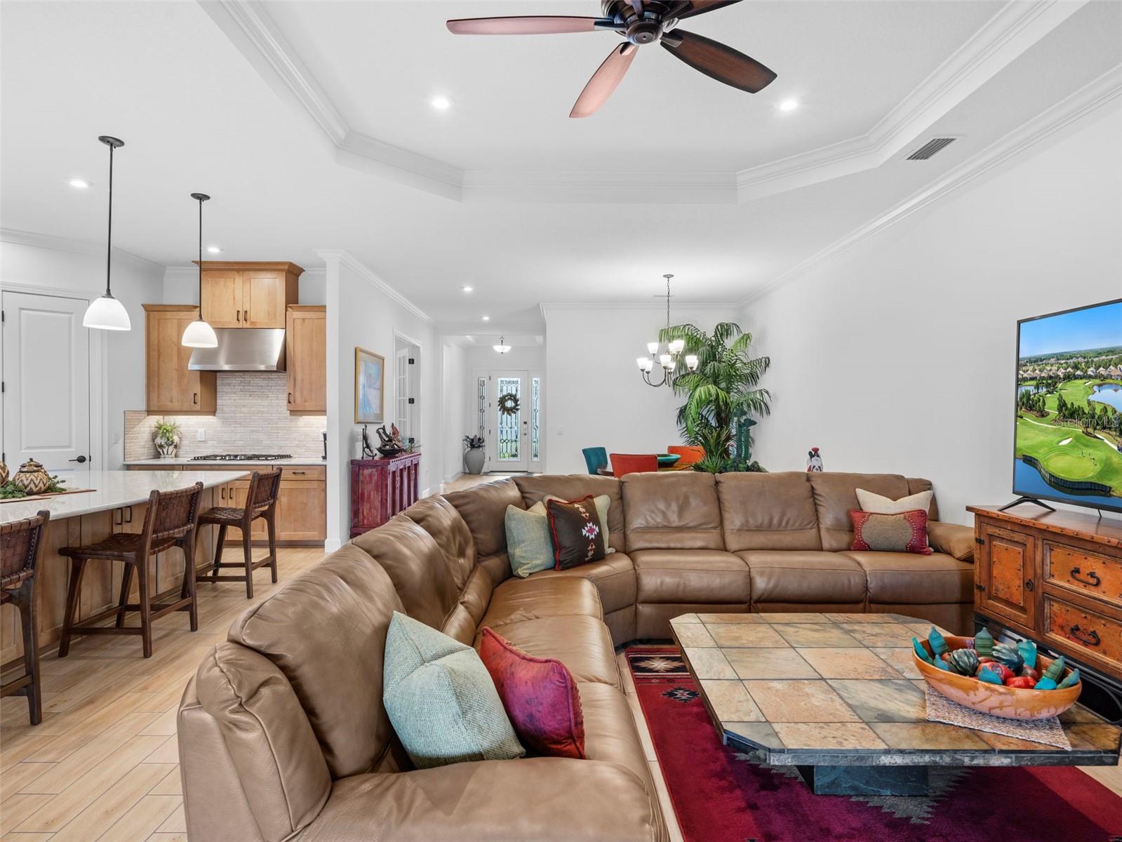 Welcome to Southwest Florida's premier community, Esplanade Azario, where luxury meets comfort in the highly acclaimed Lazio floor plan. Positioned on a tranquil lake-view lot, this beautifully landscaped residence embodies modern elegance and a relaxed lifestyle. Upon entry, discover the inviting ambiance created by high tray ceilings, crown molding, expansive 10-foot ceilings, and porcelain tile throughout. The centerpiece of the home is the gourmet kitchen, complete with maple cabinets, upgraded GE appliances, quartz countertops, upgraded cabinet drawers, extra knee high cabinets in the island, and a gas cooktop with a hood—an ideal space for both cooking and entertaining. The primary bedroom offers a serene escape with its bay window framing picturesque lake views. Its ensuite bathroom features a walk-in shower with an additional shower head, dual vanities, and a spacious walk-in closet. Two additional guest rooms, each with their own bathrooms featuring walk-in showers, ensure privacy and comfort for family and guests. A versatile den/office with French doors, complemented by a built-in desk and storage cabinets, provides a perfect retreat for work or relaxation. Step out onto the fully extended covered lanai to discover a full outdoor kitchen, a cozy gas fireplace, and breathtaking lake vistas—an ideal setting for outdoor gatherings and relaxation. Additional features include a well-appointed laundry room with upgraded cabinets and a sink, a 2-car garage with an additional 4-foot storage space, and extra storage racks, and landscape lighting. Esplanade Azario offers a wealth of resort-style amenities including a pool, Tiki Bar, Culinary Center, fitness facilities, spa services, tennis and pickleball courts, bocce ball courts, and dog parks. A dedicated Lifestyle Director ensures a vibrant community with activities for every interest. Experience the epitome of luxury living at Esplanade Azario. Schedule your private tour today and envision the exceptional lifestyle awaiting you in this remarkable home.