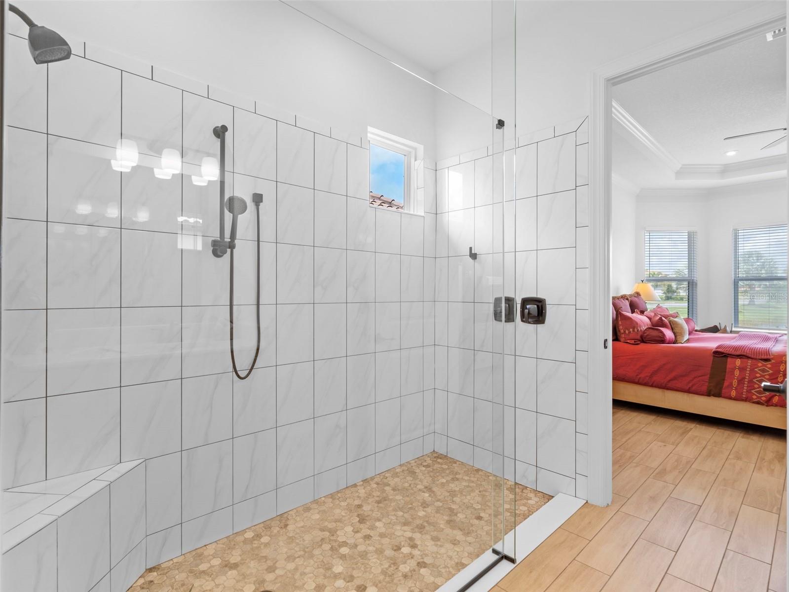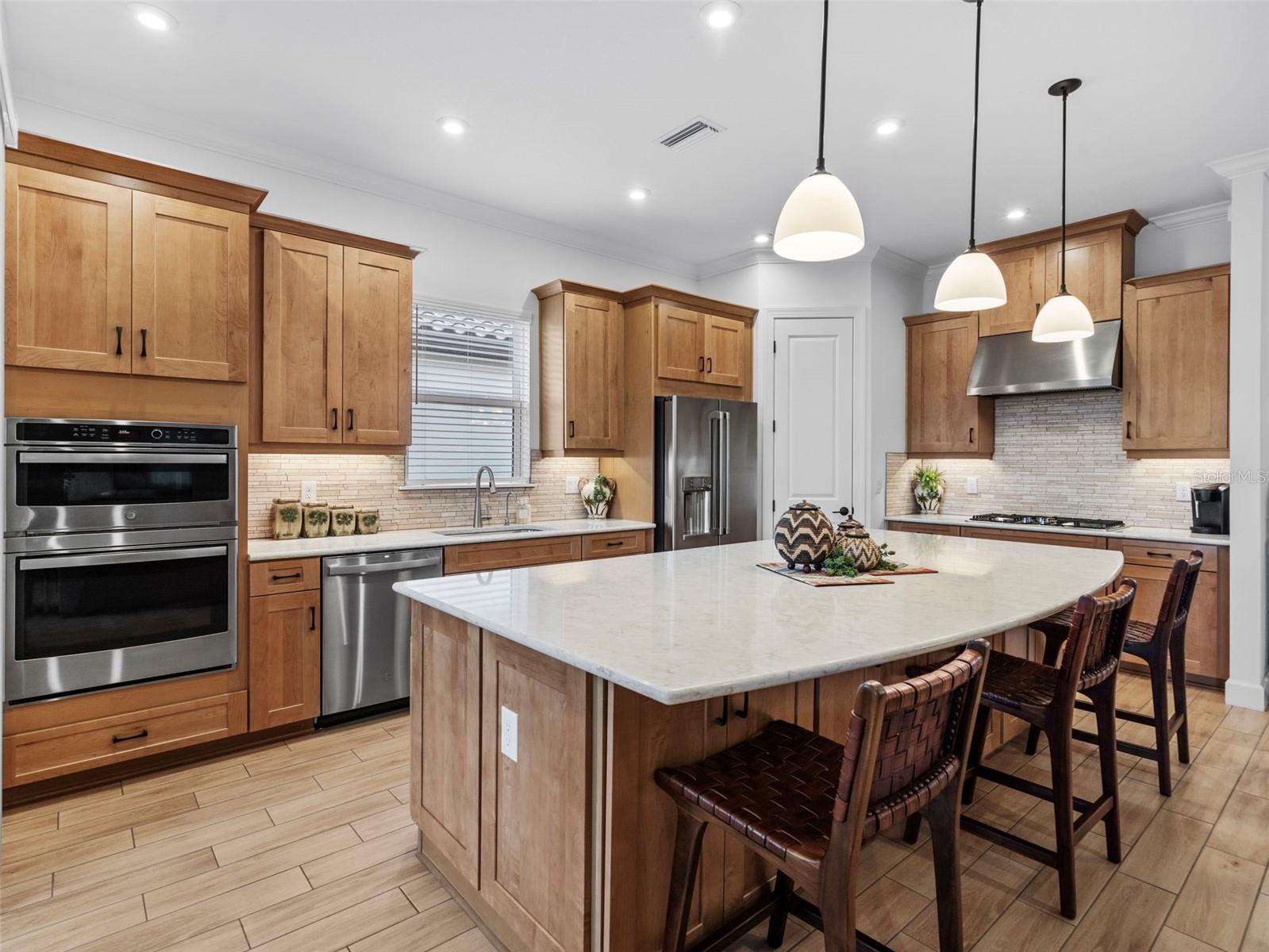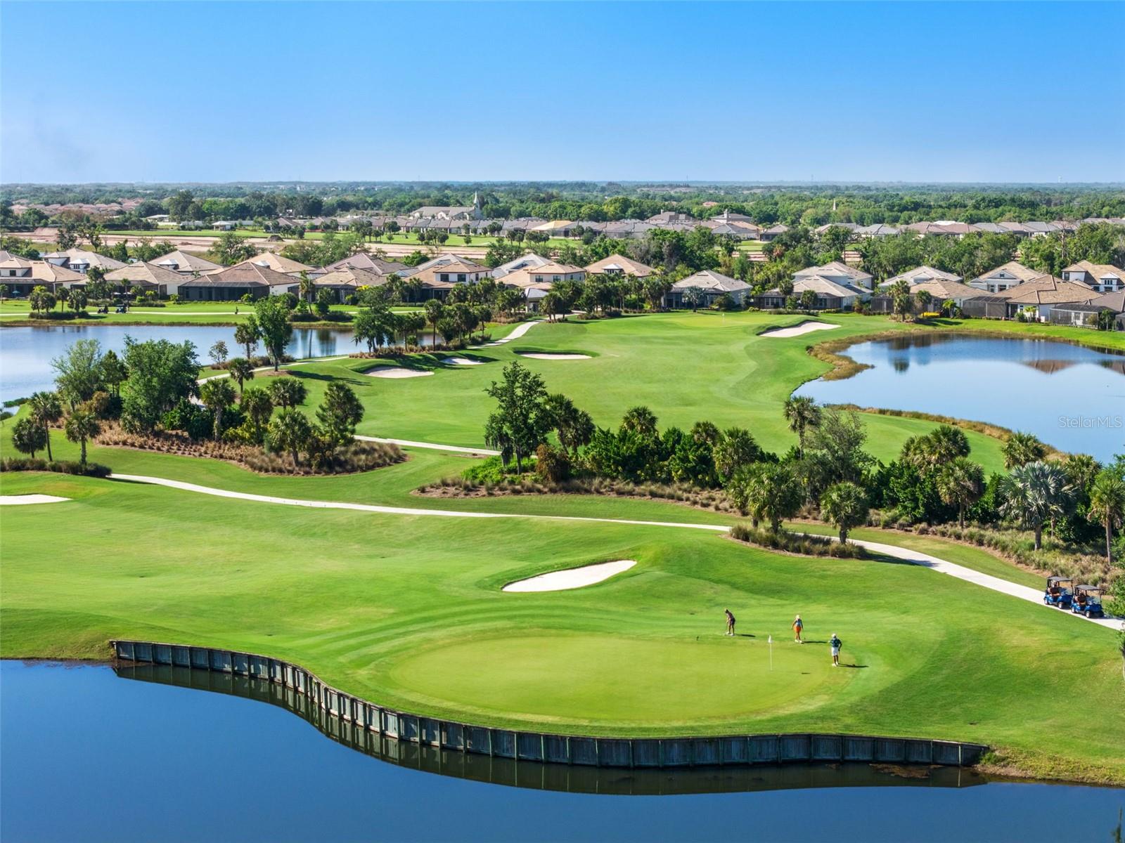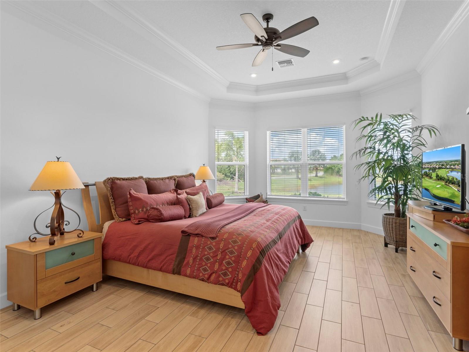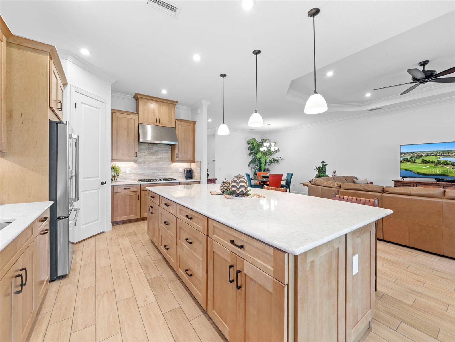 Welcome to Southwest Florida's premier community, Esplanade Azario, where luxury meets comfort in the highly acclaimed Lazio floor plan. Positioned on a tranquil lake-view lot, this beautifully landscaped residence embodies modern elegance and a relaxed lifestyle. Upon entry, discover the inviting ambiance created by high tray ceilings, crown molding, expansive 10-foot ceilings, and porcelain tile throughout. The centerpiece of the home is the gourmet kitchen, complete with maple cabinets, upgraded GE appliances, quartz countertops, upgraded cabinet drawers, extra knee high cabinets in the island, and a gas cooktop with a hood—an ideal space for both cooking and entertaining. The primary bedroom offers a serene escape with its bay window framing picturesque lake views. Its ensuite bathroom features a walk-in shower with an additional shower head, dual vanities, and a spacious walk-in closet. Two additional guest rooms, each with their own bathrooms featuring walk-in showers, ensure privacy and comfort for family and guests. A versatile den/office with French doors, complemented by a built-in desk and storage cabinets, provides a perfect retreat for work or relaxation. Step out onto the fully extended covered lanai to discover a full outdoor kitchen, a cozy gas fireplace, and breathtaking lake vistas—an ideal setting for outdoor gatherings and relaxation. Additional features include a well-appointed laundry room with upgraded cabinets and a sink, a 2-car garage with an additional 4-foot storage space, and extra storage racks, and landscape lighting. Esplanade Azario offers a wealth of resort-style amenities including a pool, Tiki Bar, Culinary Center, fitness facilities, spa services, tennis and pickleball courts, bocce ball courts, and dog parks. A dedicated Lifestyle Director ensures a vibrant community with activities for every interest. Experience the epitome of luxury living at Esplanade Azario. Schedule your private tour today and envision the exceptional lifestyle awaiting you in this remarkable home.