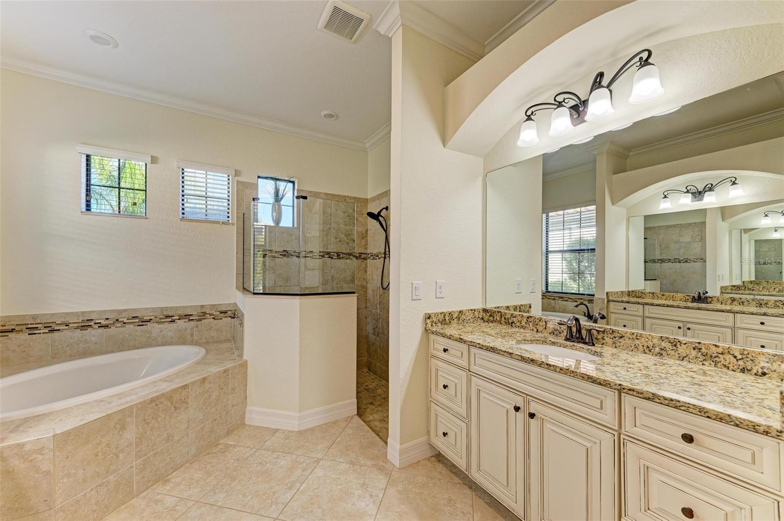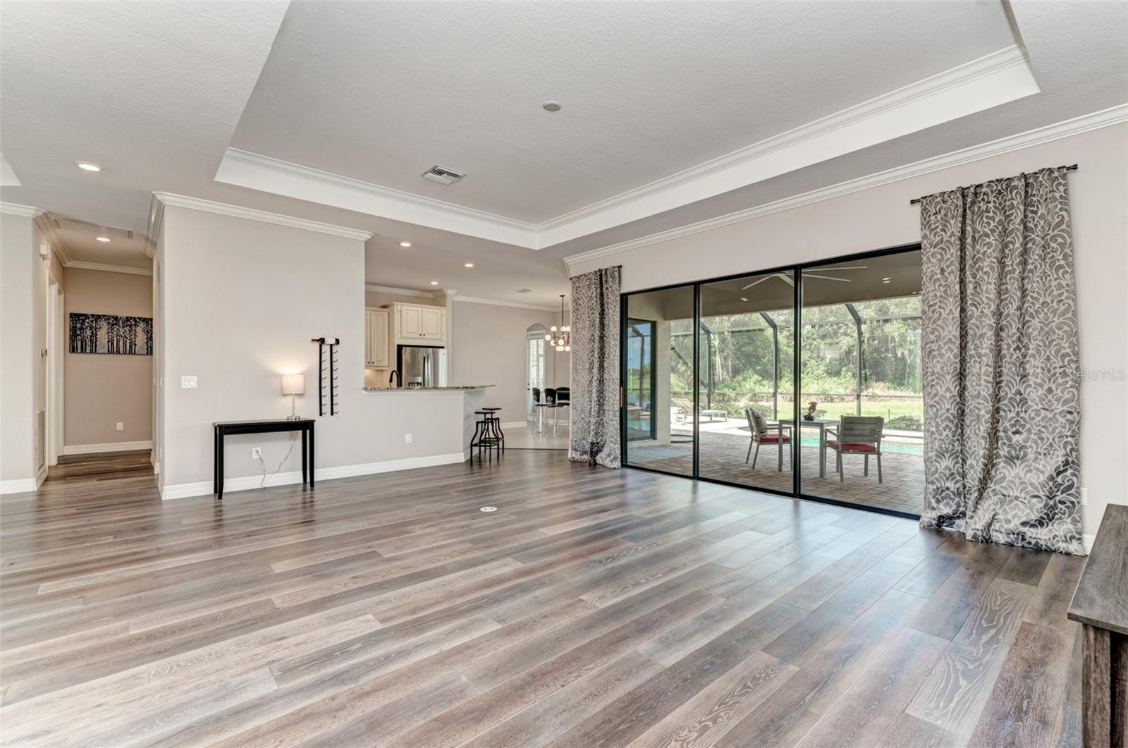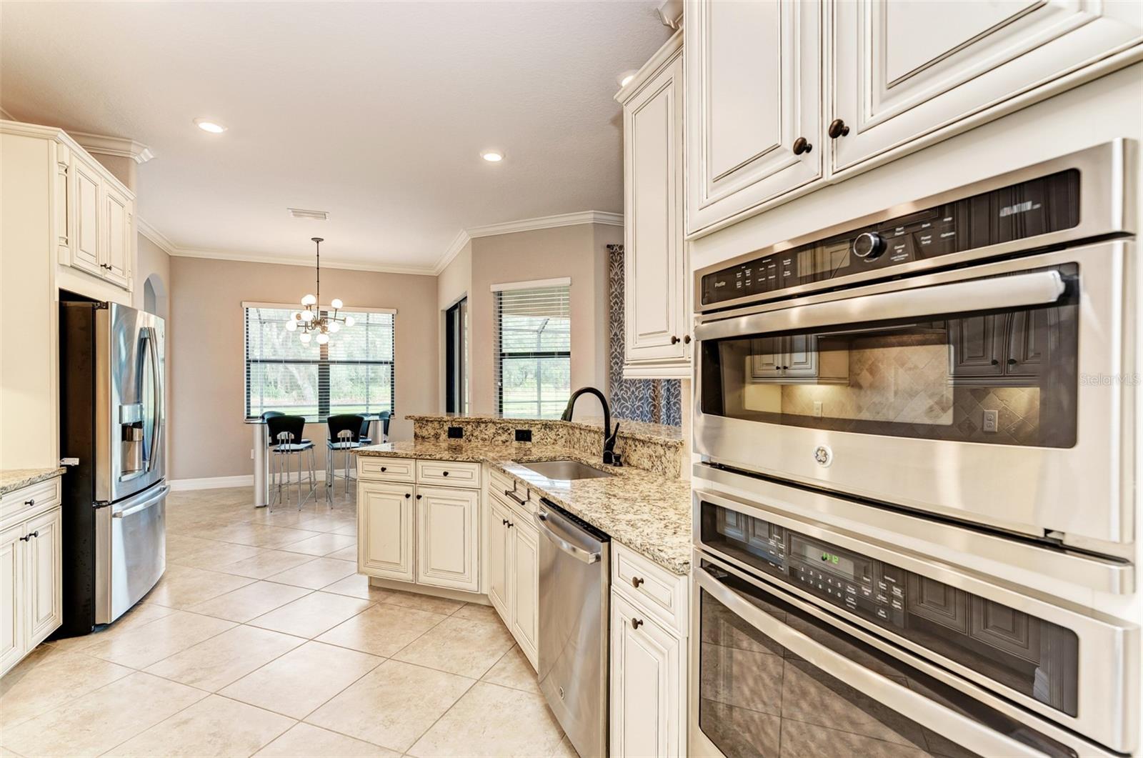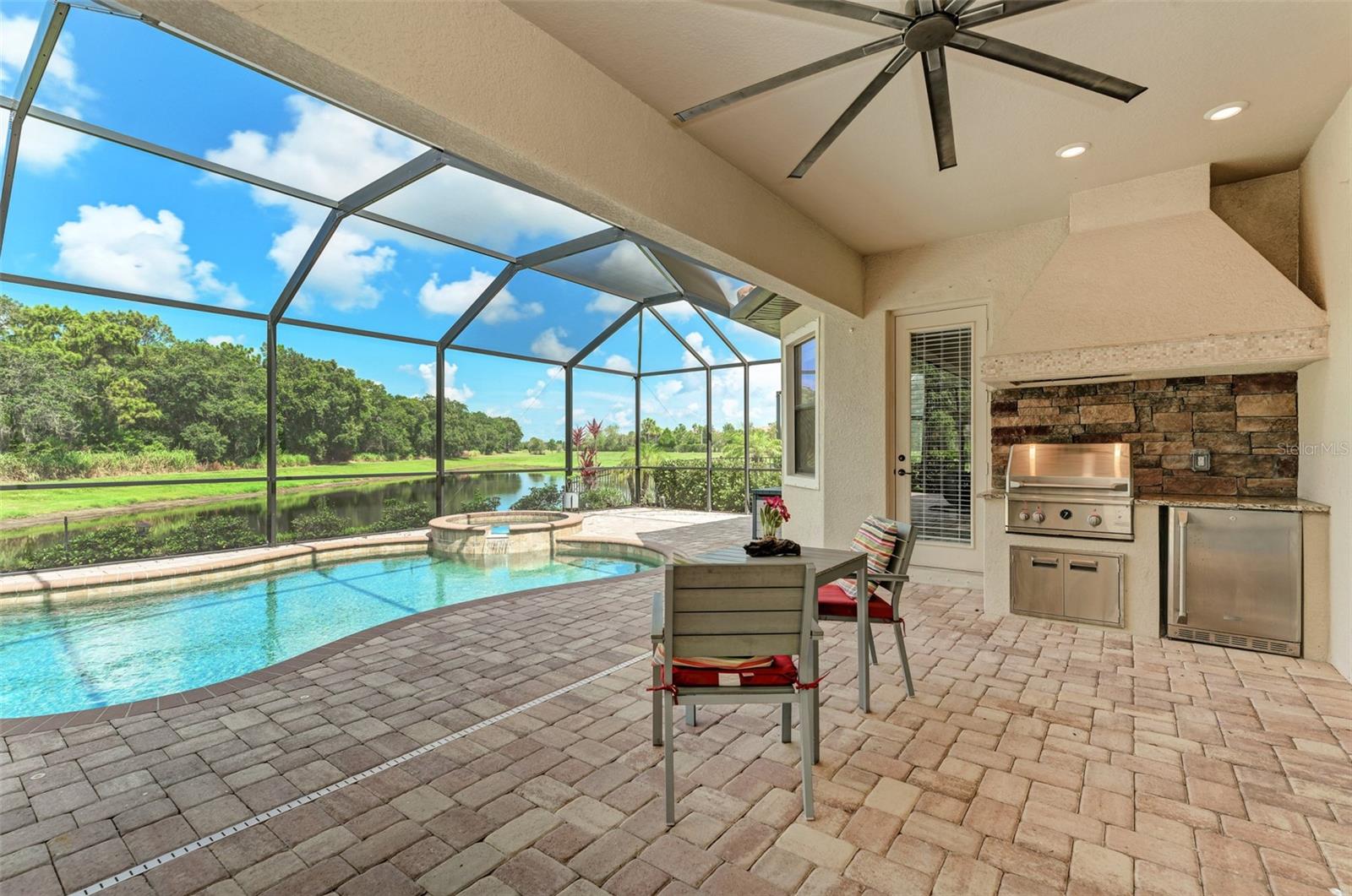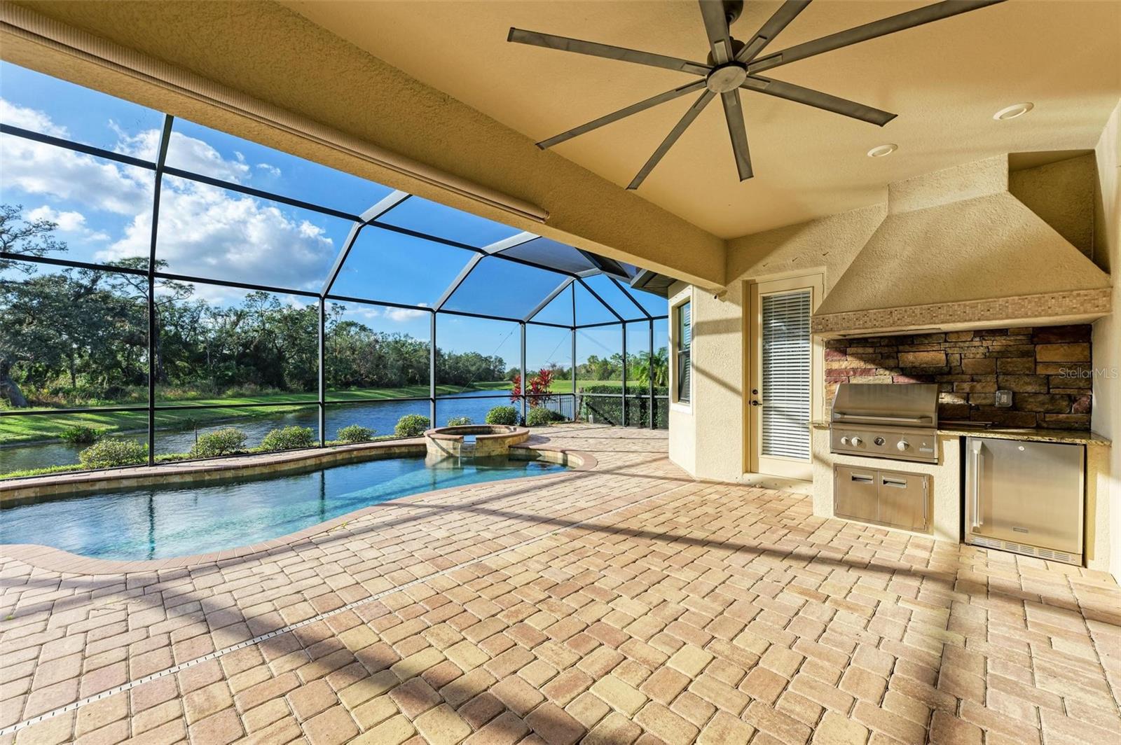 One or more photo(s) has been virtually staged. This neatly maintained home features warm dark hardwood floors and oversized stone tile. Magnificent preserve and water views will take your breath away. The gourmet kitchen is a chef's dream with a 5 burner gas stovetop and double ovens. Deep sink with touch faucet. Enjoy amazing sunsets over the water from a large screened lanai with a heated pool and spa. The outdoor kitchen has a gas grill and wine/bev. fridge. An oversized master suite with his and hers vanities, a soaking tub and a walk-in shower. Two guest bedrooms plus home office/den with double french doors for privacy. A huge three-car garage is ideal for storage. Single story/Ranch. Gated community, maintenance-free includes landscaping/yard work.
