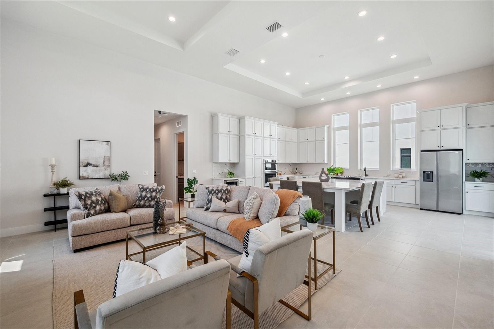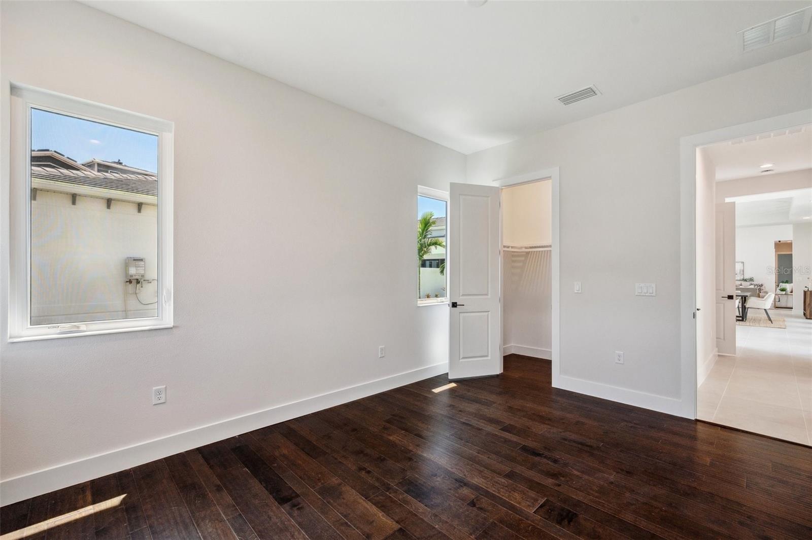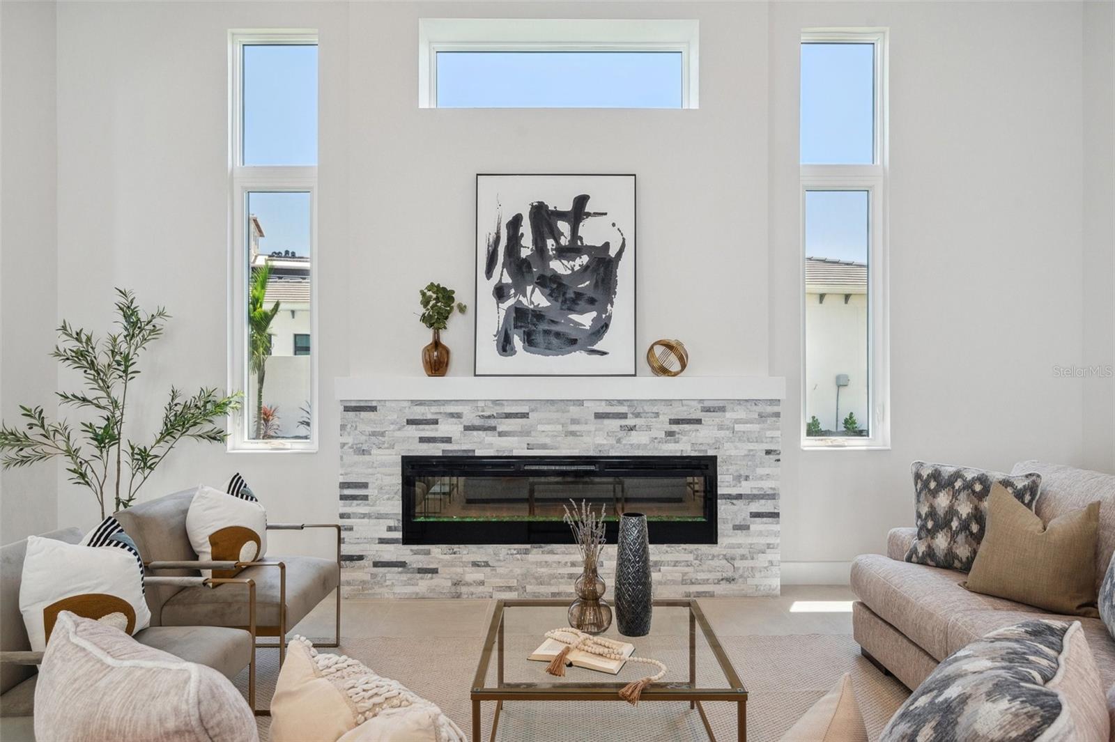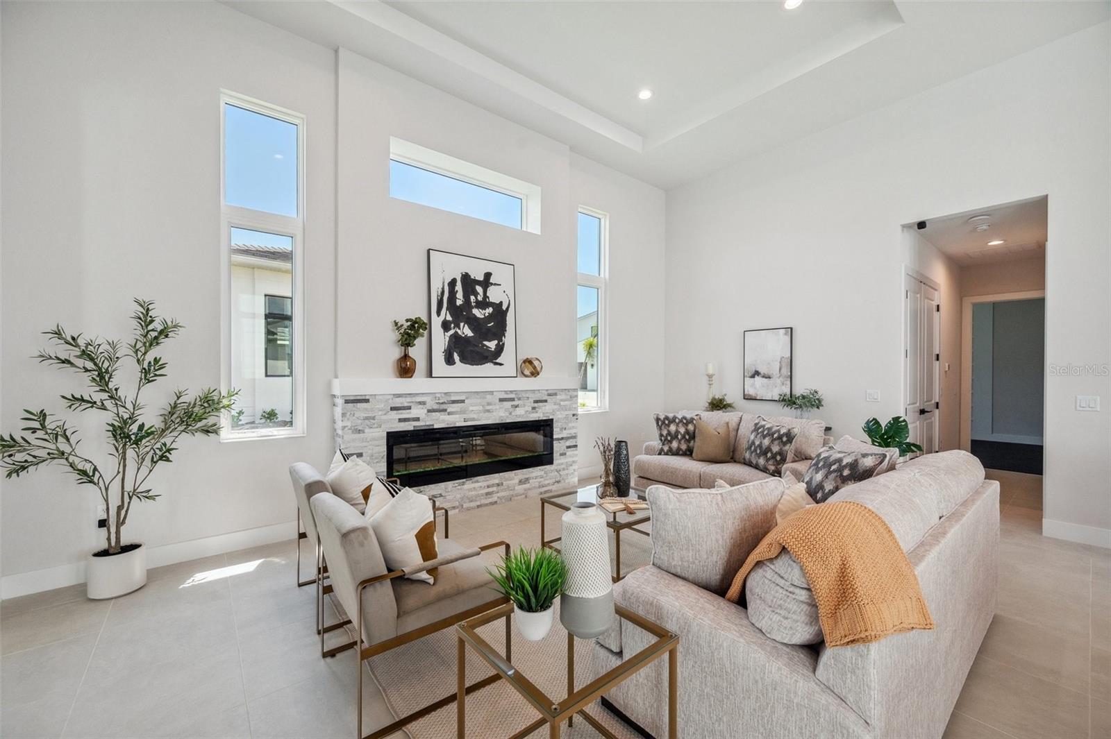 Welcome to this stunning, never-lived-in, masterfully designed home. This residence features a highly customized Sea Grape model floor plan, offering all the luxury and convenience without the lengthy construction process. Nestled within the prestigious gated community of Aqua, this home epitomizes the ultimate Florida resort lifestyle, complete with access to a private 4-acre tropical lagoon. Located in a non-flood zone, this block construction home, crowned with a durable tile roof, is built to hurricane codes, ensuring peace of mind with no flood insurance required. Set on a unique extended lot in a well-designed elevated subdivision with advanced water management systems, All windows are PGT hurricane impact windows, offering further peace of mind and maximum protection during storm seasons. This custom extended floor plan, nearly 200 sq ft larger than standard models, offers expansive living space on a premium lot—a rare feature no longer available in new builds. The single-level design boasts three generously sized bedrooms, three luxurious bathrooms, and a two-car garage. The great room captivates with its soaring 14 ft ceilings, while the rest of the home impresses with 10 ft to 11 ft ceilings throughout. For added convenience, a dedicated laundry room has been thoughtfully included. The heart of the home is the modern courtyard—a 558 sq ft oasis seamlessly connecting the kitchen and primary bedroom through upgraded hurricane-impact sliders. This remarkable indoor-outdoor space features a private heated spool with six jets, all controllable via smartphone, a tranquil waterfall, and a privacy fence. Another upgrade is the outdoor kitchen, which is equipped with a gas grill. Inside, the grand gourmet kitchen is a chef's dream, featuring a large extended island, high-end appliances, a gas range, and a stylish island hood. Tray ceilings add a touch of elegance throughout the home. Premium floor tiles, a cozy fireplace, and a dedicated 60-amp car charging station further enhance your living experience. For modern efficiency, the home is equipped with whole-home spray foam insulation, a micro-leak detection system, and additional insulation around the AHU closet. All windows are hurricane-proof, providing additional security and peace of mind. Ideally located directly across from the lagoon, this home offers easy access to a variety of community amenities, including swimming, paddleboarding, and kayaking. Low HOA dues cover fiber internet, TV, and outdoor landscaping, making this home a perfect blend of luxury and convenience. Don’t miss out on this extraordinary opportunity—schedule your private tour today!