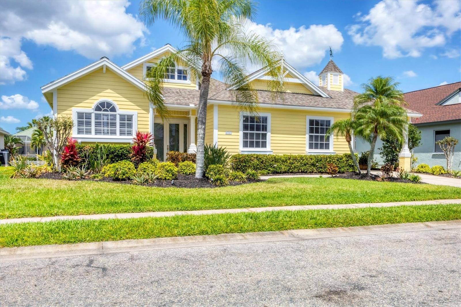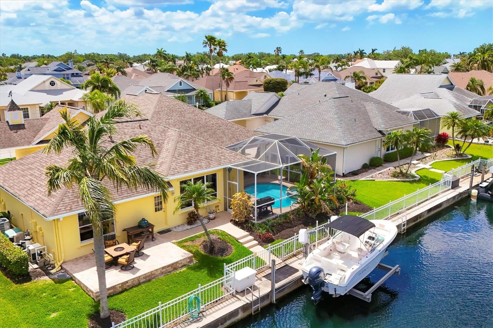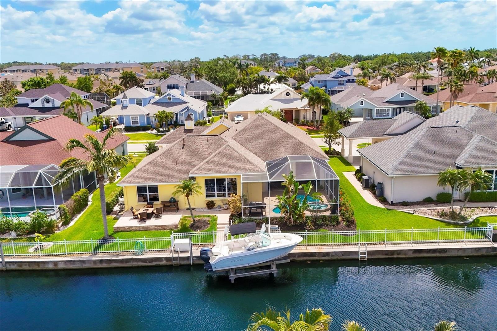 Beautiful Key West home in premier boating community of The Inlets with attached 15K boat lift! Updated 4 bedroom, 3 bath pool/spa home with large screened patio, outdoor paver patio, and tropical landscaping is the ideal Florida lifestyle retreat you’ve been waiting for! Open plan with high ceilings, light and bright coastal style, lots of windows that bring the outdoors in make this a great home for entertaining! Kitchen with white cabinets, granite counters & backsplash, and newer SS appliances including double oven range. Laundry/pantry closet with appliance counter and wall cabinets, washer and dryer. Large Primary Suite with sliders to Lanai & Pool view, 2 closets, one a large walk in. Spacious bath with two separate sink vanities, garden tub, walk-in tile shower, and private toilet. Split plan offers 2 additional bedrooms, a large hall bath, and an office/4th bedroom at rear next to the 3rd bath that is also accessed from the pool area. Enjoy living and dining outside in the expansive covered lanai overlooking the beautiful pool that adds to the vacation feel of this home. Built Ins include crown moldings & valances, buffet in Dining, shelves in Family, and desks/cabinets in Office. 2025 exterior & garage paint; 2023 Heat Pump AC, pool pump & gas heater; 2020 pool/spa resurface; 2018 roof; gas water heater; hurricane/shade shutters; wired for generator & security system, built in speakers, electric shades. Bring your boat and enjoy the best of waterfront lifestyle, dock up to a 36 ft boat with power and water to enjoy boating, fishing, and visiting local waterfront restaurants & venues by boat. Access to Manatee River, & Gulf, many social activities, tennis, walking trails, fishing dock, kayak launch, playground, sidewalks, and gas streetlamps. Easy access, near I-75 & SR64, just 6 nautical miles to Tampa Bay, 12 mi to Gulf, close to airports, restaurants, shopping, beaches, Sarasota, St. Pete & Tampa. No CDD, low HOA & low flood insurance.