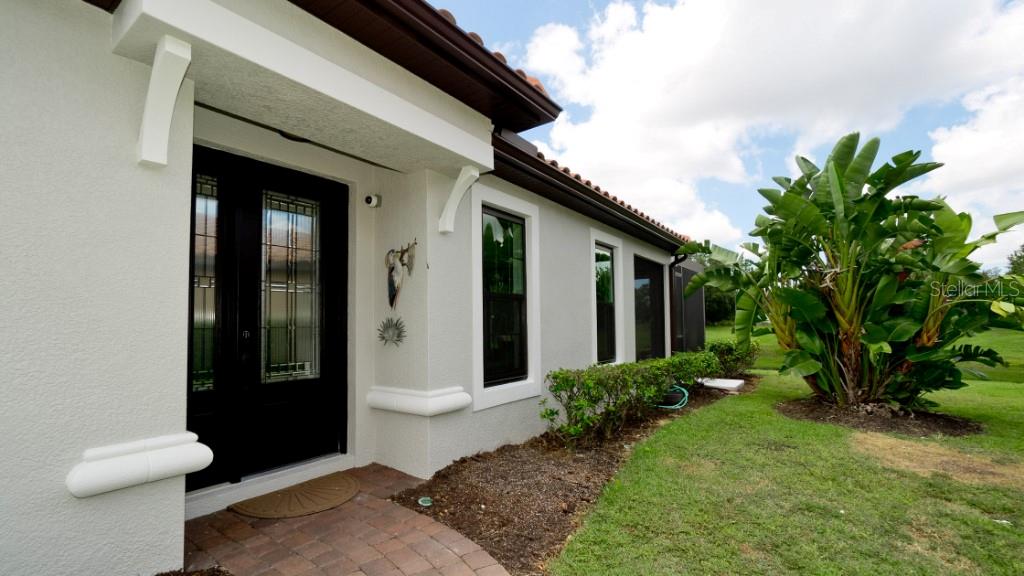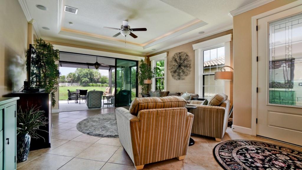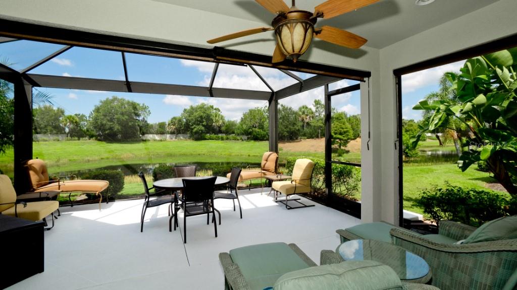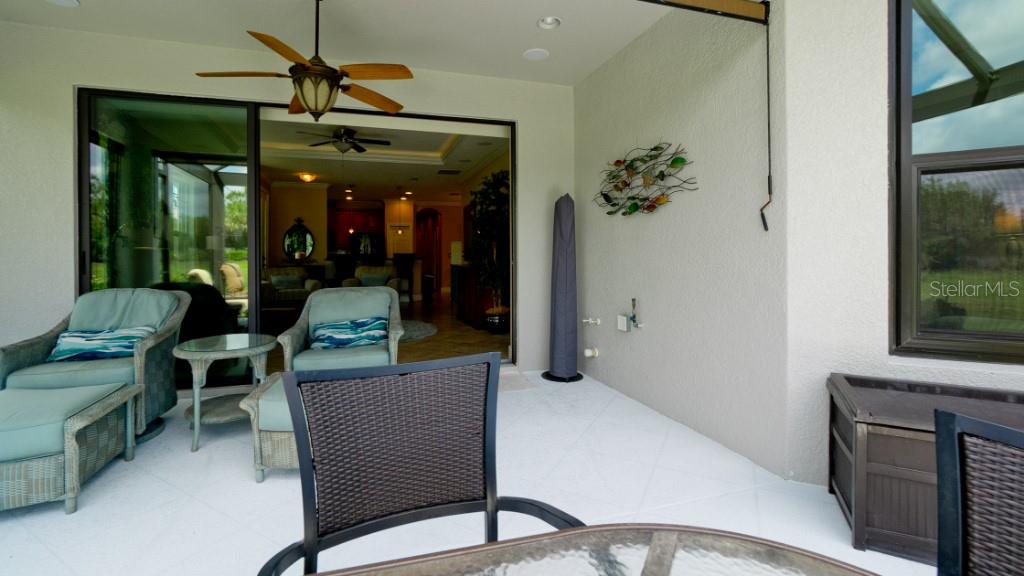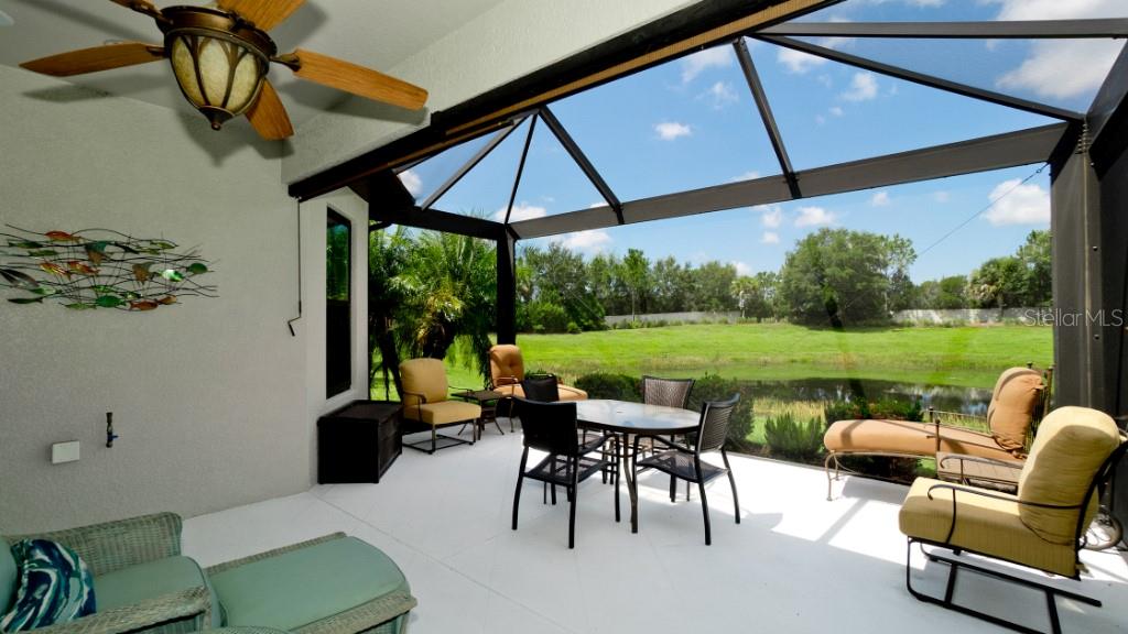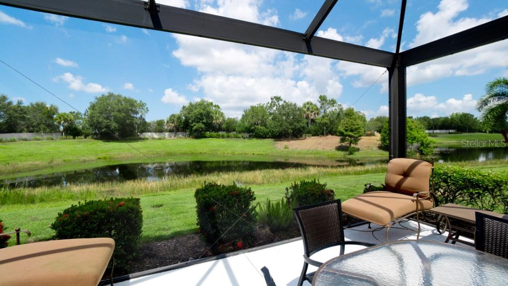 Welcome to luxury living at Esplanade Golf Club Community of Lakewood Ranch! Elevate your lifestyle with this exquisite two bedroom, two bath home with office. Come see the private water view! Recently painted exterior, recently replaced HVAC system, IMPACT windows (warranty transfers to new buyer), central vac, covered/screened lanai with 16’ extension, stamped concrete and ‘picture window super fine screening’ with Nebula LED night lighting for entertaining, lanai ceiling fan w/light, retractable sun shades, unobstructed water view, private, outdoor kitchen rough-in with gas connection ready to customize to your taste, extra wide/long garage with epoxy floor coating and shelving, alarm system with 4 high-res cameras. CDD fees paid in full. No golf membership. Pets and fencing allowed with size restrictions. This Roma model has tile flooring in main living areas, carpet in the 2 bedrooms, 2 tiled bathrooms with walk-in showers, plus office/den and dining room both with opaque transom windows, attached extra long/wide 2 car garage with paver driveway and professionally installed walkway with path lights and up-lighting. Crown molding, central vac with kick plate in the kitchen, lighted tray ceilings and ceiling fans in all main rooms, surround speakers in living room/lanai, tankless water heater, ADA toilets. As you enter into the open floor plan your eye is immediately drawn to the spectacular private, unobstructed water view! The kitchen is spacious with 42” upper cabinets, tile backsplash, granite countertops, new garbage disposal and new Kohler kitchen faucet, black stainless steel appliances, gas stove, breakfast bar and lots of storage and counter space. Off the great room is the primary bedroom which includes a ceiling fan/light, beautiful bay window along with a private bathroom with double vanity, a large shower and a custom- built walk-in closet. The second bedroom has a ceiling fan/light and private bathroom. The laundry room offers utility sink and choice of gas or electric dryer connect (washer/dryer included in price.) The den makes a great flex space and has double pocket doors, ceiling fan/light, lighted tray ceiling and opaque transom window. This home is "maintenance free" which includes access to tennis courts, pickleball, and bocce ball. Dive into luxury at the heated lagoon-style pool or unwind at the full service day spa or Tiki Bar. Additional highlights include a resistance pool, two fitness centers, outdoor barbecue areas, fire pits, and two dog parks. Indulge in culinary delights with cooking lessons or diverse dining options at the new Culinary Center. For golf enthusiasts, Esplanade offers an 18-hole golf course set amidst 600 acres of picturesque landscape. Located just minutes from I-75, dining and shopping at University Town Center, Lakewood Ranch Main Street and Ellenton Outlet Mall. Beaches in Sarasota and Manatee County are a short drive as are both Sarasota and Bradenton Downtown areas. Don't wait come see your future home today!!!