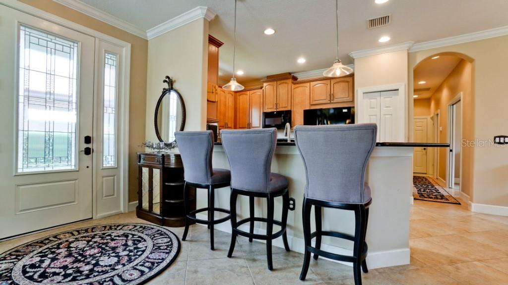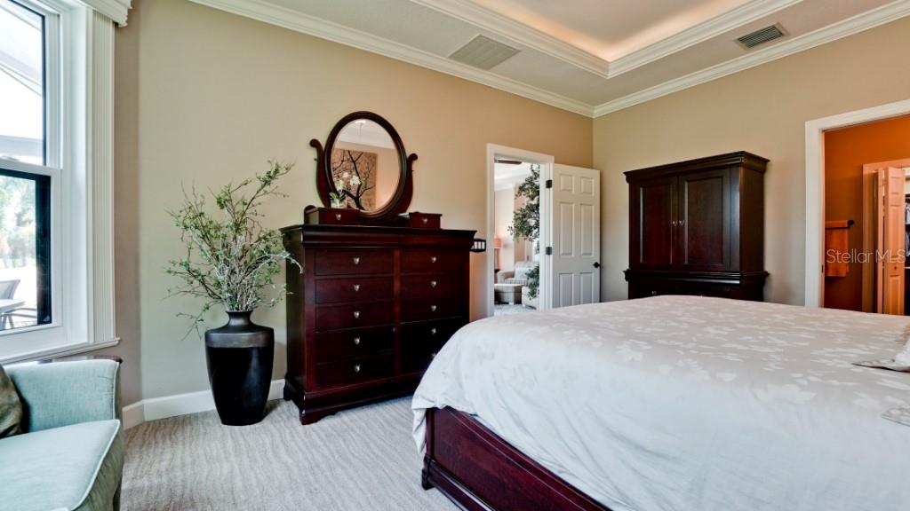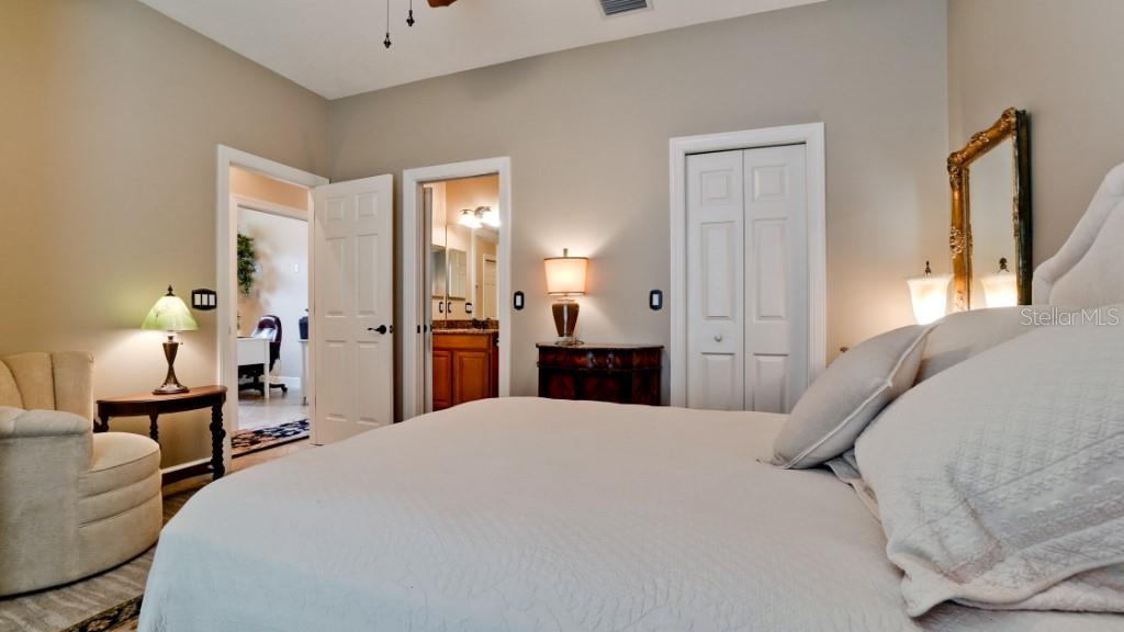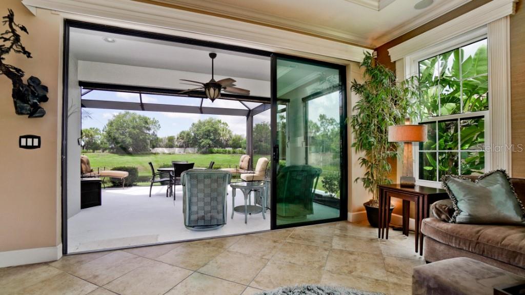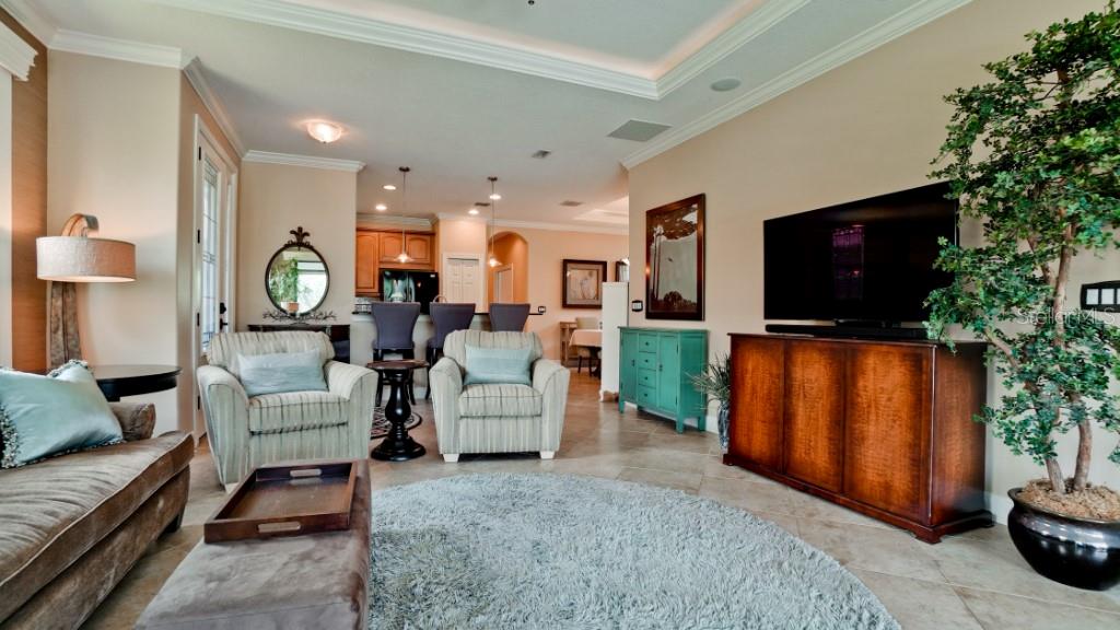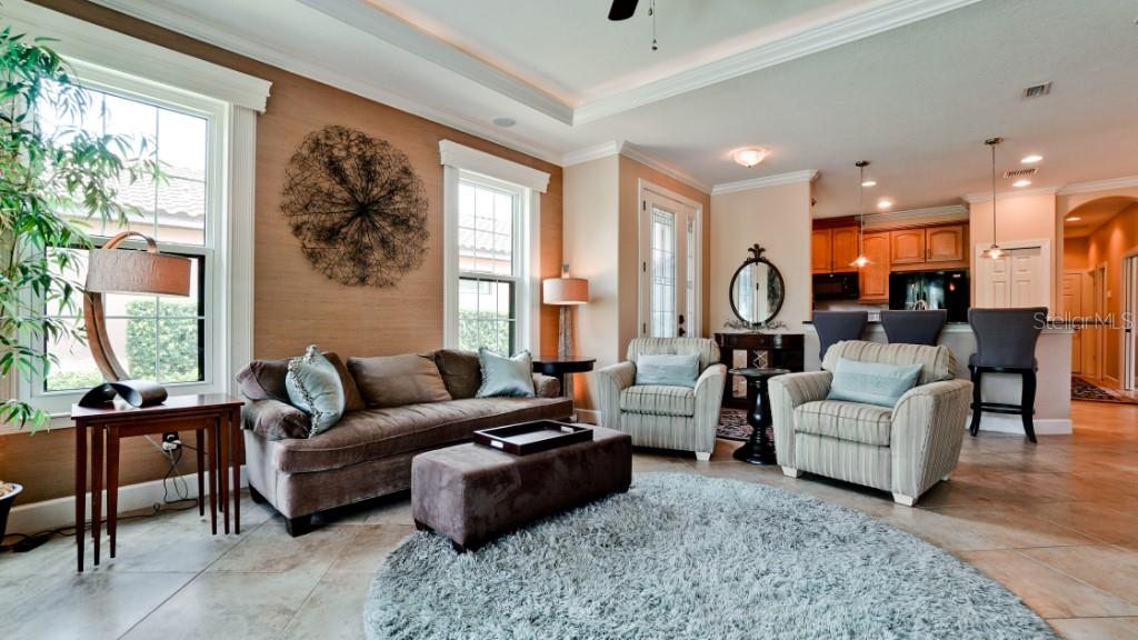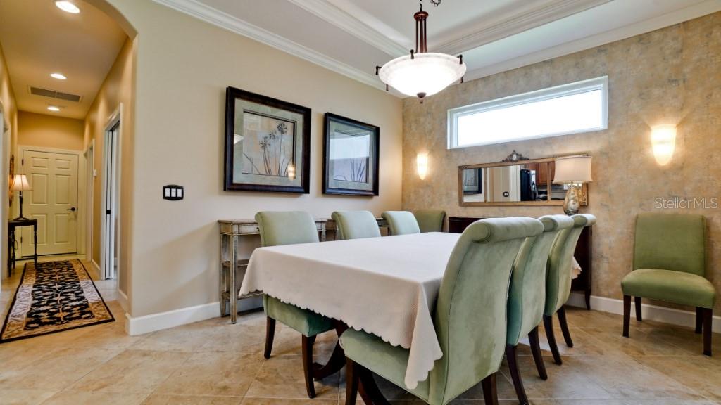 Welcome to luxury living at Esplanade Golf Club Community of Lakewood Ranch! Elevate your lifestyle with this exquisite two bedroom, two bath home with office. Come see the private water view! Recently painted exterior, recently replaced HVAC system, IMPACT windows (warranty transfers to new buyer), central vac, covered/screened lanai with 16’ extension, stamped concrete and ‘picture window super fine screening’ with Nebula LED night lighting for entertaining, lanai ceiling fan w/light, retractable sun shades, unobstructed water view, private, outdoor kitchen rough-in with gas connection ready to customize to your taste, extra wide/long garage with epoxy floor coating and shelving, alarm system with 4 high-res cameras. CDD fees paid in full. No golf membership. Pets and fencing allowed with size restrictions. This Roma model has tile flooring in main living areas, carpet in the 2 bedrooms, 2 tiled bathrooms with walk-in showers, plus office/den and dining room both with opaque transom windows, attached extra long/wide 2 car garage with paver driveway and professionally installed walkway with path lights and up-lighting. Crown molding, central vac with kick plate in the kitchen, lighted tray ceilings and ceiling fans in all main rooms, surround speakers in living room/lanai, tankless water heater, ADA toilets. As you enter into the open floor plan your eye is immediately drawn to the spectacular private, unobstructed water view! The kitchen is spacious with 42” upper cabinets, tile backsplash, granite countertops, new garbage disposal and new Kohler kitchen faucet, black stainless steel appliances, gas stove, breakfast bar and lots of storage and counter space. Off the great room is the primary bedroom which includes a ceiling fan/light, beautiful bay window along with a private bathroom with double vanity, a large shower and a custom- built walk-in closet. The second bedroom has a ceiling fan/light and private bathroom. The laundry room offers utility sink and choice of gas or electric dryer connect (washer/dryer included in price.) The den makes a great flex space and has double pocket doors, ceiling fan/light, lighted tray ceiling and opaque transom window. This home is "maintenance free" which includes access to tennis courts, pickleball, and bocce ball. Dive into luxury at the heated lagoon-style pool or unwind at the full service day spa or Tiki Bar. Additional highlights include a resistance pool, two fitness centers, outdoor barbecue areas, fire pits, and two dog parks. Indulge in culinary delights with cooking lessons or diverse dining options at the new Culinary Center. For golf enthusiasts, Esplanade offers an 18-hole golf course set amidst 600 acres of picturesque landscape. Located just minutes from I-75, dining and shopping at University Town Center, Lakewood Ranch Main Street and Ellenton Outlet Mall. Beaches in Sarasota and Manatee County are a short drive as are both Sarasota and Bradenton Downtown areas. Don't wait come see your future home today!!!