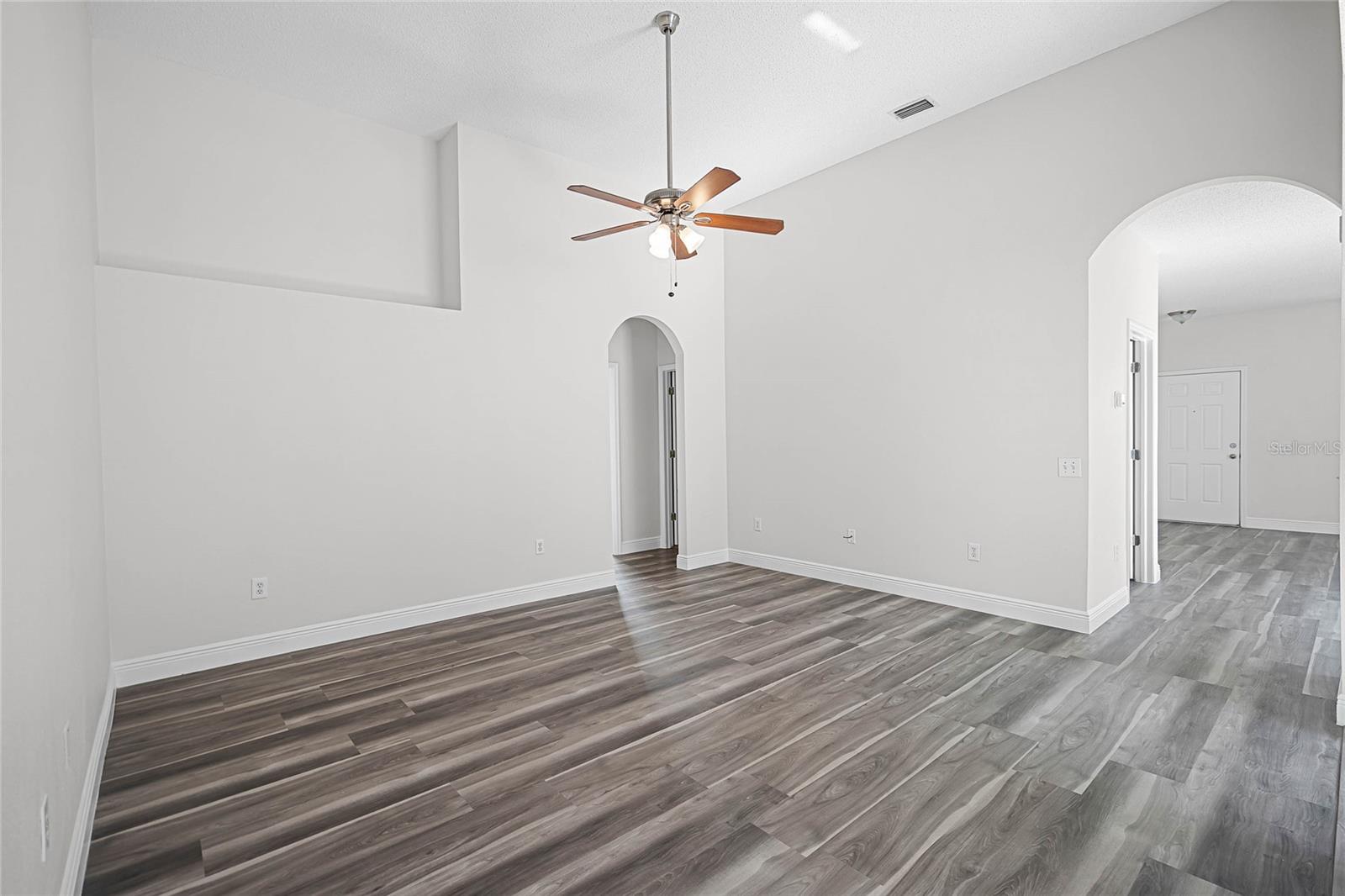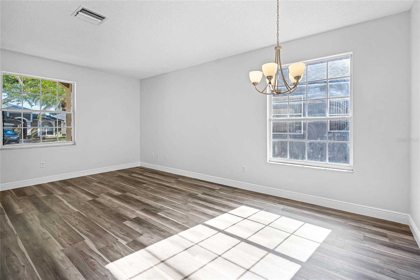 THREE bedroom ~ TWO bath home located in LAKEVIEW VILLAGE! As you enter you will notice the VERY OPEN floor plan and HIGH CEILINGS to offer a very spacious feel. The Kitchen is open to the family room and there is eating space in the kitchen along with wood cabinets, solid surface counter tops and stainless steel appliances. The MASTER bedroom is nice size measuring 12x16 and a nice size walk in closet. The master bathroom has dual sinks, soaking tub and separate shower. Both bathrooms have new toilets installed. The remaining two bedrooms are as well nice size. The entire interior has just been repainted as well as NEW luxury VINYL flooring throughout the home in exception of the kitchen and bathrooms, which have tile. stroll outside and enjoy time on the COVERED newly SCREENED rear porch. The backyard offers a few nice shade trees and is fully fenced with white vinyl fencing.