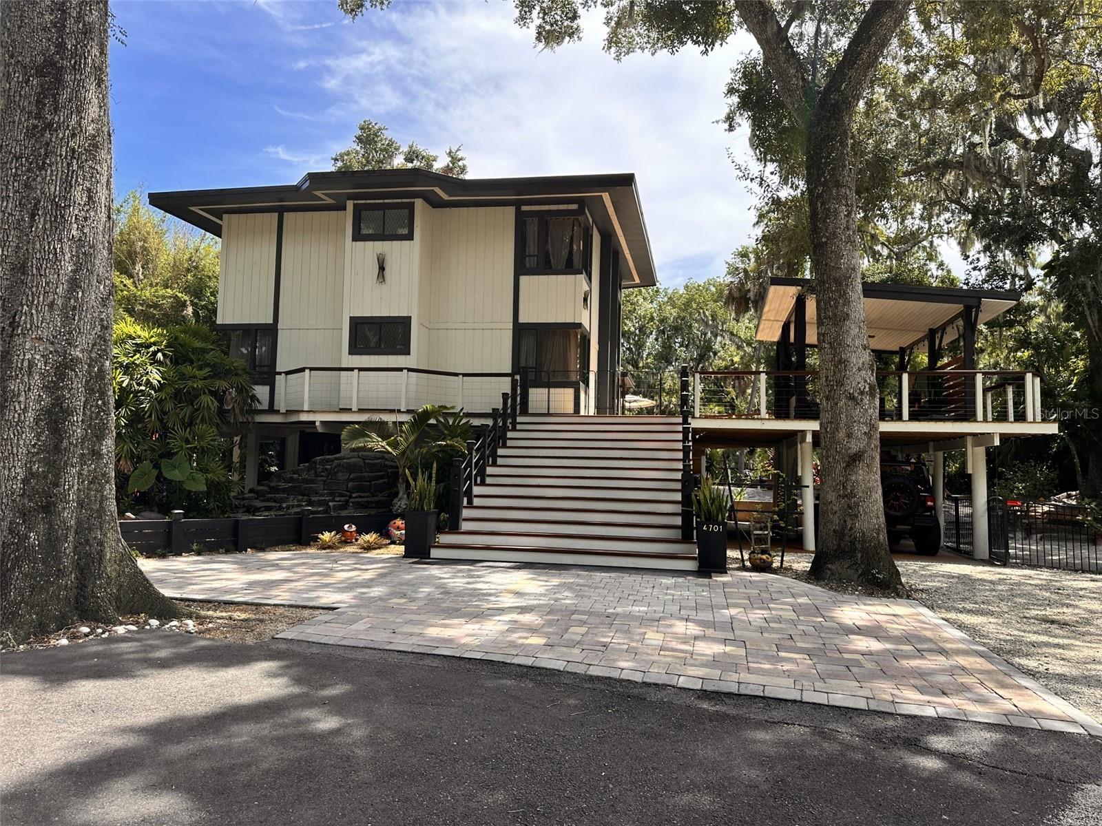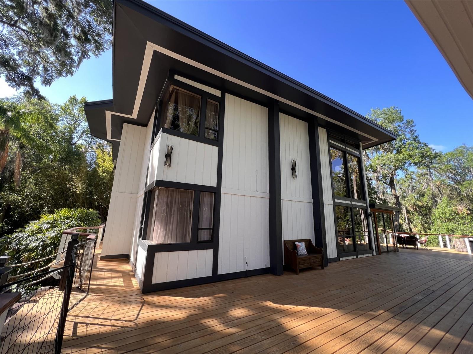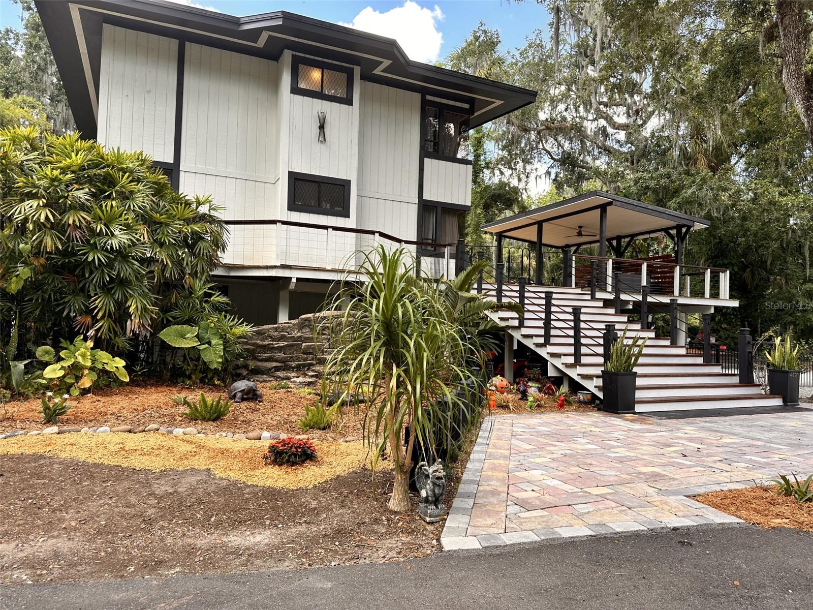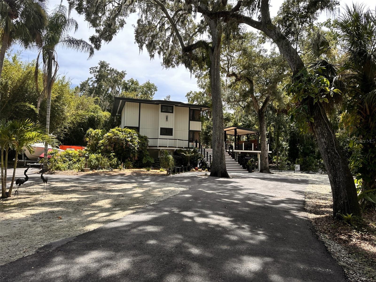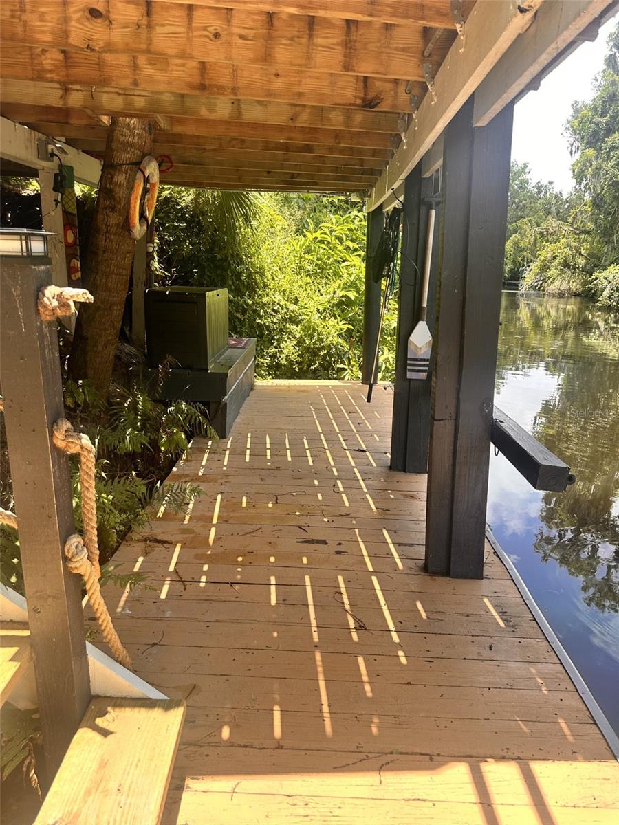 One Acre Water Front Home with 5 bedrooms 3 bathrooms and boat Dock (90 feet water front) in exclusive Gated luxury community known as the Alafia Preserve. This luxury custom home is built on the Alafia River, well known for bountiful wildlife, exotic birds, manatees, dolphins, turtles, rays, & lots of migratory game fish to catch right off the dock. The entryway of this property is behind a beautiful waterfall feature with private access gate, where there are currently 4 homes. Each of the estate properties is tucked back along a well maintained & landscaped jungle drive, presenting the impressive homes in a quiet community. This home is architect designed & custom built, at the river's edge of a one acre lot. It is well planned, with intentions to have a timeless modern design, huge picture windows, & high vaulted ceilings with an open air feel. The acreage of this property is 80% in front of the home, and the house is built on the 90 feet of Alafia River frontage, with an impressive multi level deck, and beautiful trees providing shade and home to many cute & friendly animals. The paver entry drive into the the property features sights of a massive Southern Oak tree canopy, sculpted & mature with palm trees, a water/fire fountain in the center of the circular drive way, and artisan hand crafted ballard landscape lighting imported from a renowned artist metal worker in Phoenix AZ, that feature captivating designs. You will want to see the property at night too, as the lighting and landscape cast amazing & impressive art centric shadows on the grounds. As you drive up to the house you are met with ample guest parking, with pavers leading to the grand entry 12 foot wide stair case. With a 3 level deck, this stately waterfront home has 4 bedrooms & 2 full baths, and there is more; downstairs at ground level is the additional 1 bedroom ,1 full bath and kitchenette studio apartment, with 2 car covered ports for parking. The property also features a dog/pet park with a custom made 8 ft. ceiling pet house designed to match in harmony with the architecture of the main house. There is also a "man cave / she shed" for tools, supplies and storage. The property boasts plenty of room for parking boats, water craft, and room for your trailer, but you may also wish to keep your boat at the dock. The main house features front and back entries on the 2nd level: accessed from the grand entry staircase. Outside you can experience many intriguing features of this property, starting on the 3500 square foot deck surrounding the main home. To visit the boat dock, with room to expand on the 90 ft water front, simply follow the next staircase or the overlook at the waters edge. There is also a davit lift for personal watercraft or small boats.