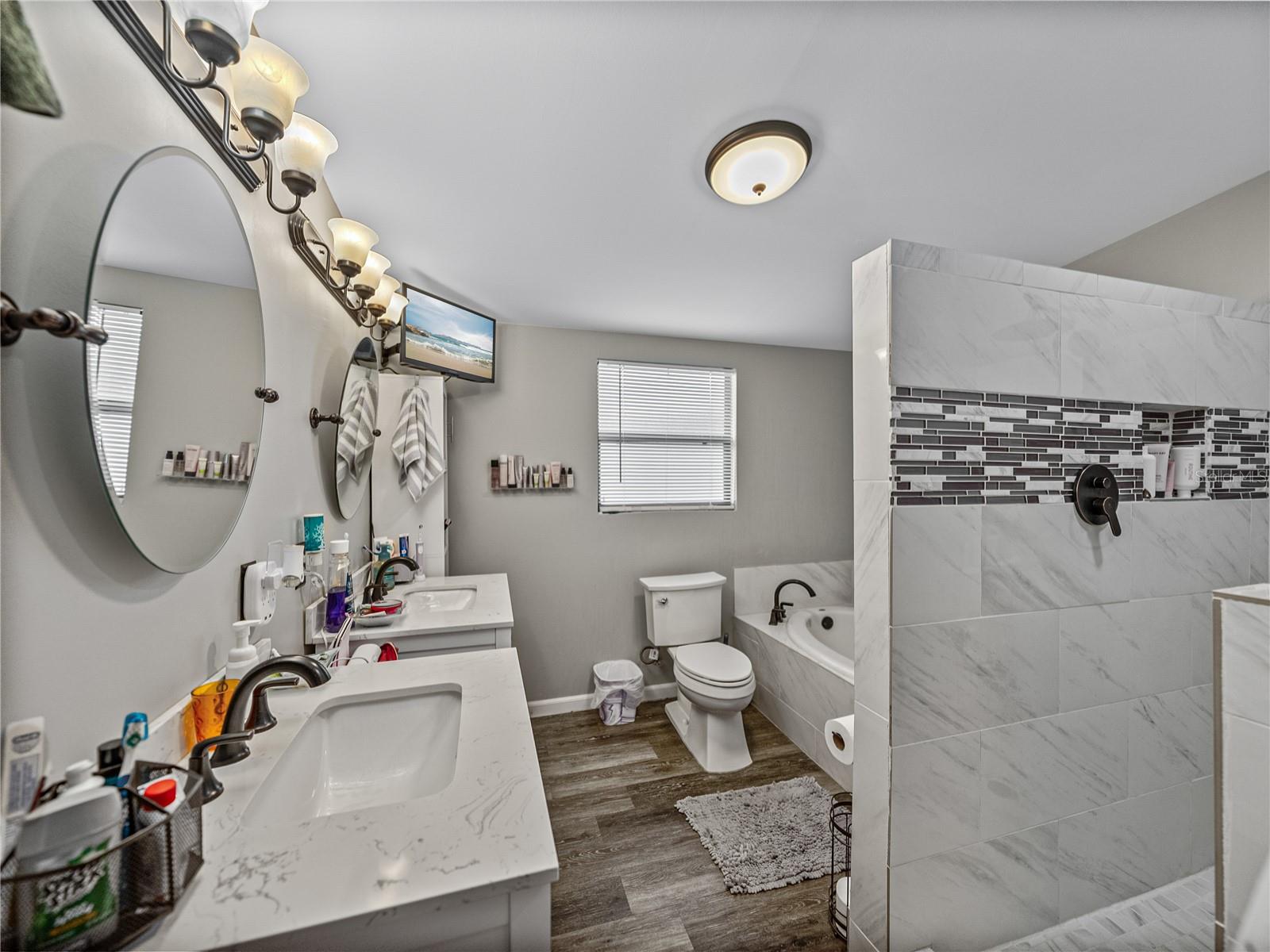Centrally located in Brandon and the perfect opportunity for multi-generational living, this 4 bedroom, 3 bath home awaits! Step inside to a sweeping open floor plan with a recently updated kitchen featuring quartz countertops, wood cabinetry, a central rollaway island, and stainless steel appliances. Enjoy the flexibility the recent renovations have provided- there are 2 spacious living rooms and 2 primary suites!! The main living room is currently used as a dining room, right off the kitchen, and it is a part of the original floor plan. Luxury vinyl plank flooring runs throughout the space and down the hall to 3 generously sized bedrooms, including the first suite with a full ensuite bathroom, and a 2nd renovated full guest bathroom. Split away from these bedrooms and through the second living room; the newer primary/in-law suite has been thoughtfully created to include a walk-in closet, expansive sleeping quarters with access to the backyard, and a spa-like ensuite bathroom. This bathroom has been beautifully completed, including 2 vanities, a walk-in shower, and a soaking tub. An additional storage room with a window AC unit is provided for added convenience. Out back, you can relax the day away under the covered patio, overlook the turfed yard from the covered deck, entertain family and friends, and utilize the 3 storage sheds that convey with the home. Several notable upgrades include a 2019 roof, a 2022 water heater, a recently updated kitchen and bathrooms, newer windows, and newer flooring. All this and more is in an amazing Brandon location, close to major highways, shopping centers, restaurants, and entertainment. Call us today for your private showing!