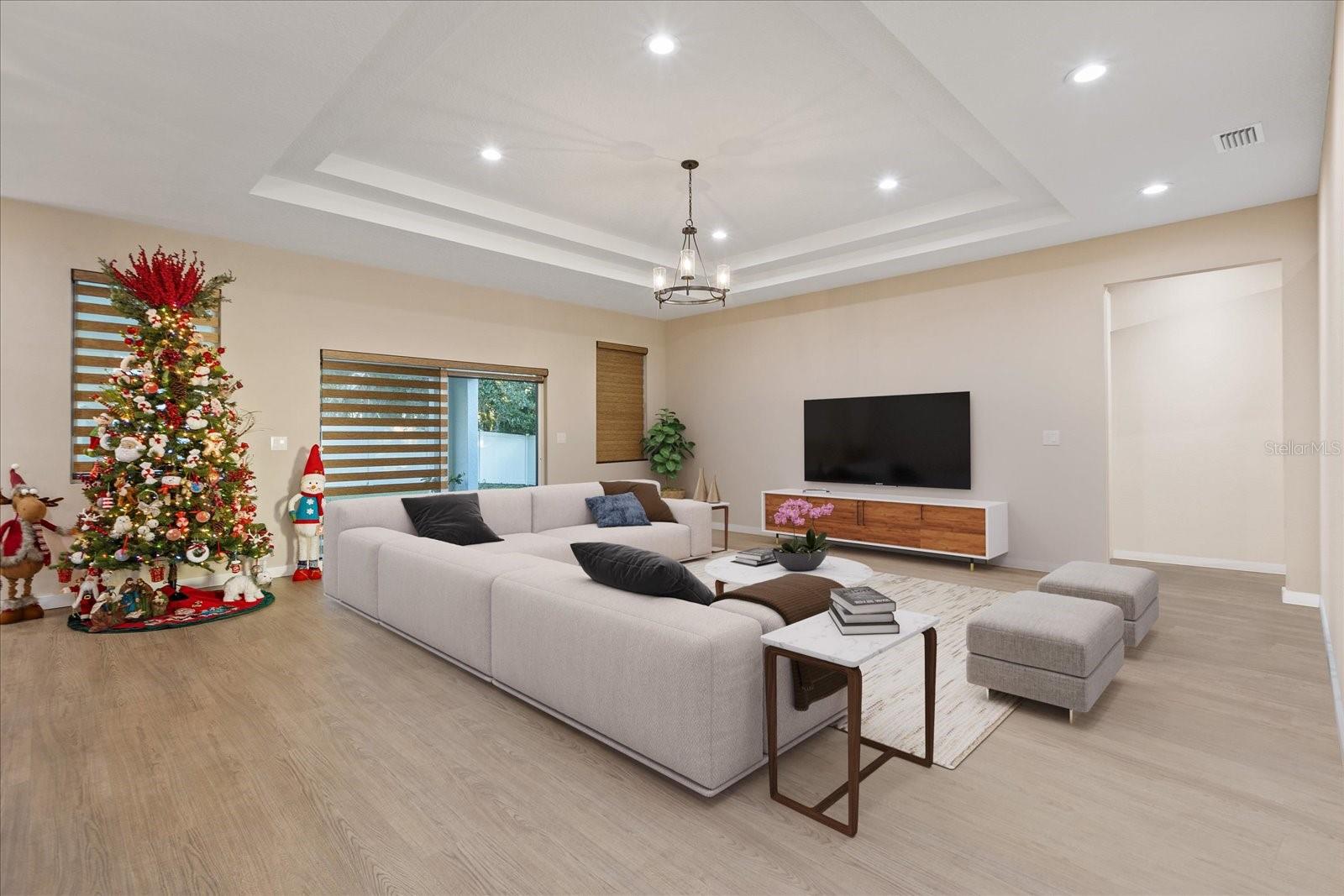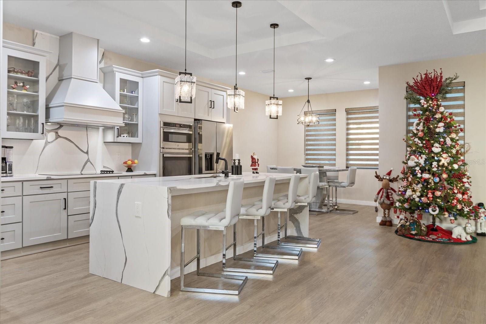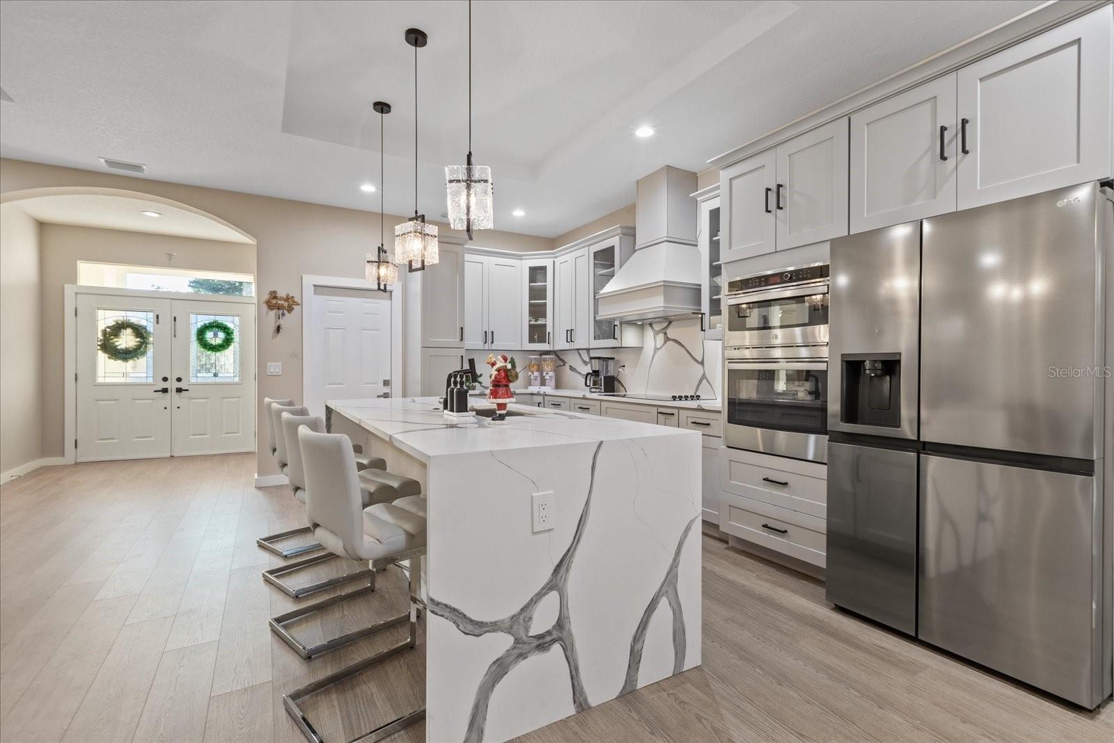 One or more photo(s) has been virtually staged. Beautiful new build in 2024 with 4 bedrooms 3 bathrooms with an oversize garage , the home features a beautiful 14 foot entrance with a double door, the second you come in there is a nice large foyer, a dream kitchen with a water fall on the island, all 42 inch wood cabinets with a nice cooktop with a 36 inch range hood and a double oven ,beautiful marble counter top with full backsplash. all 8 foot doors for all bedrooms, all stand showers in bathroom and a stunning dream bathroom in the master bedroom with a large shower along with gold trim all through out and a beautiful stand alone tub. a double tray ceiling in master bedroom and Livingroom, once you step in the back porch it features a very large covered porch for your get together with an outdoor kitchen with nice black counter t and cover stone walls.