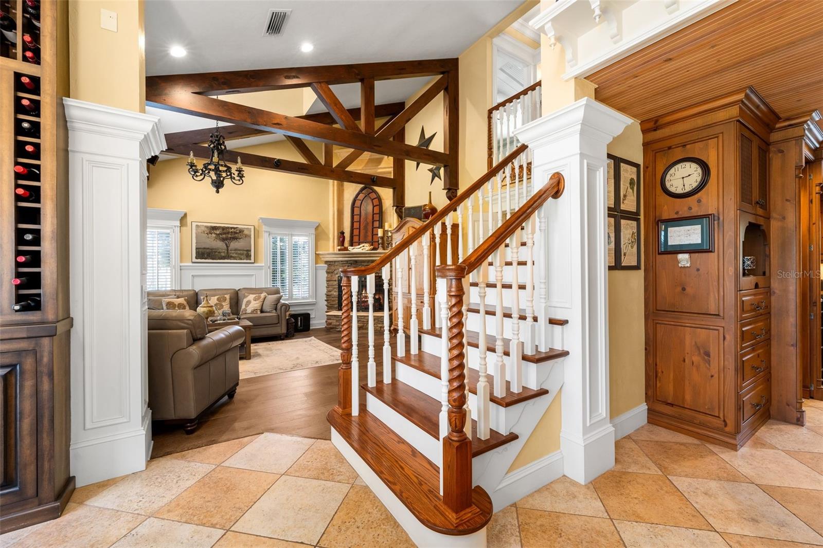 Enjoy true riverfront living on the Suwannee River in North Central Florida. This beautifully crafted two story riverfront home showcases solid construction and thoughtful design inside and out, offering an exceptional blend of comfort, function, and river lifestyle. Step inside to beautiful woodwork with custom built ins and cabinetry, along with vaulted ceilings that create an open and welcoming atmosphere. The craftsmanship throughout the home is truly impressive and best appreciated in person. Just off the entryway, a full size bar with sink and wine fridge sits beside the recreation room with pool table, creating an ideal space for entertaining. An elevator adds everyday convenience, making it easy to transport groceries, supplies, and more between levels. The fully equipped kitchen features stainless steel appliances with custom cabinetry and opens to a spacious living room with a gas burning fireplace. The primary suite is located on the second floor and includes a large walk in closet, master bath, a private office, and a balcony overlooking the river, perfect for enjoying peaceful mornings or evening sunsets. Additional bedrooms and bathrooms provide ample space for guests. Outdoor living is where this property truly shines. A large screened porch sits just off the dining area, while elevated Trex decking features an outdoor kitchen with grill and bar area with sink, plus a full outdoor bathroom with private shower, ideal after a day on the river. A paver walkway leads down to a firepit area, perfect for cool evenings. The private two story dock includes a boat lift, a screened room on the lower level, and a spacious upper sitting area with an outdoor dock shower. At night, the lighting along the home and dock creates a stunning view from the river’s edge. Two large storage rooms beneath the home provide additional space. Also included is a separate building featuring a home gym with sauna, along with an RV and boat storage area with a half bath. This building has its own septic system, water, and electric, including four 50 amp RV hookups, offering excellent flexibility for storage, hobbies, equipment, or room for extra guests. The property sits on a 2.2 acre lot that is fully fenced and secured with an electronic gate. Additional features include a paved circular driveway, irrigation system, and mature landscaping. Conveniently located just 400 feet off Highway 340, with easy access to Newberry, High Springs, and Alachua. A public boat ramp is approximately 300 feet away, and Rock Bluff Springs is just about 1,000 feet from the property. This exceptional Suwannee River retreat offers privacy, space, and the laid back river lifestyle North Florida is known for. A truly one of a kind property. ** Information is deemed reliable but not guaranteed; buyers should perform their own due diligence to confirm all property details.**