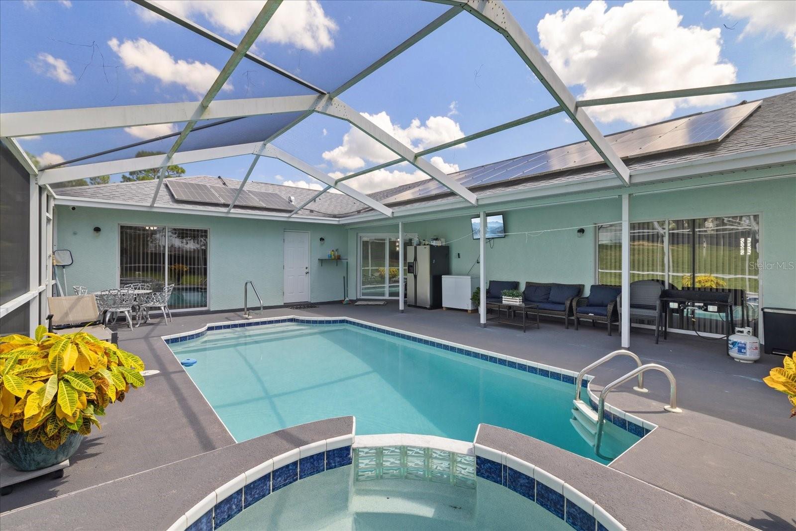 Welcome to this stunning property, originally built in 2004 and fully remodeled in 2021, offering modern elegance, comfort and energy efficiency with 2014 sqf of living space, this 3-bedroom, 2-bathroom home is designed to impress from the moment you walk in. Upon entry, you will be greeted by a spacious and bright living room that sets the tone for the entire home, To the left you will find the primary bedroom a true retreat with access to the pool, featuring a private bathroom complete with shower, jacuzzi and dual sinks offering both luxury and functionality. To the right entryway lies the modern kitchen, perfect for cooking and entertaining, seamlessly connected to an inviting dining area, as you move down the hallway, youll discover the second bathroom, ideal for guests or family and a full bathroom with direct acces to the pool, making it convenient for outdoor gatherings. At the end of the hallway, the third bedroom with access to the pool as well as a versatile space to meet your needs. This home comes packed with exceptional features, including a private pool for relaxation and entertaining, and solar panels, fully paid off at closing, insuring efficiency and lower utility costs. the porcelain tile flooring throughout adds a sleek, modern touch while recent upgrades such as the new roof (2021) and the metal fence installed (2023) provide enhanced privacy and peace of mind. This property offers the perfect combination of thoughtful design, high quality finishes and recent upgrades making it a dream home for anyone seeking style, comfort, and convenience, located just 5 minutes from Cortez Blvd, where youll find everything you need, from shopping to dining and essential services only 7 minutes away from the veterans expressway, offering quick and convienient access to tampa and surrounding areas. Dont miss this opportunity and schedule your visit today, this incredible house has everyhing you need to make it your dream home.
