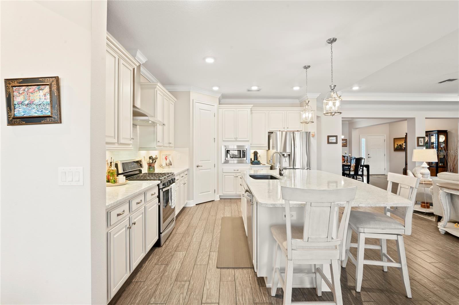 Love a great golf course, a home on a scenic pond and an immaculate community? Just reduced. This home is for you. Immaculate Lakefront Home in The Cascades at Southern Hills – 55+ Community Nearly new and move-in ready, this stunning 2-bedroom + office/3rd bedroom home offers high-end finishes, thoughtful upgrades, and beautiful sunset views over a serene lake. The chef’s kitchen features a gas range with wall-mounted hood, intricate tile backsplash, under-cabinet lighting, 42” cabinets, walk-in pantry, Cambria quartz countertops, large island with composite sink, and built-in microwave. Open-concept living with tray ceilings, crown molding, 6” baseboards, tile floors (carpet in bedrooms), ceiling fans throughout, and custom window treatments (Silhouette shades & faux wood blinds). Primary suite includes two walk-in closets and a spa-like bath with granite double vanity and walk-in shower. Guest bath also features granite finishes. French doors open to a flexible office/3rd bedroom. Enjoy outdoor living on the extended, covered, and screened lanai with retractable mechanical shades and pond views. Additional features: Three garage doors for cars/golf cart Attic storage with garage access Utility sink and cabinets in garage Water softener system & generator outlet Gas water heater & Sentricon pest control system Washer & dryer included Mature landscaping with front/back irrigation maintained by the HOA. HOA also includes cable, internet, heated pool, clubhouse access, and a full calendar of social activities. Optional membership to Southern Hills Country Club available. Fully pavered driveway. This pristine home offers comfort, elegance, and an active lifestyle—all in a beautifully maintained community.
