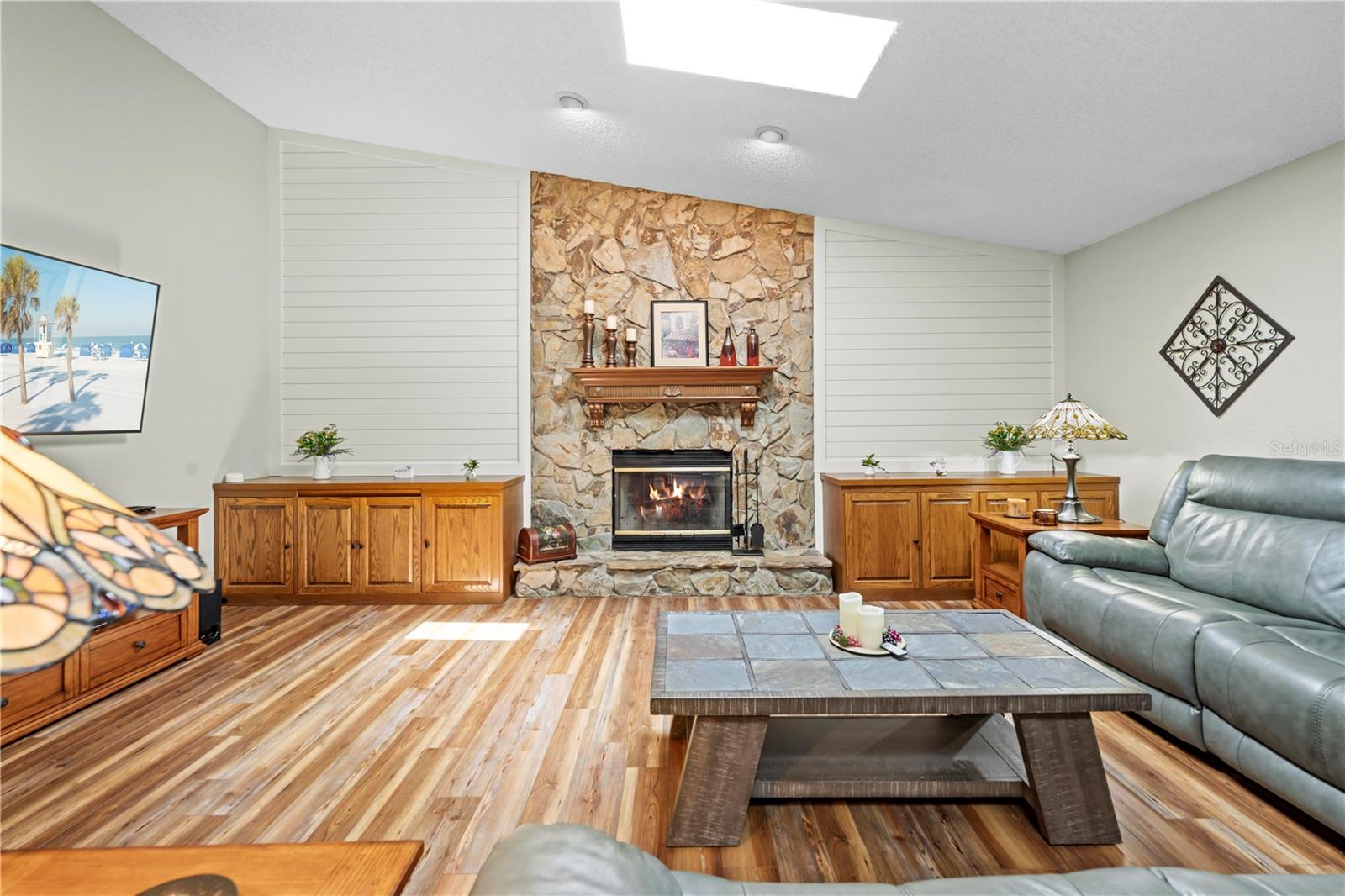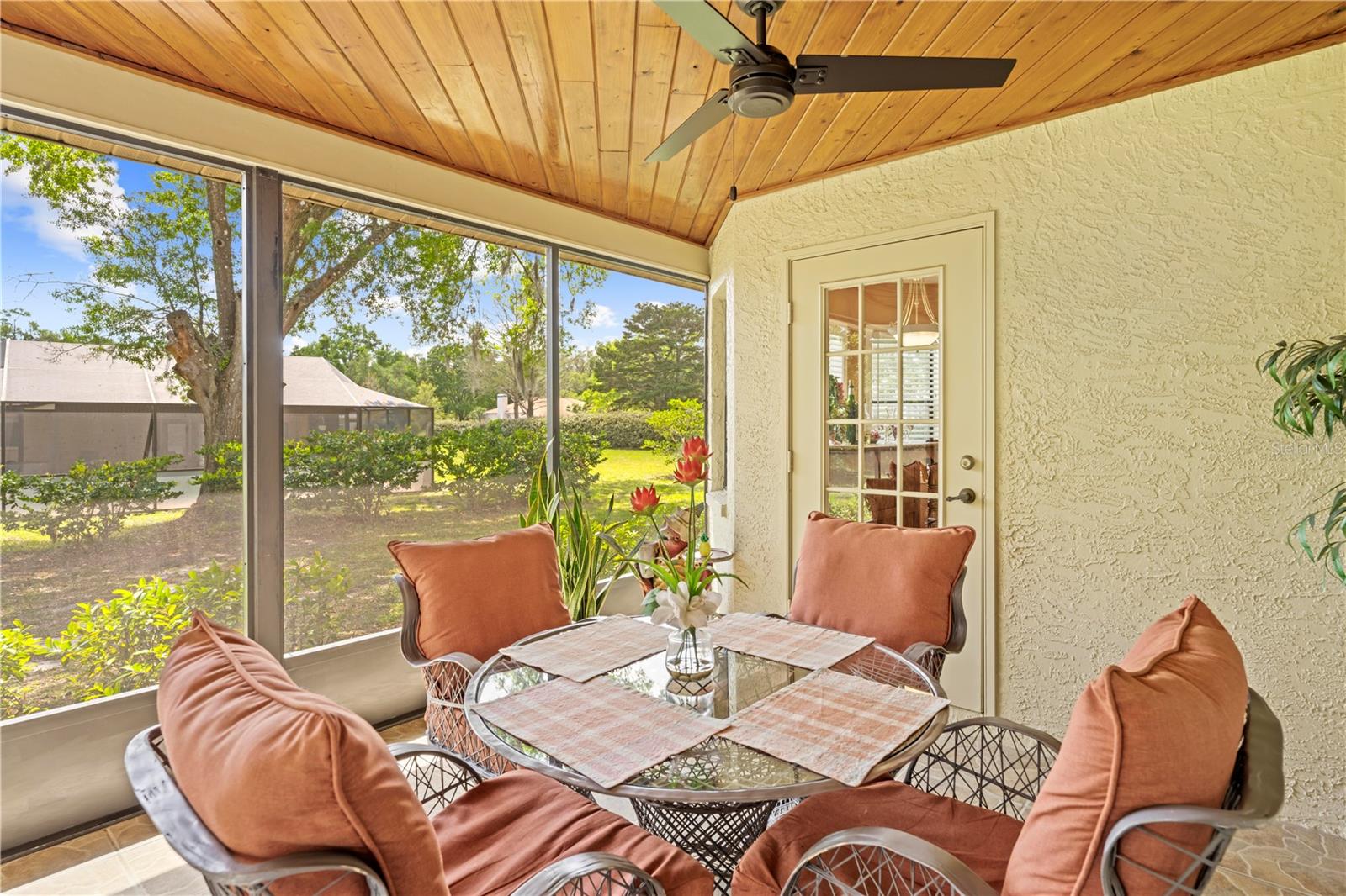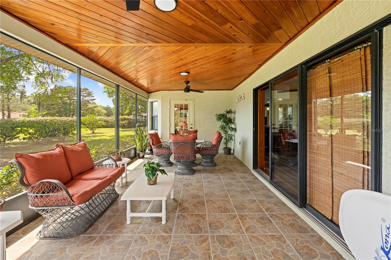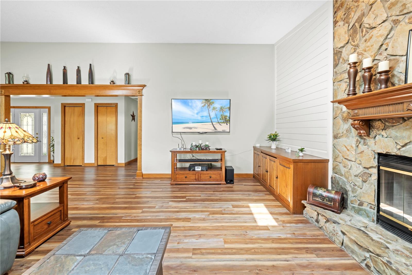 BACK ON MARKET TO NO FAULT OF THE SELLERS Welcome to 24076 Ragan Drive in the beautiful community of Dogwood Estates! This spacious 3-bedroom, 2-bathroom home offers 2,210 square feet of living space and sits on nearly half an acre (.46 acres). With a new roof (2023), new A/C system (2023) with a blue light filtration system, and a drainfield replaced just seven years ago, this home blends comfort, style, and peace of mind. Step through the front door into the foyer, and you’ll immediately notice the luxury vinyl plank flooring that extends throughout the entire home. The floor plan is thoughtfully designed with open-concept living, soaring vaulted ceilings, and plenty of natural light. The family room is the heart of the home, featuring charming shiplap detail around the built-in fireplace and a triple-panel pocket sliding glass door that opens to the screened-in patio. The patio boasts a gorgeous tongue-and-groove ceiling, two ceiling fans, and a perfect view of your private backyard retreat. Just beyond, an outdoor concrete patio is perfect for BBQs, a firepit, and more. The eat-in kitchen is ideal for entertaining and includes granite countertops, real wood cabinetry, a tile backsplash, new microwave, new disposal, ceramic tile flooring, and recessed lighting. A large breakfast bar and a door leading directly to the lanai make this kitchen both functional and inviting. Adjacent to the kitchen is a spacious dining area that easily accommodates large gatherings. The primary suite is privately situated at the rear of the home and offers dual closets and a beautifully updated en-suite bath complete with a walk-in tiled shower with glass doors, a single-sink vanity with an undermount sink, and ceramic tile flooring. Bedrooms 2 and 3 are located at the front of the home, just off the family room. Both are generously sized with ceiling fans and standard closets. The nearby guest bathroom features a tub/shower combo, granite-topped single-sink vanity, updated lighting, and an exhaust fan. The indoor laundry room is impressively large with tile flooring, a deep utility sink, and ample cabinet storage. Outside, concrete curbing adds a polished touch around the home, enhancing its curb appeal. The garage features a sliding screen door, offering ventilation while keeping the space enclosed. This home is move-in ready with thoughtful upgrades throughout—schedule your private showing today!