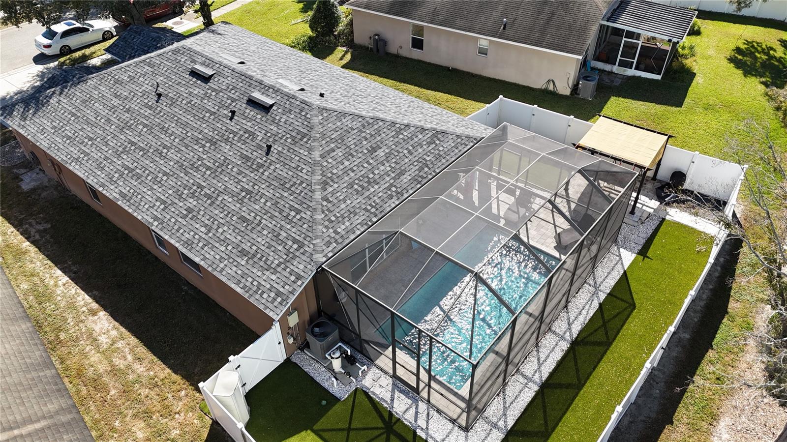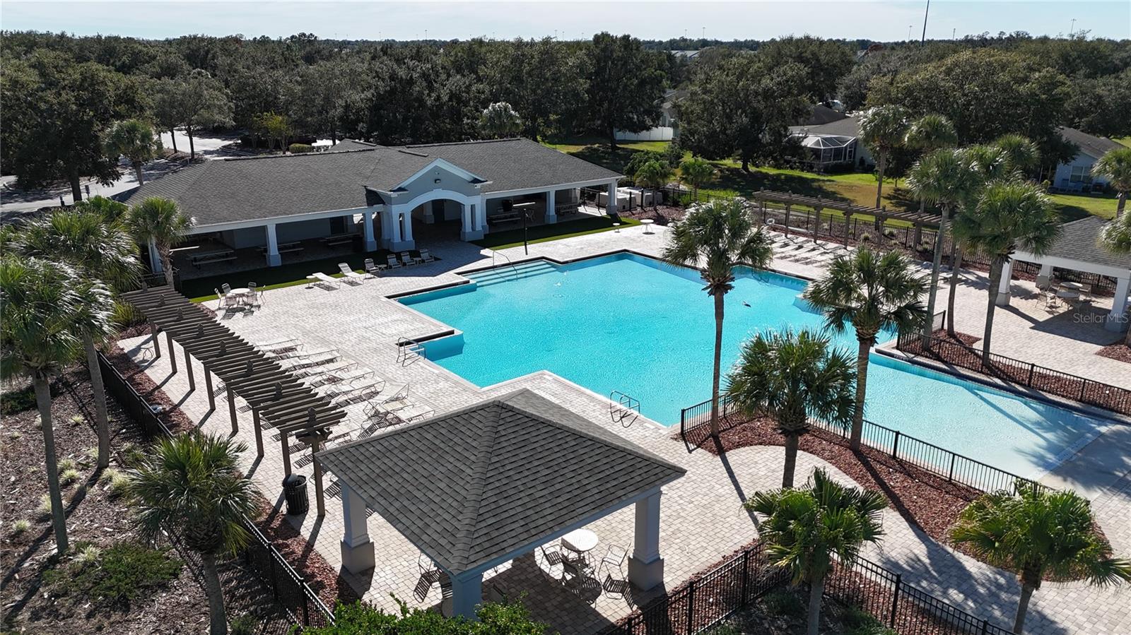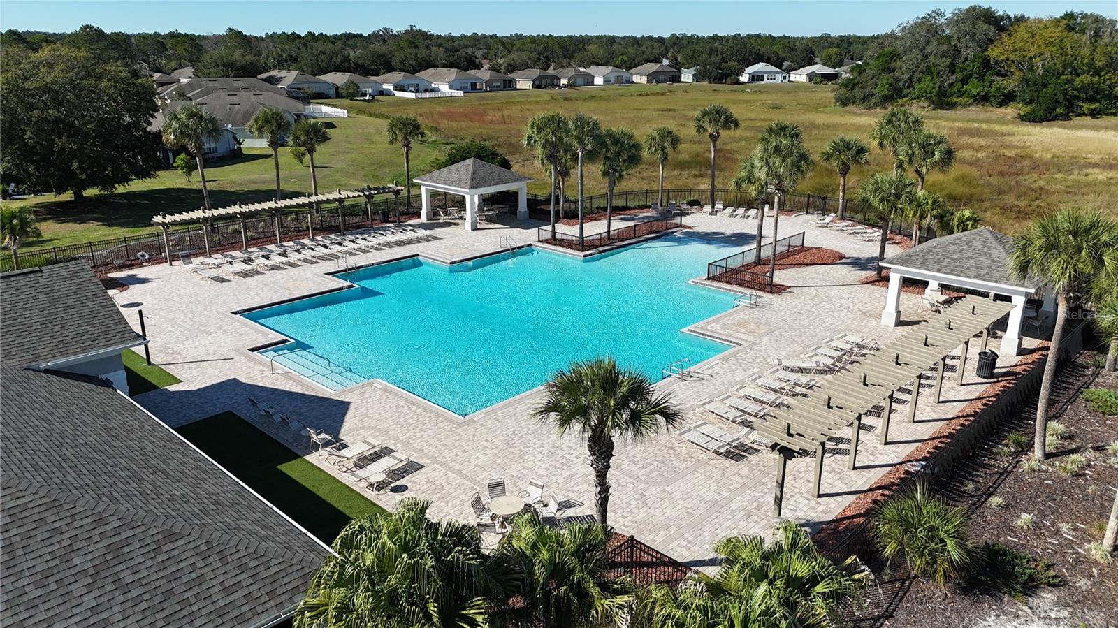 Must see this Pool Home with its own backyard oasis! 3-4 bedroom (flex room currently used as 4th bedroom), 2-Bath, 2 Car garage Located in the Highly Desirable Trillium Community, just one mile from the Suncoast Parkway and 30 minutes to Tampa Airport. This well-maintained 1,814 sq. ft. home features a brand-new roof (Jan. 2025), Newer A/C system (2 yrs old) and your own backyard Oasis with inground, screened enclosed pool (installed 3 years ago) with Saltwater pool filter, artificial turf backyard with firepit, and brick Pergola area. Backyard also has a covered Patio with lighting and fan with a fully fenced six ft Vinyl fence for privacy. The interior features a well-lit, welcoming environment with high ceilings and an open floor plan. This homeowner has taken pride of this home and has added many modern features to this home. First you will walk into spacious foyer area with a drop zone (mud room). The front, large flex room is currently being used as a 4th bedroom with Shiplap walls and Barn door. This room can also be used as a large den/office, mancave or guestroom. The kitchen, seamlessly connected to the family room, showcases a generous island with granite countertops and is equipped with contemporary stainless-steel appliances. The family room offers generous space and features a three-panel sliding glass door providing access to the covered lanai and a private outdoor area. The primary bedroom has three large windows and a walk-in closet. The en-suite includes a garden tub, dual-sink vanity, separate shower, and private water closet. All living areas and bedrooms feature laminate wood plank flooring, helping to prevent allergy issues. The Community amenities include a resort-style pool, with 2 cabanas with tables and chairs that can be used for birthday parties and other special events. Low monthly HOA with no CDD! This home has so many upgrades and unique features. Schedule your show today and see all it has to provide!