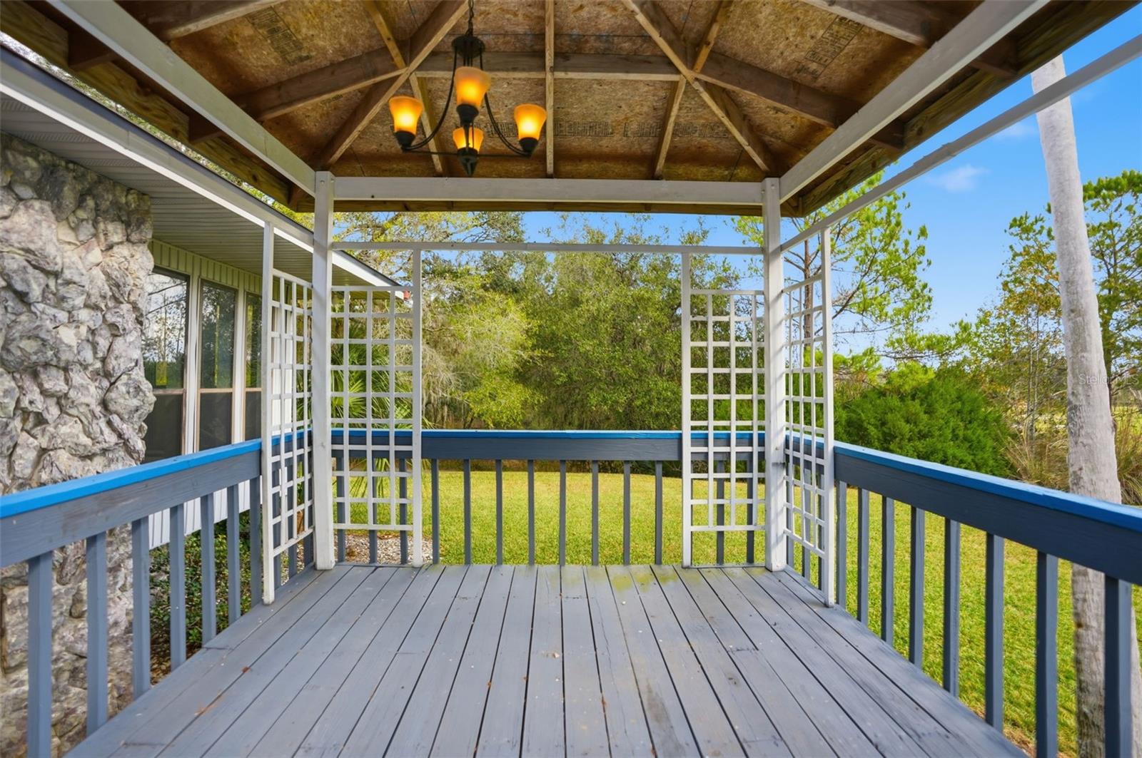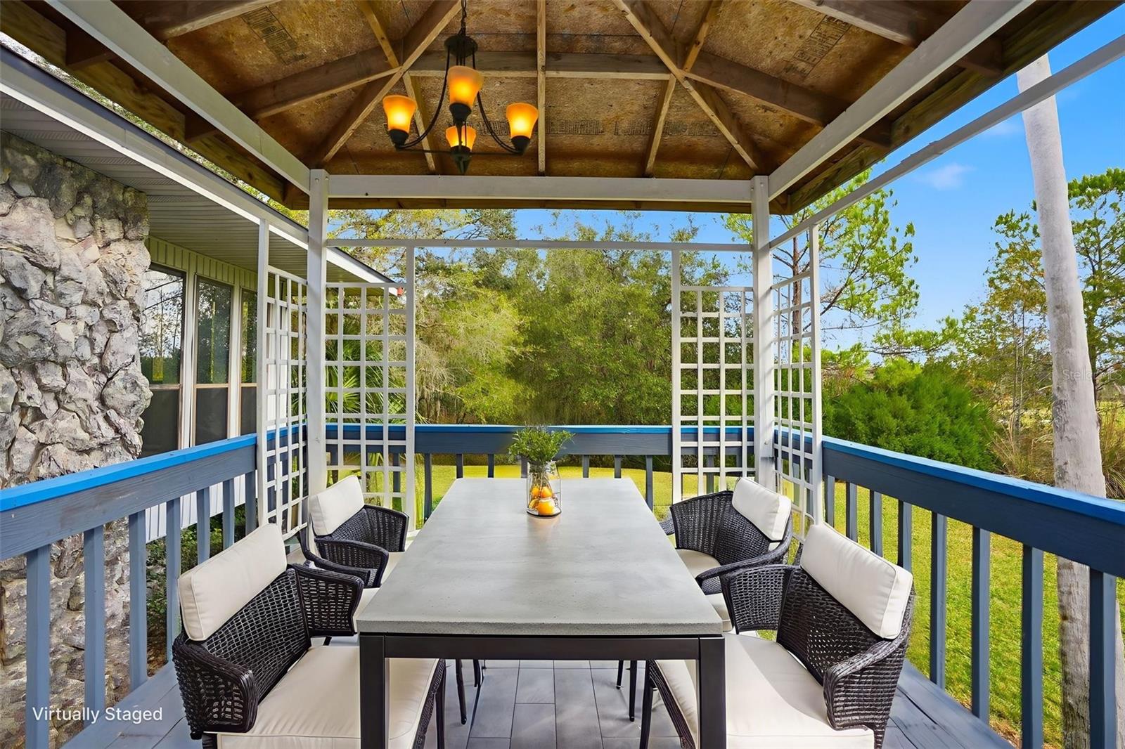 One or more photo(s) has been virtually staged. Beautiful Custom Home on Oversized Lot! NEW ROOF FOR BUYER BEFORE CLOSING! Nestled at the end of a quiet cul-de-sac and overlooking a serene golf course, this stunning custom home offers exceptional privacy and space with NO HOMEOWNER ASSOCIATION, NO CDD fees, and larger-than-average lots throughout the neighborhood. Step inside to a grand, oversized foyer with a convenient coat closet that opens into an impressive, light-filled living room. Expansive windows bathe the room in natural sunlight, while the cozy fireplace creates a warm focal point for gatherings. The fully remodeled, extra-large kitchen has new white shaker cabinets, quartz countertops, stainless steel appliances, built-in microwave, built-in oven plus an additional oven, cooktop/stove combination, dishwasher, refrigerator, double sink, and a second vegetable sink on the oversized island. Recessed lighting, glass-front accent cabinets, and a gorgeous glass tile backsplash complete this elegant space. A door from the living room leads to an expansive wood patio WITH gazebo, perfect for outdoor dining or relaxation. The backyard is fully surrounded by mature trees, creating the ultimate private retreat. The large master suite features an oversized walk-in closet and a spacious en-suite bathroom with abundant cabinetry, a luxurious spa-style garden tub, and a walk-in shower. The home’s split floor plan offers two additional generously sized bedrooms on the opposite side of the home. These bedrooms are separated by a hall bathroom with a shower/tub combo and a wide vanity topped with granite. A large laundry room with attic access sits conveniently along the same hallway. Outside, the OVERSIZED detached two-car garage offers ample storage with built-in cabinets, shelving, a sink, and its own AC. An additional LARGE carport beside the garage provides ideal RV or boat storage. The property is beautifully manicured with mature shrubs, trees, and a meticulously maintained yard. Freshly painted with a fully remodeled kitchen and well-maintained flooring throughout, this home is move-in ready and truly one-of-a-kind. Don’t miss the opportunity to own this peaceful, spacious property in a highly desirable setting!