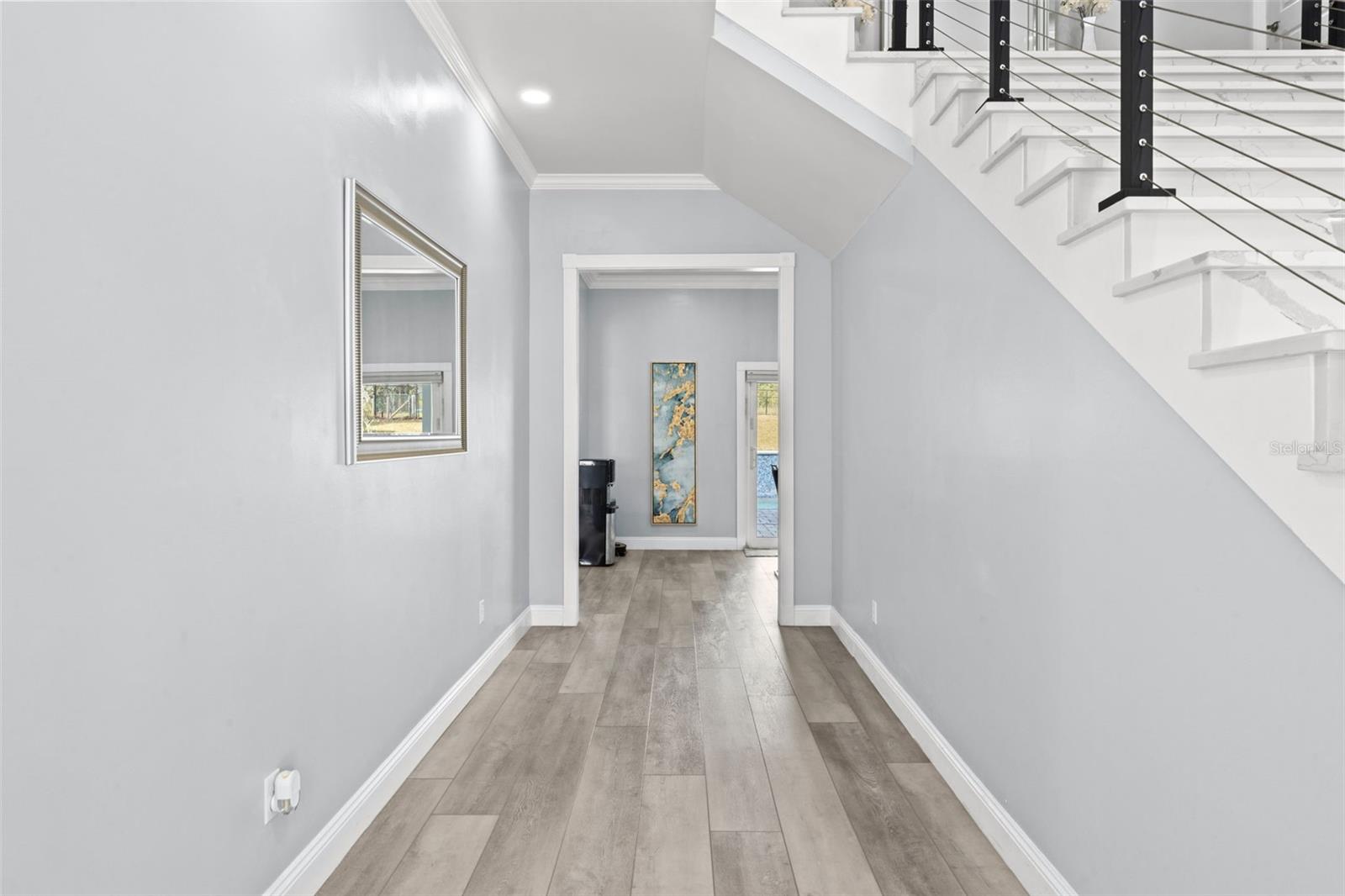 Experience unparalleled living in this Colonial-inspired estate, designed with the grandeur reminiscent of the iconic “White House.” Set on a private 2.40-acre property, this home offers four bedrooms, a dedicated office, three full bathrooms, and two half bathrooms across 4,240 square feet of living space, with a pristine two-car garage bringing the total to 6,334 square feet. The property features no HOA, no CDD, and AR2 Agricultural Residential zoning, offering the freedom to create, expand, or enjoy serene outdoor living. As an added bonus, the seller will contribute up to $15,000 toward vinyl privacy fence installation—enhancing both function and appeal. Upon entering, you are greeted by a majestic two-story foyer illuminated by a stunning chandelier and highlighted by a custom quartz staircase with modern cable railing. To the right, a formal sitting room invites relaxation, while an adjacent dining room, crowned by an elegant chandelier, is perfect for gatherings. The chef’s kitchen is a culinary masterpiece, equipped with high-end Dacor double ovens, a 48-inch Dual-Fuel Steam Range with an embedded griddle and six-burner gas cooktop, a double-column refrigerator, a built-in double freezer in the kitchen island, Dacor dishwasher, and a Miele espresso maker. The spacious quartz-topped island functions as a workspace and dining area. This kitchen also includes a built-in ice maker, a walk-in pantry, and a butler’s pantry. The eat-in nook framed by a bay window offers views of the pool, complemented by an additional formal dining area for larger gatherings. The great room is designed for relaxation and entertainment, featuring a six-speaker surround sound system for an immersive audio experience. Luxury vinyl flooring and custom quartz staircases add elegance throughout, while three wood-burning fireplaces provide warmth and charm. Upstairs, the home boasts four spacious bedrooms, including two guest rooms with en-suite bathrooms and custom closets. The master suite is a luxurious retreat with a walk-in closet featuring a central island, custom wardrobes, and a secure armory room. The spa-like master bath includes dual vanities, a rainfall shower, and a garden tub. The private balcony offers serene views of the pool and has been upgraded with new tile, railing, and an awning. Security is a top priority with a fully enclosed property featuring a motorized main gate and a separate service gate. The state-of-the-art ADT security system includes door, window, and glass-break sensors supported by a full camera system, and a room equipped with monitors for surveillance provides additional peace of mind. Modern conveniences include two new five-ton Trane AC units, an oversized laundry room, recessed lighting throughout, and a two-car garage with epoxy flooring and a craftsman workbench. Additional features include a 30-amp plug for EV charging, a powerful Generac generator fueled by a 350-gallon propane tank, a tankless water heater, and premium water quality with a softener and newly installed well pump and tank (2024). The outdoor space is perfect for relaxation and entertaining, featuring a heated Pentair pool with a waterfall, modern pavers, a charming gazebo for evening gatherings, and a greenhouse for year-round gardening. Refinished pavers, sidewalks, and gutters complete this outdoor paradise. Schedule your private viewing today and experience the timeless charm and modern indulgence of this exceptional Hernando County estate.