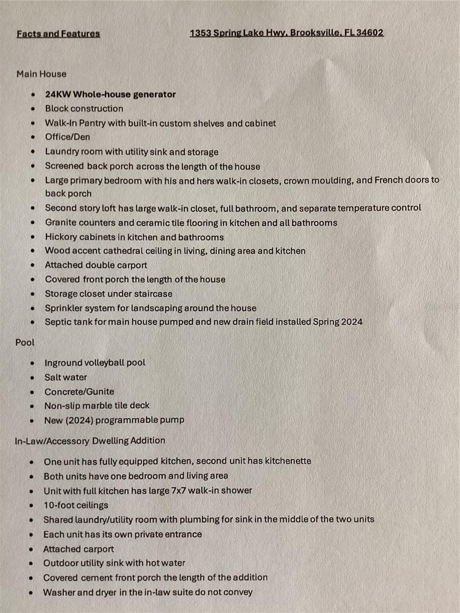 Come home to the rolling hills of the coveted Spring Lake area in Brooksville. Dreamt of homesteading or farming? Want to feel like you're in the Appalachian foothills without leaving home? Just want some space? Sixteen-plus acre farm property with spacious home, new in-law/guest addition, salt water pool, stocked pond, spring fed creek, and outbuildings now available. Property has a mix of pasture and woods. Main residence provides three bedrooms and three full bathrooms. Real wood floors and accent ceiling create a warm atmosphere. The beautiful gourmet kitchen is truly the heart of the open concept home. Granite counters, built-in dual ovens, large island with cooktop, and breakfast counter draw family and friends to gather. The large walk-in pantry with custom shelves and laundry room are conveniently located on the other side of the dining area. Upstairs loft bedroom with walk-in closet/finished bonus space and full bathroom provide space and privacy. Downstairs is the primary bedroom with his and hers walk-in closets. En suite bath has dual vanities and walk-in shower. Second bedroom with adjoining guest bath is also downstairs. The new in-law addition has two separate one-bedroom units, each with its own private entrance, and a shared indoor utility/laundry space in between. Property is being used as a working farm with cattle, sheep, and chickens, and has all the apparatus-such as fencing, water, pasture, and shelter. Too much to list here! Please see attached list of details and features included with the photos. NEW ROOF BEING INSTALLED APRIL 2025! Ideal location with close proximity to I75, US Hwy 41 (Broad St.), State Roads 50 and 52, for easy commuting in any direction. Or enjoy a staycation sitting in the woods by the fresh water creek!