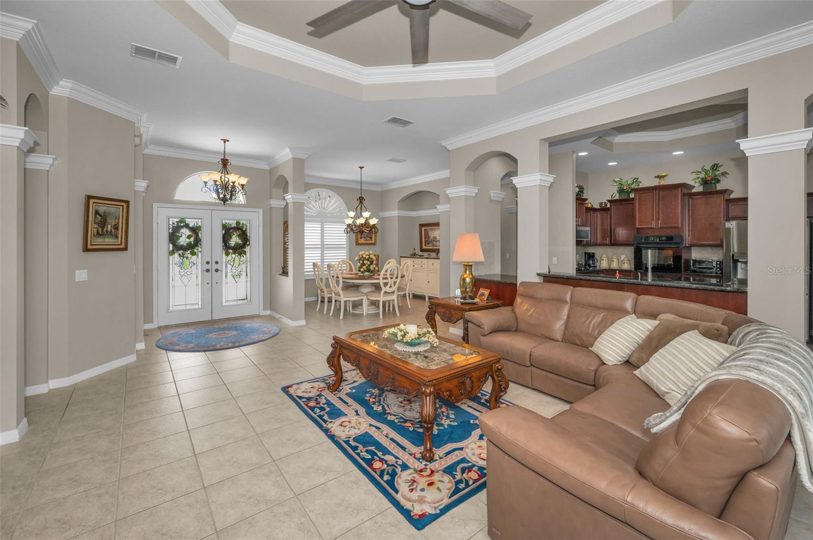 Welcome to this stunning golf course view home located in the prestigious gated community of Hernando Oaks. This beautifully maintained and move-in-ready residence offers over 2,100 square feet of living space, featuring 3 spacious bedrooms, 3 full bathrooms, and a 3-car garage. The home boasts a large great room with a cozy fireplace, a chef’s kitchen equipped with granite countertops, a center island, gas range, newer appliances, and a brand-new sink and faucet. The primary suite includes a walk-in closet and a luxurious en-suite bathroom with double vanities, a garden tub, and a walk-in shower. Two additional oversized bedrooms provide ample space for family or guests. Recent updates and upgrades include a newer roof and HVAC system, new leaded glass double front doors, fresh interior and exterior paint, crown molding, plantation shutters, new light fixtures and ceiling fans throughout, upgraded tile flooring, and brand-new carpeting. Architectural details such as elegant arches and abundant natural light enhance the home’s charm. Step outside to a spacious covered back porch and take in the peaceful golf course views, perfect for relaxing or entertaining. The Hernando Oaks community offers a professionally designed 18-hole Scott Pate golf course, pro shop, restaurant, pickleball courts, and a calendar of monthly activities. Ideally located near shopping, dining, medical facilities, top-rated schools, and with easy access to the Suncoast Parkway, this home offers both luxury and convenience. Don’t miss the opportunity to make this exceptional property your own.