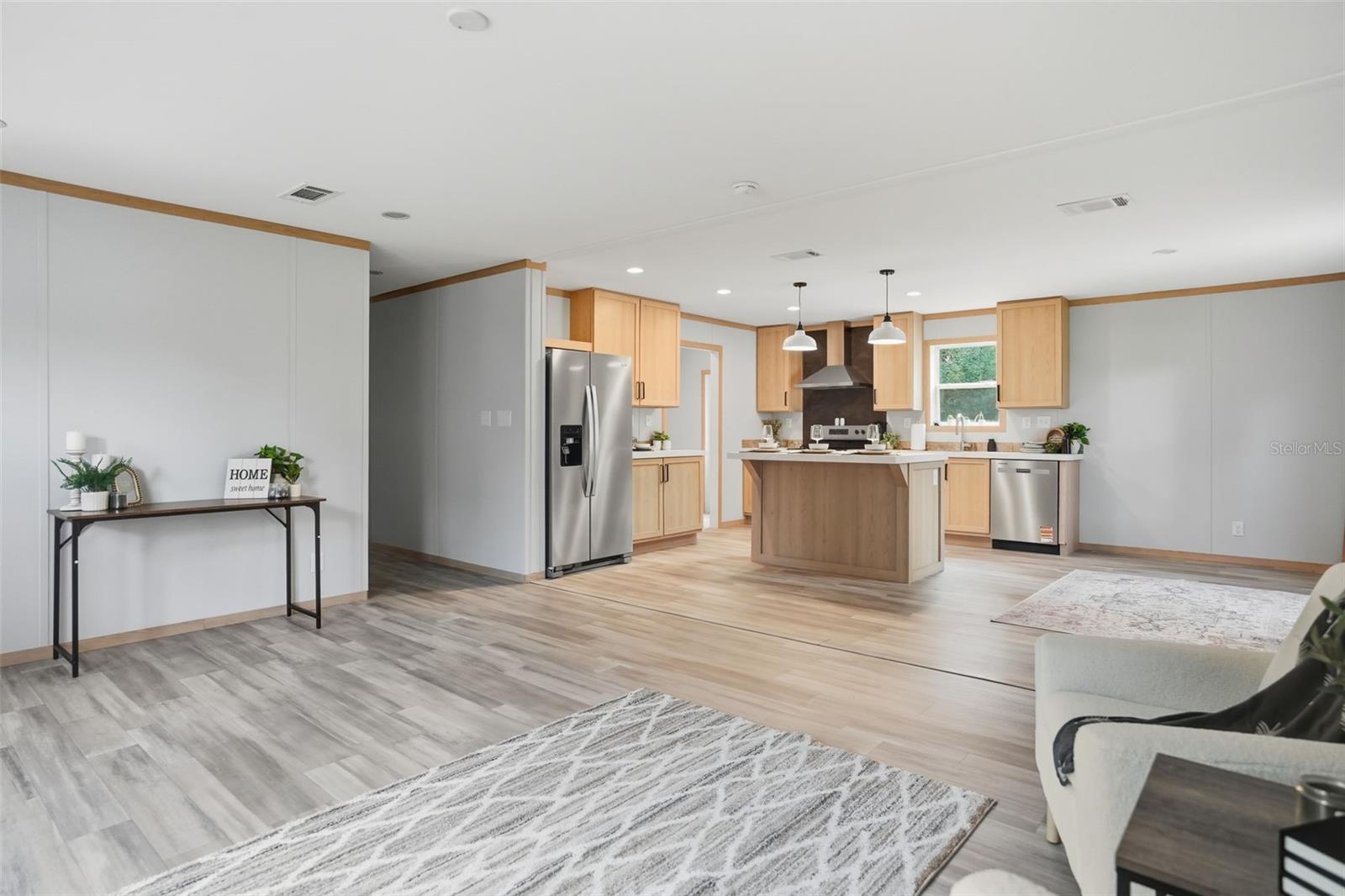MOVE-IN READY!! BRAND NEW PALM HARBOR HOME!! 3 Bedrooms + 2 Bathrooms + STUNNING PRIMARY SUITE with Freestanding Soaker Tub, over 1/4 acre CORNER lot + on a paved road with Beautiful Mature Oak Trees and NO HOA and NO LOT RENT!! You own the land!! Everything is NEW!! This stunning brand-new, well-built, double-wide Palm Harbor manufactured home has a full finished drywall interior, 2 x 6 (not 2 x 4) exterior framing with triple studs at all exterior openings, 2 x 8 floor joists; feel the difference when you walk inside! Even the skirting on the home meets the highest standards of quality constructed of solid cement board. The home sits on .29 of an acre of beautifully landscaped land in peaceful Brooksville — and best of all, NO HOA...so bring your boat, camper, ATV, pets, bring it all! Boasting 1,440 sq ft of thoughtfully designed living space in the new warm earth tones, this home offers a large open floorplan with the kitchen open to the dining room and great room making this home feel incredibly spacious, light, bright, and cheery. Great for entertaining family and friends!! The home is loaded with upgrades, including luxury vinyl plank flooring throughout (no carpet), making it as stylish as it is low-maintenance. Even the skirting on the home is the Step into the designer kitchen, where no detail has been overlooked. You’ll love the expansive center island with breakfast bar, perfect for extra seating!! The kitchen features all-new stainless steel appliances, with an extra upgraded range hood with designer backsplash (the focal point of the kitchen), real wood shaker cabinets, gorgeous modern countertops, and designer lighting, sink, and faucets. Lots of beautiful countertop space and lots of cabinets for plenty of storage! The primary suite is a true retreat, featuring a spacious bedroom and a luxury en-suite bathroom you rarely see --- with a STUNNING modern standalone soaking tub, separate walk-in shower, dual designer sinks, and beautiful accent windows over the soaking tub that give the space an upscale, spa-like feel. This master bathroom is super spacious and truly an impressive upgrade for the home!! You'll want to show this off to your guests!! The second bathroom has a tub and shower combo with matching finishes giving that continuous feel throughout the home!! The 2nd and 3rd bedrooms are both a good size!! Everything in this home is BRAND NEW: new well, new septic with 2-year maintenance warranty, new HVAC, all new appliances, new water heater, and the home is covered by a 1-year manufacturer's warranty! Enjoy the peacefulness of the surrounding area, adorned with the iconic large live oak trees that Brooksville is known for. And when it’s time to run errands or commute, you're just minutes from groceries, shopping, restaurants, and the Suncoast Parkway for easy access to Tampa and beyond. 30 minutes to sunsets at Pine Island, Buccaneer Bay Water Park, kayaking and paddle-boarding the crystal clear Weeki Wachee River, swimming with the manatees, boating and fishing in the Gulf of America! 40 minutes to Tampa for work and play!! Don't miss this rare opportunity to own a move-in ready home on land with all the benefits of new construction — and none of the restrictions! Schedule your private showing today and start living the Florida lifestyle you’ve been dreaming of! Home can be financed with Conventional, FHA, VA, and even USDA with 100% financing!!