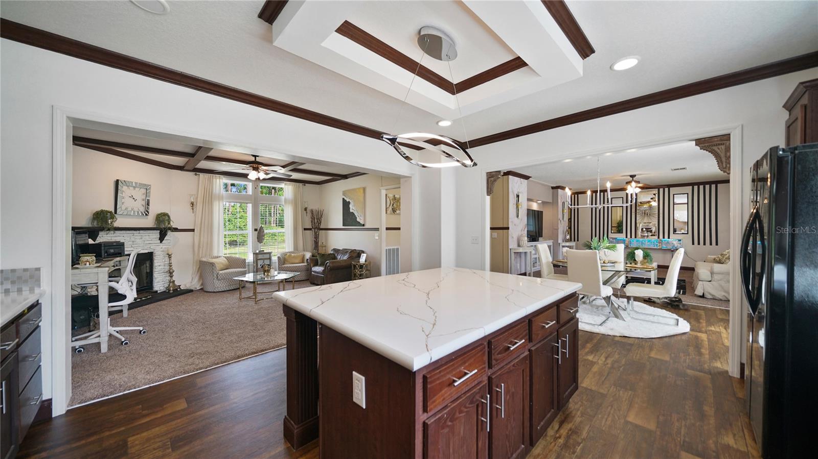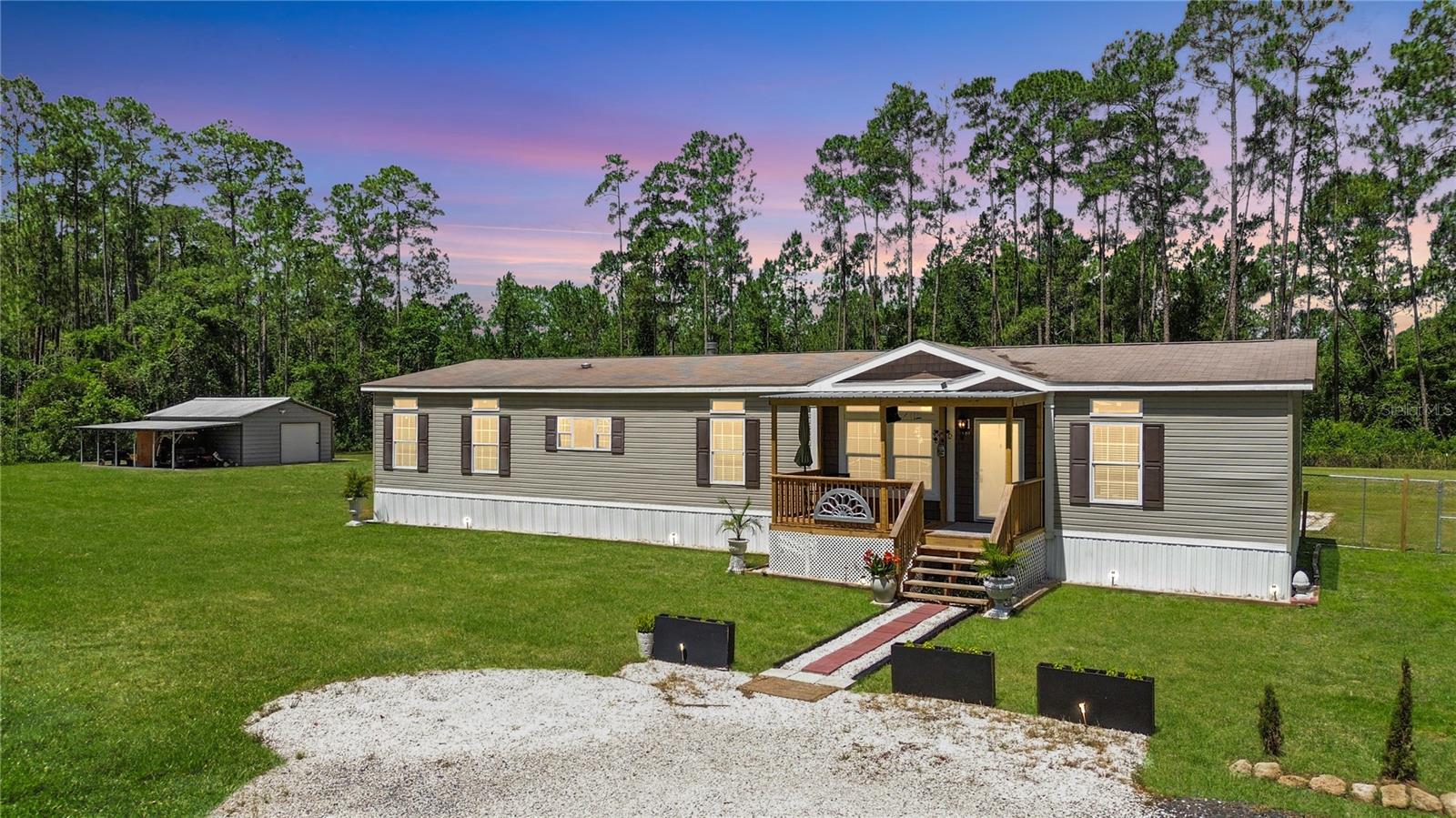 THIS is Modern Farmhouse living at its best! Just 2 miles to shopping, gas, and produce. This 2,327 sq ft 4/2 former model sits on 2.27 high & dry acres in Daytona North. Private, mostly cleared, and well protected by a 6' privacy fence. The front yard seems endless. Unwind in a backyard designed to elevate your evenings. Two decks give you plenty of covered and screened outdoor area. Look to the corner of the property for a fairy garden and running creek. Head inside to find 9-foot ceilings and crown molding, the rustic features of the living area and kitchen are all accented by the wood-burning fireplace. Large primary with private water closet, French doors, and an oversized laundry with wash basin. New A/C, septic, water filtration in 2023. Hurricane windows. Garage w/ 25x18 add-on, 8x12 air-conditioned shed, and generator hookup. Comes with two generators (one whole-home), zero-turn mower, 5×8 trailer, and golf cart—everything you need for country life. Furnishings included! All information pertaining to the property is deemed reliable, but not guaranteed. Information to be verified by the Buyer. Be advised that cameras may exist recording audio and video inside/outside the property, such as ring doorbells. Photos are digitally enhanced and could be altered, please verify.