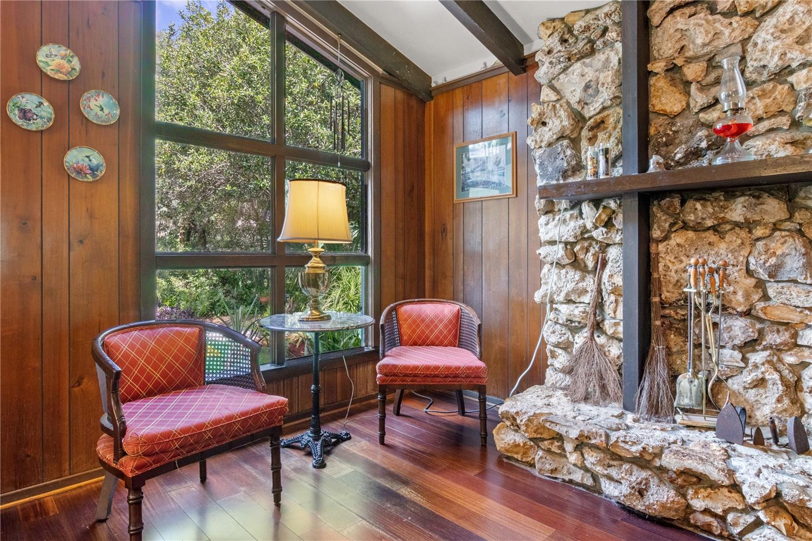This mid-century modern mixed with a little bit of rustic charm will have you doing a double take situated on 1.77 acres. Walk through the double doors to enter a living space that boasts high ceilings adorned with beautiful dark beams. Entering the living room, the center of attention is on the stone fireplace, situated on the North wall and is no small feature. With two options for a dining space on either side of the kitchen, you choose which you prefer or use both. Both have sliding glass door access to the large back patio that is screened in with ceiling fans and a built-in charcoal grill made of the same stone as the fireplace inside. Yes, you read that right, the same stone mason made a built-in grill outside to match the fireplace inside. The primary suite has not only a walk in closet and en-suite bathroom, but also a bon-a-fide dressing area separate of both and out of the actual bedroom. This is a great feature for those who get up really early or work a late shift and need to let someone else sleep. Down another hallway sits two bedrooms, and a bathroom with a hall closet for storage. This home offers a great in-law suite that has a separate entrance, private bathroom, and is plumbed for a kitchenette. Don't need an in-law suite? Maybe you want to work from home and need an office. Here you go! This home has a new metal roof, recently updated air conditioning system, and solar panels that leave the current owners paying less than $100.00 each month for electricity. WOW! The possibilities are endless here, with the ability to plant all the fruit trees, grow your own veggies, and have animals, this home gives you enough square footage to spread out inside as well as outside. You have to see it to appreciate it! While we know this home has many awesome features, we also know it will need some updating, so bring your imagination! Make an appointment today with your realtor! Please do not enter the property without an appointment.