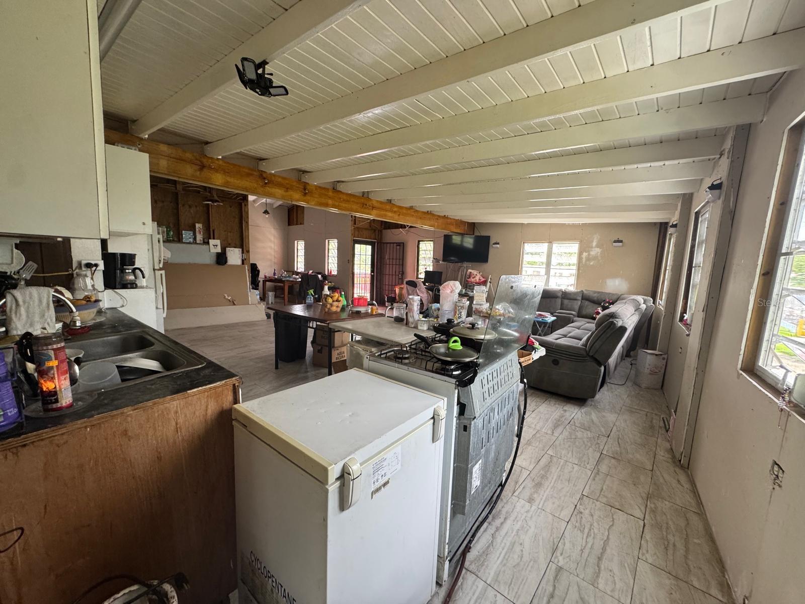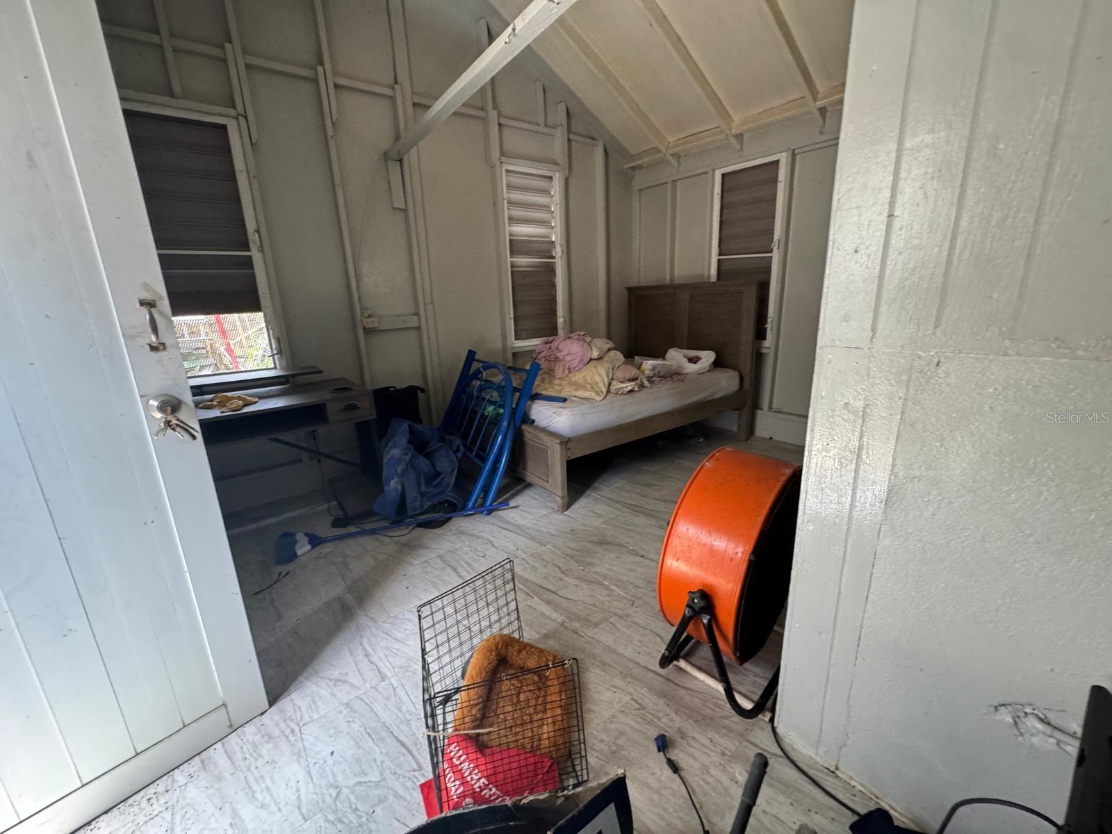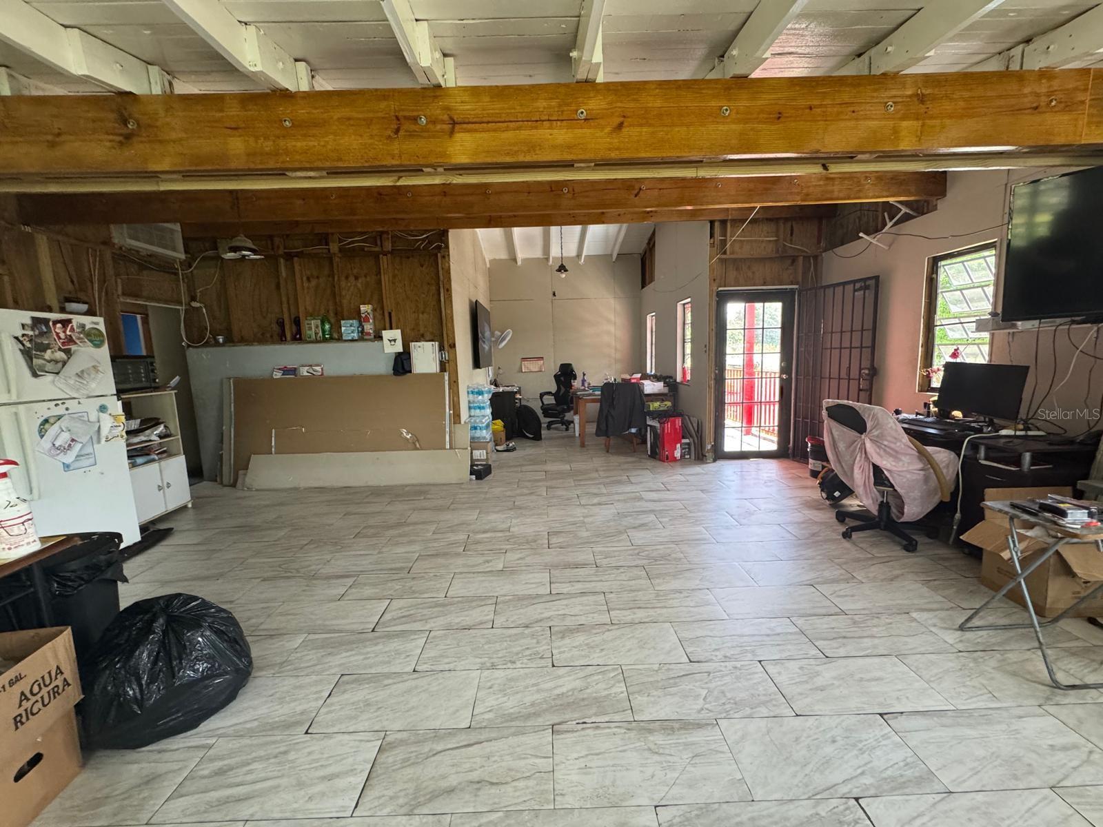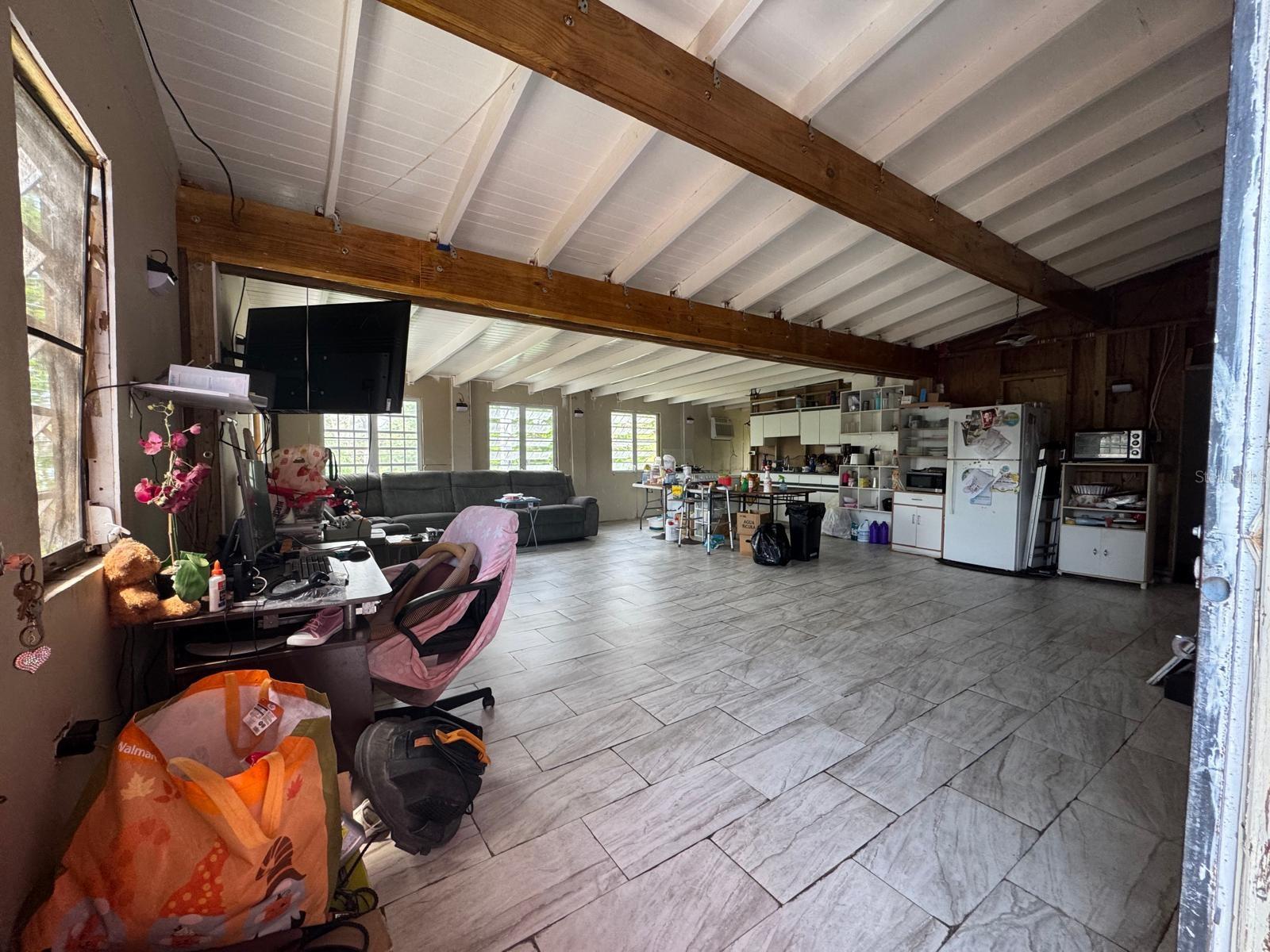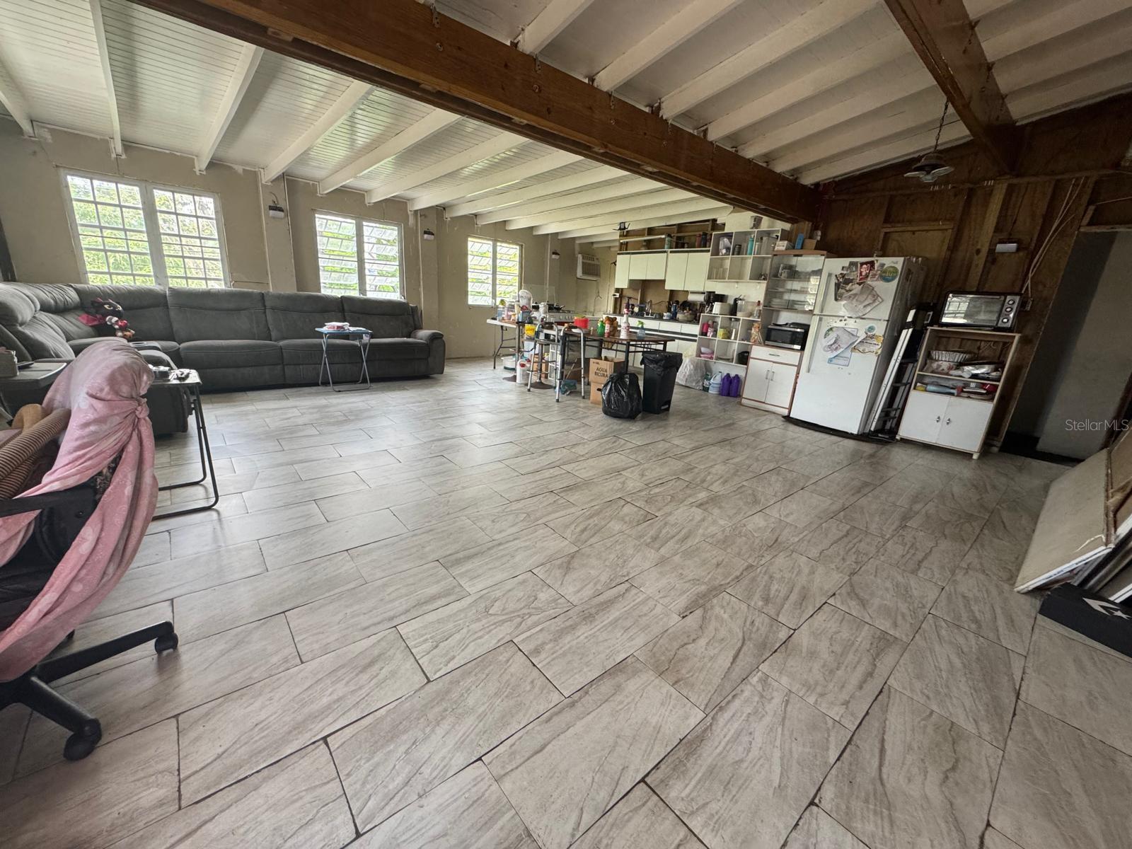 Two-story residence with 3 bedrooms, 1 bathroom, living room, dining room, and kitchen on the first floor; 4 bedrooms, living room, dining room, kitchen, and 2 bathrooms on the second floor. It also includes a studio with a bathroom in the backyard. Seven window air conditioning units and six ceiling fans are included. In addition to four covered parking spaces, there is room for 2 or 3 extra cars in the yard. Each floor has its own water and electric meter; the studio in the backyard receives water and electricity from the second floor.