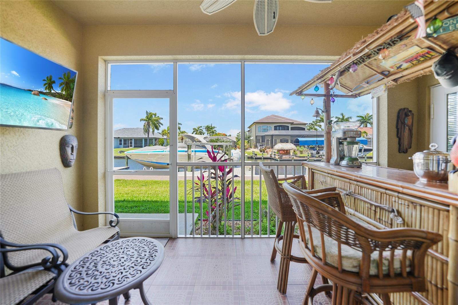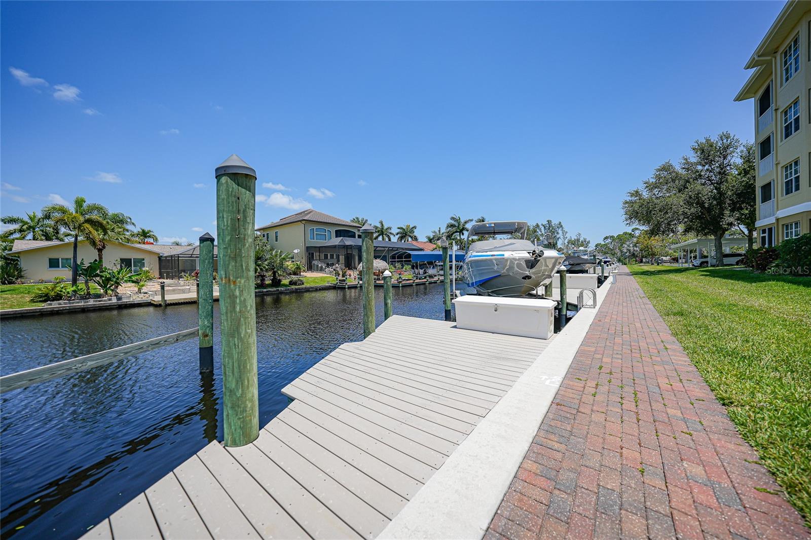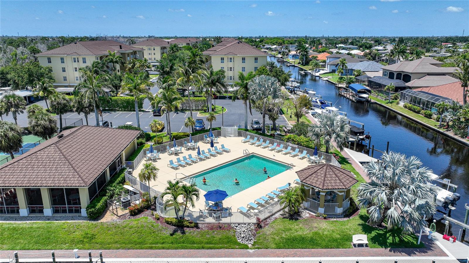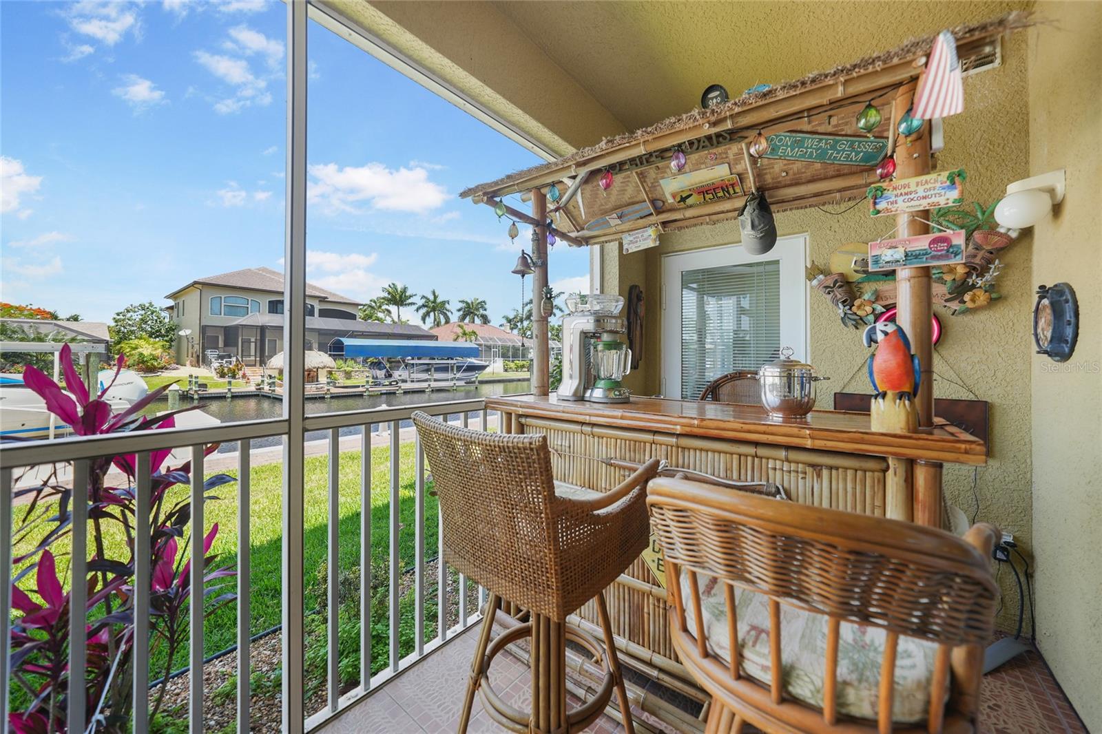 Calling all boaters! Location, location, location! 3 bed/2 bath luxury first floor furnished condo within a gated community in a pristine location next to the pool, clubhouse/tennis courts. This condo has quick access (7 minute) to the river with no bridges! This location boasts of saltwater sailboat access canal with an assigned 35' BOAT SLIP ($175 yr) and dock with storage box just steps from your lanai! To top it off a new A/C was installed in 2023 and newer water heater! This magnificent condo has a great-room floor plan with spacious eat-in kitchen with appealing granite throughout, pantry, and custom wine bar and newer stainless-steel appliances! The interior is complimented with tray ceilings and crown molding. The master bedroom leads out to the lanai and overlooks the canal and beautiful homes. The master bathroom has dual sinks and an oversized walk-in shower. The guest bathroom has a tub/shower. All windows and doors are hurricane impact. This is a pet-friendly community with barbecue grills for your enjoyment. Stroll around the complex and enjoy this beautifully maintained grounds with lush tropical landscaping. Relax by the heated pool/spa or the socialize at the screened in clubhouse. Enjoy a game of pickleball, shuffleboard or tennis. Close to restaurants, shopping and all the great amenities that Cape Coral has to offer.