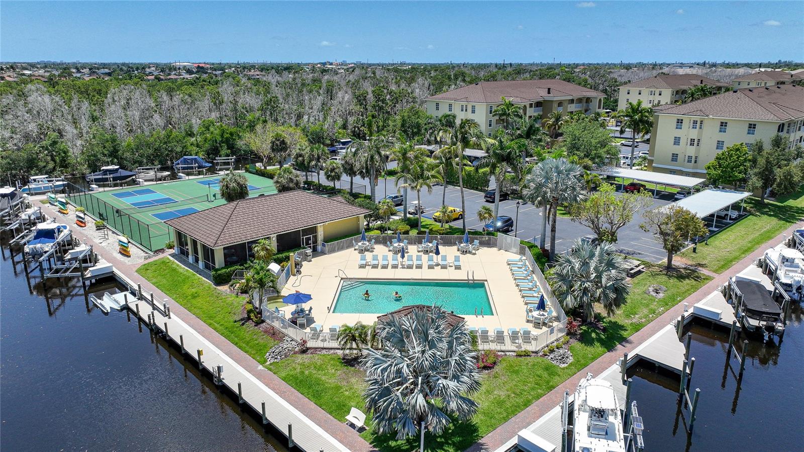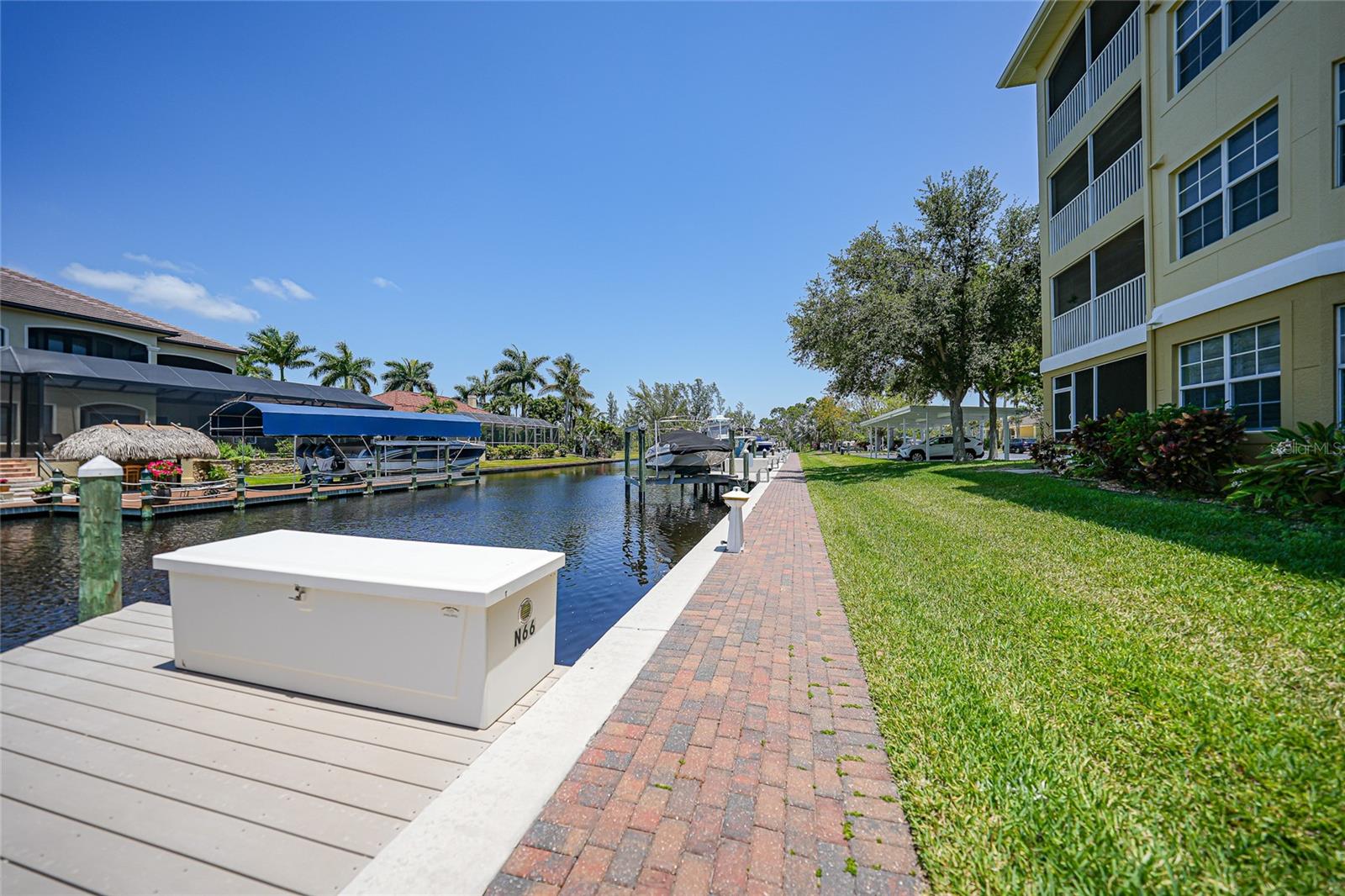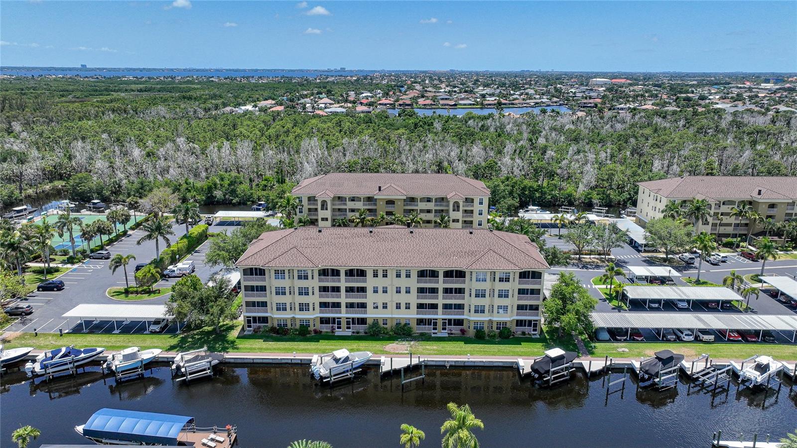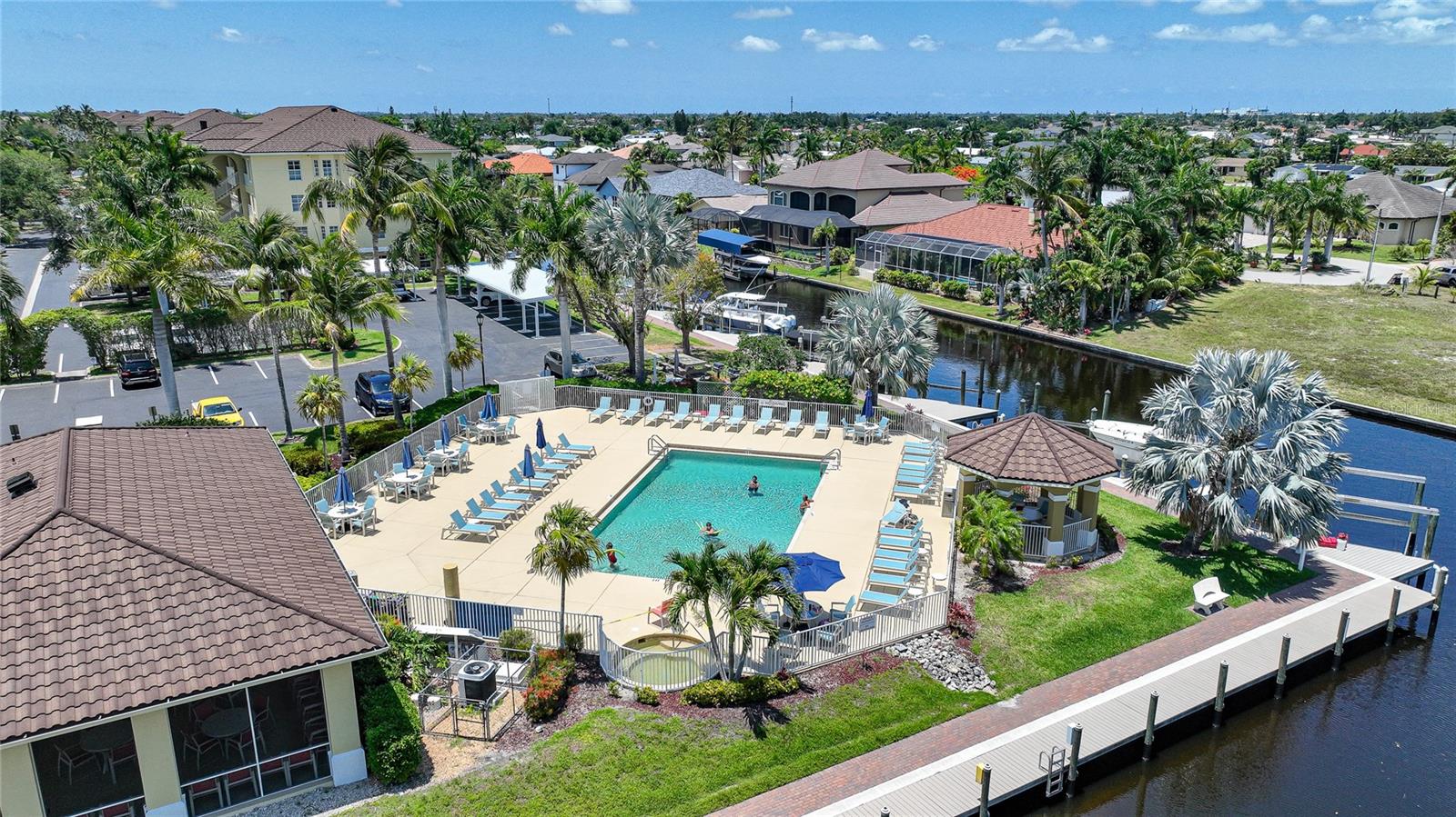 Calling all boaters! Location, location, location! 3 bed/2 bath luxury first floor furnished condo within a gated community in a pristine location next to the pool, clubhouse/tennis courts. This condo has quick access (7 minute) to the river with no bridges! This location boasts of saltwater sailboat access canal with an assigned 35' BOAT SLIP ($175 yr) and dock with storage box just steps from your lanai! To top it off a new A/C was installed in 2023 and newer water heater! This magnificent condo has a great-room floor plan with spacious eat-in kitchen with appealing granite throughout, pantry, and custom wine bar and newer stainless-steel appliances! The interior is complimented with tray ceilings and crown molding. The master bedroom leads out to the lanai and overlooks the canal and beautiful homes. The master bathroom has dual sinks and an oversized walk-in shower. The guest bathroom has a tub/shower. All windows and doors are hurricane impact. This is a pet-friendly community with barbecue grills for your enjoyment. Stroll around the complex and enjoy this beautifully maintained grounds with lush tropical landscaping. Relax by the heated pool/spa or the socialize at the screened in clubhouse. Enjoy a game of pickleball, shuffleboard or tennis. Close to restaurants, shopping and all the great amenities that Cape Coral has to offer.