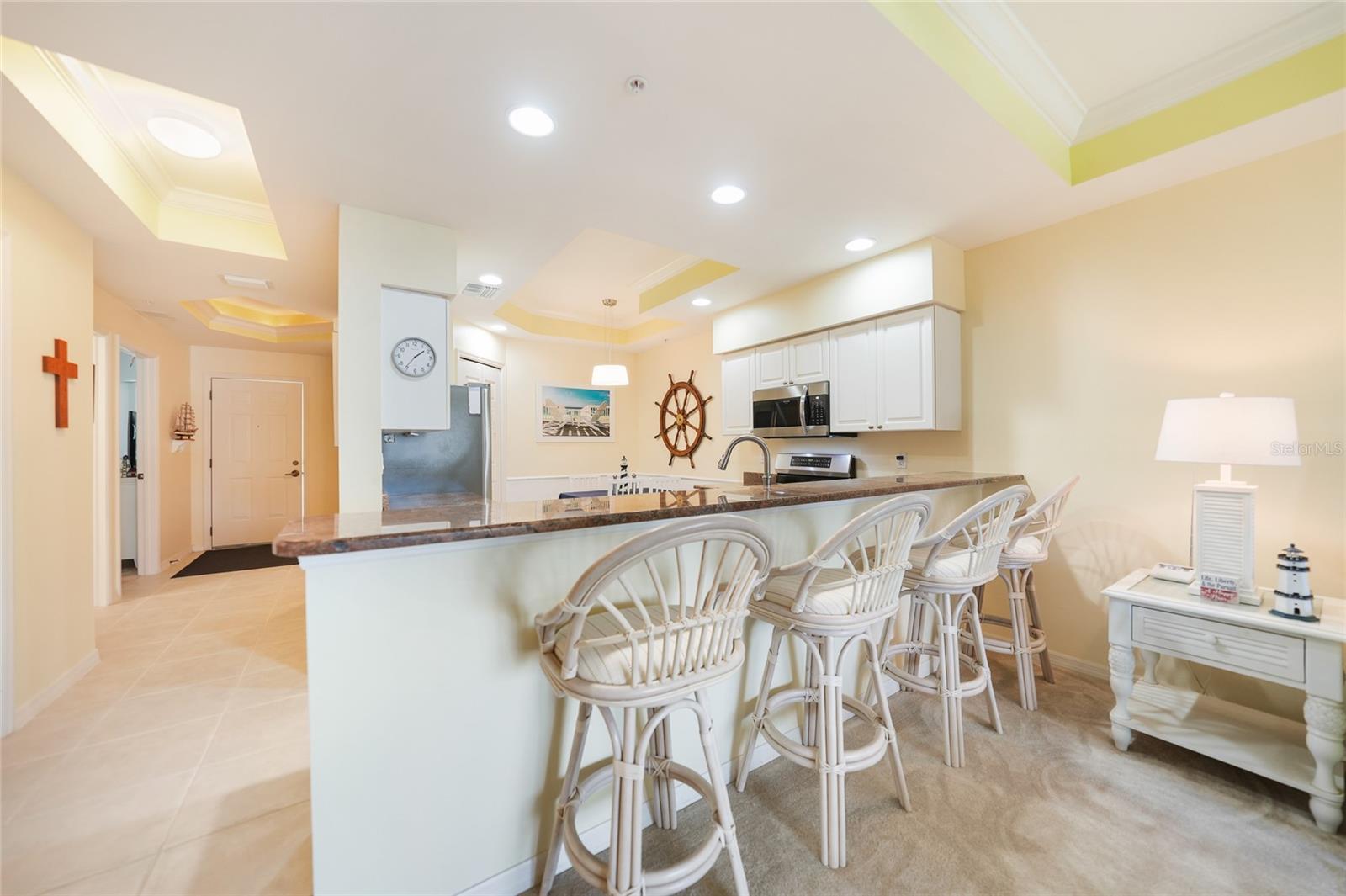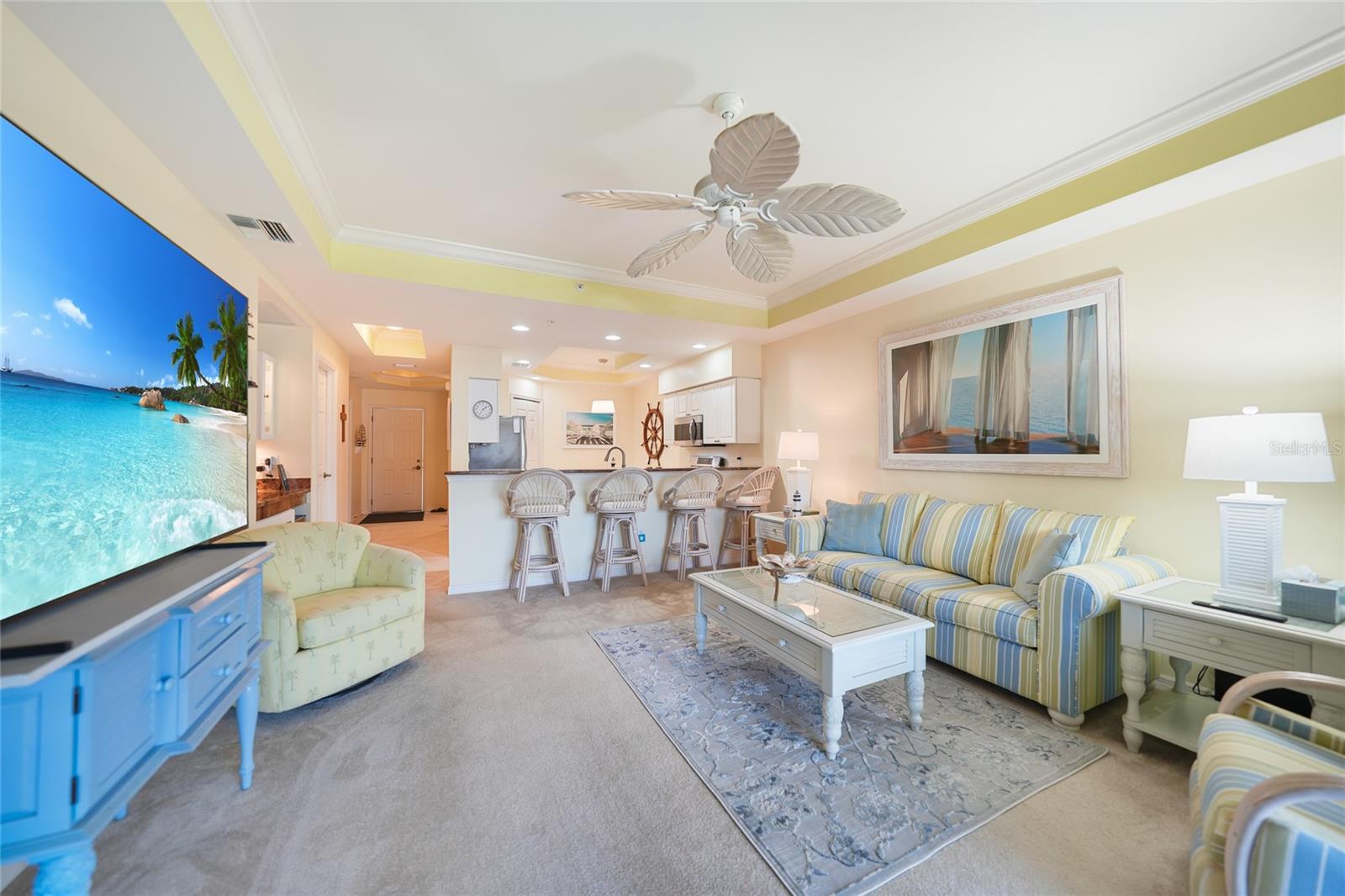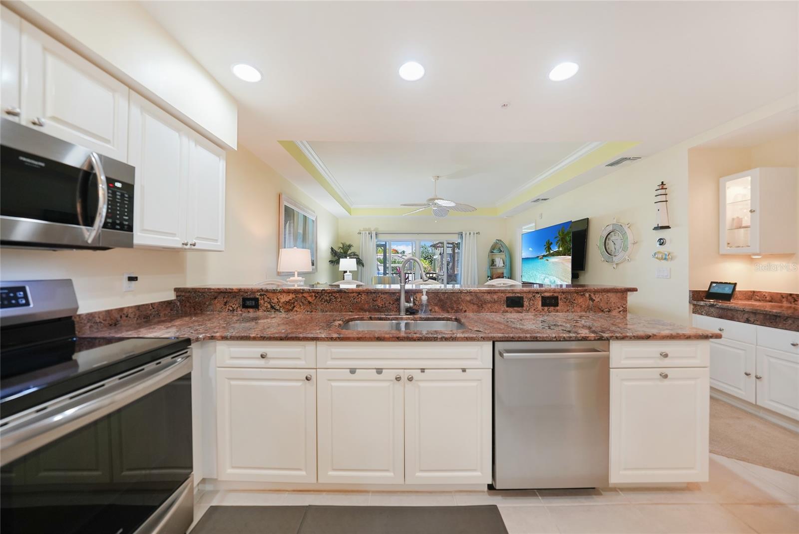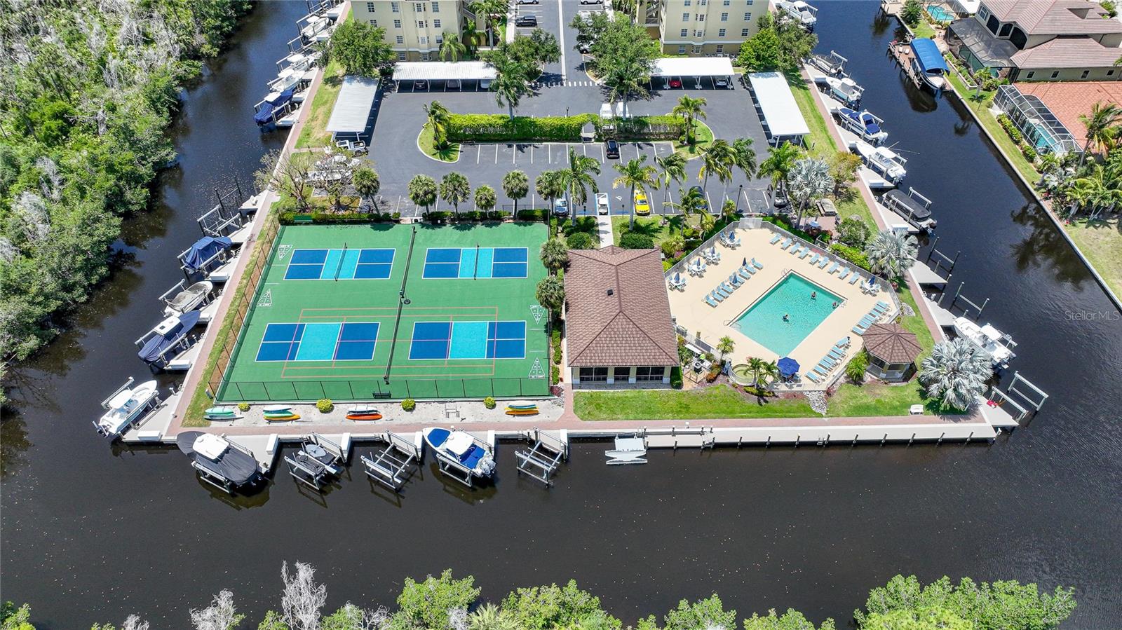 Calling all boaters! Location, location, location! 3 bed/2 bath luxury first floor furnished condo within a gated community in a pristine location next to the pool, clubhouse/tennis courts. This condo has quick access (7 minute) to the river with no bridges! This location boasts of saltwater sailboat access canal with an assigned 35' BOAT SLIP ($175 yr) and dock with storage box just steps from your lanai! To top it off a new A/C was installed in 2023 and newer water heater! This magnificent condo has a great-room floor plan with spacious eat-in kitchen with appealing granite throughout, pantry, and custom wine bar and newer stainless-steel appliances! The interior is complimented with tray ceilings and crown molding. The master bedroom leads out to the lanai and overlooks the canal and beautiful homes. The master bathroom has dual sinks and an oversized walk-in shower. The guest bathroom has a tub/shower. All windows and doors are hurricane impact. This is a pet-friendly community with barbecue grills for your enjoyment. Stroll around the complex and enjoy this beautifully maintained grounds with lush tropical landscaping. Relax by the heated pool/spa or the socialize at the screened in clubhouse. Enjoy a game of pickleball, shuffleboard or tennis. Close to restaurants, shopping and all the great amenities that Cape Coral has to offer.