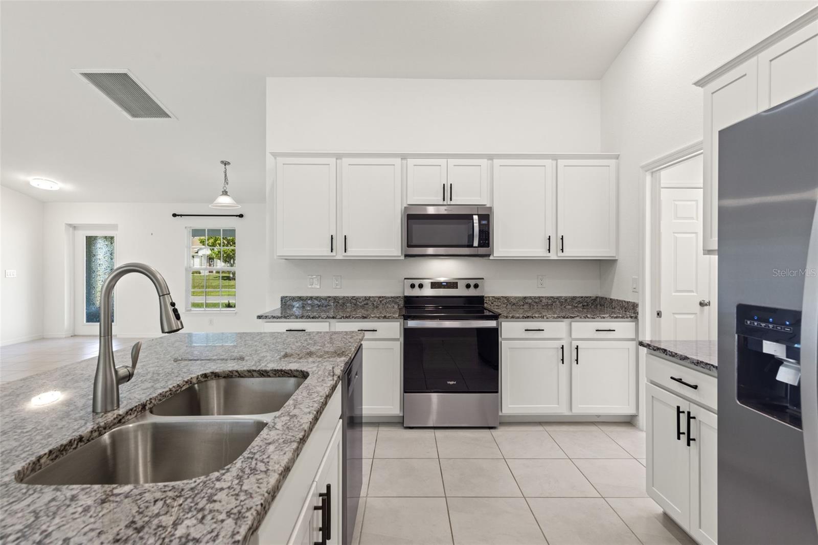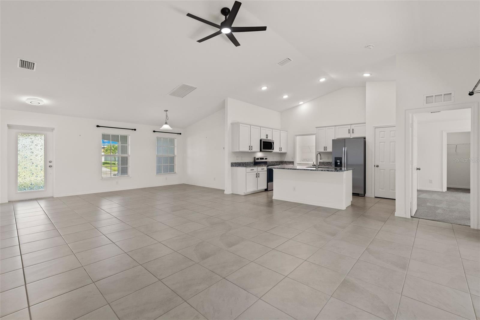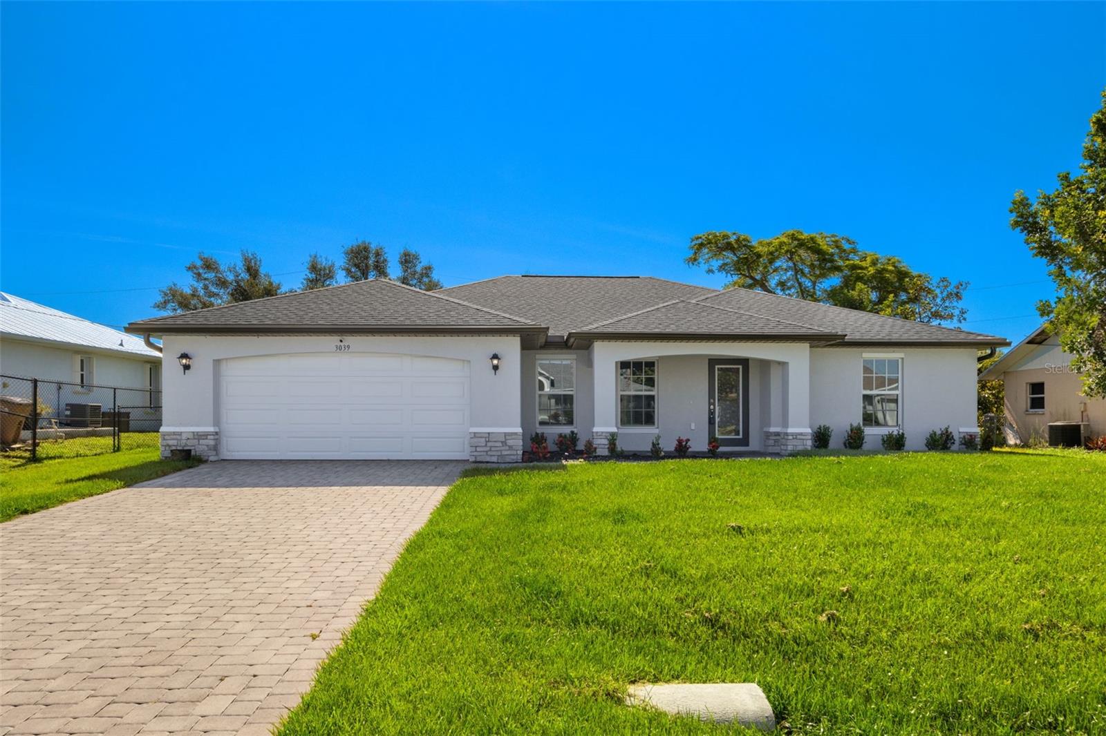 Spacious living areas with soaring vaulted ceilings and an open floor plan, including a centrally located island kitchen. Step out from the large living room onto the well enjoyed covered & screened lanai, perfect for embracing the vibrant Southwest Florida lifestyle. This home boasts top-notch features such as durable concrete block construction, and a high-efficiency AC system. Enjoy the luxury of Moen plumbing fixtures, sleek dimensional shingles, and PGT Impact Resistant Low E Insulated windows throughout. The kitchen impresses with 36” upper cabinets featuring soft close doors, complemented by elegant granite countertops in both the kitchen and bathrooms. A stainless steel appliance package adds a modern touch, while colonial style raised panel doors and an electric garage door opener enhance convenience. Revel in tile flooring in the main living areas and stone accents on the front elevation. Plus, practical additions like an irrigation system, epoxy coated garage floors, and an upgraded paver driveway complete this exquisite home.
