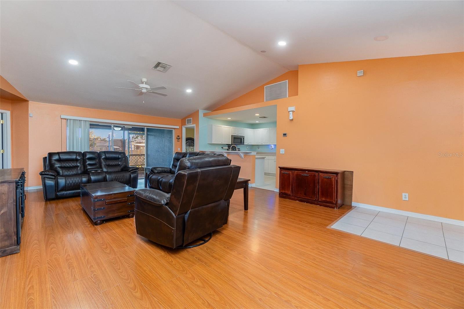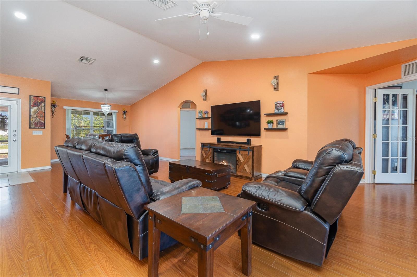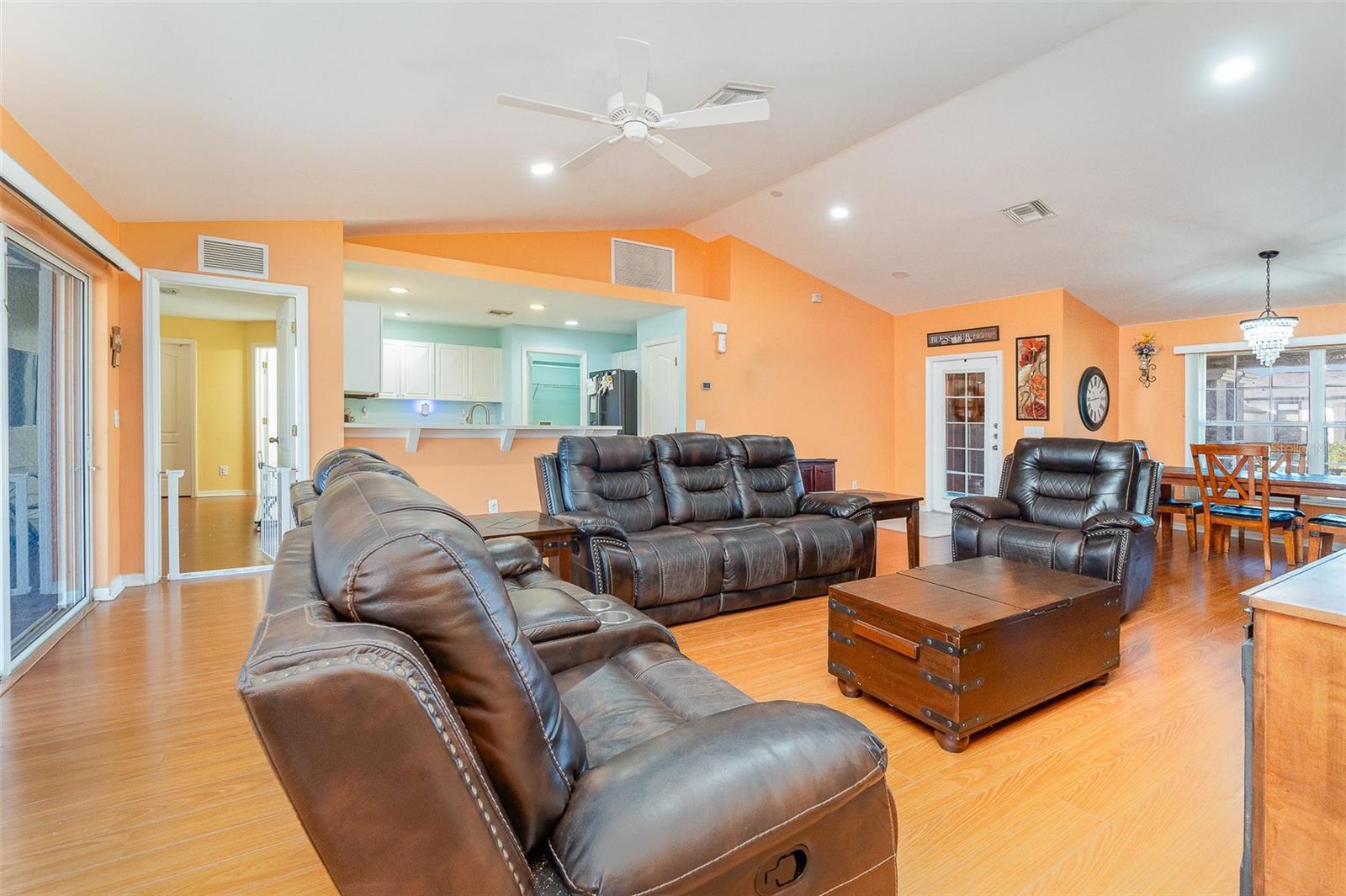 Welcome to this beautiful well maintained three bedroom and two full bathroom home in the city of Cape Coral. Walk in from the front porch to a spacious open floor plan with a combination living and kitchen area. New lights and dimmer switch recently added to the living room. Perfect for entertaining and gathering. French doors on the office/den which can be used as an extra bonus space that suits your needs. Primary bedroom with walk in closet including a large ensuite bathroom with double vanities and a separate shower and oversized tub. Doubled shelved closets in all bedrooms for plenty of storage. Screened porch in the back perfect for your morning coffee. Outdoor upgrades include new roof, a/c unit, exterior perimeter lights with auto on at dusk and auto off at dawn, patio privacy screens , gates at both side of fence, solar panels by PES SOLAR (lifetime guaranteed panels ), tool attachment in garage and generator hook up. Most recent interior updates include refrigerator, oven, microwave, water heater and carpet in bedrooms all new. Close to restaurants, entertainment, shopping and the beach. Don't wait! This home has so much to give and won't last long! Note: Special Assessment assigned to this property. Excluded items front loading washer and dryer.