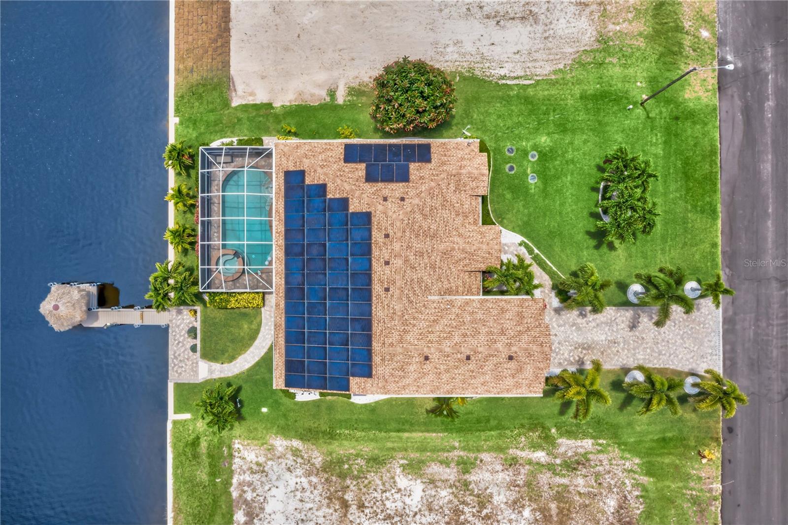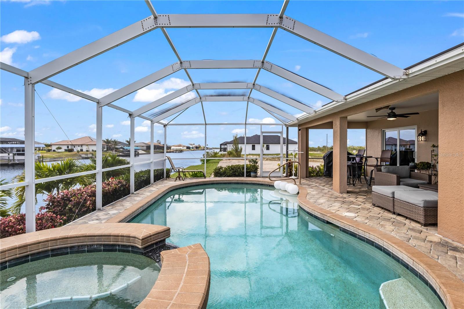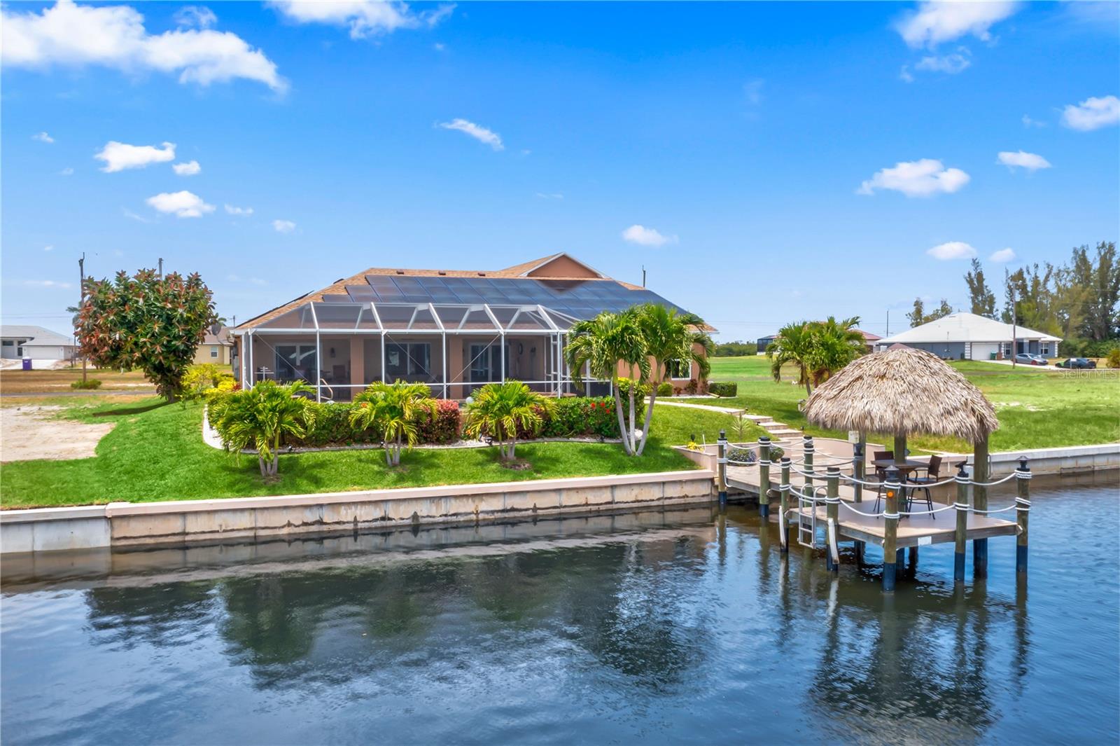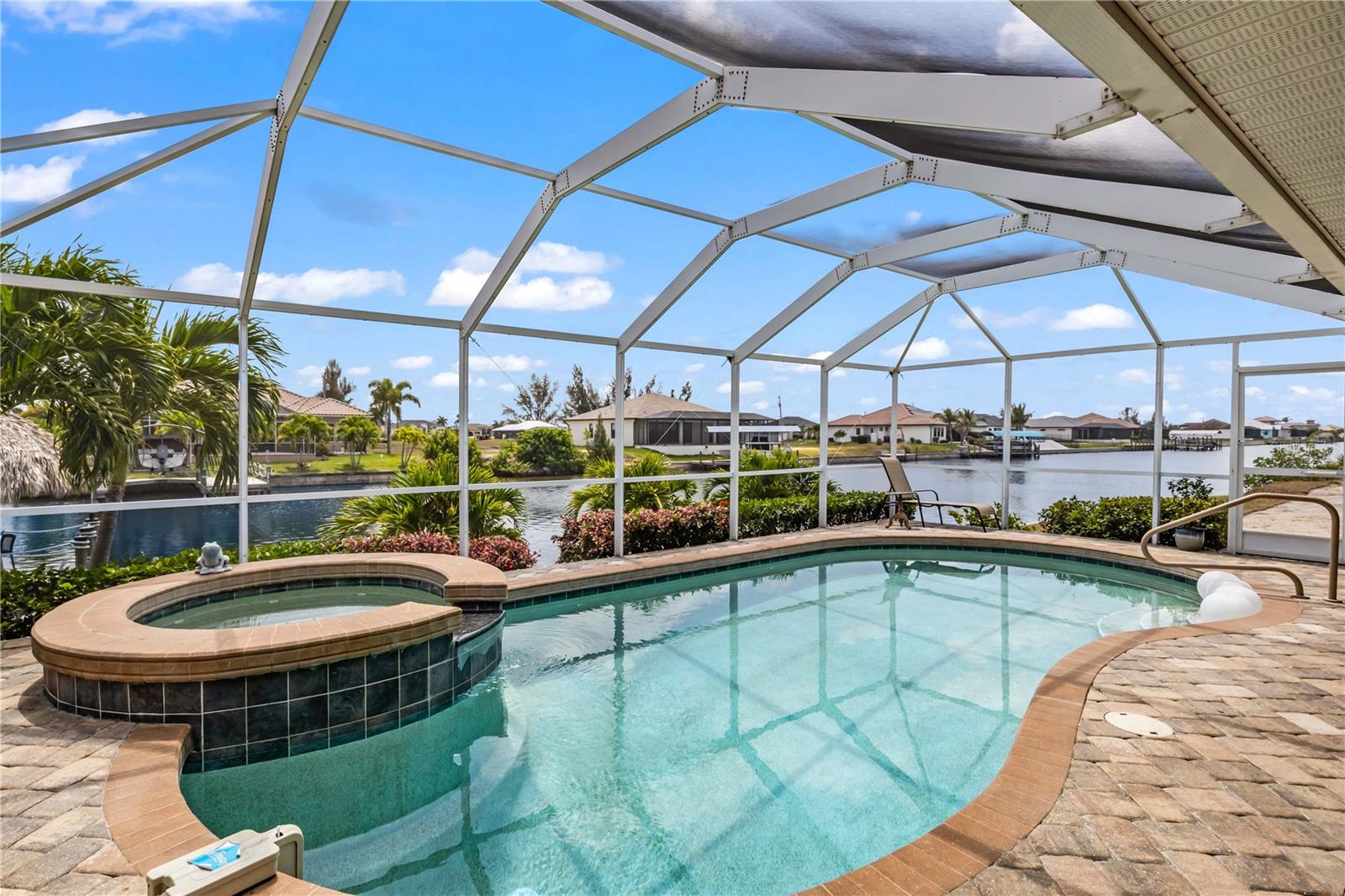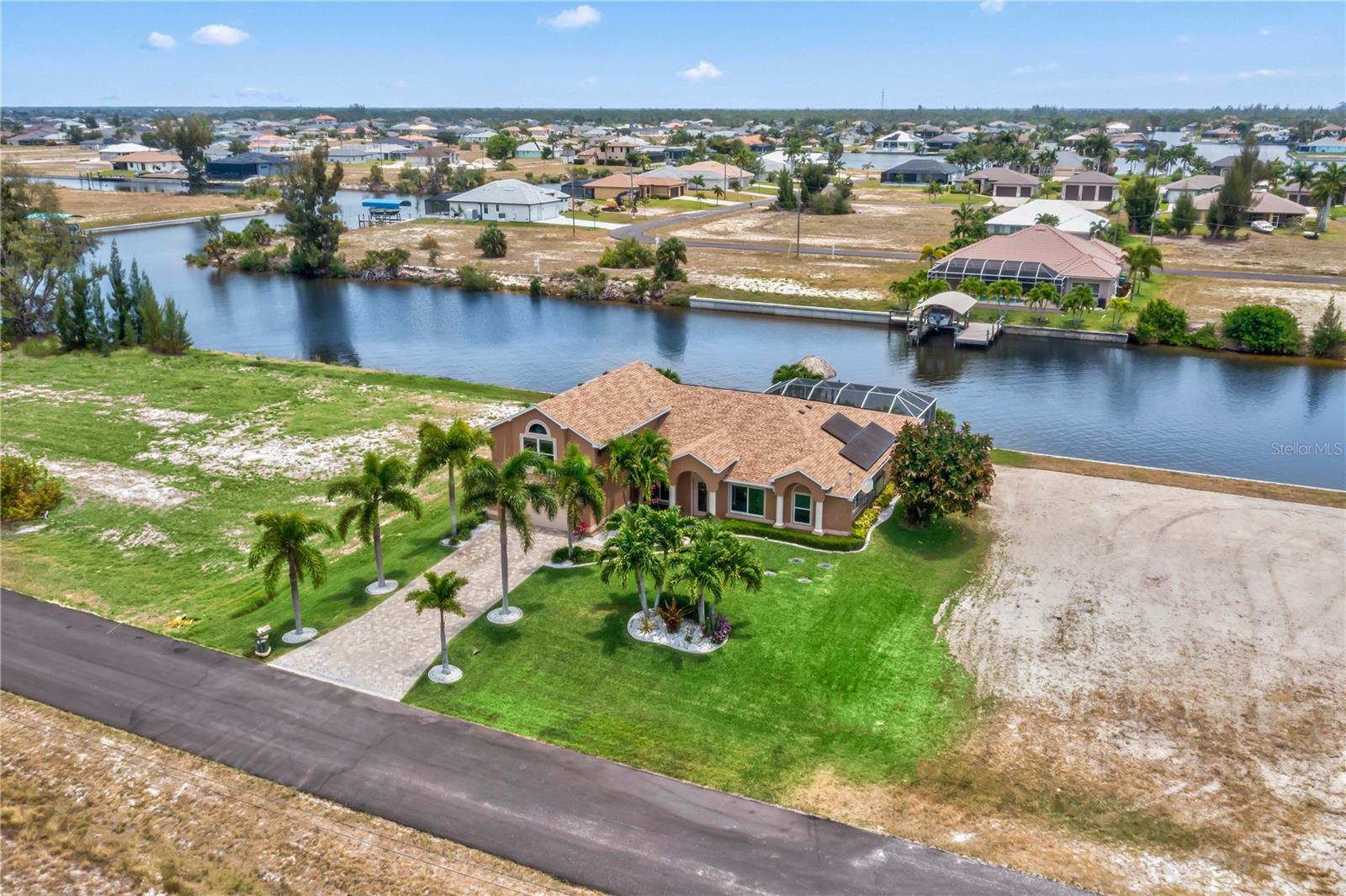 NO FLOODING from Hurricane! An incredible opportunity to own a SPECTACULAR waterfront property with intersecting canal views and directly off the spreader canal! WIDE OPEN waters for sailboat access and endless views of incredible sunrises and sunsets! This is a very active canal loaded with fish, dolphins, manatees and more! The home itself is also beautiful both inside and out - a very spacious floor plan with a bonus additional master bedroom suite upstairs that could also easily be a second family room/game room or multiple other uses! The owners have taken meticulous care of the property and upgraded the roof, solar system, reverse osmosis throughout the entire home, new ac and more! The downstairs has staggered neutral tile that compliments the light grey paint. So many details everywhere - custom front door welcomes you and floods the home with natural light. The main level is both flexible and functional - soaring vaulted ceilings, lots of windows, a split master bedroom suite with spa like master bath with double vanities, a garden tub and separate shower. There are 3 additional bedrooms downstairs and a large custom kitchen with upgraded appliances, granite counter tops and tons of counter and storage space. And then there is the outdoor RESORT area - Triple covered patio to enjoy the shade and a large area with swimming pool and spa and plenty of space to add an outdoor kitchen. Best of all is the tiki hut with views of the intersecting canal and a birds eye view for sunrises and sunsets. Plenty of room for a large boatlift and easy access with NO BRIDGES out to the water. This home checks all the boxes for a perfect vacation rental and is located on a quiet culdesac lot in the booming Northwest corridor! FLOOD is transferrable and UNDER $700 A YEAR!!!
