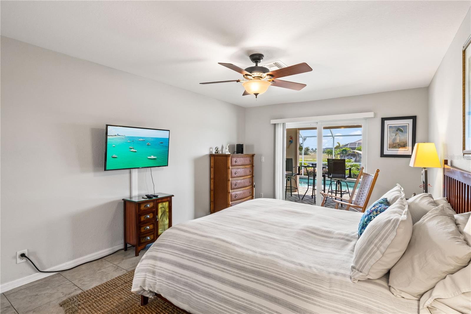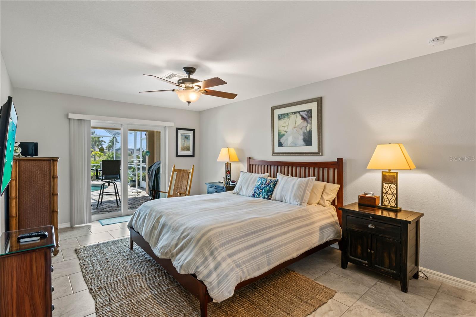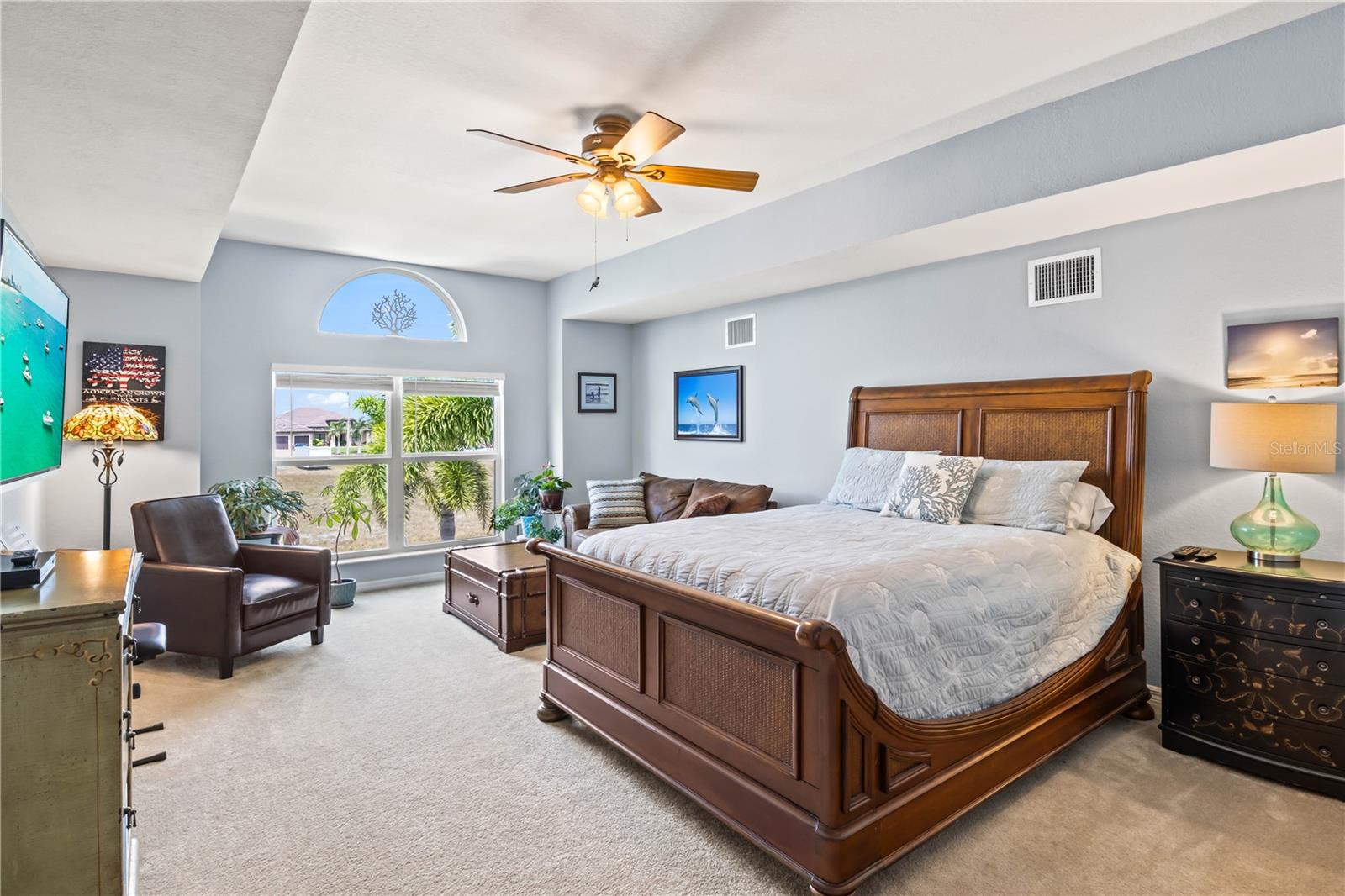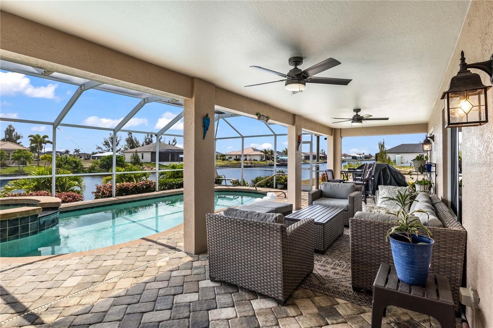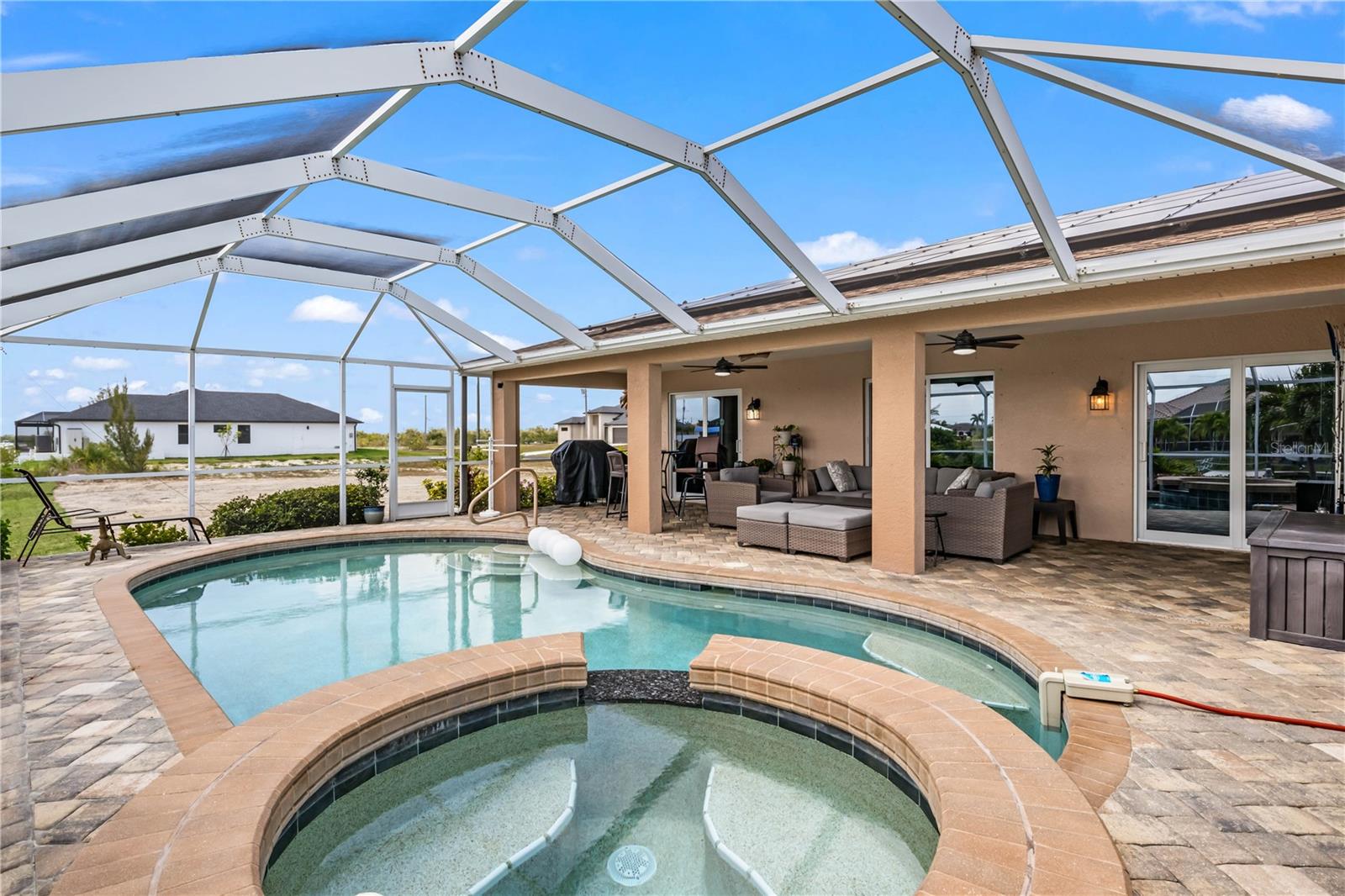 NO FLOODING from Hurricane! An incredible opportunity to own a SPECTACULAR waterfront property with intersecting canal views and directly off the spreader canal! WIDE OPEN waters for sailboat access and endless views of incredible sunrises and sunsets! This is a very active canal loaded with fish, dolphins, manatees and more! The home itself is also beautiful both inside and out - a very spacious floor plan with a bonus additional master bedroom suite upstairs that could also easily be a second family room/game room or multiple other uses! The owners have taken meticulous care of the property and upgraded the roof, solar system, reverse osmosis throughout the entire home, new ac and more! The downstairs has staggered neutral tile that compliments the light grey paint. So many details everywhere - custom front door welcomes you and floods the home with natural light. The main level is both flexible and functional - soaring vaulted ceilings, lots of windows, a split master bedroom suite with spa like master bath with double vanities, a garden tub and separate shower. There are 3 additional bedrooms downstairs and a large custom kitchen with upgraded appliances, granite counter tops and tons of counter and storage space. And then there is the outdoor RESORT area - Triple covered patio to enjoy the shade and a large area with swimming pool and spa and plenty of space to add an outdoor kitchen. Best of all is the tiki hut with views of the intersecting canal and a birds eye view for sunrises and sunsets. Plenty of room for a large boatlift and easy access with NO BRIDGES out to the water. This home checks all the boxes for a perfect vacation rental and is located on a quiet culdesac lot in the booming Northwest corridor! FLOOD is transferrable and UNDER $700 A YEAR!!!