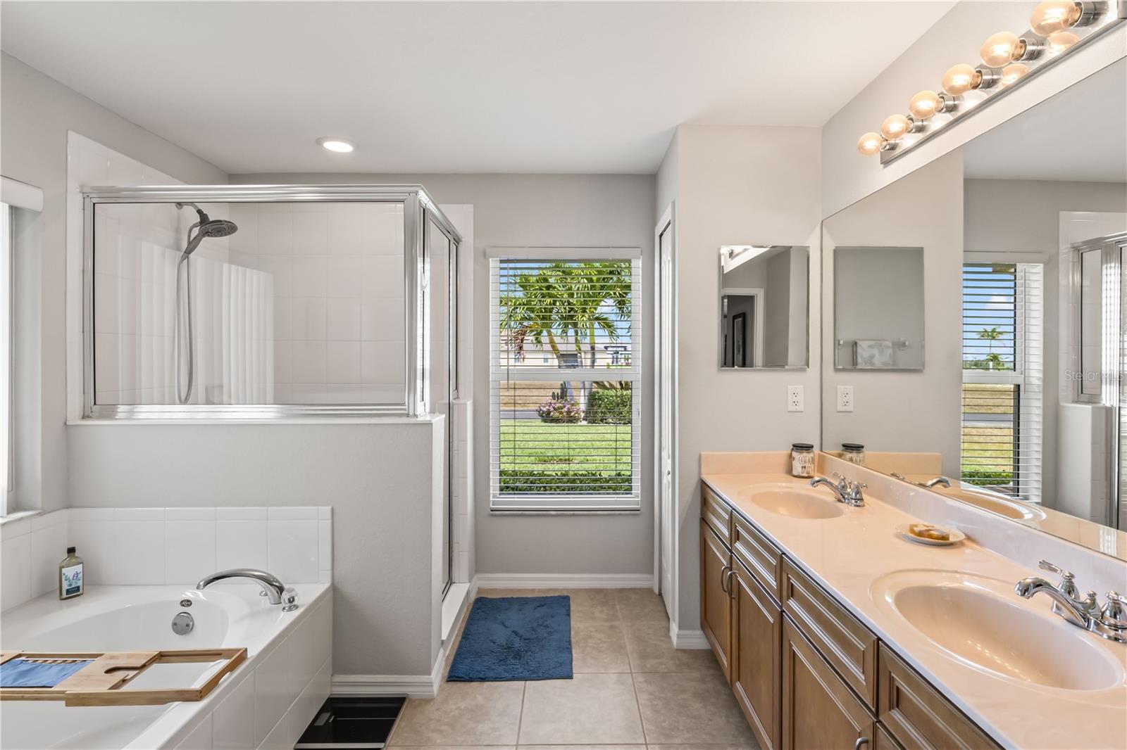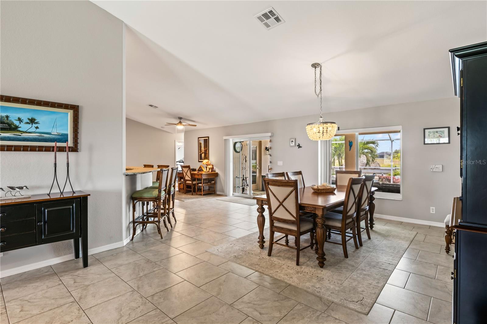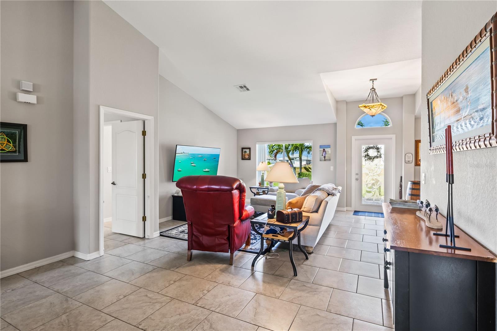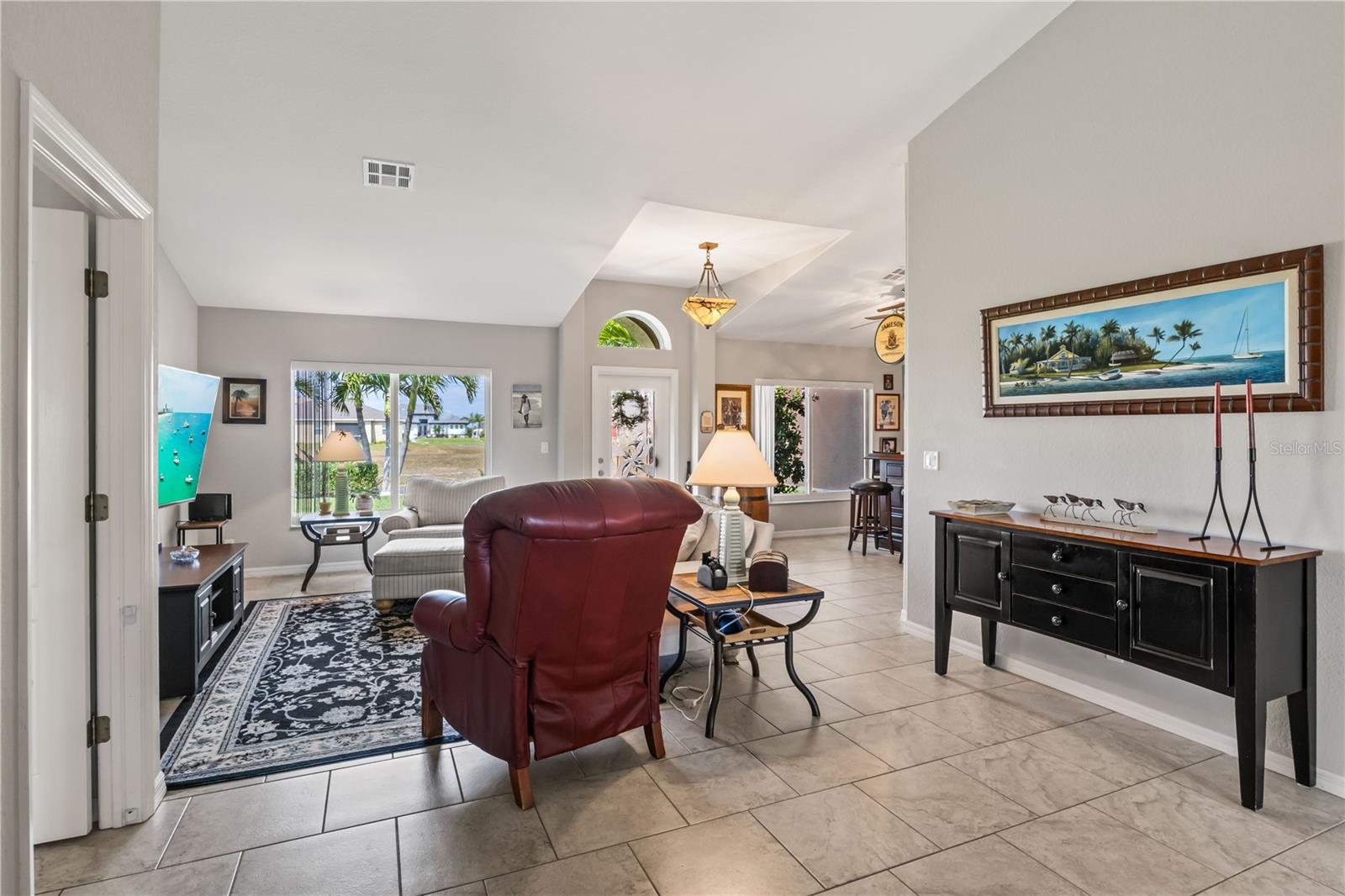 NO FLOODING from Hurricane! An incredible opportunity to own a SPECTACULAR waterfront property with intersecting canal views and directly off the spreader canal! WIDE OPEN waters for sailboat access and endless views of incredible sunrises and sunsets! This is a very active canal loaded with fish, dolphins, manatees and more! The home itself is also beautiful both inside and out - a very spacious floor plan with a bonus additional master bedroom suite upstairs that could also easily be a second family room/game room or multiple other uses! The owners have taken meticulous care of the property and upgraded the roof, solar system, reverse osmosis throughout the entire home, new ac and more! The downstairs has staggered neutral tile that compliments the light grey paint. So many details everywhere - custom front door welcomes you and floods the home with natural light. The main level is both flexible and functional - soaring vaulted ceilings, lots of windows, a split master bedroom suite with spa like master bath with double vanities, a garden tub and separate shower. There are 3 additional bedrooms downstairs and a large custom kitchen with upgraded appliances, granite counter tops and tons of counter and storage space. And then there is the outdoor RESORT area - Triple covered patio to enjoy the shade and a large area with swimming pool and spa and plenty of space to add an outdoor kitchen. Best of all is the tiki hut with views of the intersecting canal and a birds eye view for sunrises and sunsets. Plenty of room for a large boatlift and easy access with NO BRIDGES out to the water. This home checks all the boxes for a perfect vacation rental and is located on a quiet culdesac lot in the booming Northwest corridor! FLOOD is transferrable and UNDER $700 A YEAR!!!