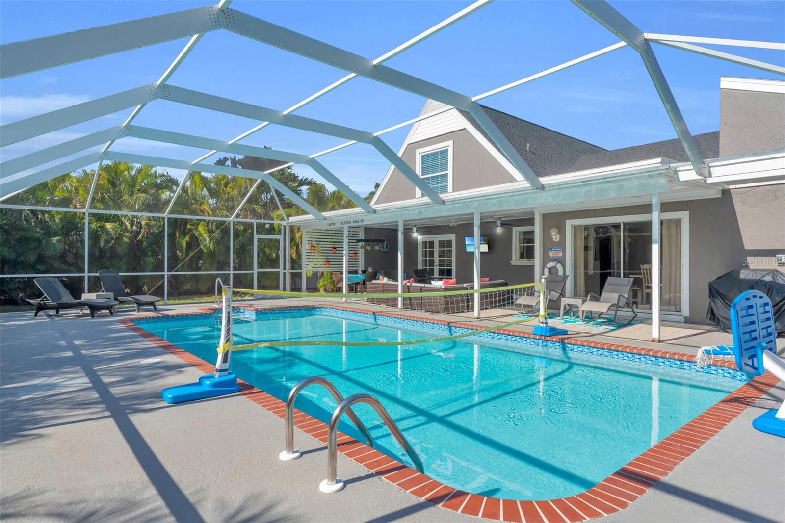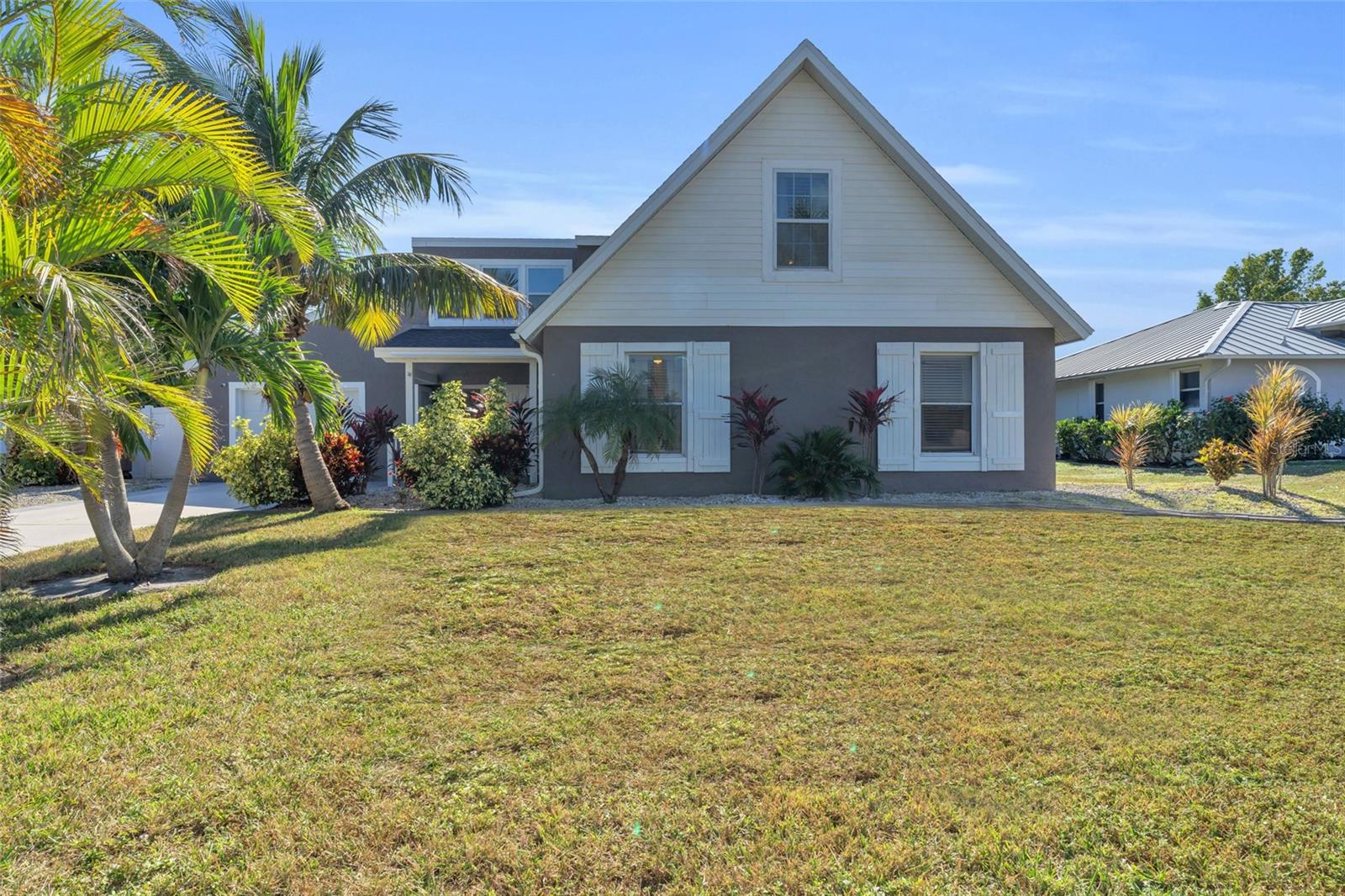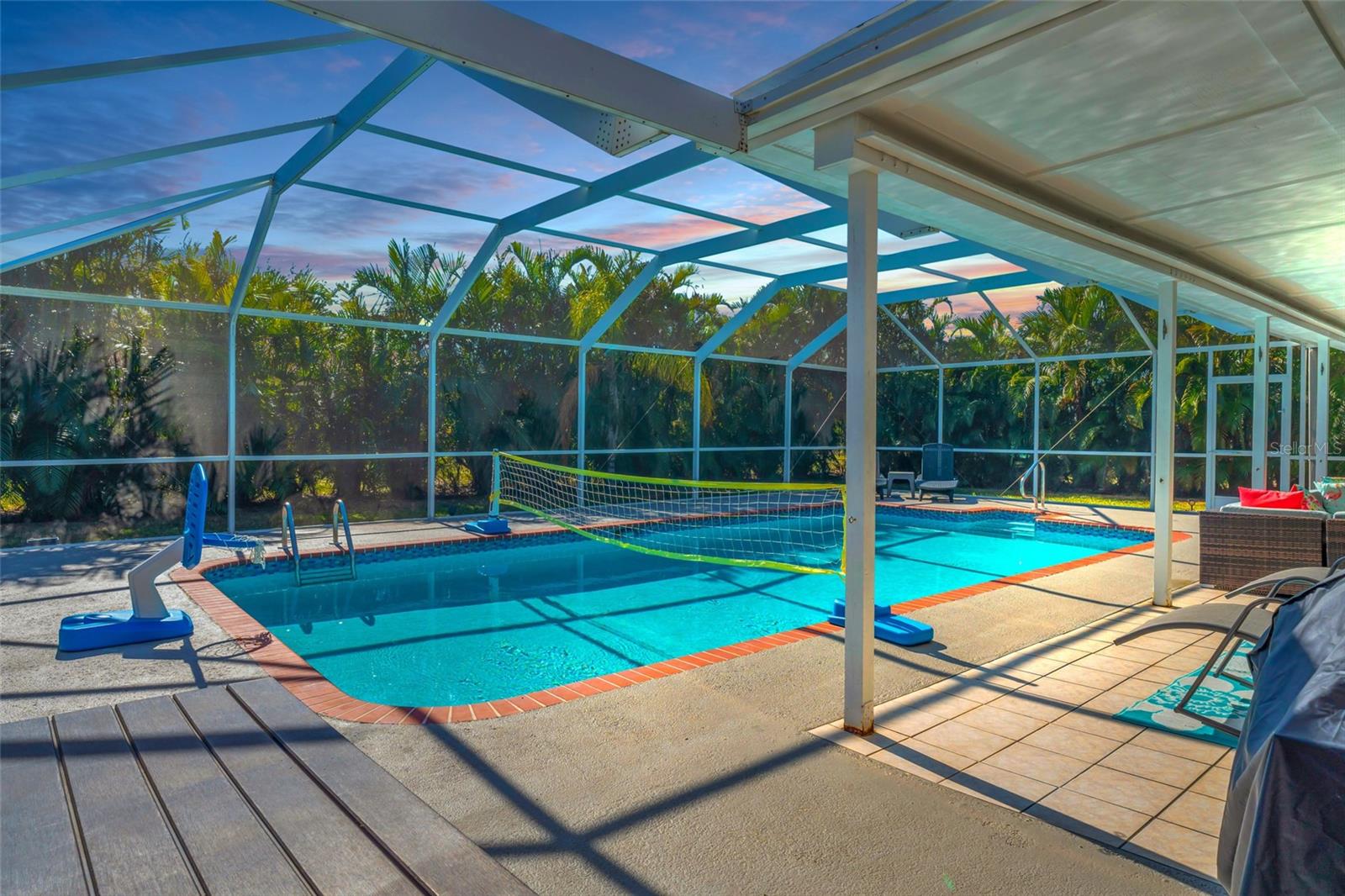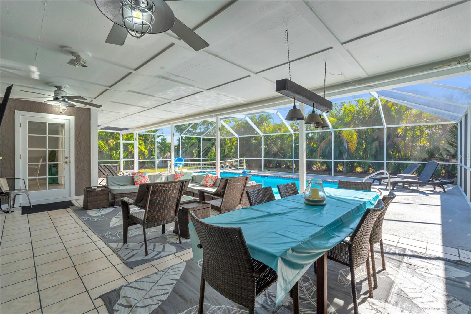 Welcome to the Sunset Cabana home in the desired Pelican neighborhood of Cape Coral, where you feel like you're staying on the beach. This immaculate 3-bedroom + den, 2-bathroom POOL home is a rare find, offering nearly 2,100 sq. ft. of thoughtfully designed living space and being sold TURNKEY—just bring your toothbrush and start living the Southwest Florida dream! It is also a SUCCESSFUL VACATION RENTAL PROPERTY for the past few years with high ratings by guests. Step into the inviting open concept living area, where a spacious kitchen, dining space, and living room blend seamlessly to create the perfect setting for entertaining. Two bedrooms are conveniently located on the first floor. From here, enjoy panoramic views of the lush backyard and OVERSIZED, HEATED POOL—your private oasis awaits. The second floor boasts a serene master suite complete with a cozy separate living area and reading nook/ extra guest sleeping area that overlooks the sparkling pool below. Whether you're working from home, reading a book, or unwinding after a long day, this home offers a space for every mood. Outside, the landscaped backyard is adorned with tropical palm trees, creating a secluded paradise. The large, covered lanai is perfect for hosting family gatherings or relaxing under the Florida sunshine. With a nearly new roof completed in 2023, a new garage door in 2021, updated kitchen with stainless steel appliances and updated bathrooms, updated plumbing, and a new AC in 2024, upper windows are hurricane impact glass, along with the pool resurfaced and beautiful tiles added, every detail has been considered to ensure your comfort and peace of mind. This property isn’t just a home—it’s a lifestyle. Nestled in the quiet Pelican neighborhood, you’re just minutes away from schools, shopping, dining, entertainment, and marinas. Whether you're searching for the perfect family retreat or a proven vacation rental property, this home delivers. The home is NOT in a flood zone! Opportunities like this don’t come around often—schedule your showing today and make this rare gem your very own slice of paradise! Be sure to watch the VIDEO of the home!