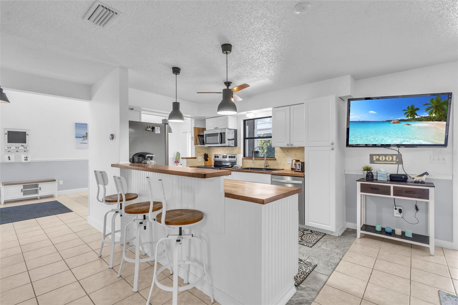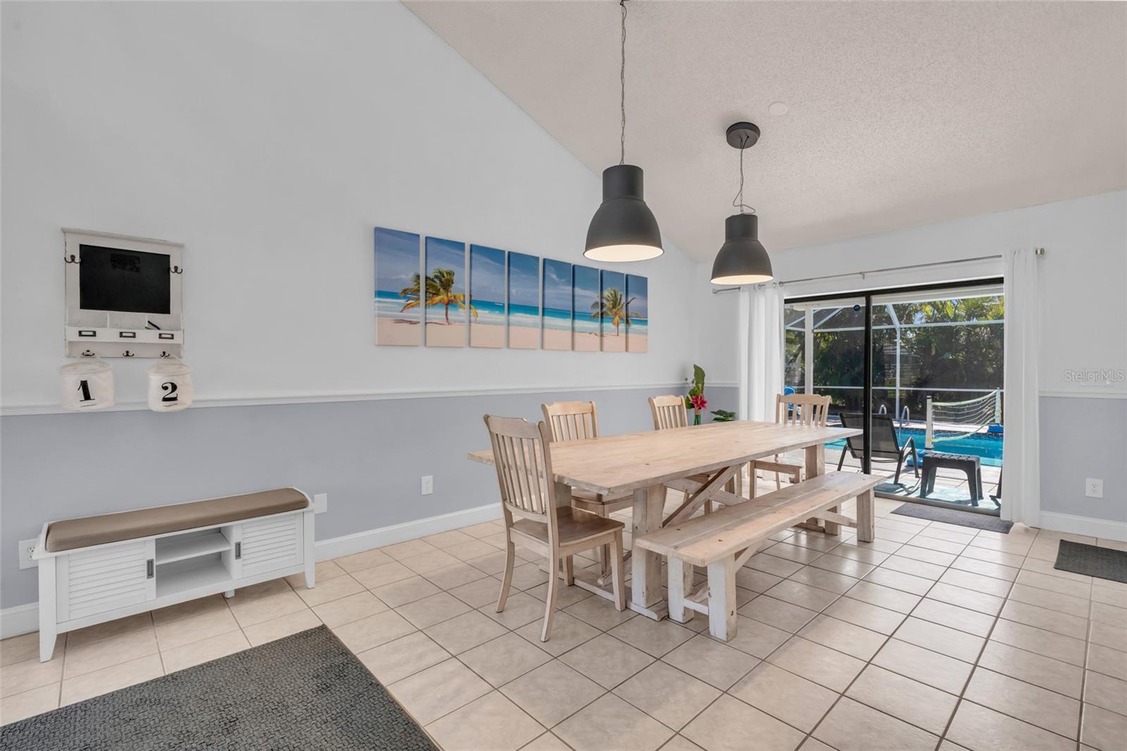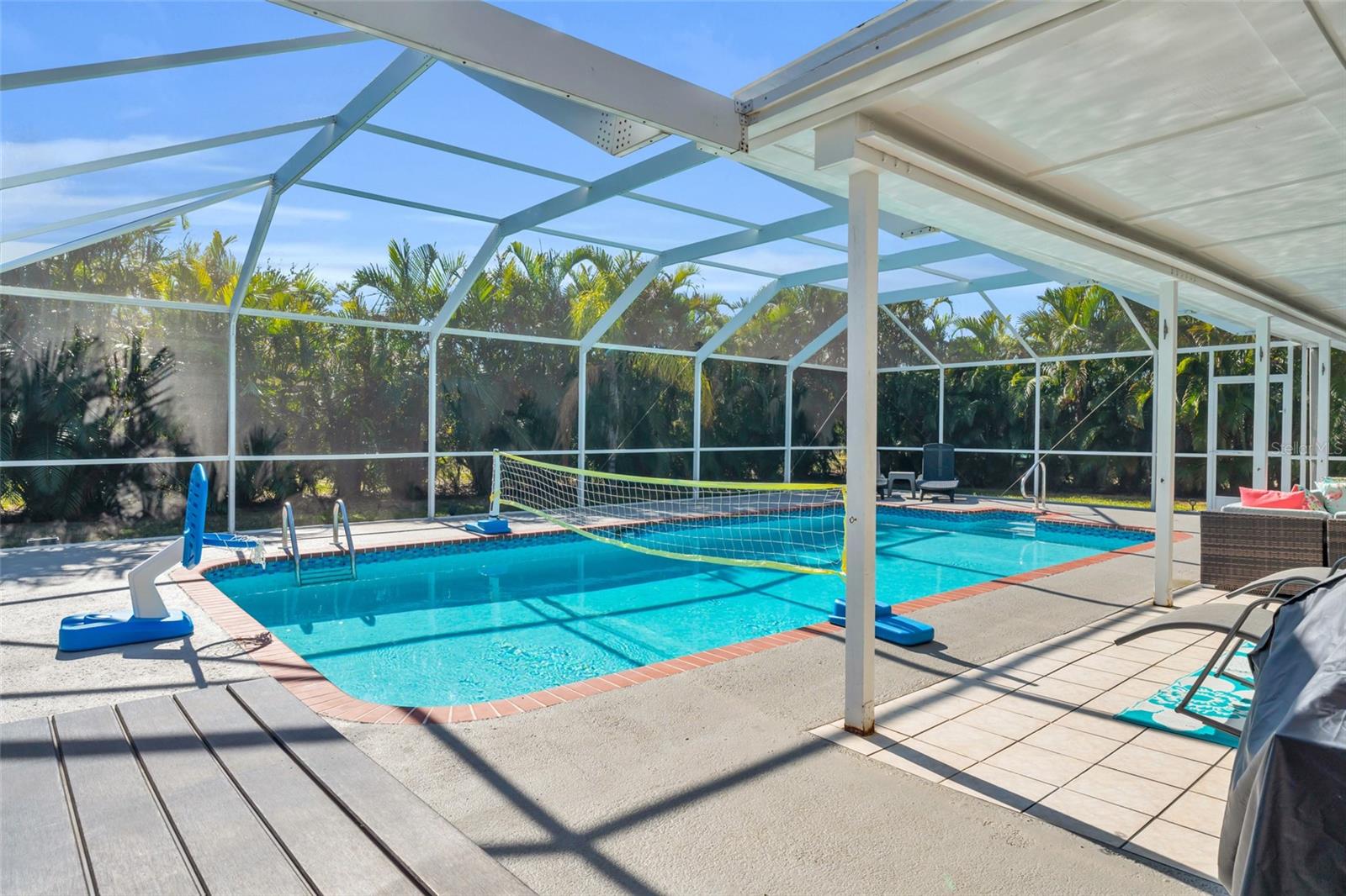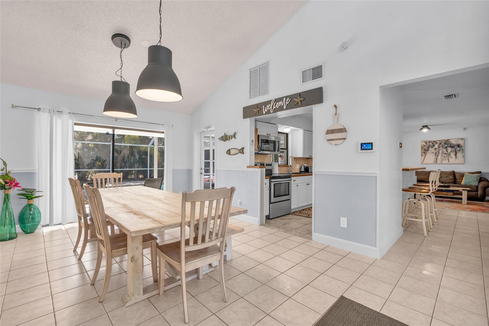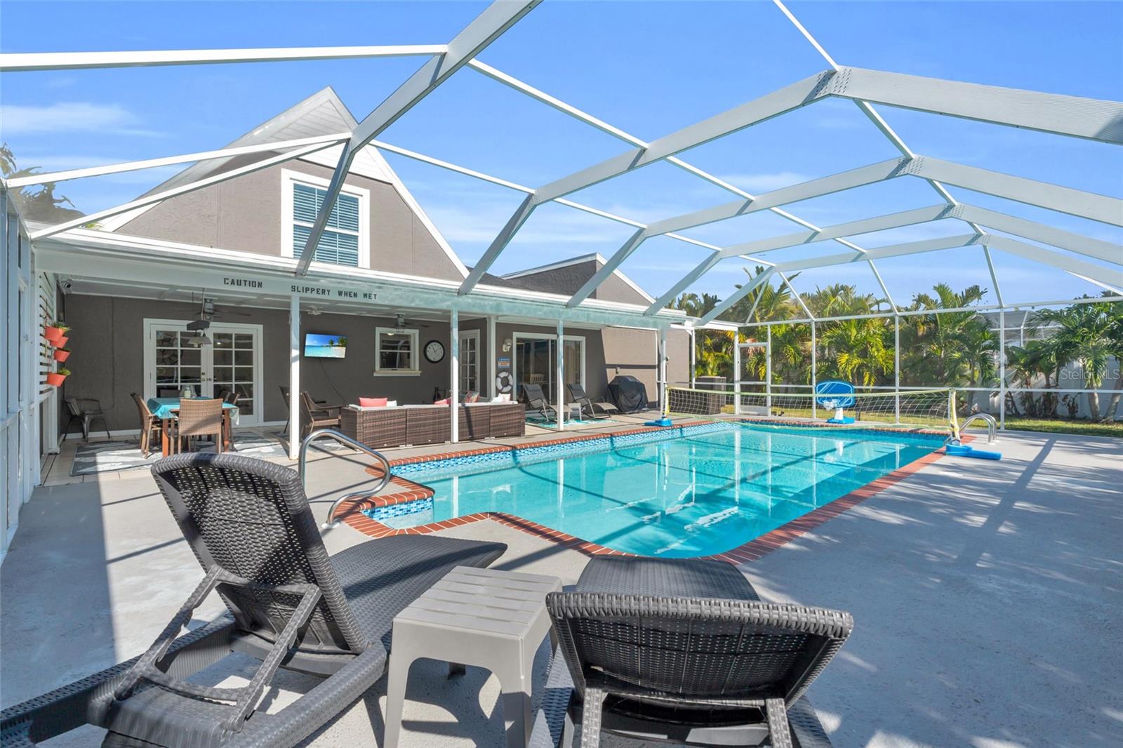 Welcome to the Sunset Cabana home in the desired Pelican neighborhood of Cape Coral, where you feel like you're staying on the beach. This immaculate 3-bedroom + den, 2-bathroom POOL home is a rare find, offering nearly 2,100 sq. ft. of thoughtfully designed living space and being sold TURNKEY—just bring your toothbrush and start living the Southwest Florida dream! It is also a SUCCESSFUL VACATION RENTAL PROPERTY for the past few years with high ratings by guests. Step into the inviting open concept living area, where a spacious kitchen, dining space, and living room blend seamlessly to create the perfect setting for entertaining. Two bedrooms are conveniently located on the first floor. From here, enjoy panoramic views of the lush backyard and OVERSIZED, HEATED POOL—your private oasis awaits. The second floor boasts a serene master suite complete with a cozy separate living area and reading nook/ extra guest sleeping area that overlooks the sparkling pool below. Whether you're working from home, reading a book, or unwinding after a long day, this home offers a space for every mood. Outside, the landscaped backyard is adorned with tropical palm trees, creating a secluded paradise. The large, covered lanai is perfect for hosting family gatherings or relaxing under the Florida sunshine. With a nearly new roof completed in 2023, a new garage door in 2021, updated kitchen with stainless steel appliances and updated bathrooms, updated plumbing, and a new AC in 2024, upper windows are hurricane impact glass, along with the pool resurfaced and beautiful tiles added, every detail has been considered to ensure your comfort and peace of mind. This property isn’t just a home—it’s a lifestyle. Nestled in the quiet Pelican neighborhood, you’re just minutes away from schools, shopping, dining, entertainment, and marinas. Whether you're searching for the perfect family retreat or a proven vacation rental property, this home delivers. The home is NOT in a flood zone! Opportunities like this don’t come around often—schedule your showing today and make this rare gem your very own slice of paradise! Be sure to watch the VIDEO of the home!