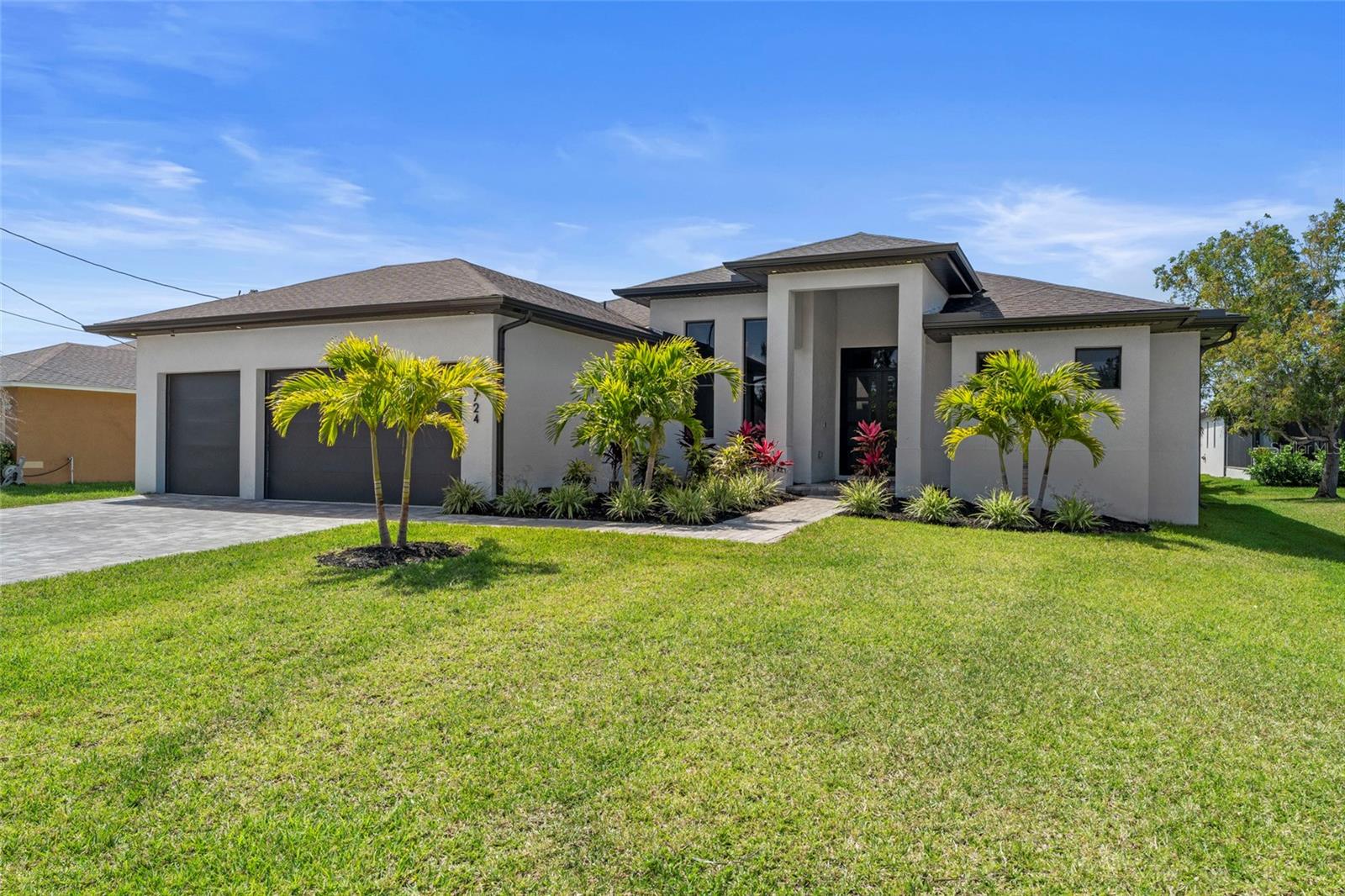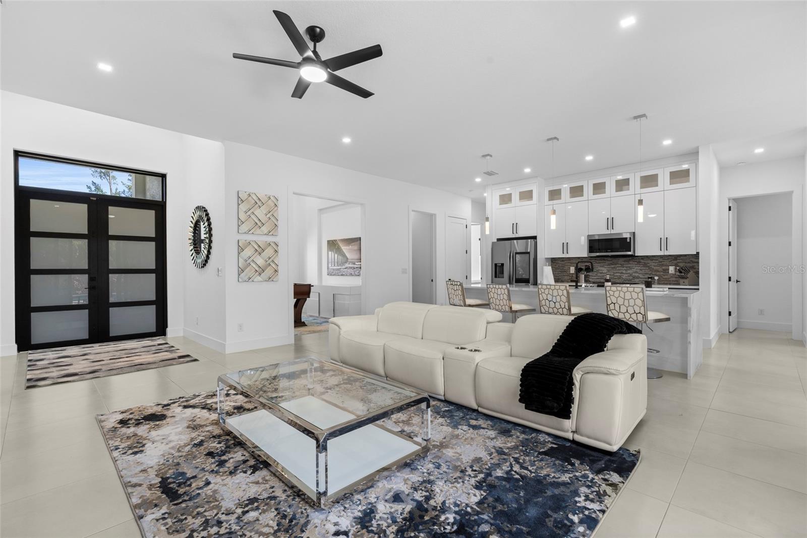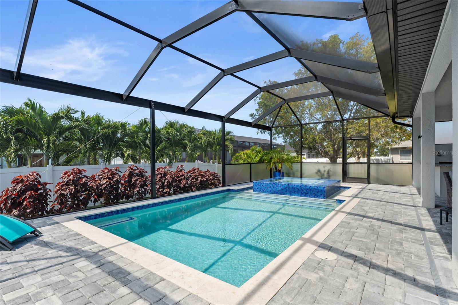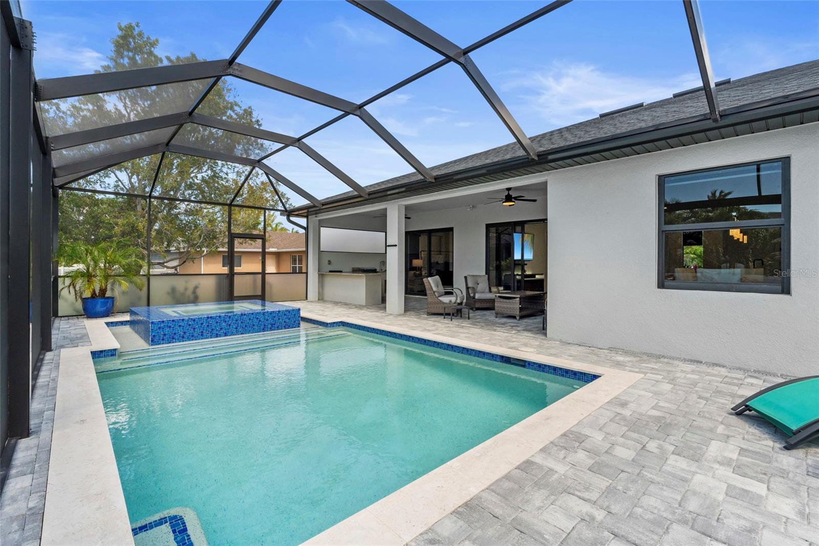 Enjoy luxury Florida living at its finest in this spectacular home featuring a heated, screened saltwater pool and spa, impact windows and doors, and high-end finishes throughout. Built in 2023, this professionally landscaped residence offers 4 bedrooms plus a den, 3 full bathrooms, and a 3-car garage, all thoughtfully designed for comfort, style, and functionality. From the moment you arrive, you’re welcomed by custom double front doors and elegant curb appeal. Inside, the home boasts 10-12' volume ceilings throughout, 18-inch tile flooring throughout, and a light, open layout curated with professionally designed decorative touches that elevate every space. The heart of the home is the custom kitchen, designed to impress with ceiling-height cabinetry, quartz countertops with a waterfall island, tiled backsplash, pantry closet, and modern stainless appliances. The spacious living and dining areas open seamlessly to the outdoors, where a covered paver patio, custom outdoor kitchen with grill, sink, beverage refrigerator, and bar seating, and a sundeck create the perfect backdrop for entertaining or relaxing in the sun. Retreat to the luxurious primary suite, featuring custom blinds, custom closet organizers in both walk-ins, and a spa-like en-suite bath with dual vanities, a free-standing soaking tub, and a walk-in tiled shower with dual rainfall and handheld showerheads. All bedrooms include closet organizers, and the main bathroom offers a full tub with a rainfall showerhead. The third bathroom serves as a cabana bath, complete with a tiled shower and rainfall showerhead for convenient access from the pool. This home is truly smart, with remote-controlled automatic blinds throughout and a security system that can be managed directly from your smartphone. The den provides a versatile space for work or play and includes a foosball table that stays with the home. Additional highlights include a zoned irrigation system, energy-efficient features, and all the thoughtful extras that make this home as practical as it is beautiful. Whether you're searching for your full-time residence, seasonal retreat, or an exceptional investment opportunity, this property delivers luxury and ease at every turn.