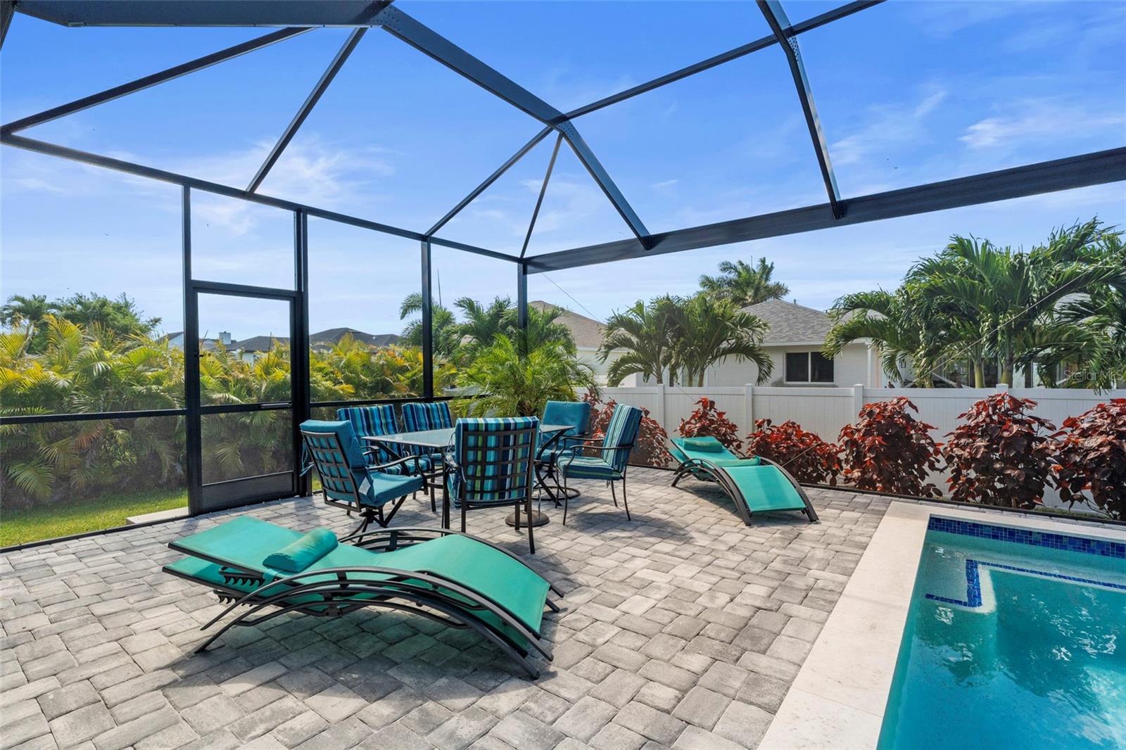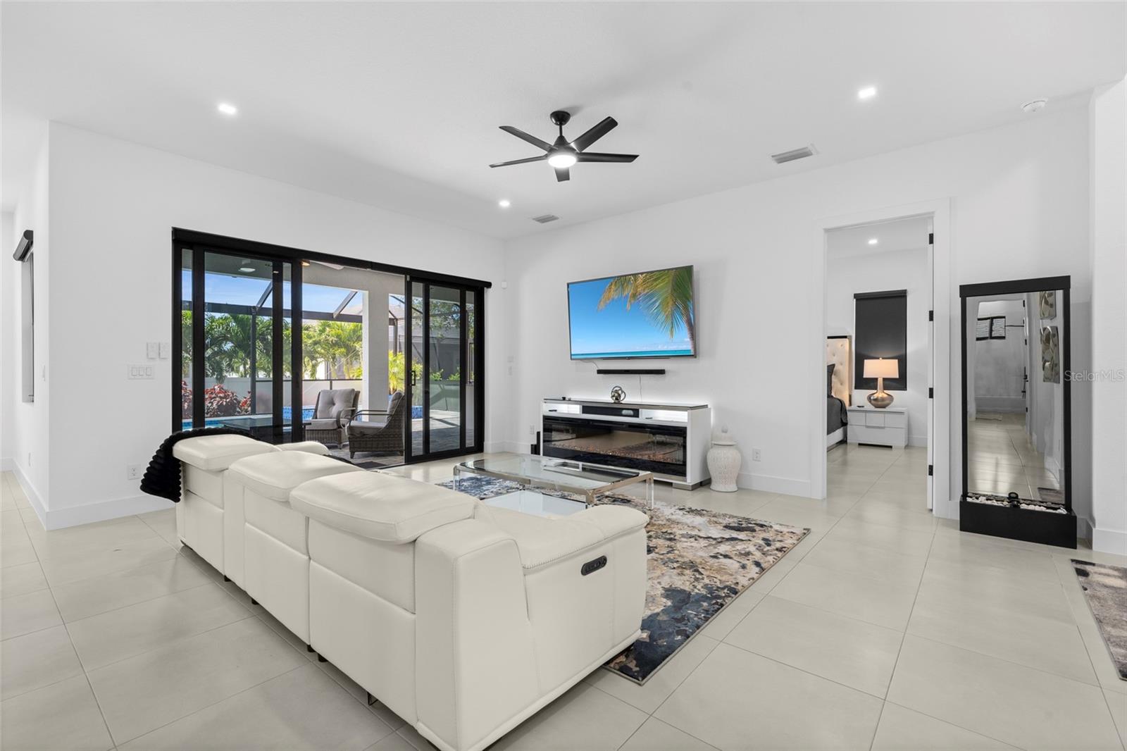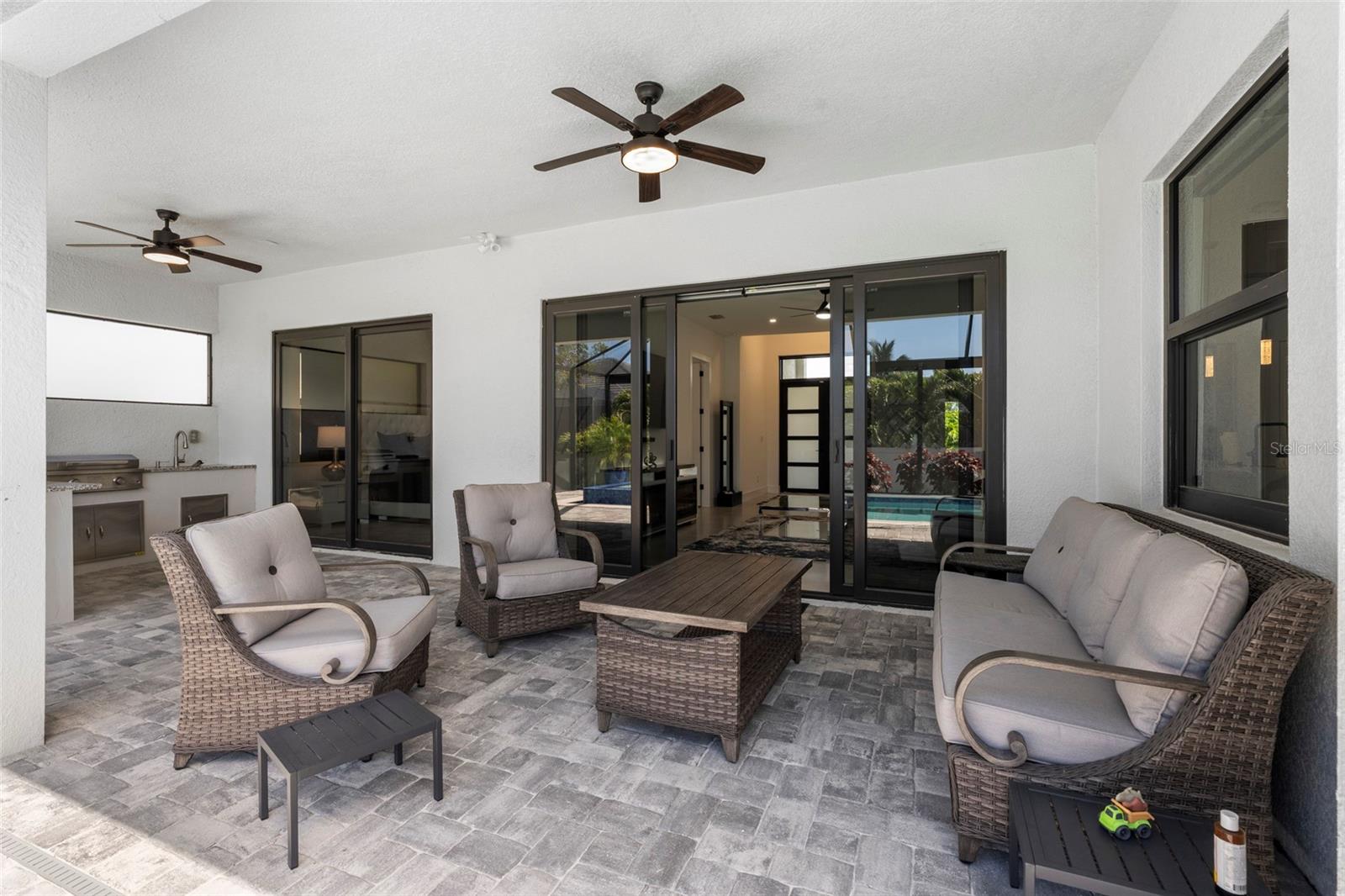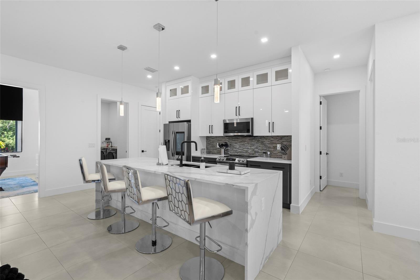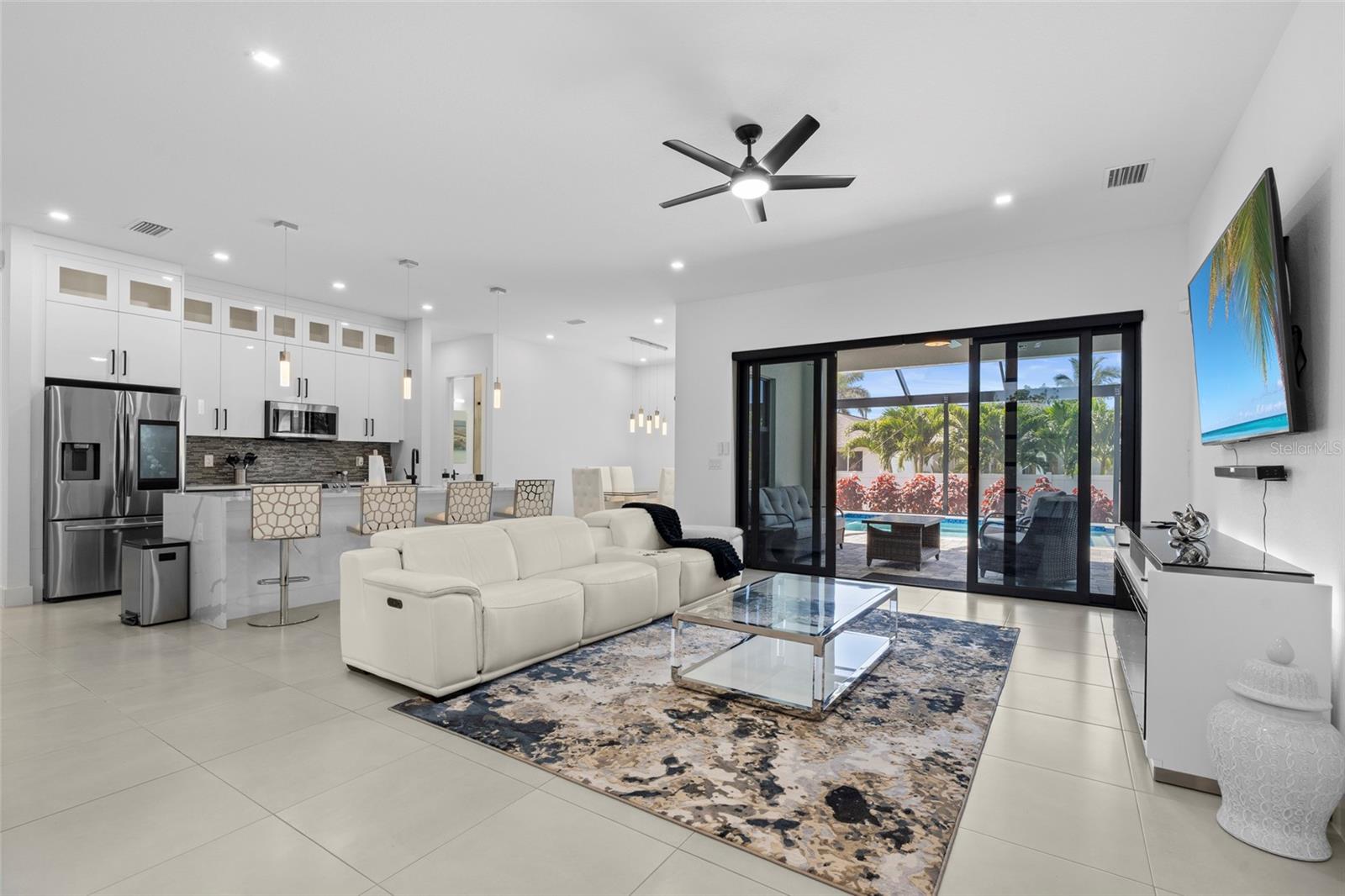 Enjoy luxury Florida living at its finest in this spectacular home featuring a heated, screened saltwater pool and spa, impact windows and doors, and high-end finishes throughout. Built in 2023, this professionally landscaped residence offers 4 bedrooms plus a den, 3 full bathrooms, and a 3-car garage, all thoughtfully designed for comfort, style, and functionality. From the moment you arrive, you’re welcomed by custom double front doors and elegant curb appeal. Inside, the home boasts 10-12' volume ceilings throughout, 18-inch tile flooring throughout, and a light, open layout curated with professionally designed decorative touches that elevate every space. The heart of the home is the custom kitchen, designed to impress with ceiling-height cabinetry, quartz countertops with a waterfall island, tiled backsplash, pantry closet, and modern stainless appliances. The spacious living and dining areas open seamlessly to the outdoors, where a covered paver patio, custom outdoor kitchen with grill, sink, beverage refrigerator, and bar seating, and a sundeck create the perfect backdrop for entertaining or relaxing in the sun. Retreat to the luxurious primary suite, featuring custom blinds, custom closet organizers in both walk-ins, and a spa-like en-suite bath with dual vanities, a free-standing soaking tub, and a walk-in tiled shower with dual rainfall and handheld showerheads. All bedrooms include closet organizers, and the main bathroom offers a full tub with a rainfall showerhead. The third bathroom serves as a cabana bath, complete with a tiled shower and rainfall showerhead for convenient access from the pool. This home is truly smart, with remote-controlled automatic blinds throughout and a security system that can be managed directly from your smartphone. The den provides a versatile space for work or play and includes a foosball table that stays with the home. Additional highlights include a zoned irrigation system, energy-efficient features, and all the thoughtful extras that make this home as practical as it is beautiful. Whether you're searching for your full-time residence, seasonal retreat, or an exceptional investment opportunity, this property delivers luxury and ease at every turn.
