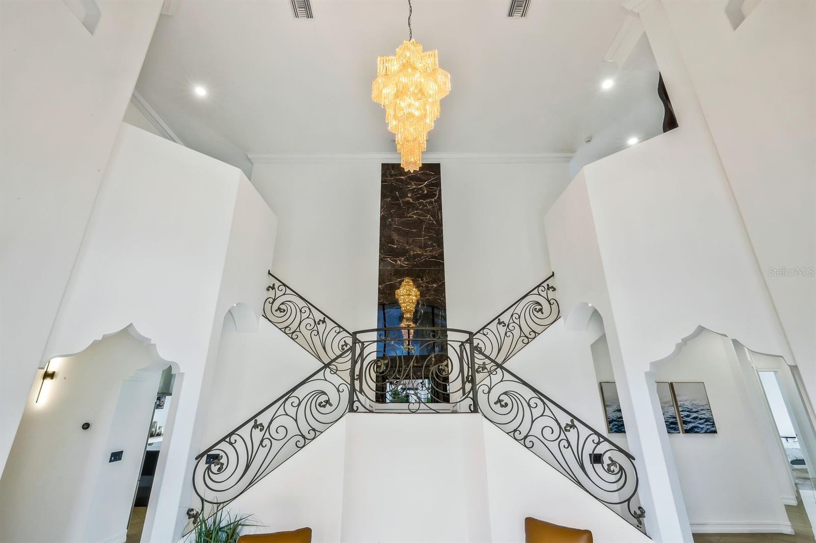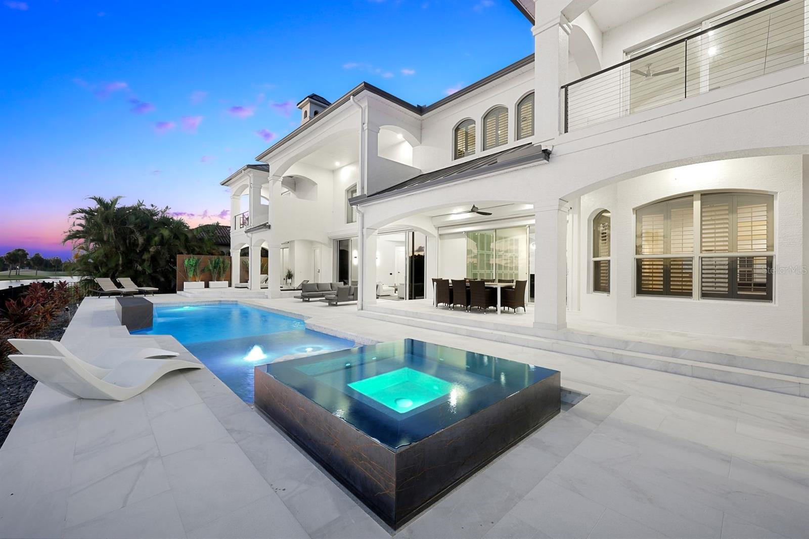 WOW! The Crown on the Green, A Distinctive Residence in Cape Royal Golf Club. This meticulously reimagined estate nestled within the beautiful, gated community of Cape Royal Golf Club. This architectural masterpiece combines timeless elegance with contemporary luxury, offering over 5,800 square feet of impeccably designed living space. With a new roof installed in 2022 and a custom-designed pool and spa, this home exemplifies elevated Florida living at its finest. The 5,814 square feet of thoughtfully curated interiors deliver ample space for refined living and grand entertaining. Enjoy the tranquility and exclusivity of low HOA fees with no mandatory club dues—an increasingly rare luxury in a gated golf community. The Western exposure offers breathtaking sunset views over the lush fairways and the pond behind the house—perfect for evening relaxation or quiet reflection. The home's striking curb appeal begins with professional landscaping, a modern charcoal-hued metal roof, and a crisp newly painted exterior. The stately columns and sweeping dual staircase frame an entryway adorned with a dramatic, cascading chandelier—evoking a sense of timeless sophistication from the moment you arrive. Step inside to soaring ceilings and an open-concept floor plan that effortlessly connects formal and informal living areas. A chef-inspired kitchen—features custom cabinetry, an oversized waterfall island with cooktop, sleek quartz countertops, top-tier appliances, and a spacious walk-in pantry. Every detail has been considered to marry beauty with function, making it the perfect space for both intimate dinners and lavish entertaining. Walls of pocketing glass sliders dissolve the boundary between interior and exterior living, opening to an expansive covered patio and designer pool with integrated spa. Set amidst manicured grounds and enclosed within a fenced yard, this outdoor sanctuary provides privacy and serenity in equal measure. A Lifestyle of Leisure Ideally positioned in Southwest Cape Coral, this home offers immediate access to the renowned Cape Royal Golf Course. Whether you're teeing off, casting a line into your private pond to catch and snook or tarpon, or enjoying the surrounding natural beauty, every day feels like a vacation. Nearby, upscale dining, boutique shopping, and marina access complete the lifestyle.
