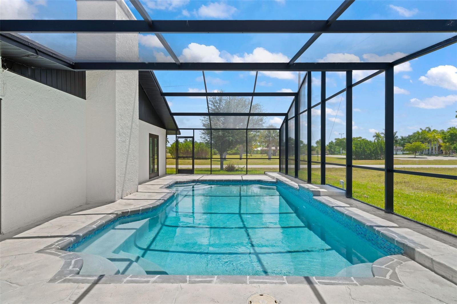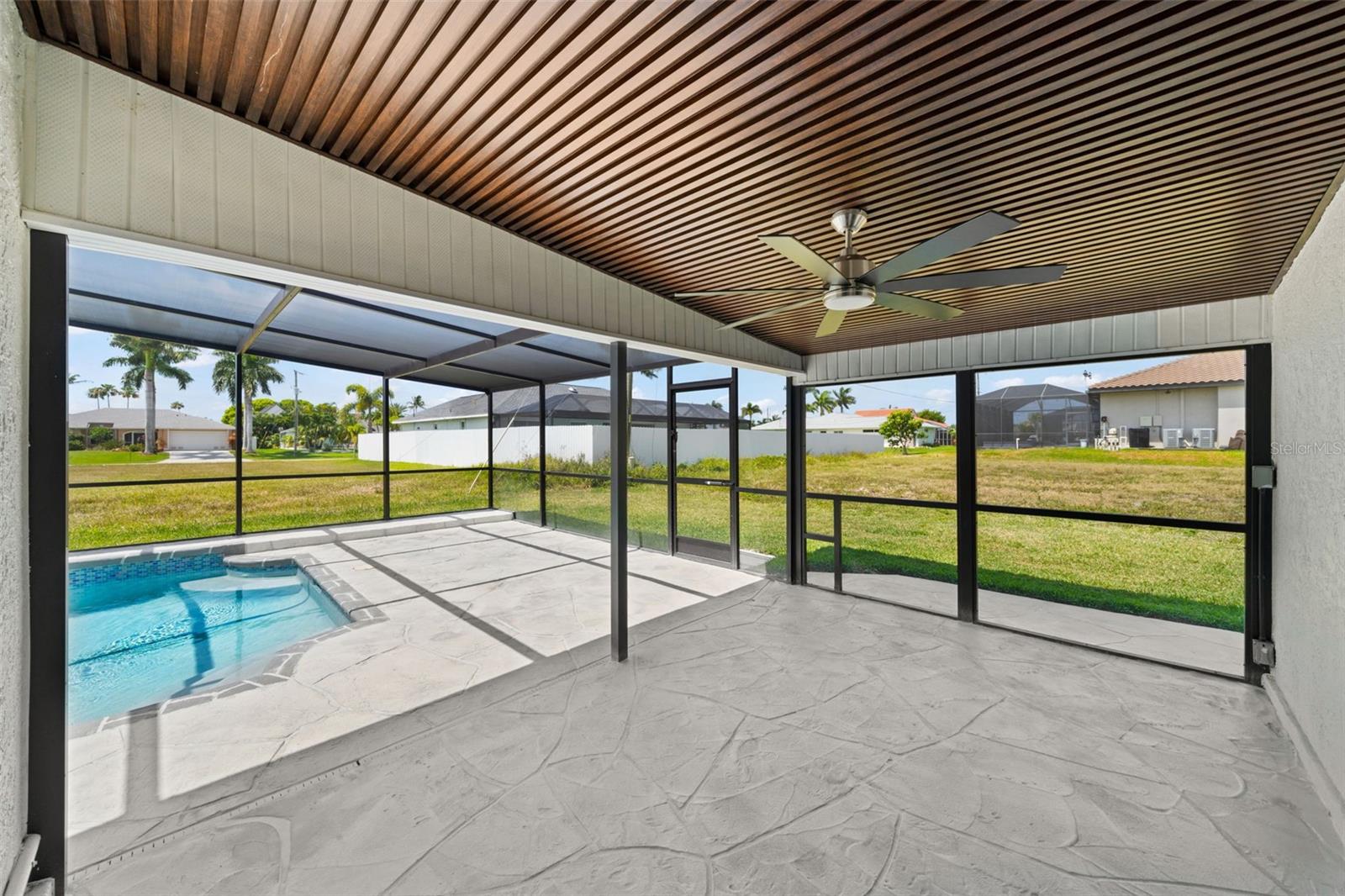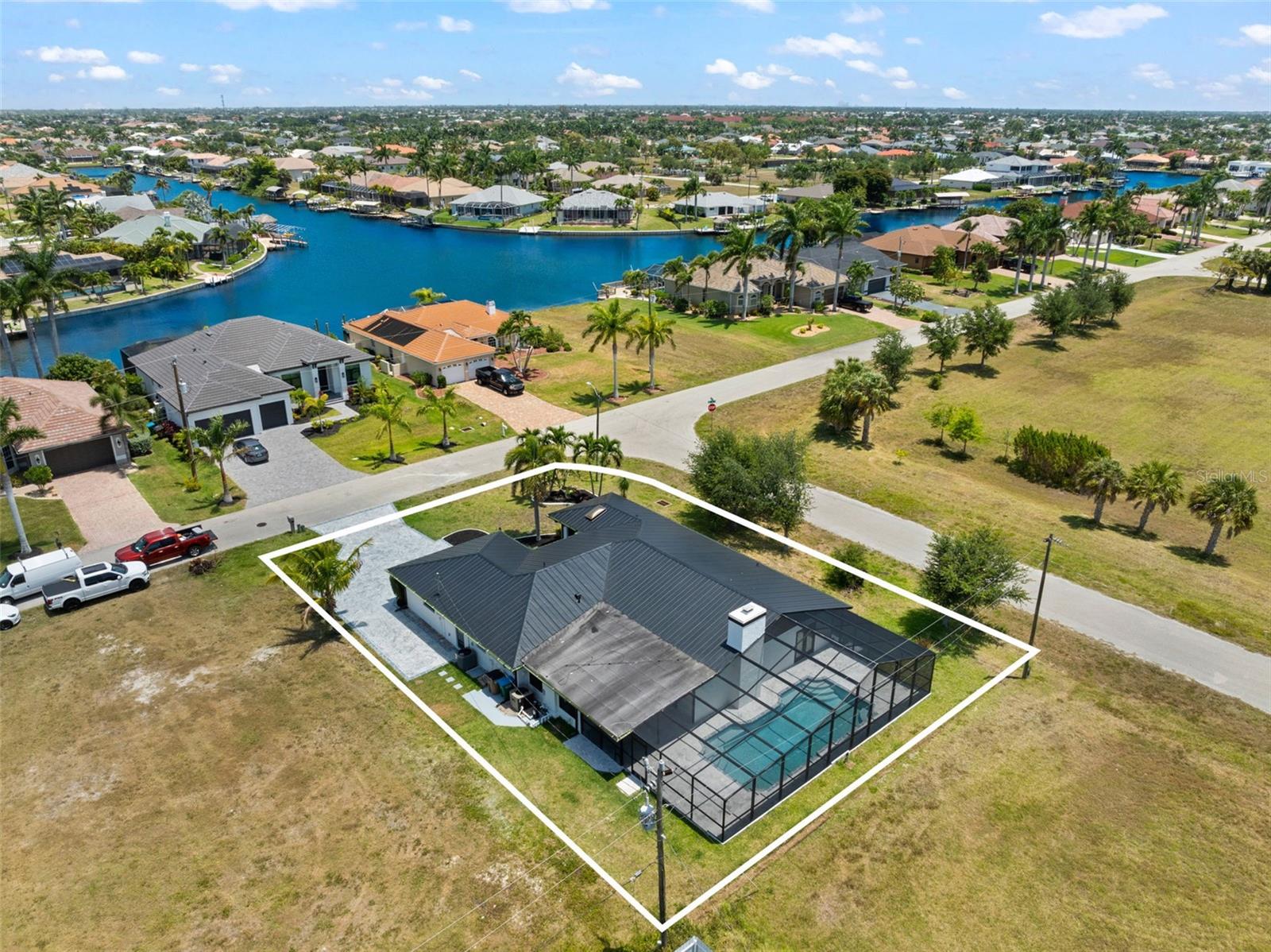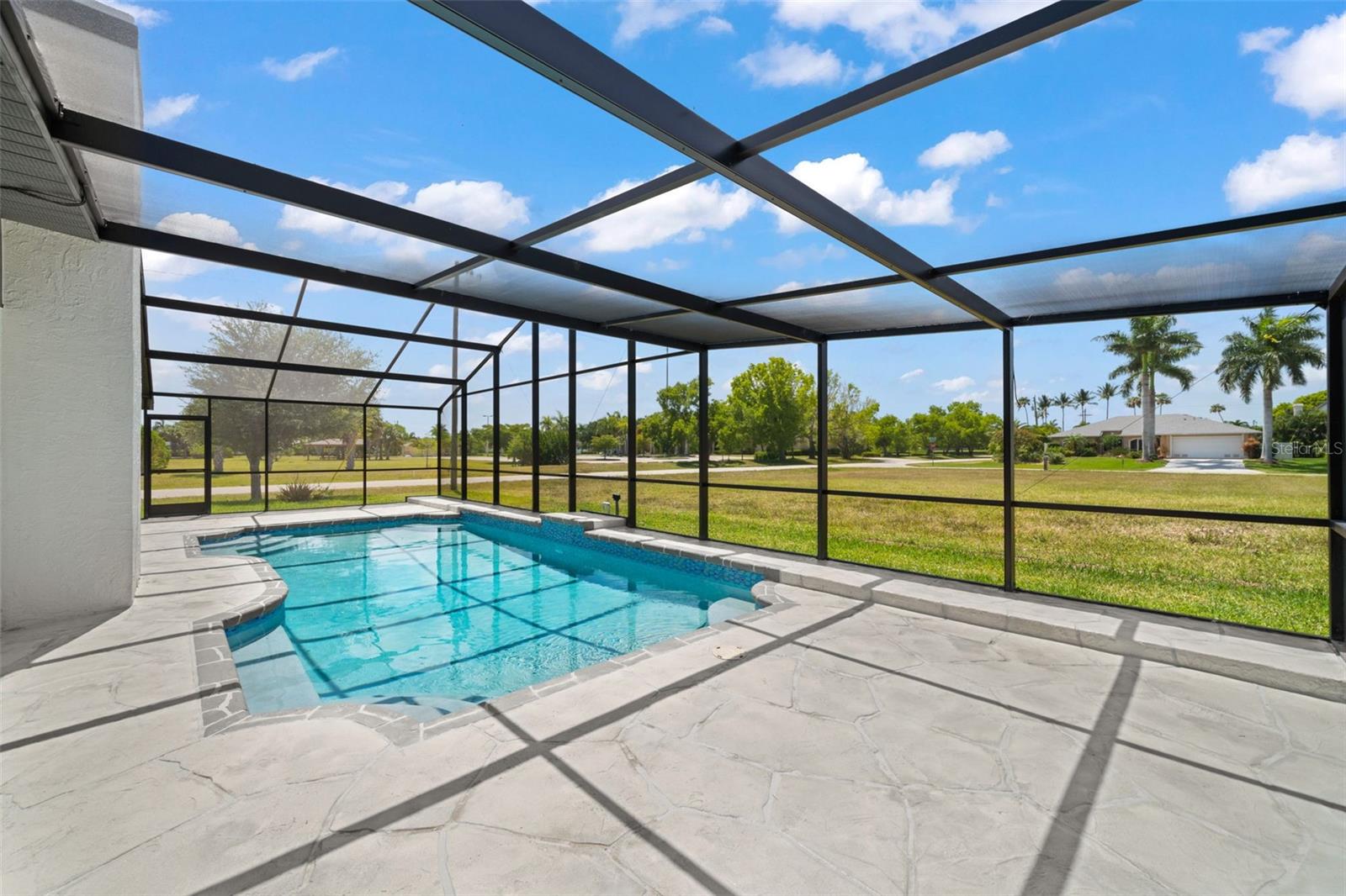 Welcome to this fully renovated home, nestled on a sought-after corner lot less than half a mile away from Cape Harbour. Undergone a stunning renovation, every inch of this residence has been carefully designed to radiate sophistication. The heart of the home, the kitchen, boasts a striking waterfall quartz island and high-quality finishes, setting the stage for culinary excellence. Beyond the kitchen, the South Facing Pool offers a serene escape and a quiet place to unwind. Inside, the thoughtful renovation continues with four bedrooms and three bathrooms, each impeccably updated to reflect modern luxury. Relax under the gentle breeze of oversized ceiling fans or cozy up by the fireplace on cooler evenings. Outside, the attention to detail is evident in the meticulously redone driveway and beautifully manicured landscaping, and creating a serene oasis enhanced by the presence of graceful palm trees. This home offers an unparalleled blend of comfort and elegance, inviting you to experience true tranquility.