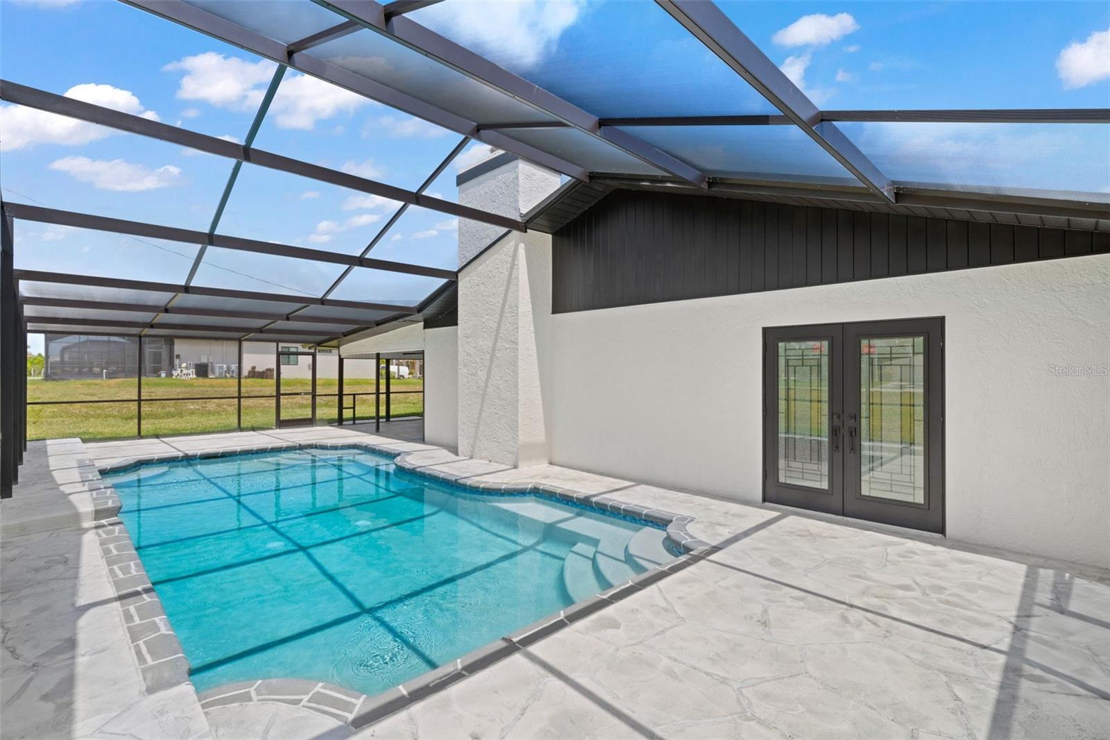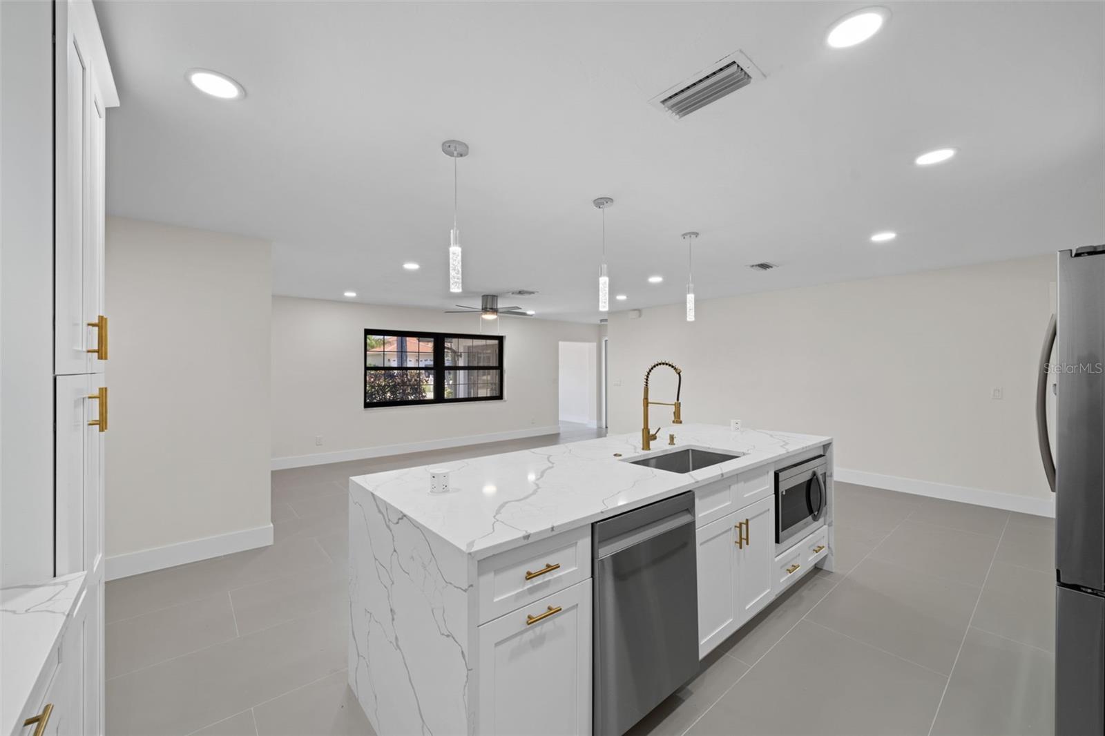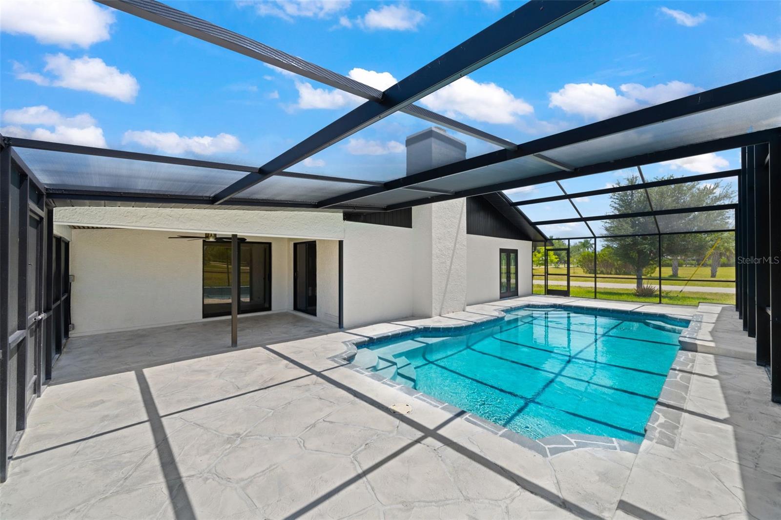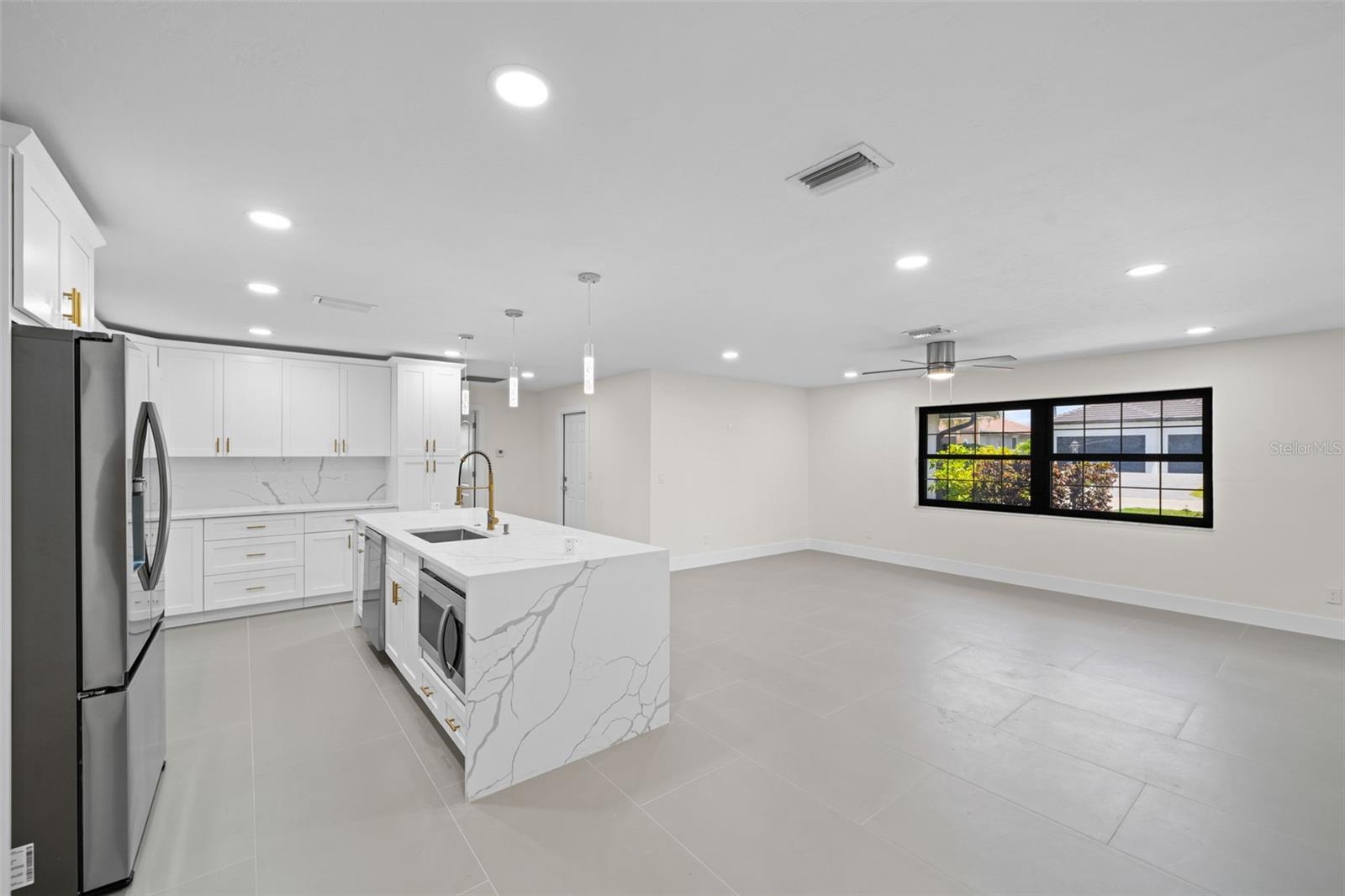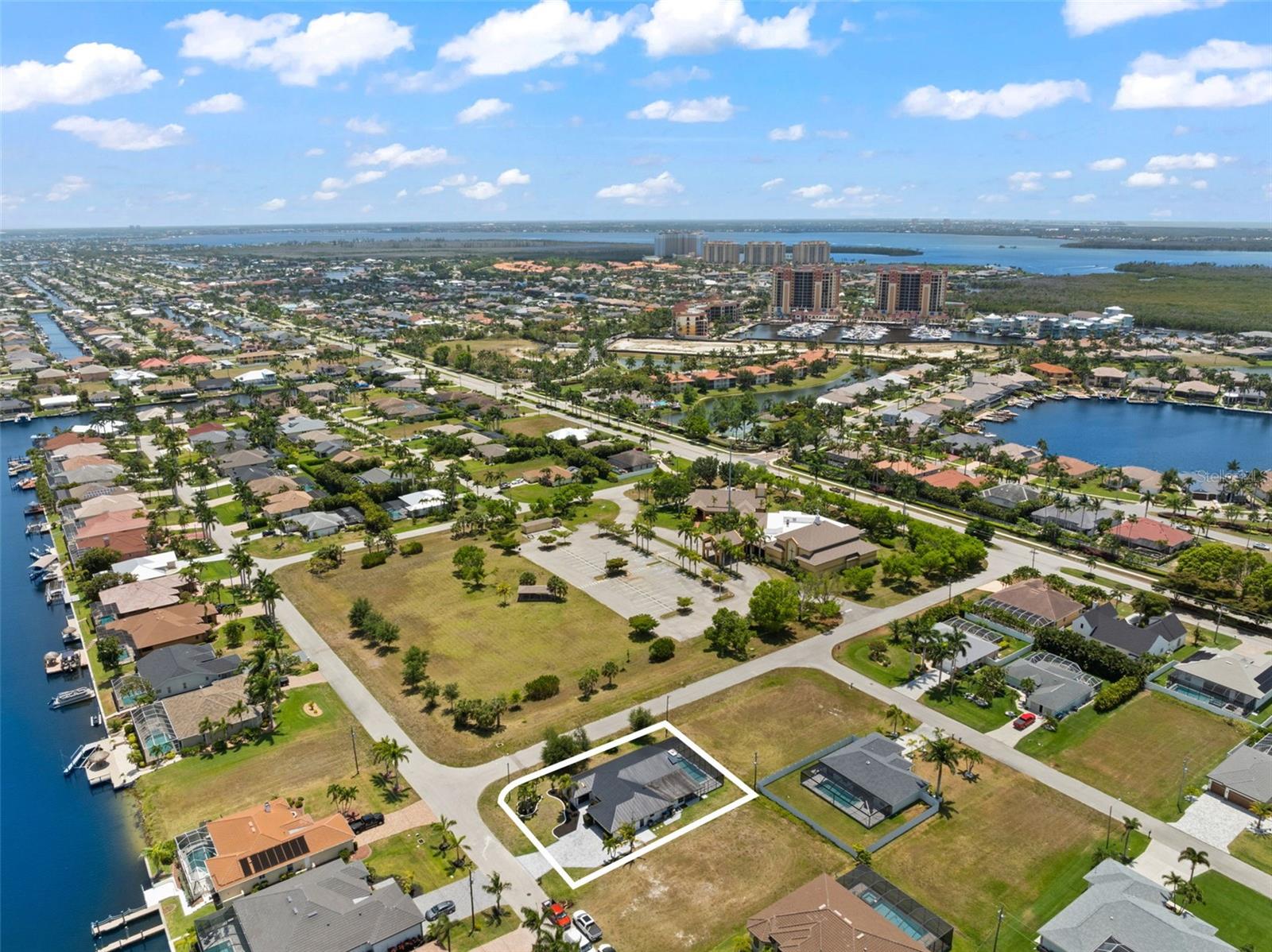 Welcome to this fully renovated home, nestled on a sought-after corner lot less than half a mile away from Cape Harbour. Undergone a stunning renovation, every inch of this residence has been carefully designed to radiate sophistication. The heart of the home, the kitchen, boasts a striking waterfall quartz island and high-quality finishes, setting the stage for culinary excellence. Beyond the kitchen, the South Facing Pool offers a serene escape and a quiet place to unwind. Inside, the thoughtful renovation continues with four bedrooms and three bathrooms, each impeccably updated to reflect modern luxury. Relax under the gentle breeze of oversized ceiling fans or cozy up by the fireplace on cooler evenings. Outside, the attention to detail is evident in the meticulously redone driveway and beautifully manicured landscaping, and creating a serene oasis enhanced by the presence of graceful palm trees. This home offers an unparalleled blend of comfort and elegance, inviting you to experience true tranquility.