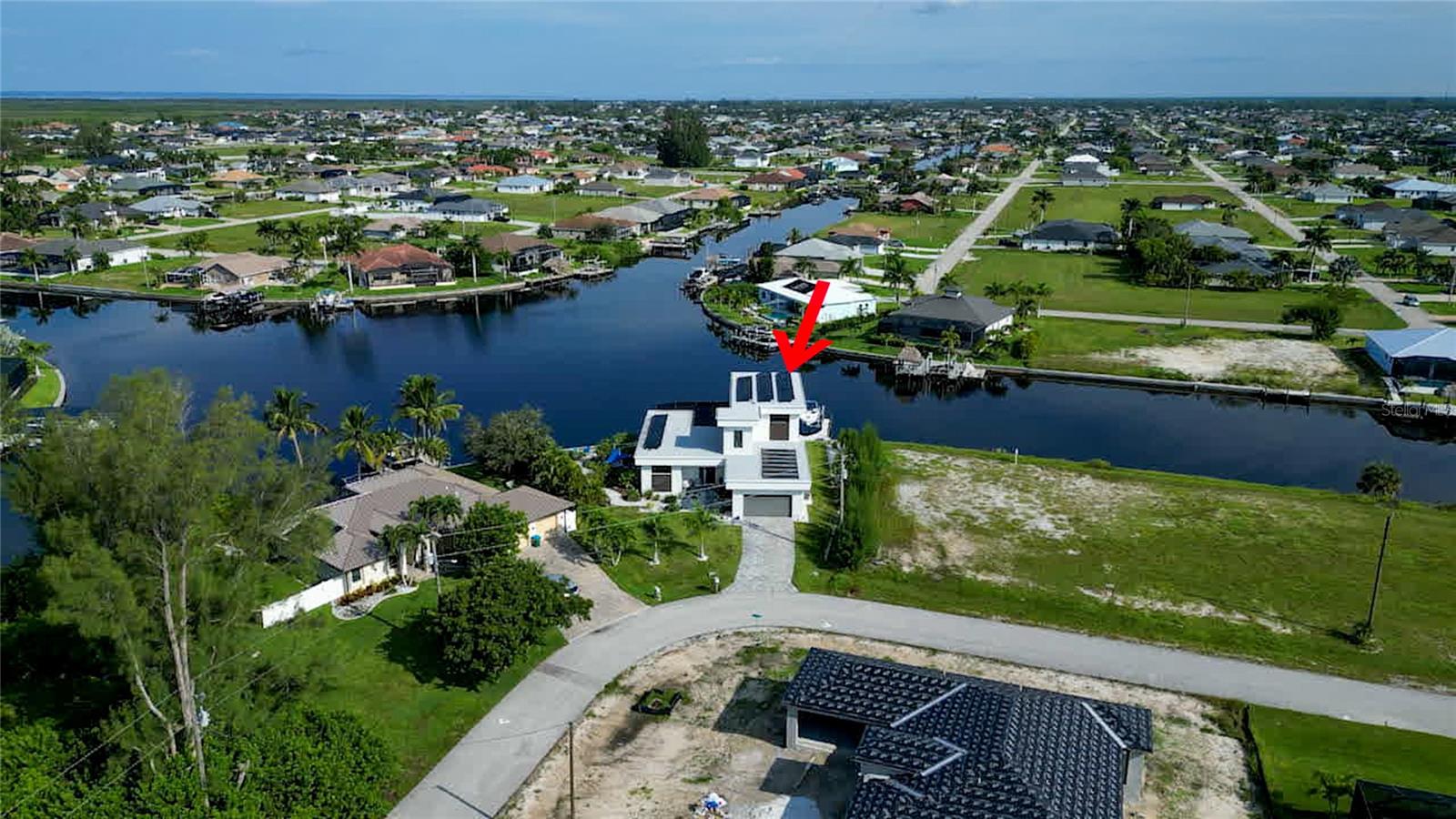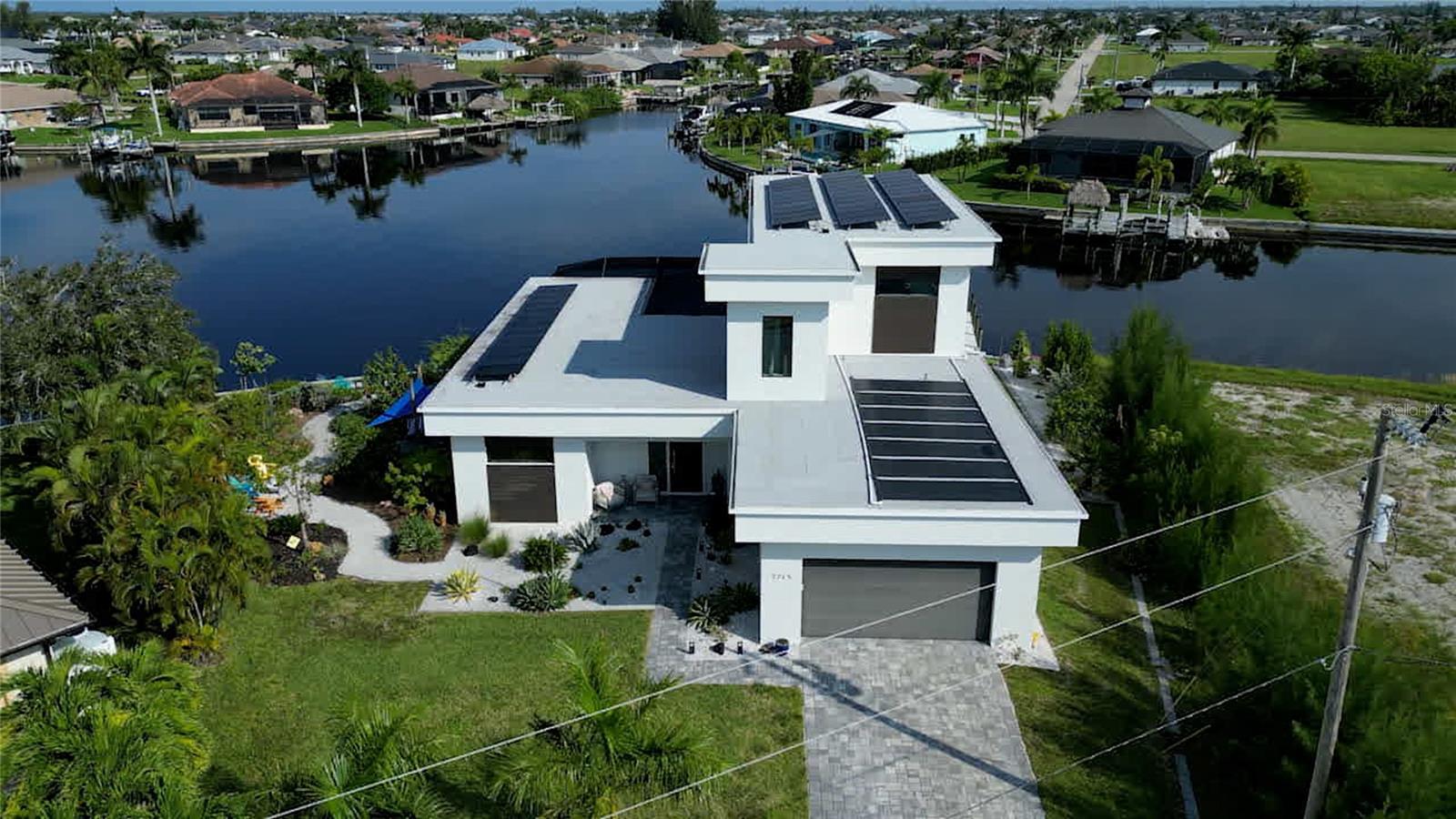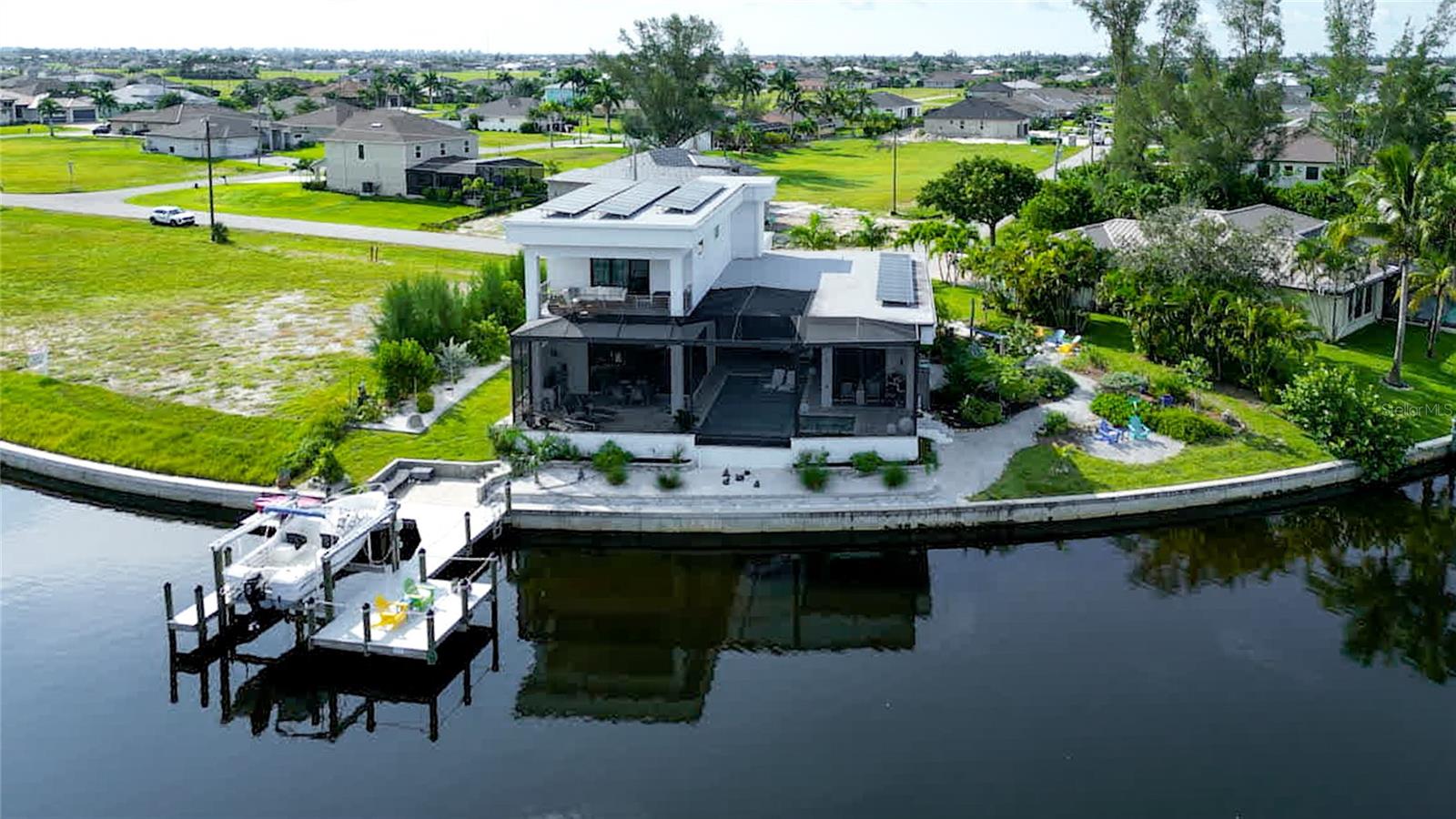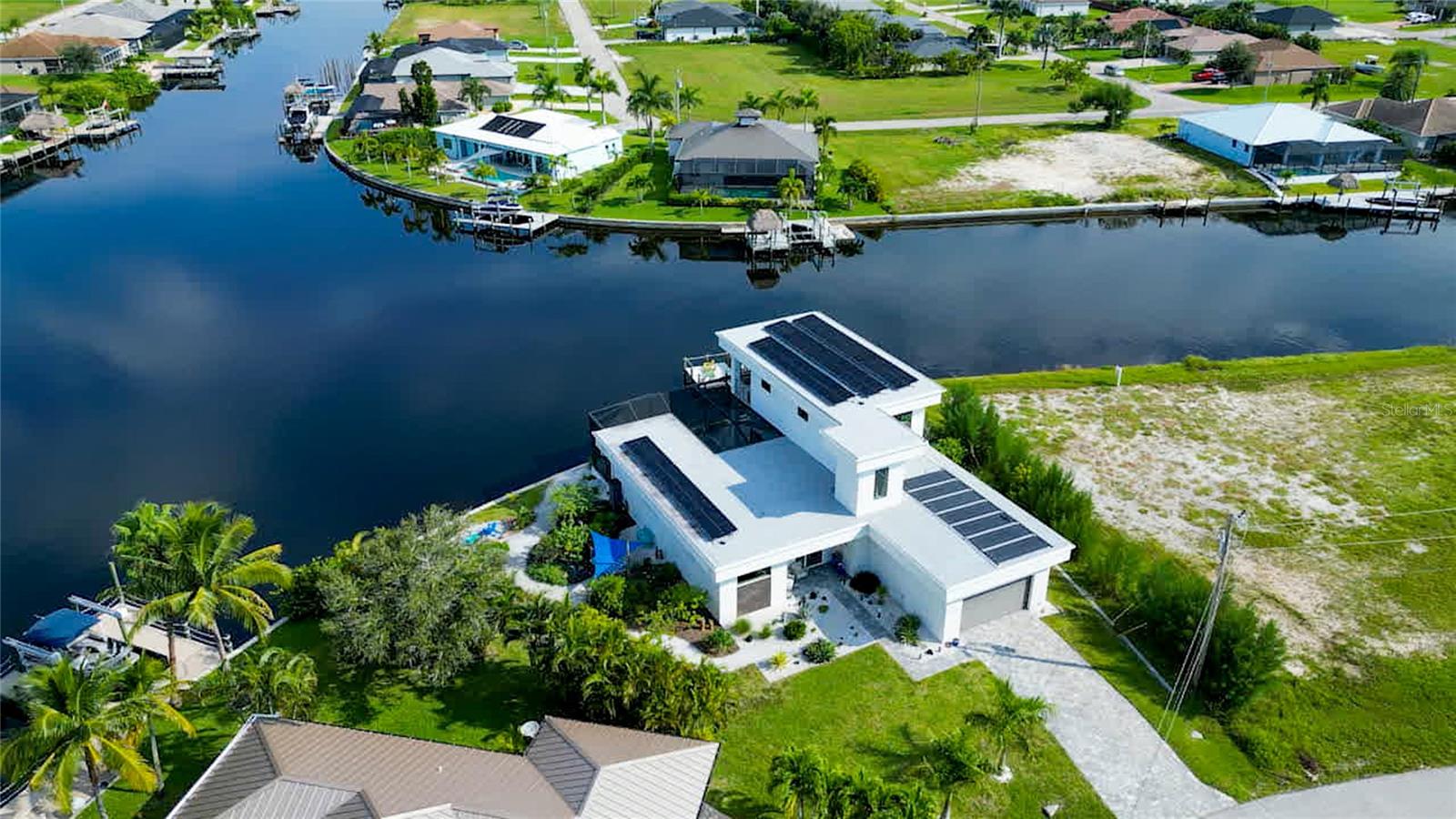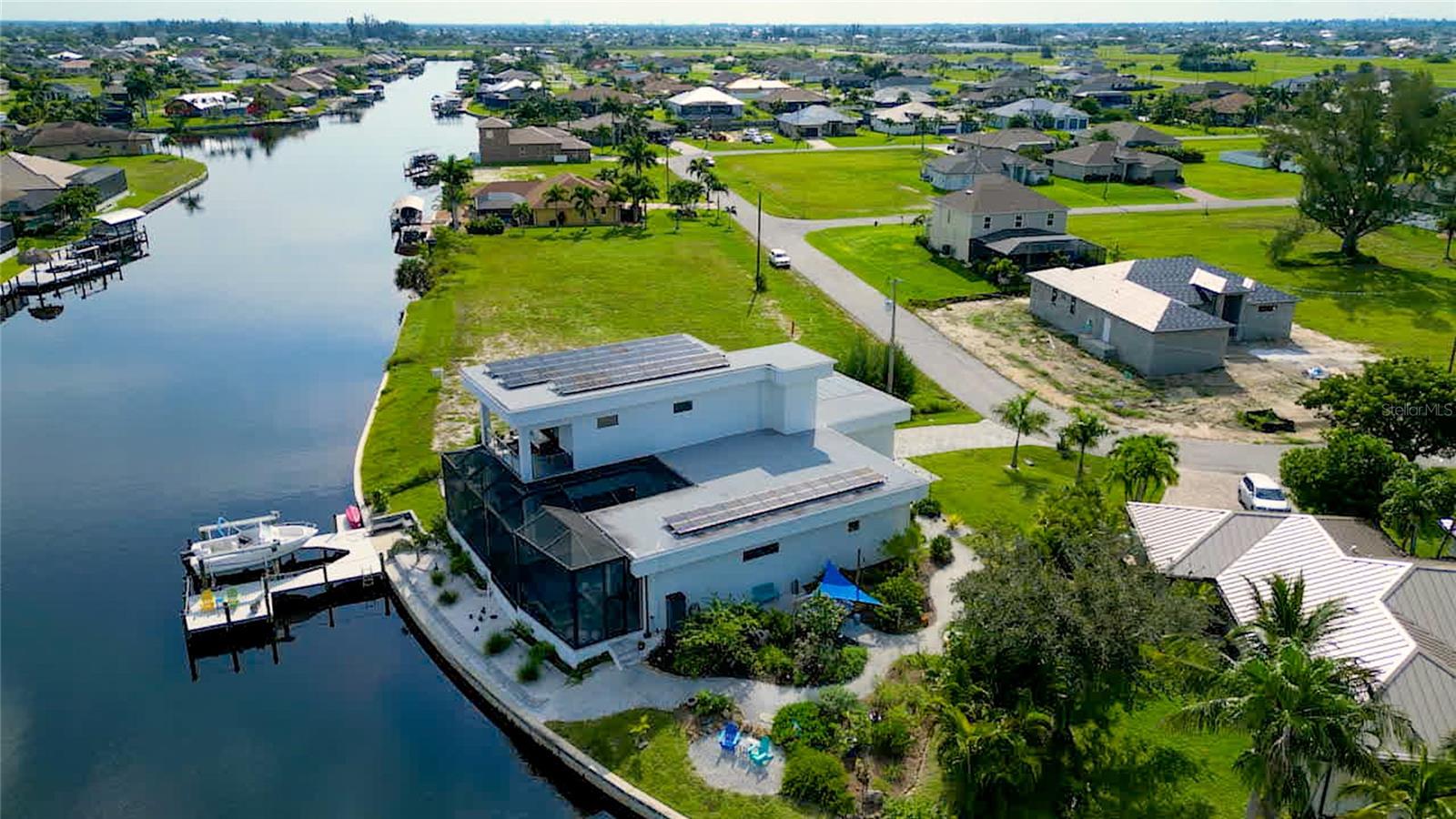 This dream home is on a breathtaking intersecting canal with the most amazing views and fantastic boat access! Every inch of the home has been thoughtfully planned out to enjoy your days and nights in paradise. Imagine hopping on your boat or kayak and passing dolphins and manatee and heading out to one of the local island restaurants on the warm Gulf waters! This Beautiful 2 story newer home on oversized private lot in desirable area of NW Cape Coral offers that and so much more. How does not having an electric bill sound? Home has paid for solar panels that cover those costs. This adds up to HUGE savings! Located in desirable NW Cape Coral with many exciting projects and growth planned the value in this area will continue to appreciate. The home itself boasts every upgrade you can imagine; from the chef's gourmet kitchen, large heated infinity style pool and spa, boat lift and dock, full outdoor kitchen, contemporary finishes and top level tile and finishes to the impact windows and doors. Step into your first floor master bedroom with office/den attached or expand this area for huge first floor bedroom suite with gorgeous views of the pool and water. The kitchen area with tons of causal island seating opens to the large living area, which of course also faces the water for the most breathtaking views. The Convenient half bath and spacious pantry land laundry room are located adjacent to the kitchen area. There are two large guest bedrooms -one with balcony- and a full guest bath upstairs. Your backyard has been thoughtfully laid out with many areas to relax and enjoy the breathtaking sunrise and sunset views from either sider of the home. Many native plants for a low maintenance yet impressive landscape complete the year round vacation vibe. This home will indeed make all your SWFL living dreams come true! Be sure to "tour" the home via the 3D tour as well!