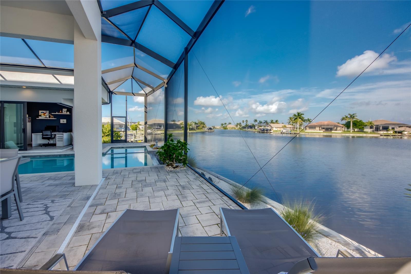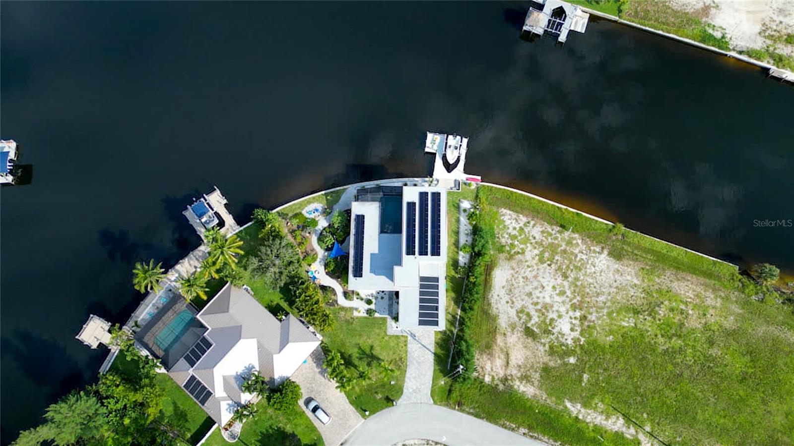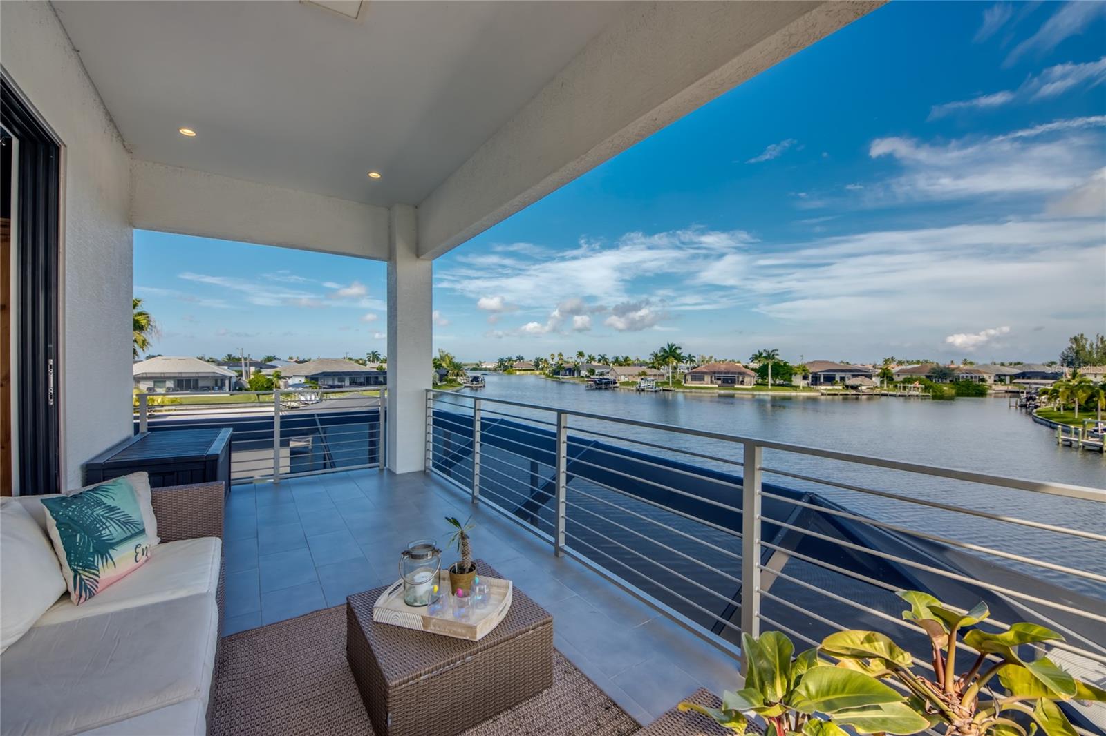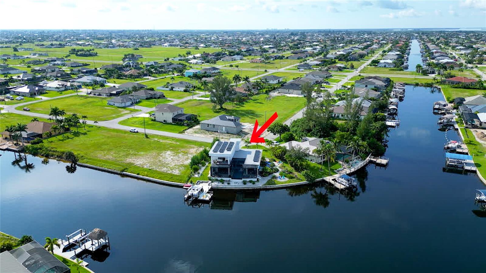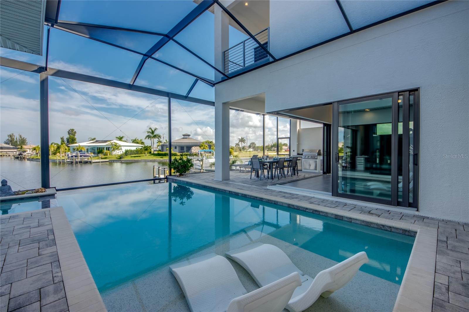 This dream home is on a breathtaking intersecting canal with the most amazing views and fantastic boat access! Every inch of the home has been thoughtfully planned out to enjoy your days and nights in paradise. Imagine hopping on your boat or kayak and passing dolphins and manatee and heading out to one of the local island restaurants on the warm Gulf waters! This Beautiful 2 story newer home on oversized private lot in desirable area of NW Cape Coral offers that and so much more. How does not having an electric bill sound? Home has paid for solar panels that cover those costs. This adds up to HUGE savings! Located in desirable NW Cape Coral with many exciting projects and growth planned the value in this area will continue to appreciate. The home itself boasts every upgrade you can imagine; from the chef's gourmet kitchen, large heated infinity style pool and spa, boat lift and dock, full outdoor kitchen, contemporary finishes and top level tile and finishes to the impact windows and doors. Step into your first floor master bedroom with office/den attached or expand this area for huge first floor bedroom suite with gorgeous views of the pool and water. The kitchen area with tons of causal island seating opens to the large living area, which of course also faces the water for the most breathtaking views. The Convenient half bath and spacious pantry land laundry room are located adjacent to the kitchen area. There are two large guest bedrooms -one with balcony- and a full guest bath upstairs. Your backyard has been thoughtfully laid out with many areas to relax and enjoy the breathtaking sunrise and sunset views from either sider of the home. Many native plants for a low maintenance yet impressive landscape complete the year round vacation vibe. This home will indeed make all your SWFL living dreams come true! Be sure to "tour" the home via the 3D tour as well!