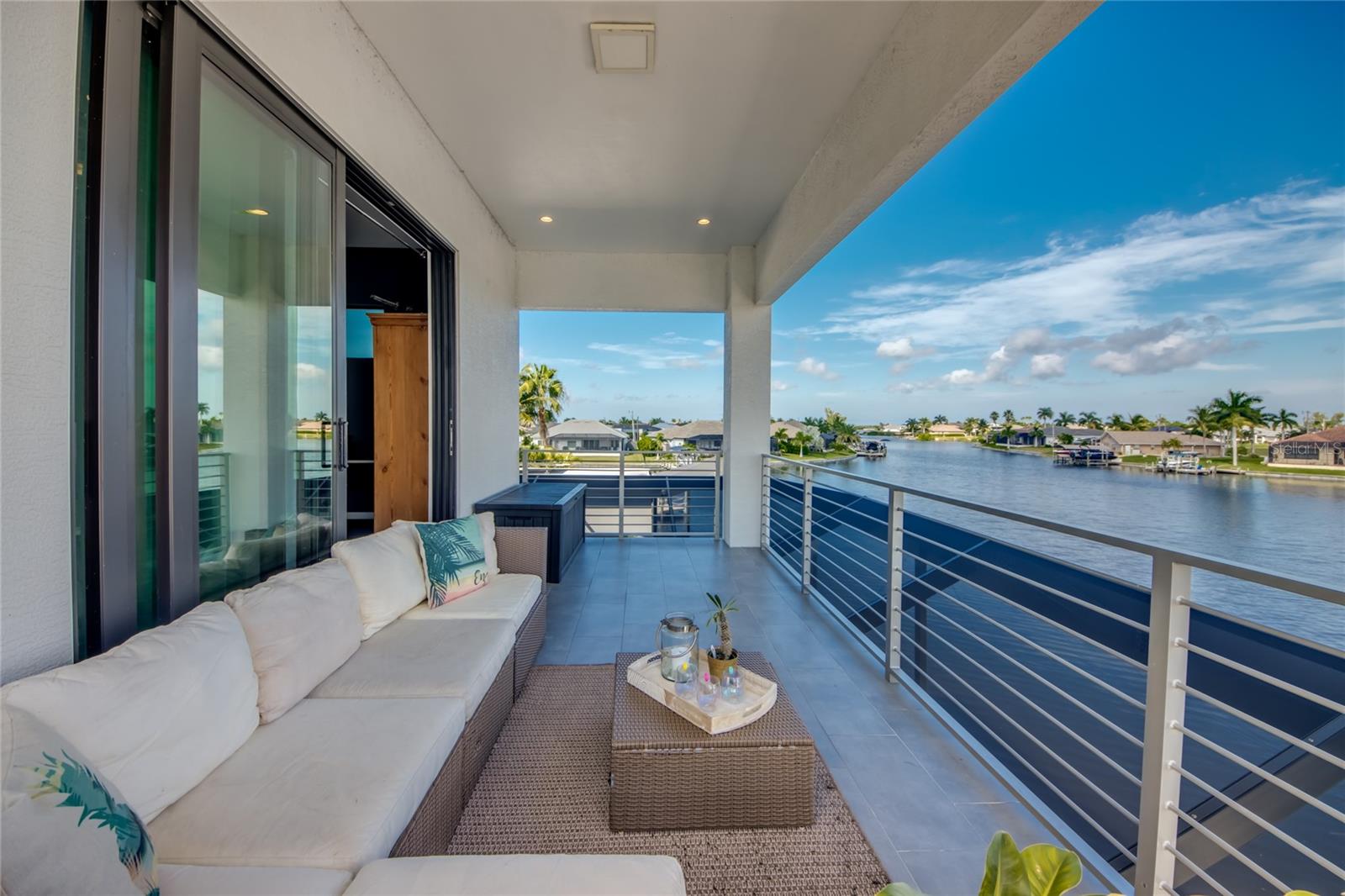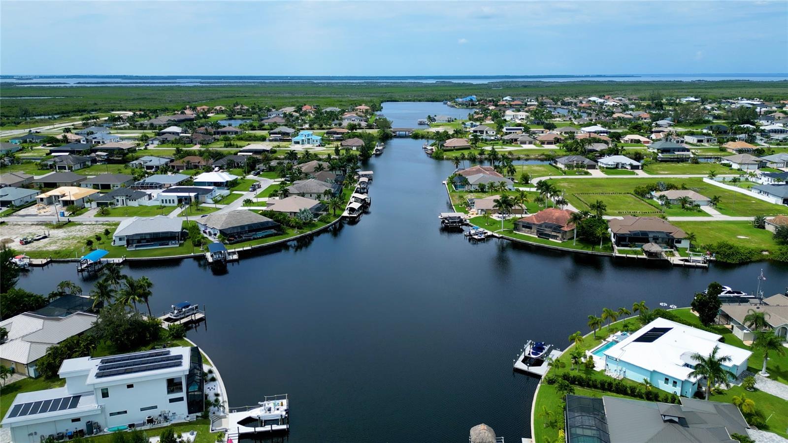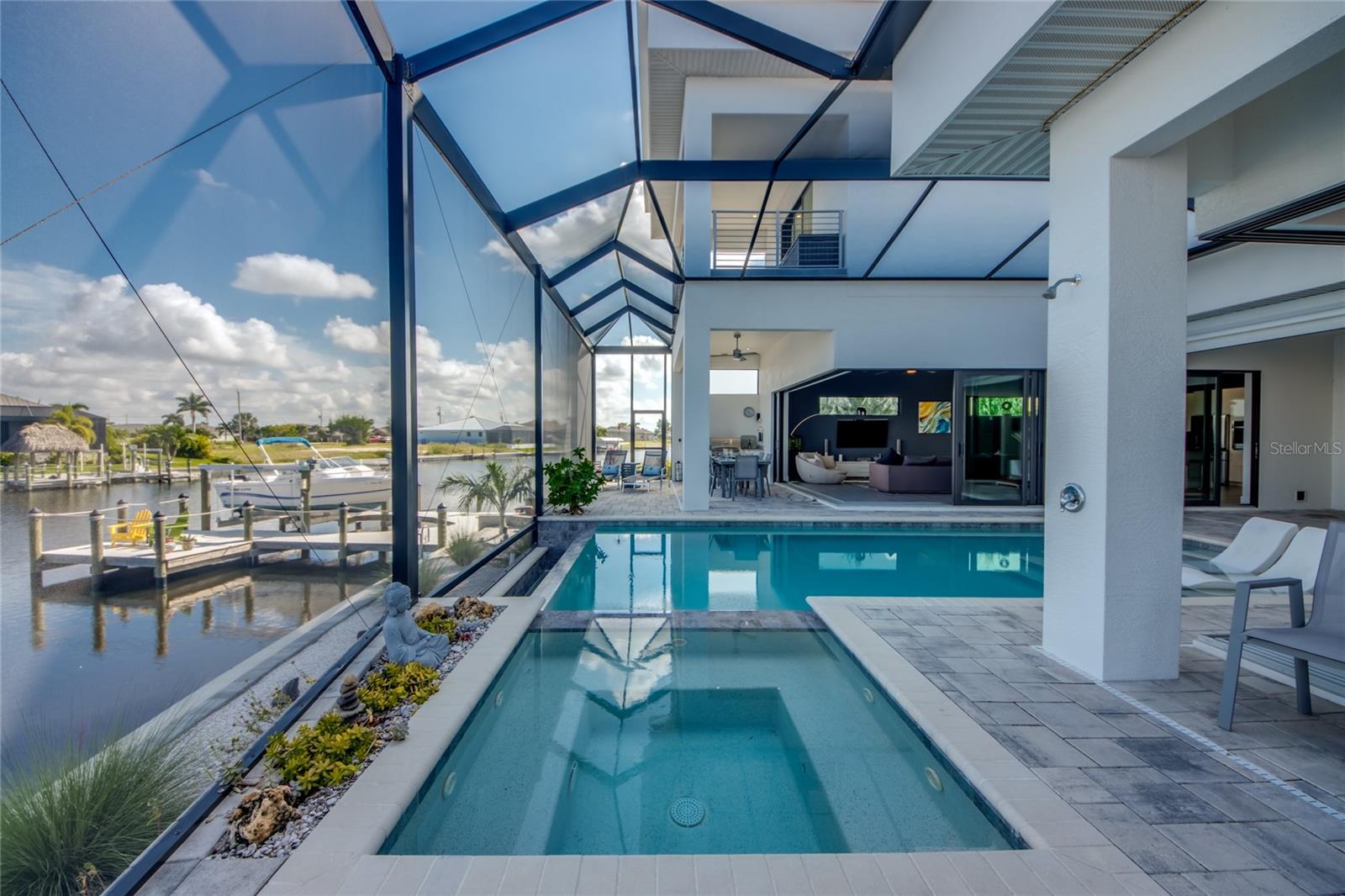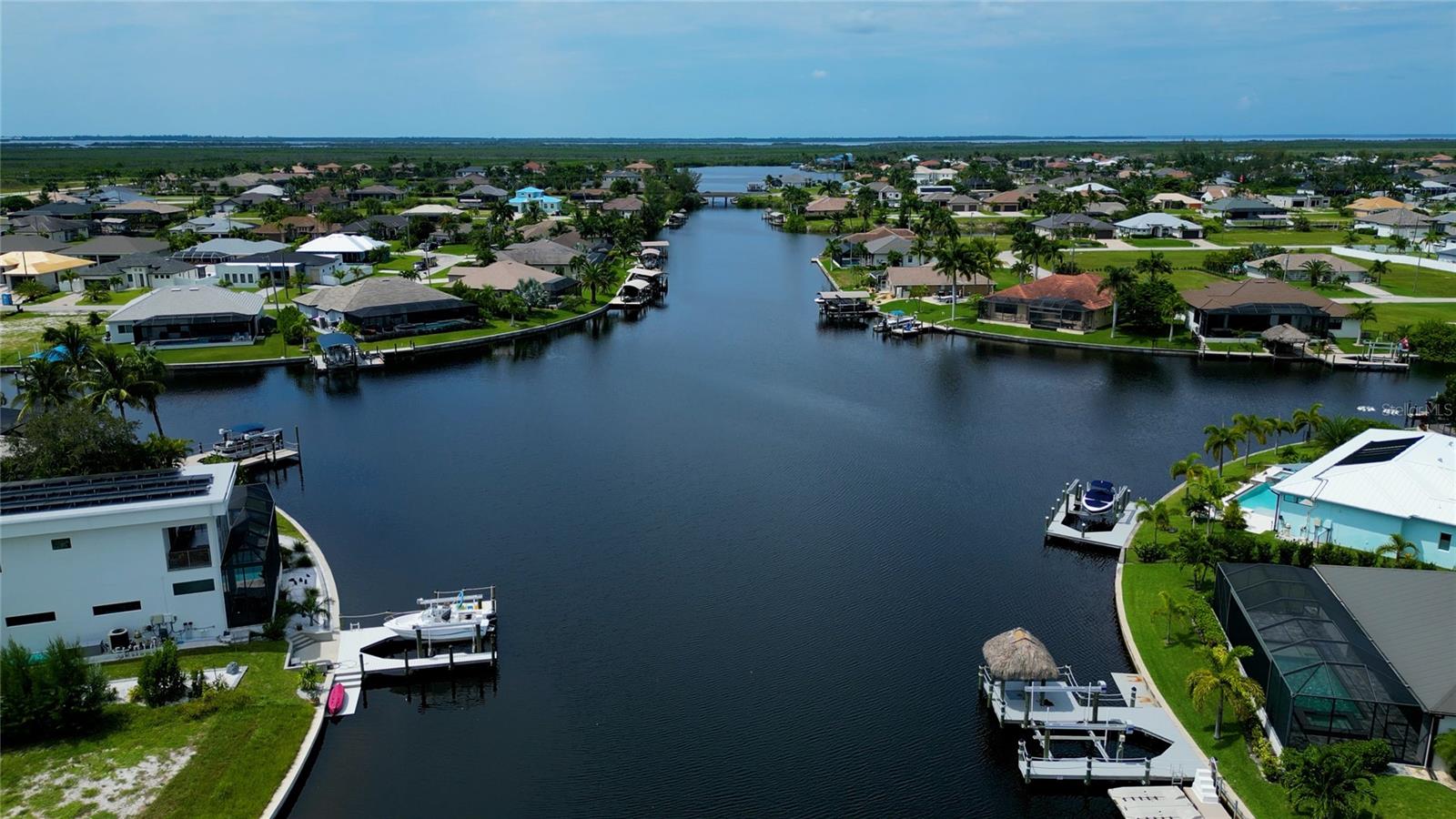 This dream home is on a breathtaking intersecting canal with the most amazing views and fantastic boat access! Every inch of the home has been thoughtfully planned out to enjoy your days and nights in paradise. Imagine hopping on your boat or kayak and passing dolphins and manatee and heading out to one of the local island restaurants on the warm Gulf waters! This Beautiful 2 story newer home on oversized private lot in desirable area of NW Cape Coral offers that and so much more. How does not having an electric bill sound? Home has paid for solar panels that cover those costs. This adds up to HUGE savings! Located in desirable NW Cape Coral with many exciting projects and growth planned the value in this area will continue to appreciate. The home itself boasts every upgrade you can imagine; from the chef's gourmet kitchen, large heated infinity style pool and spa, boat lift and dock, full outdoor kitchen, contemporary finishes and top level tile and finishes to the impact windows and doors. Step into your first floor master bedroom with office/den attached or expand this area for huge first floor bedroom suite with gorgeous views of the pool and water. The kitchen area with tons of causal island seating opens to the large living area, which of course also faces the water for the most breathtaking views. The Convenient half bath and spacious pantry land laundry room are located adjacent to the kitchen area. There are two large guest bedrooms -one with balcony- and a full guest bath upstairs. Your backyard has been thoughtfully laid out with many areas to relax and enjoy the breathtaking sunrise and sunset views from either sider of the home. Many native plants for a low maintenance yet impressive landscape complete the year round vacation vibe. This home will indeed make all your SWFL living dreams come true! Be sure to "tour" the home via the 3D tour as well!