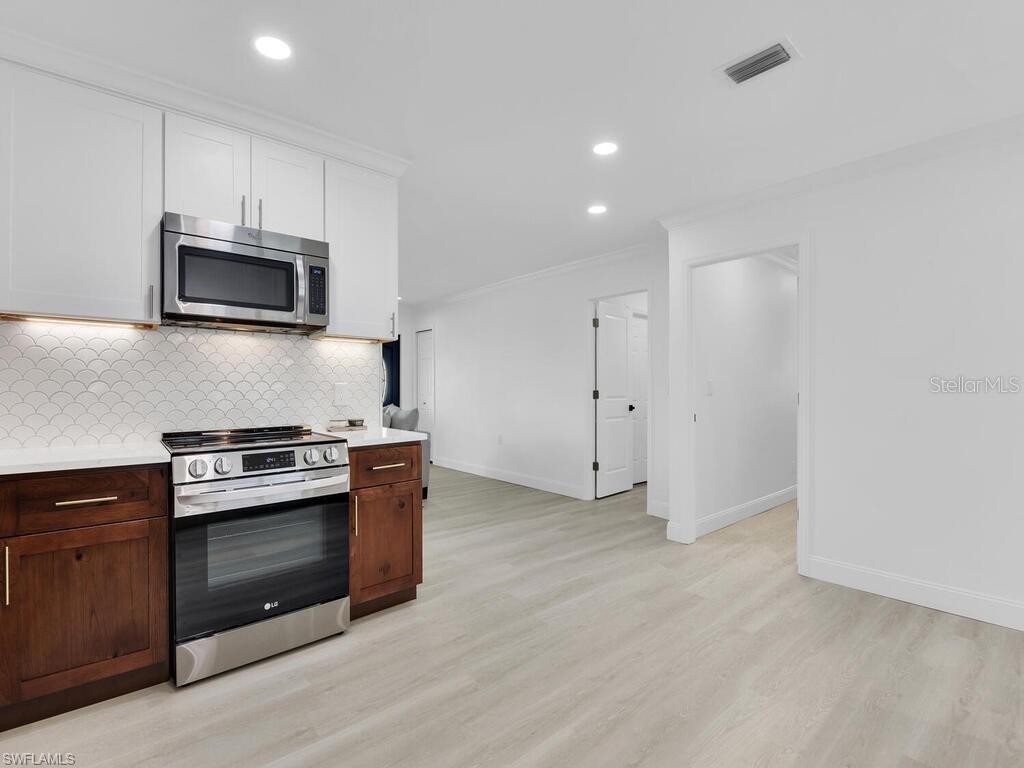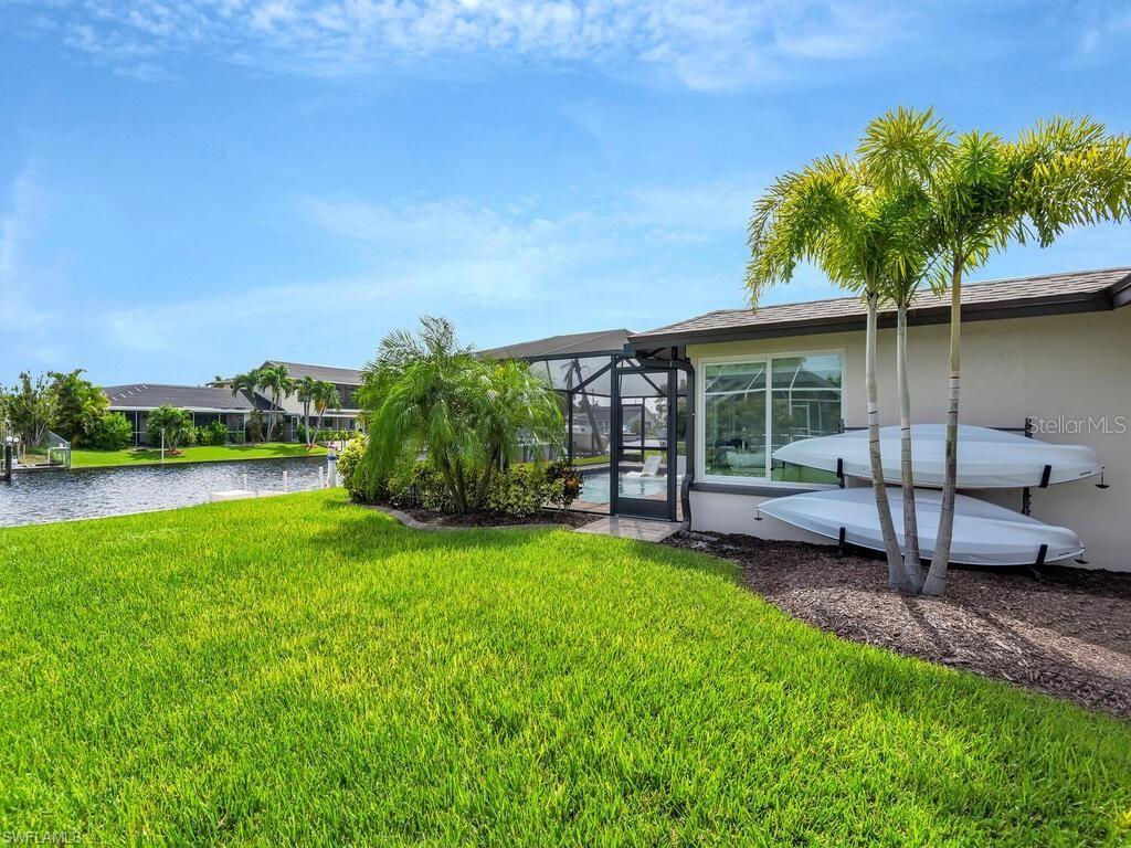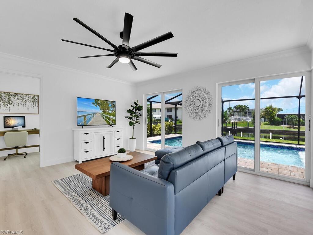 Welcome to your dream Gulf access waterfront oasis in desirable SE Cape Coral! The design of this 4 bedroom, 2 bath POOL home boasts a perfect blend of sophistication and functionality, creating a sense of harmony between indoor and outdoor living. The kitchen features stunning waterfall quartz countertops, NEW stainless appliances, elegant cabinetry, & striking gold hardware. The seamless open concept creates an inviting space for entertaining. The LVP flooring throughout adds a touch of elegance while providing durability and ease of maintenance. A refreshing newer heated pool awaits, complete with a sun shelf and waterfront views. In addition to the remodeled interior, this home's updates include a NEW roof, 2021 HVAC, NEW pool pump, NEW water heater, IMPACT RESISTANT doors & windows, Newer pool cage, NEW landscaping, NEW exterior paint & more. For boating enthusiasts, this property is just 10 minutes to the river with NO BRIDGES- giving quick access to our numerous local waterfront hotspots and world renowned beaches. Bike or walk to many modern conveniences, & the South Cape entertainment district.