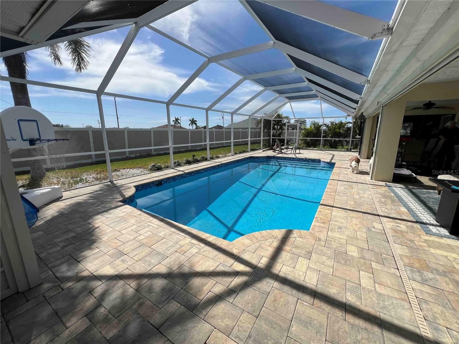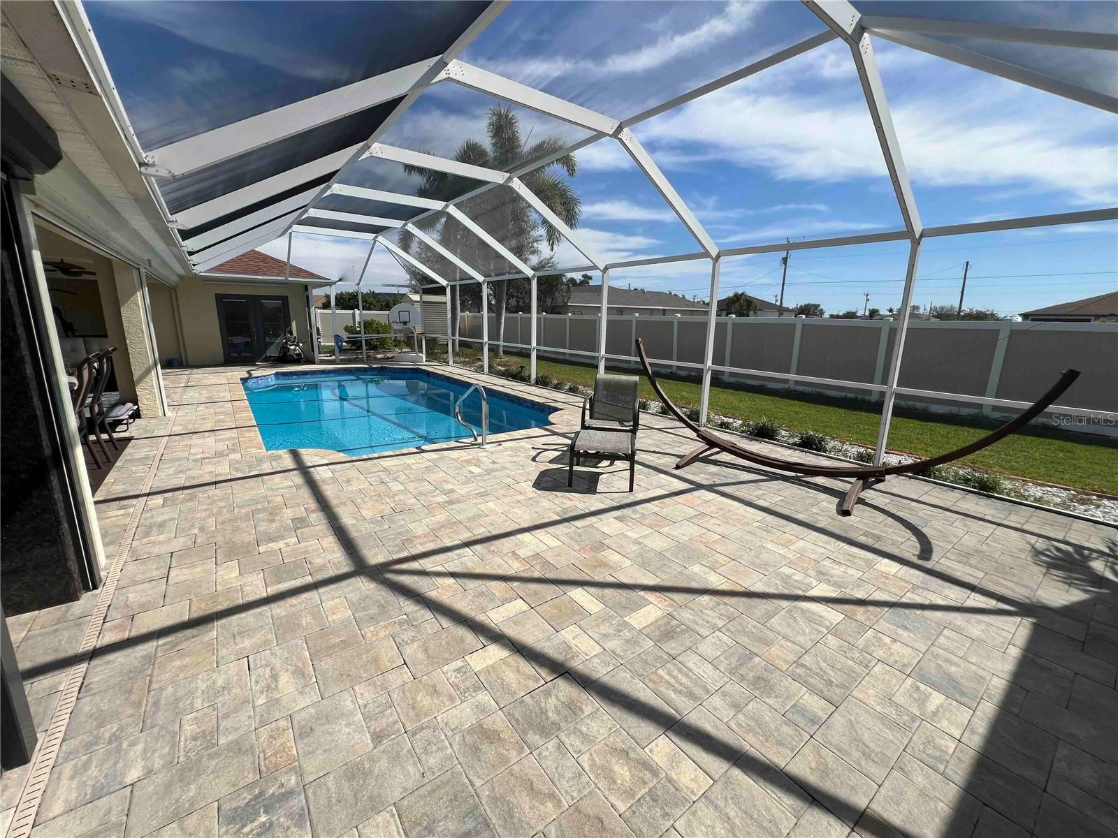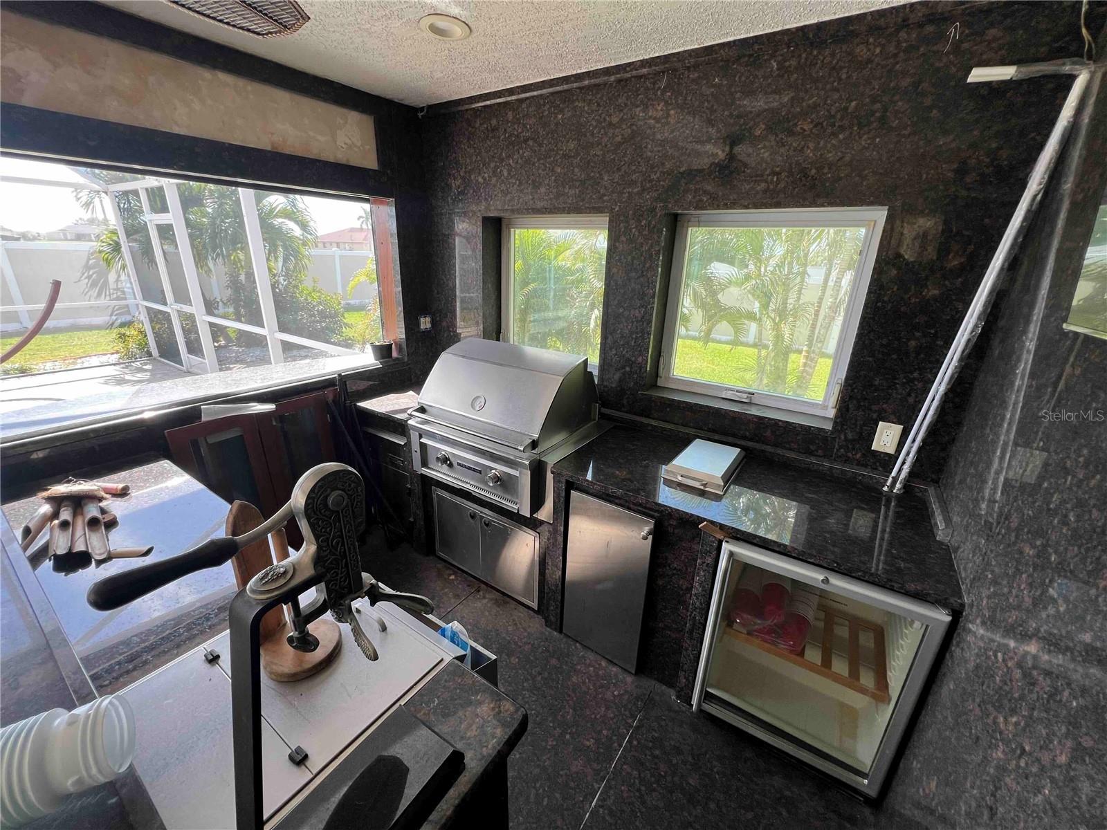 This stunning single-family home boasts 3 bedrooms, 2 bathrooms, and a 2-car garage, providing ample space for you and your family. The in-ground "heated" pool is perfect for relaxing, while the custom outdoor kitchen is ideal for hosting barbecues and entertaining guests. Inside you'll find a kaleidoscope of features including a craftsman's touch of granite counters, stainless steel appliances, custom built-in cabinets, and a Murphy bed in the second bedroom. Additionally, the wood flooring and wine cooler add a touch of elegance, while the lush landscape and highly coveted triple palms (12) surrounding the property create a tropical bliss. The double lot offers plenty of room for outdoor activities and expansion possibilities and a shed. Attached to the lanai, you'll find an additional building that can be used as a den, fitness room, guest room, or anything you choose to make it. For peace of mind and safety, the home features Kevlar roll-down hurricane screens in the lanai, propane tanks, a whole-house Generac generator, and an RO system. The buyer will be comforted to know that there was NO sustained storm damage to the home, however, the privacy vinyl fence did lose some panels from the wind and will be replaced by the sellers before closing. Whether you're looking to relax by the pool, work from home in style, or entertain friends and family, this home has it all. Don't miss the opportunity to make this your forever home in Cape Coral!